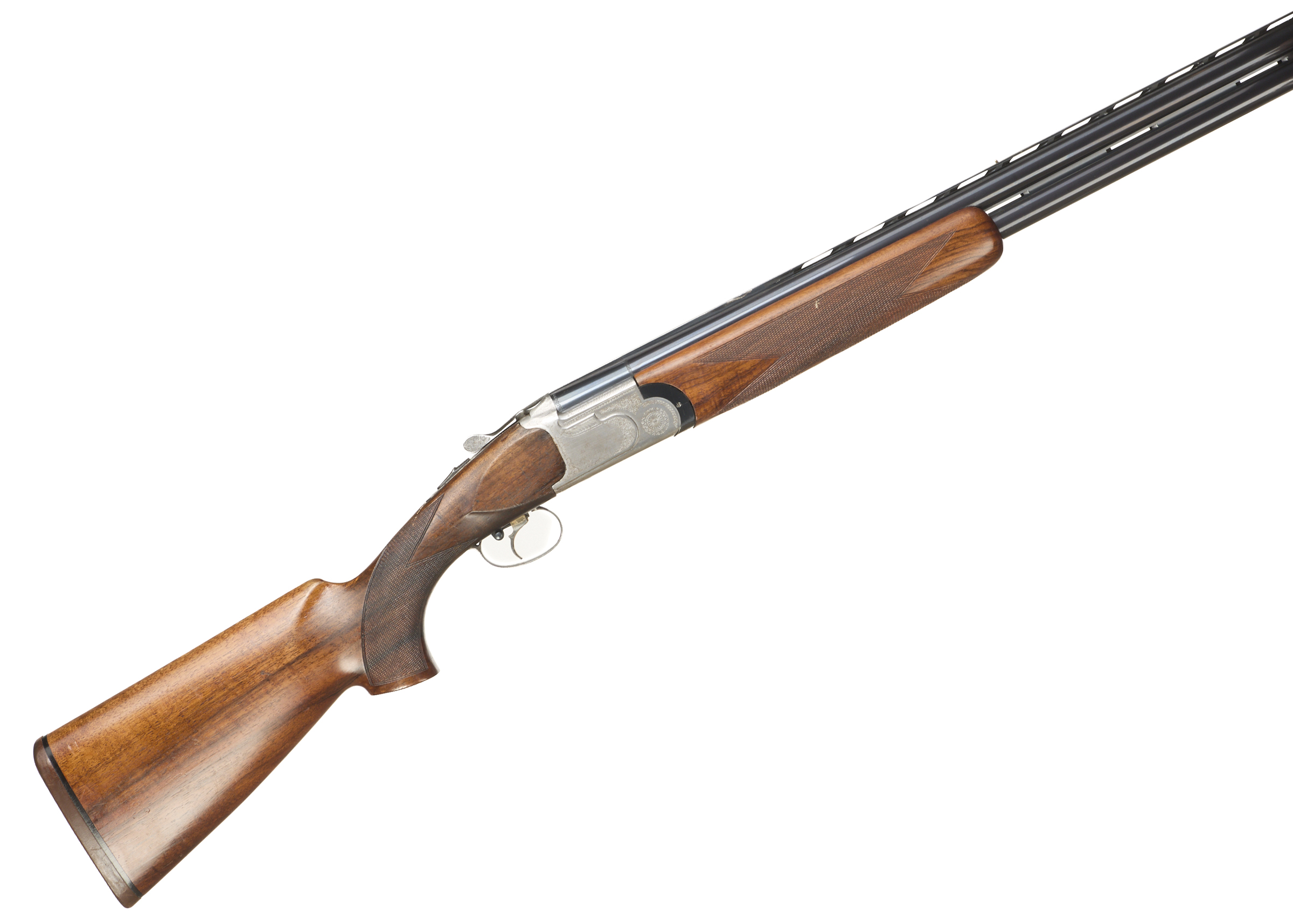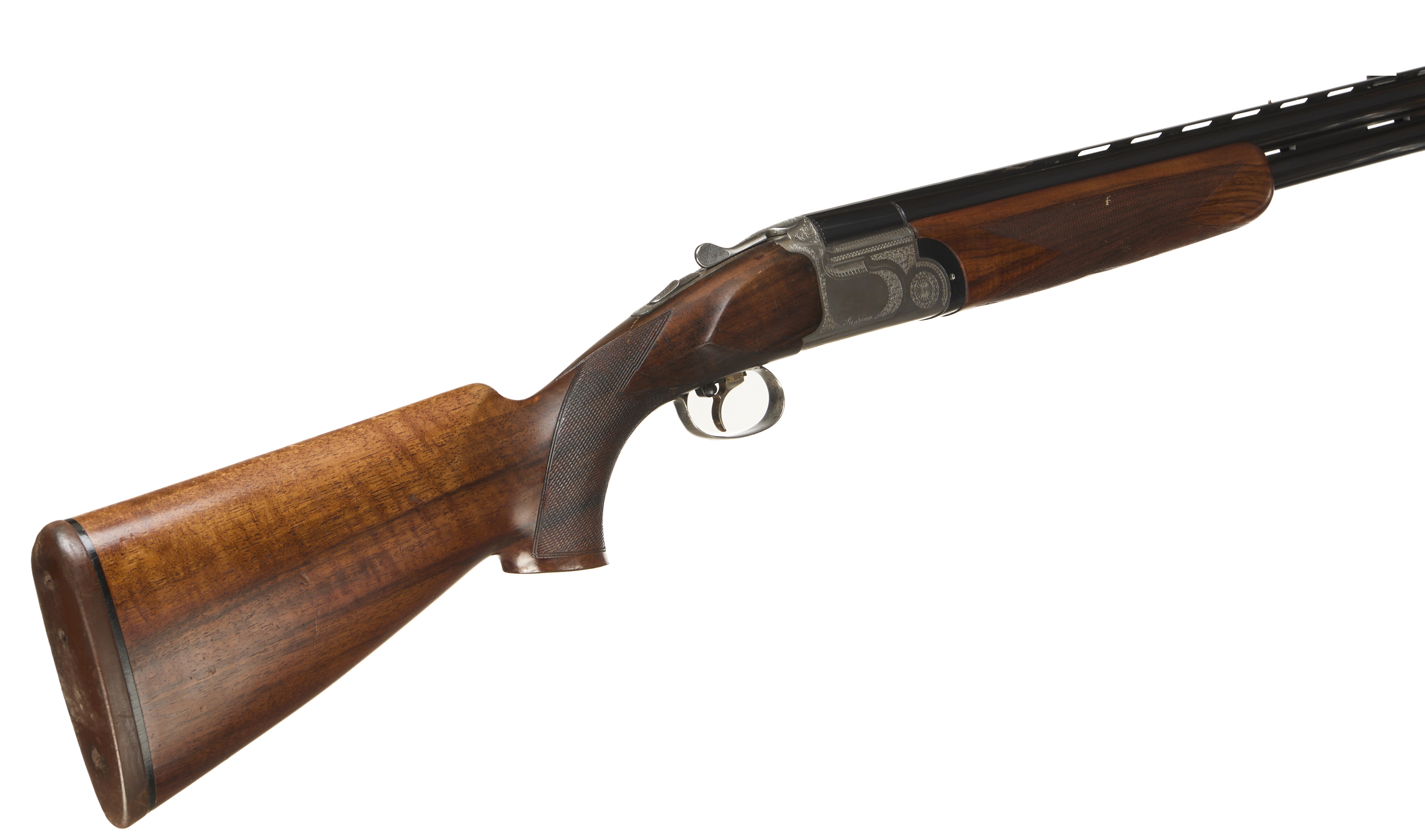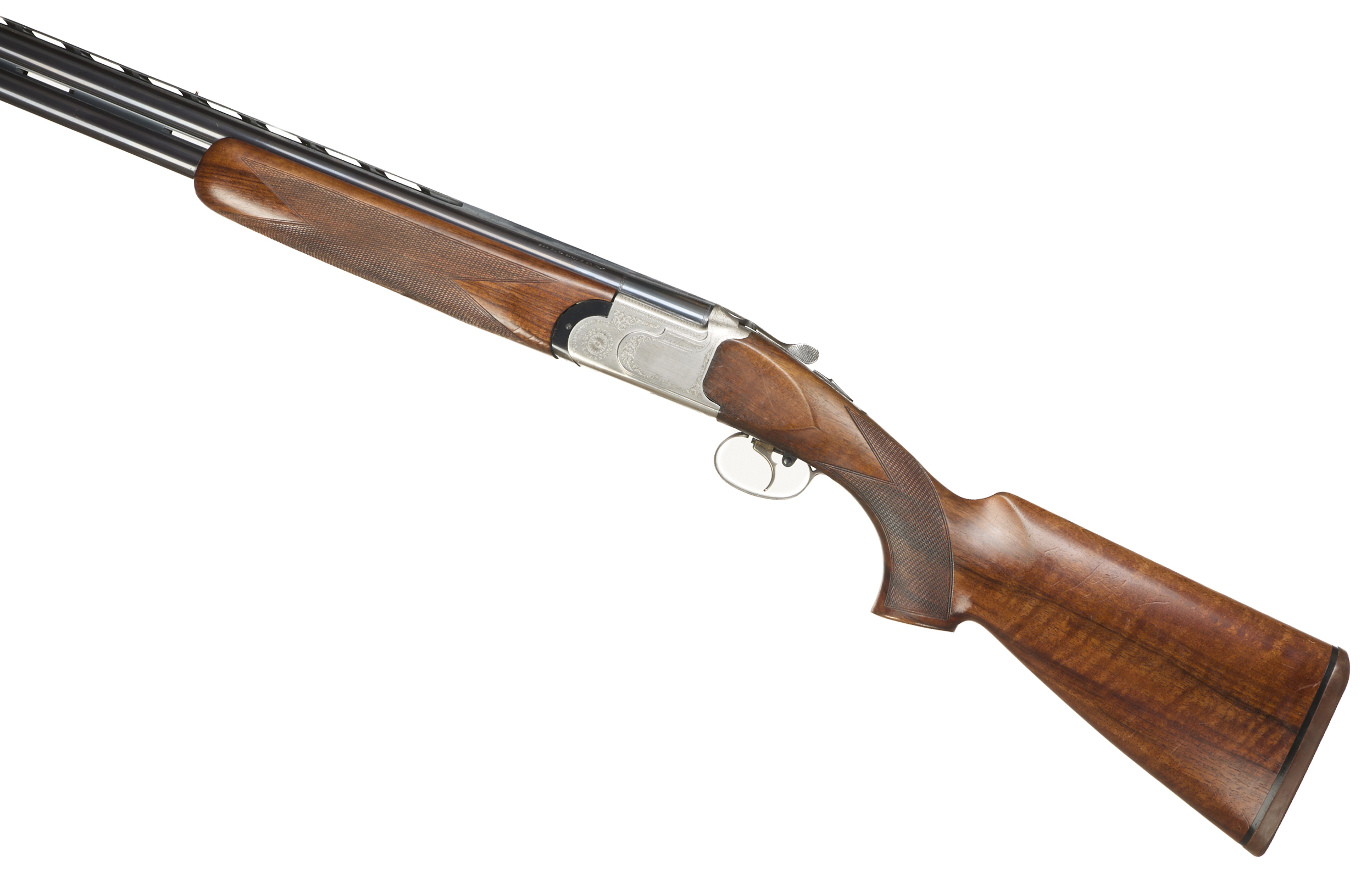 Cushioned butt pad, chequered semi-pistol grip and forend, ventilated top and mid rib. Acanthus scrolls to action. Gold wash trigger, integrated barrel selector (selective single trigger) and safety.