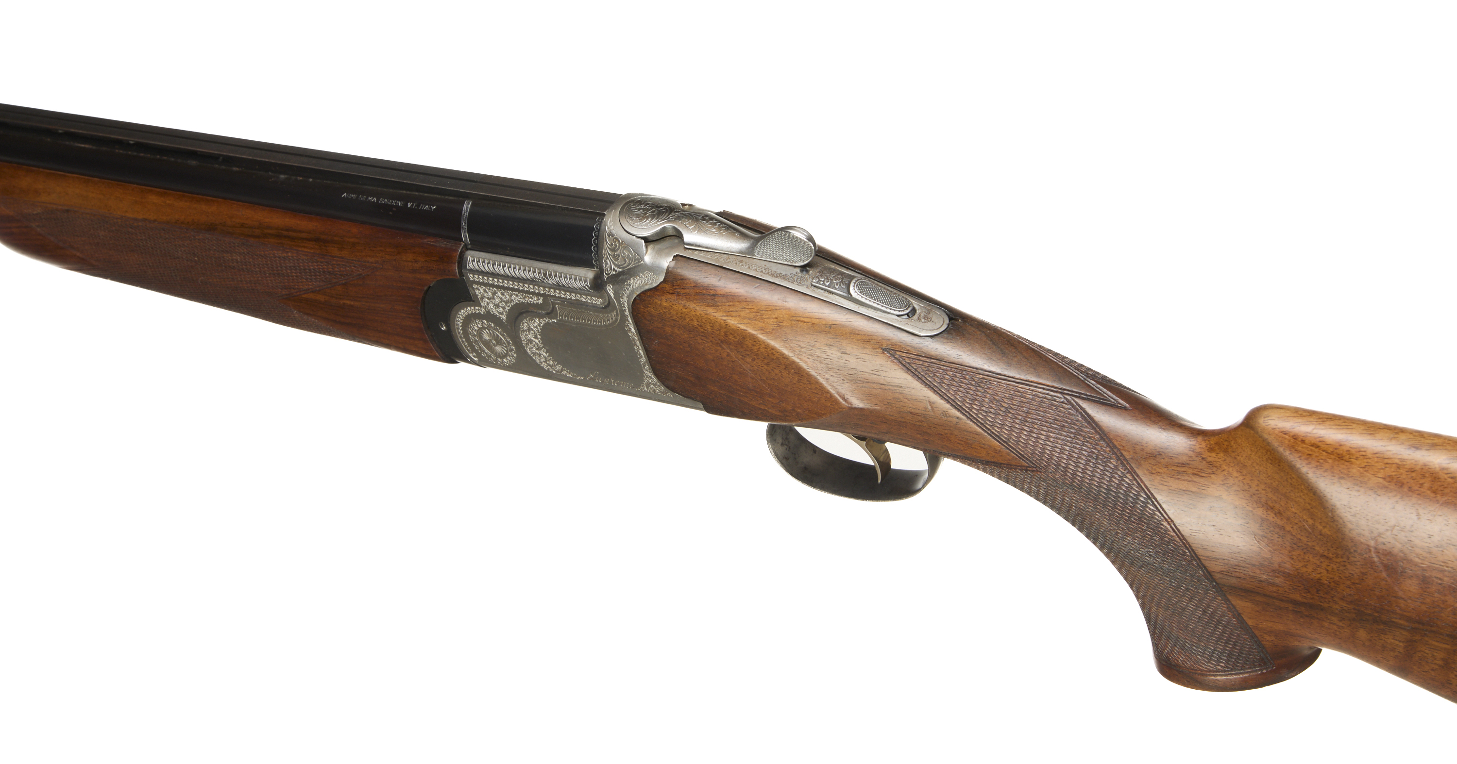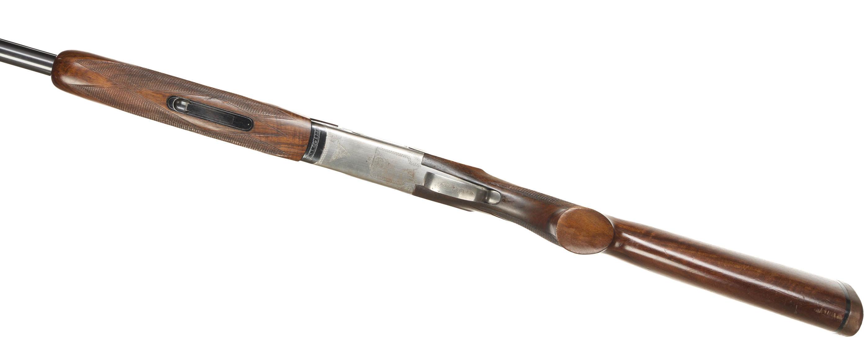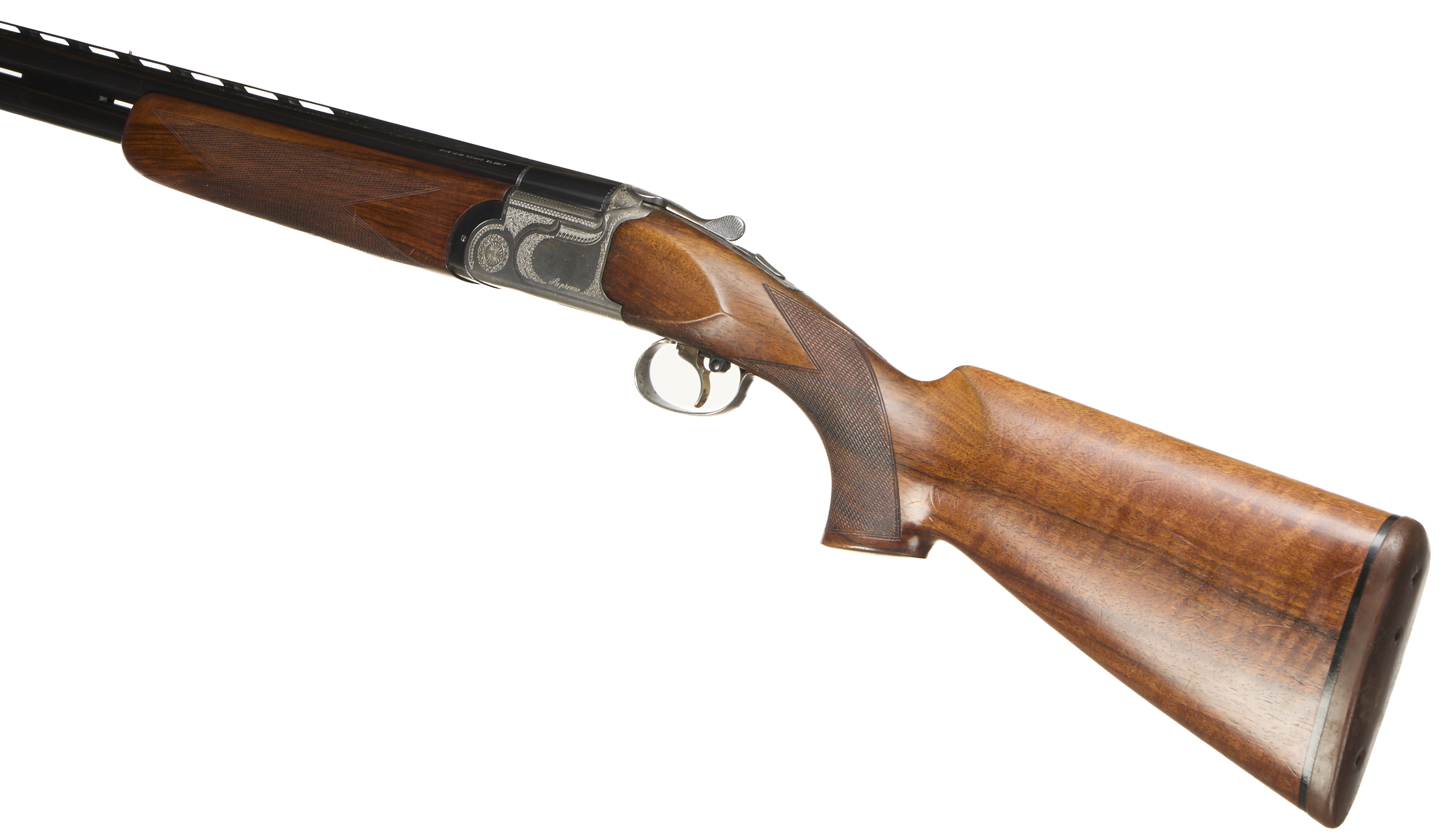 Cushioned butt pad, chequered semi-pistol grip and forend, ventilated top and mid rib. Acanthus scrolls to action. Gold wash trigger, integrated barrel selector (selective single trigger) and safety.