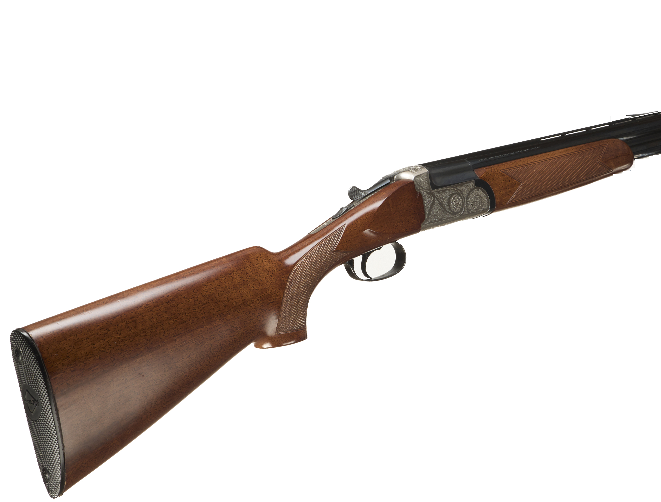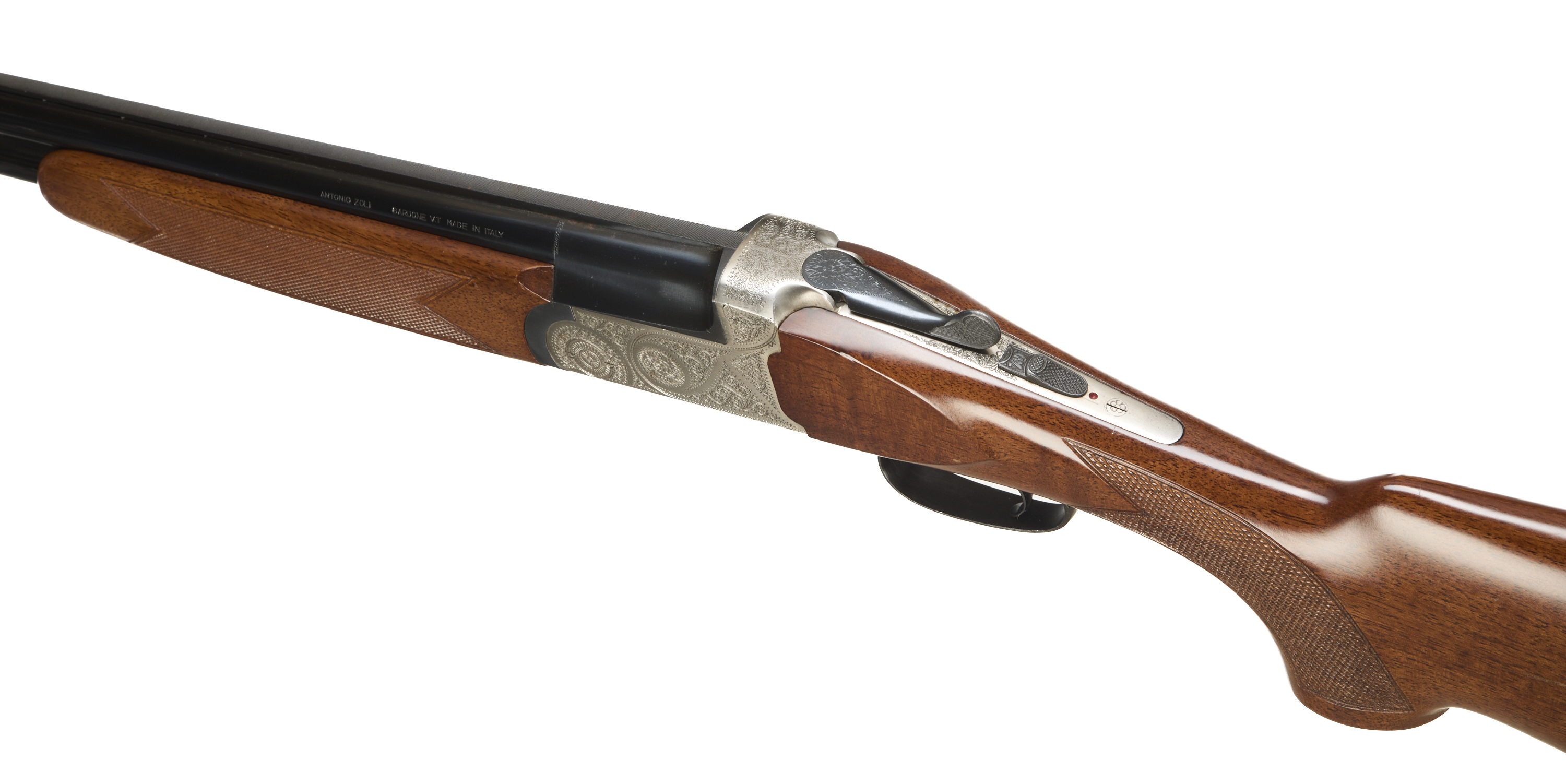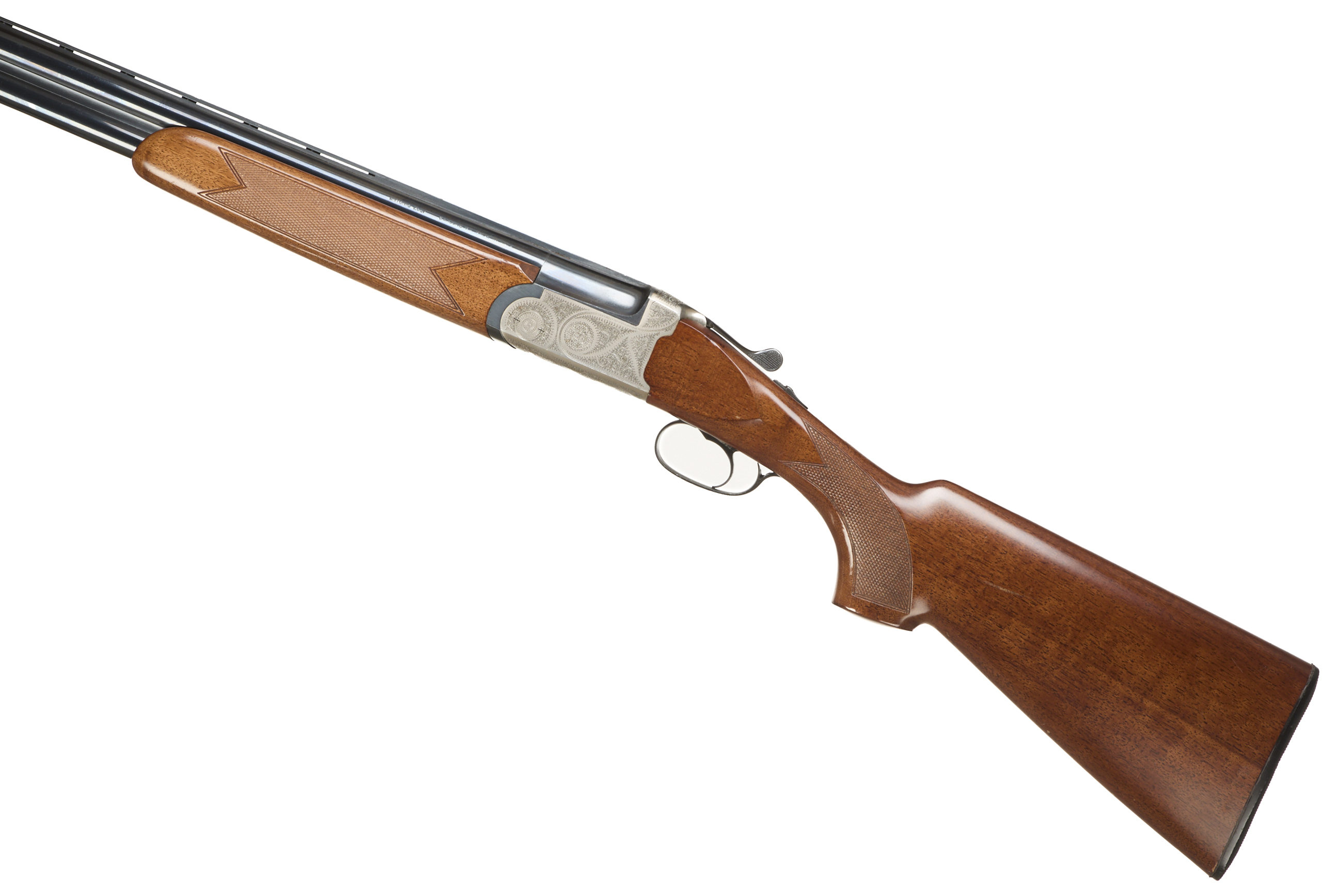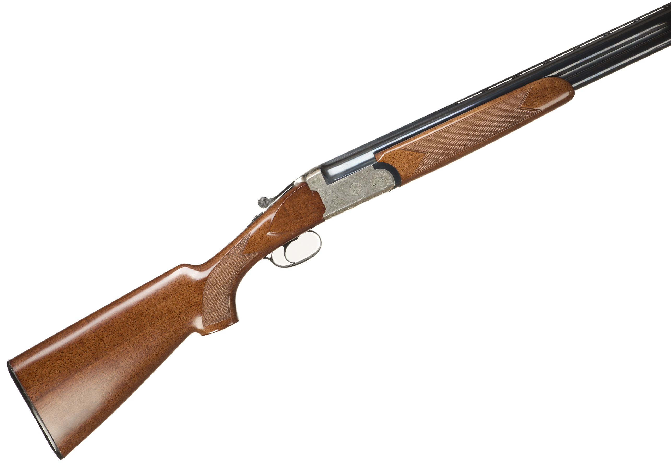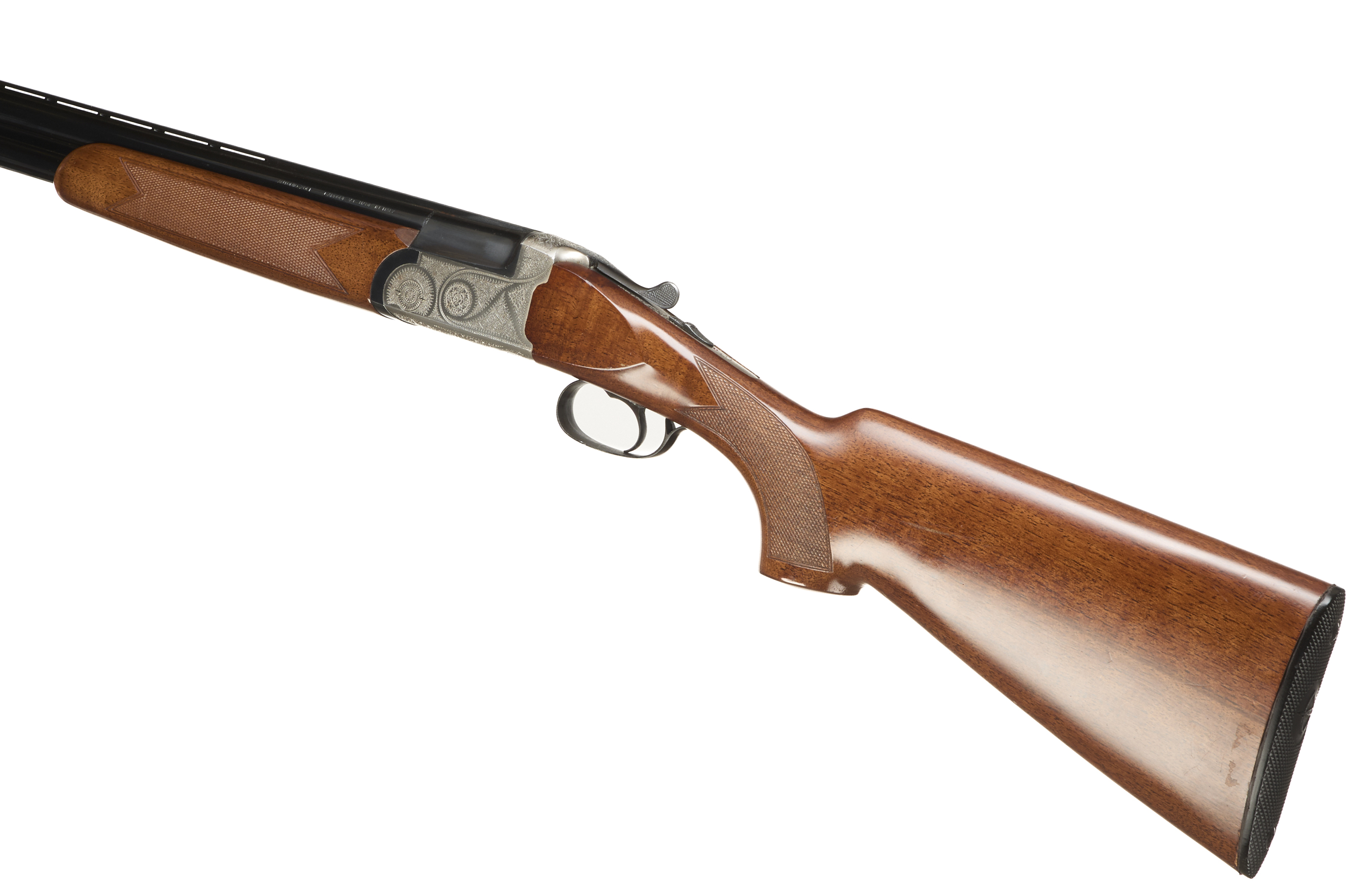 Ebonite butt pad, chequered semi-pistol grip and forend, ventilated top rib. Acanthus scrolls to action. Integrated barrel selector (selective single trigger) and safety.