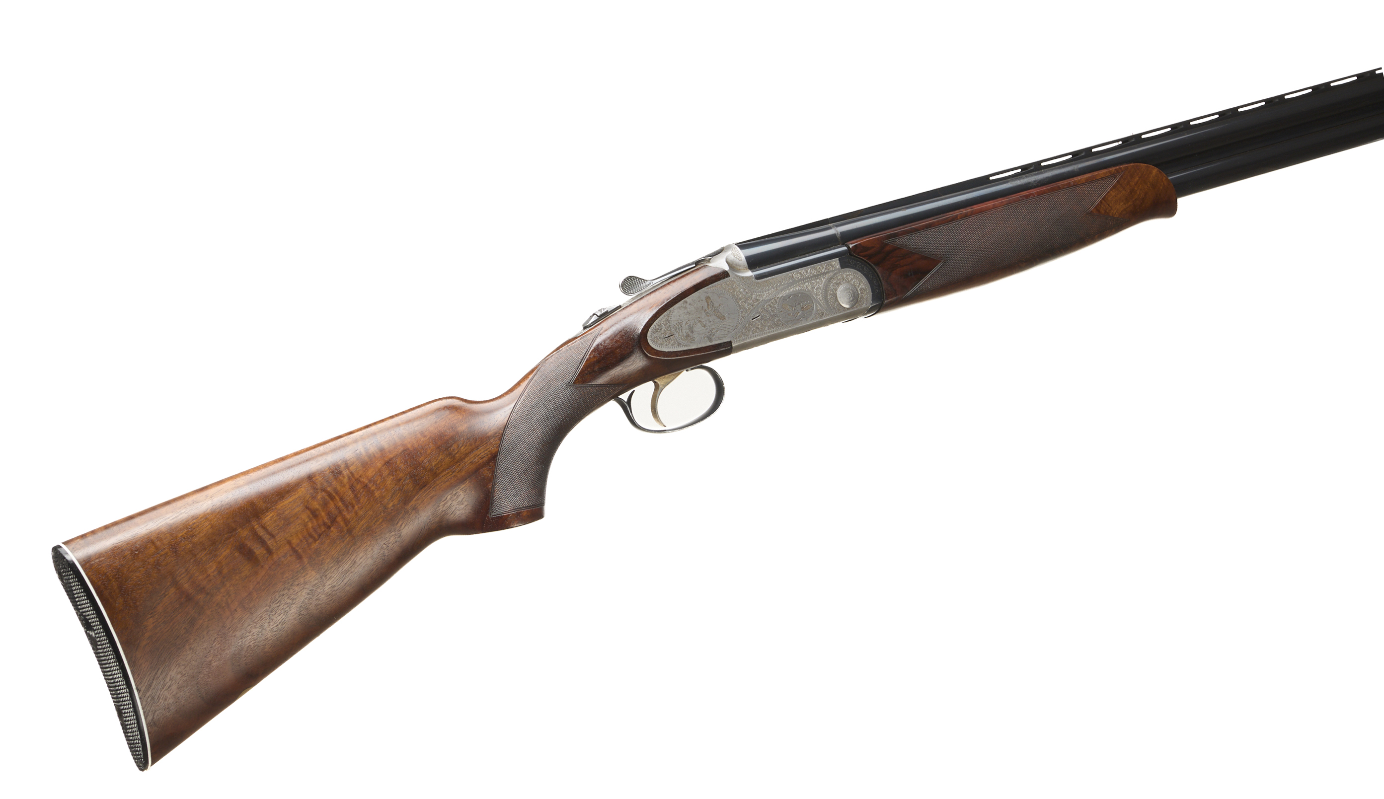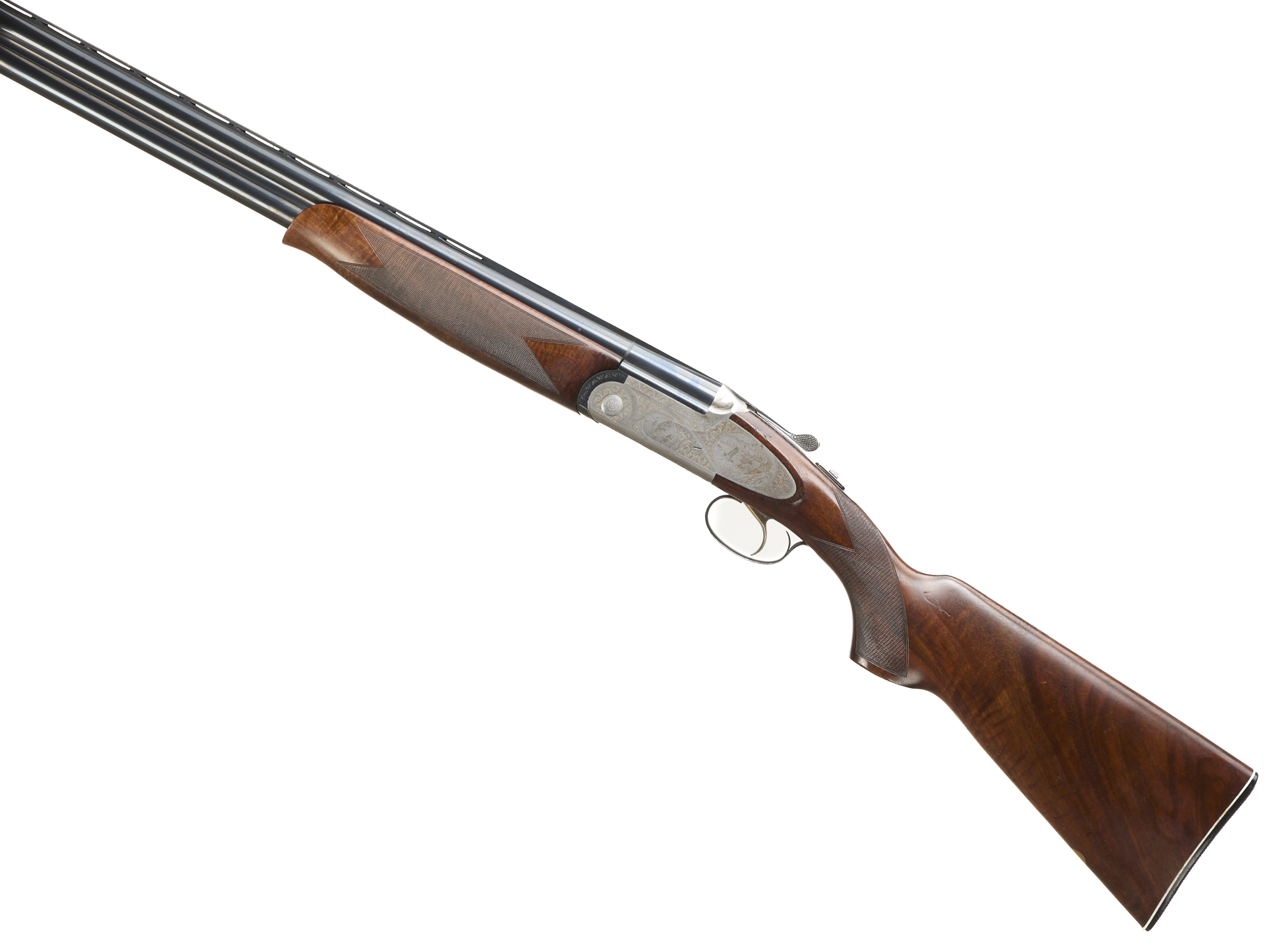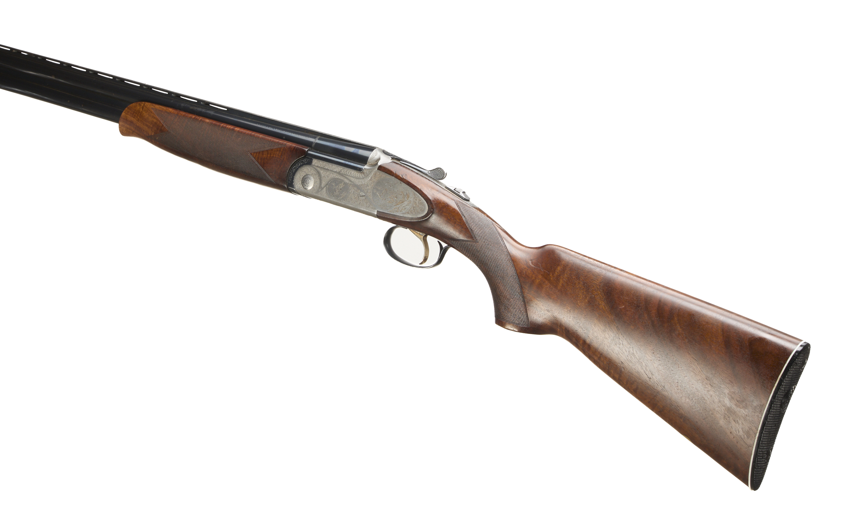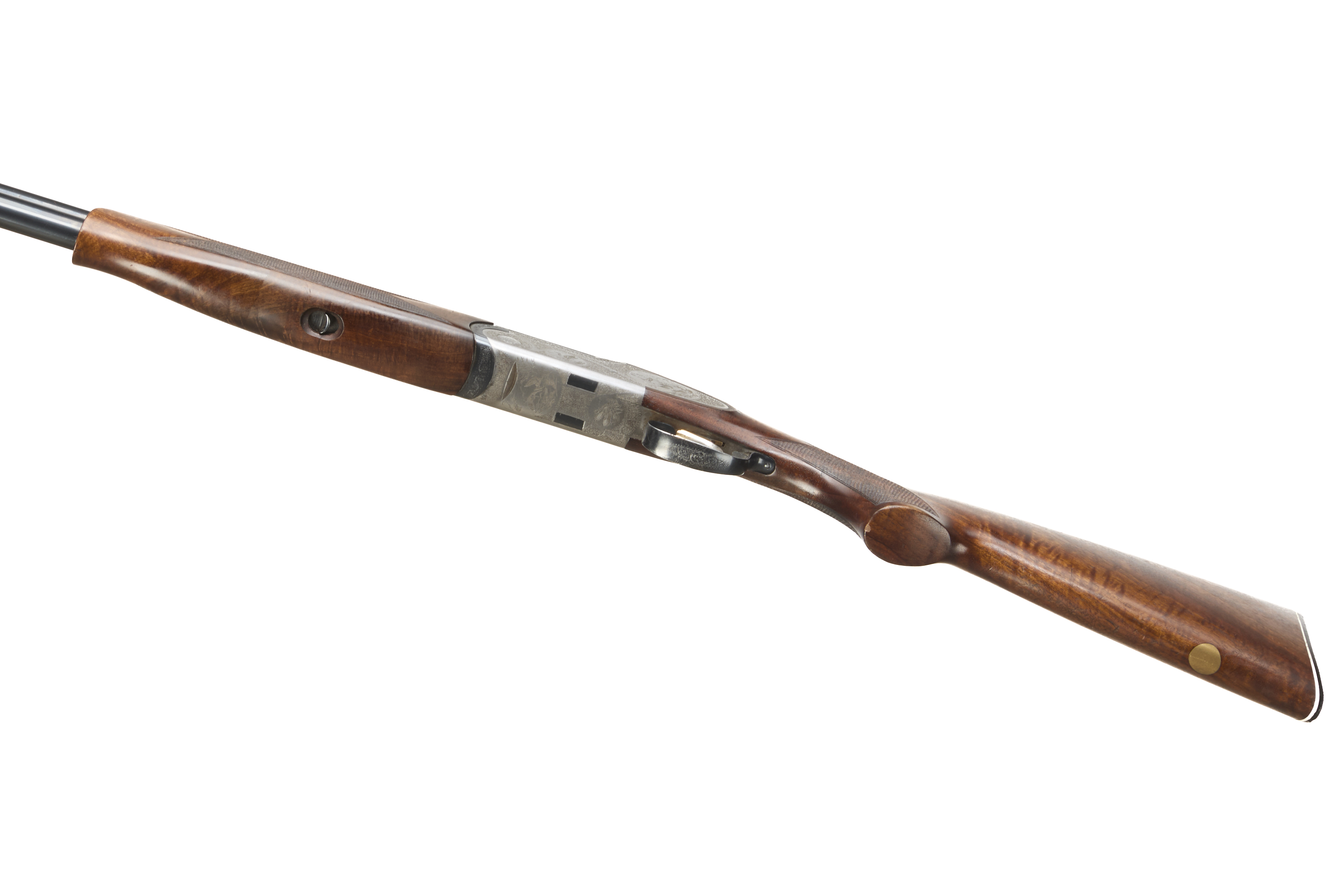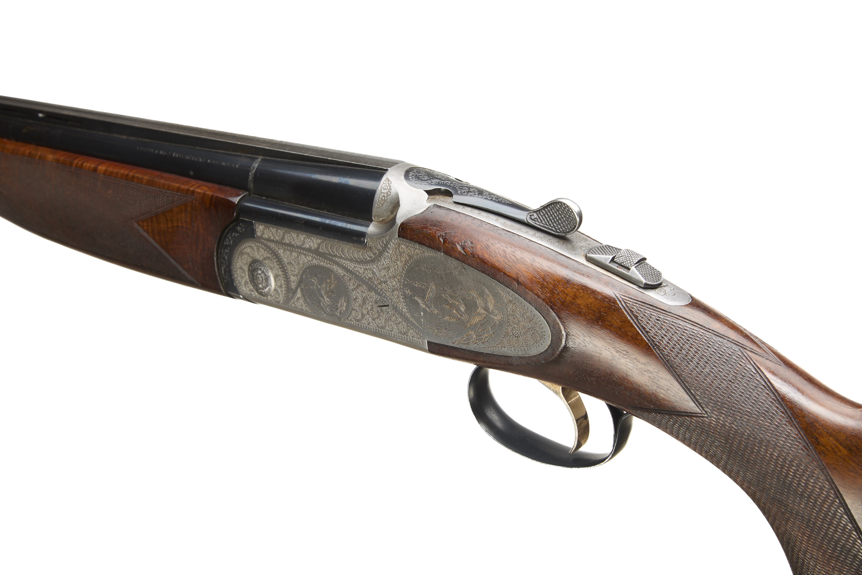 Ebonite butt pad, chequered semi-pistol grip and forend, ventilated top rib. Acanthus scrolls and game birds to action. Gold wash trigger, integrated barrel selector (selective single trigger) and safety.