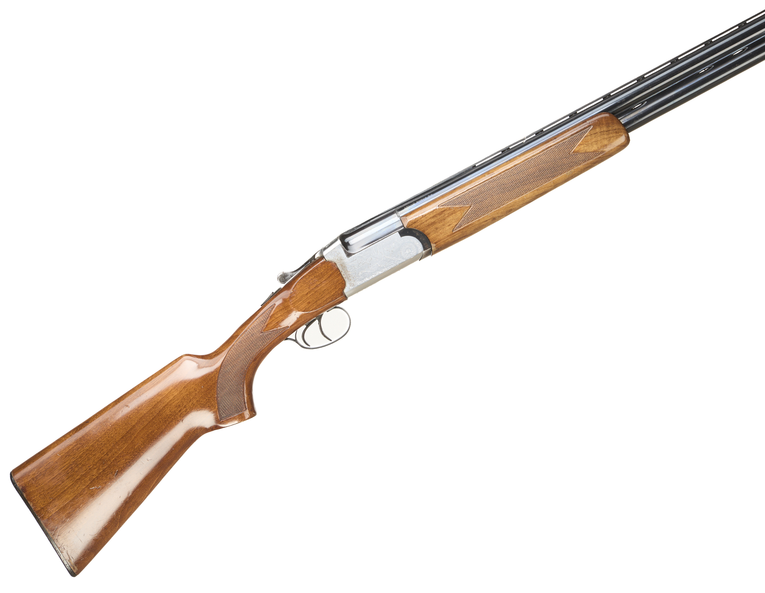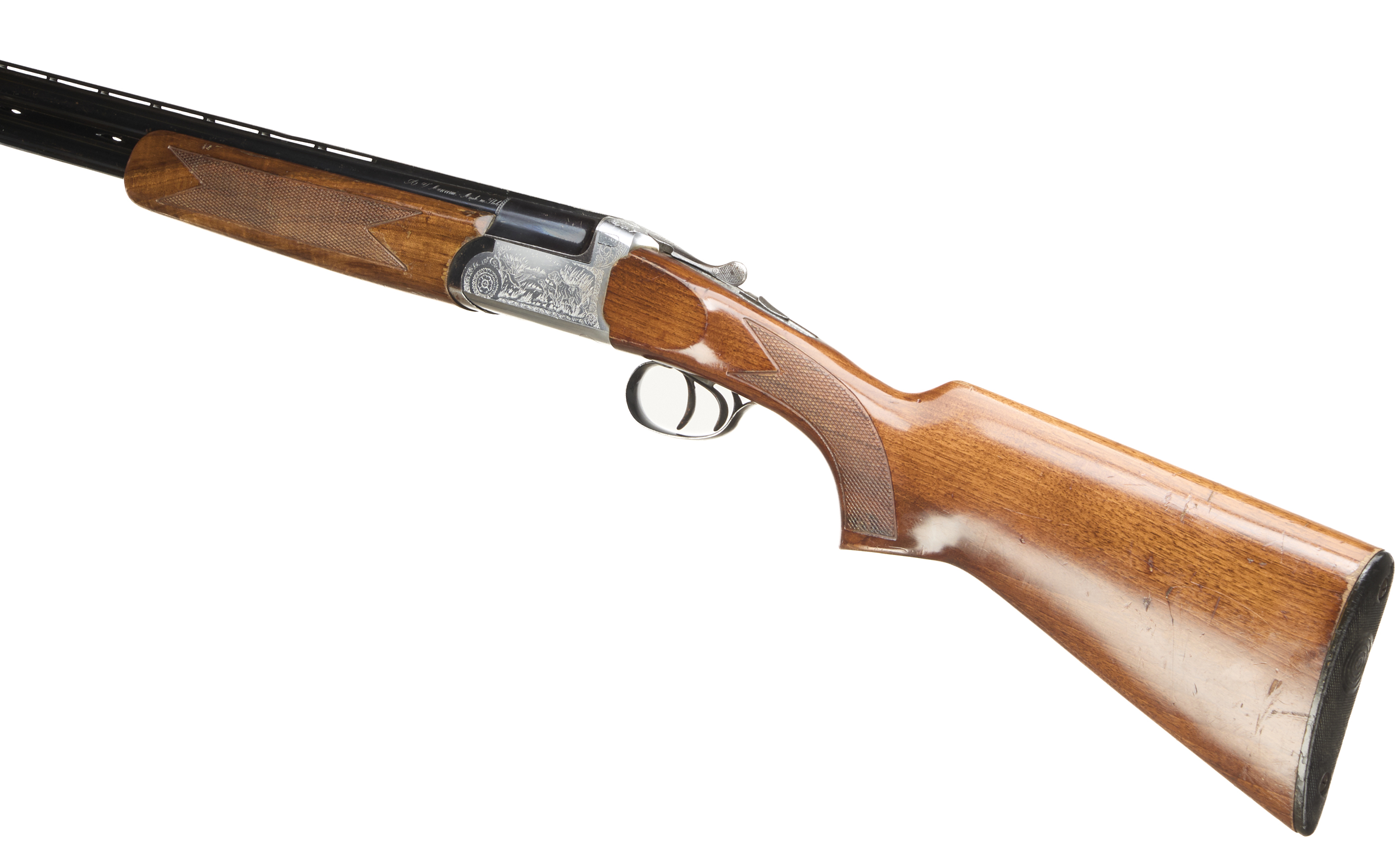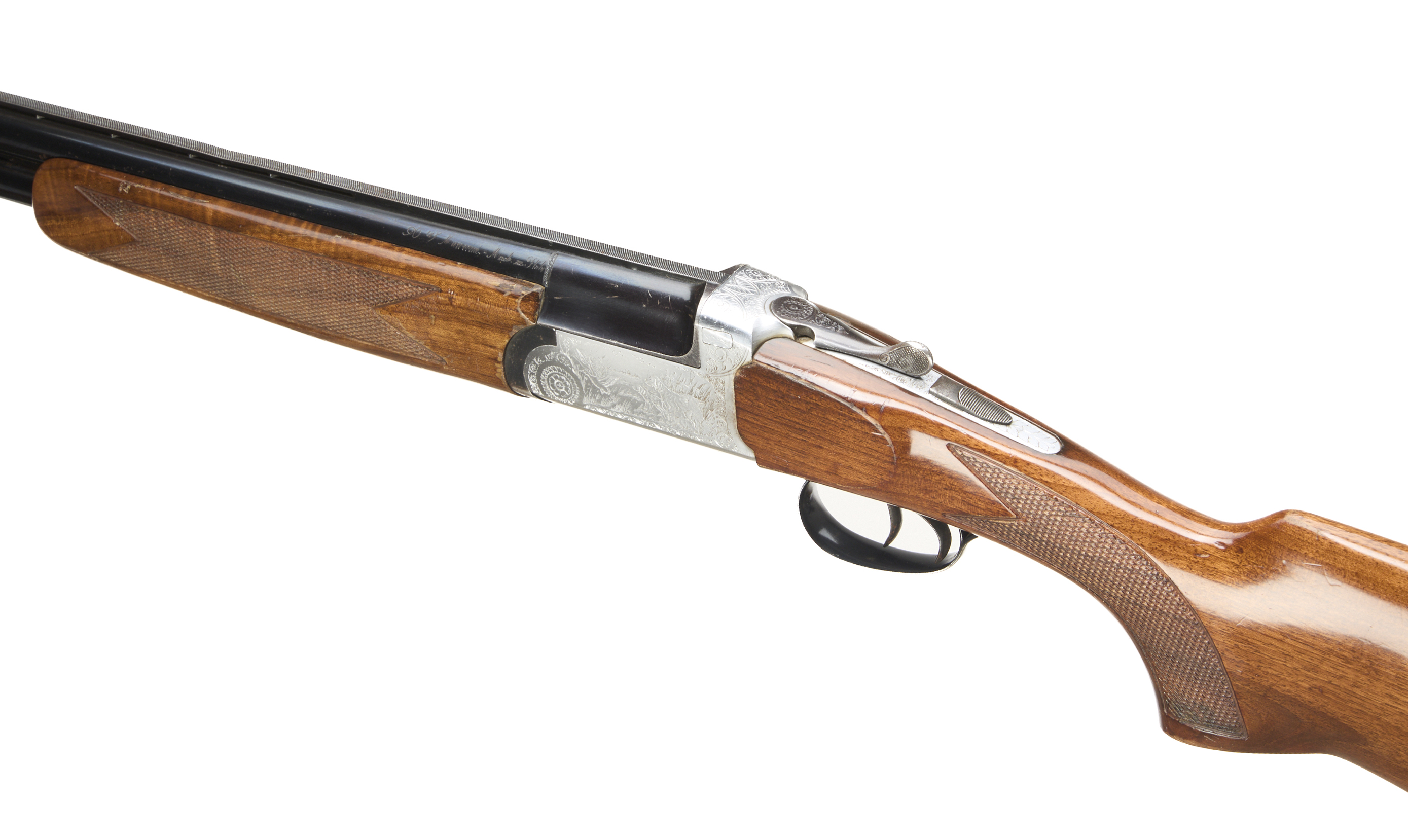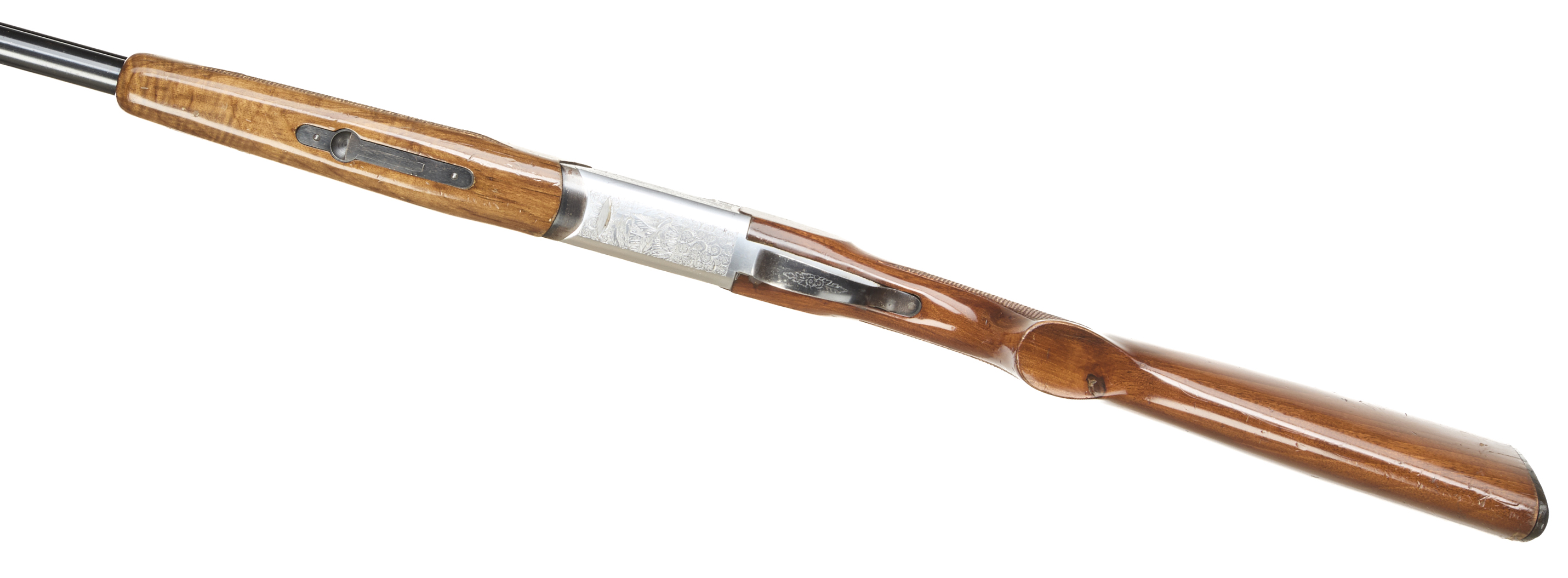 Ebonite butt pad, chequered semi-pistol grip and forend, ventilated top and mid rib. Game scene and acanthus scrolls to action. Double trigger and safety.