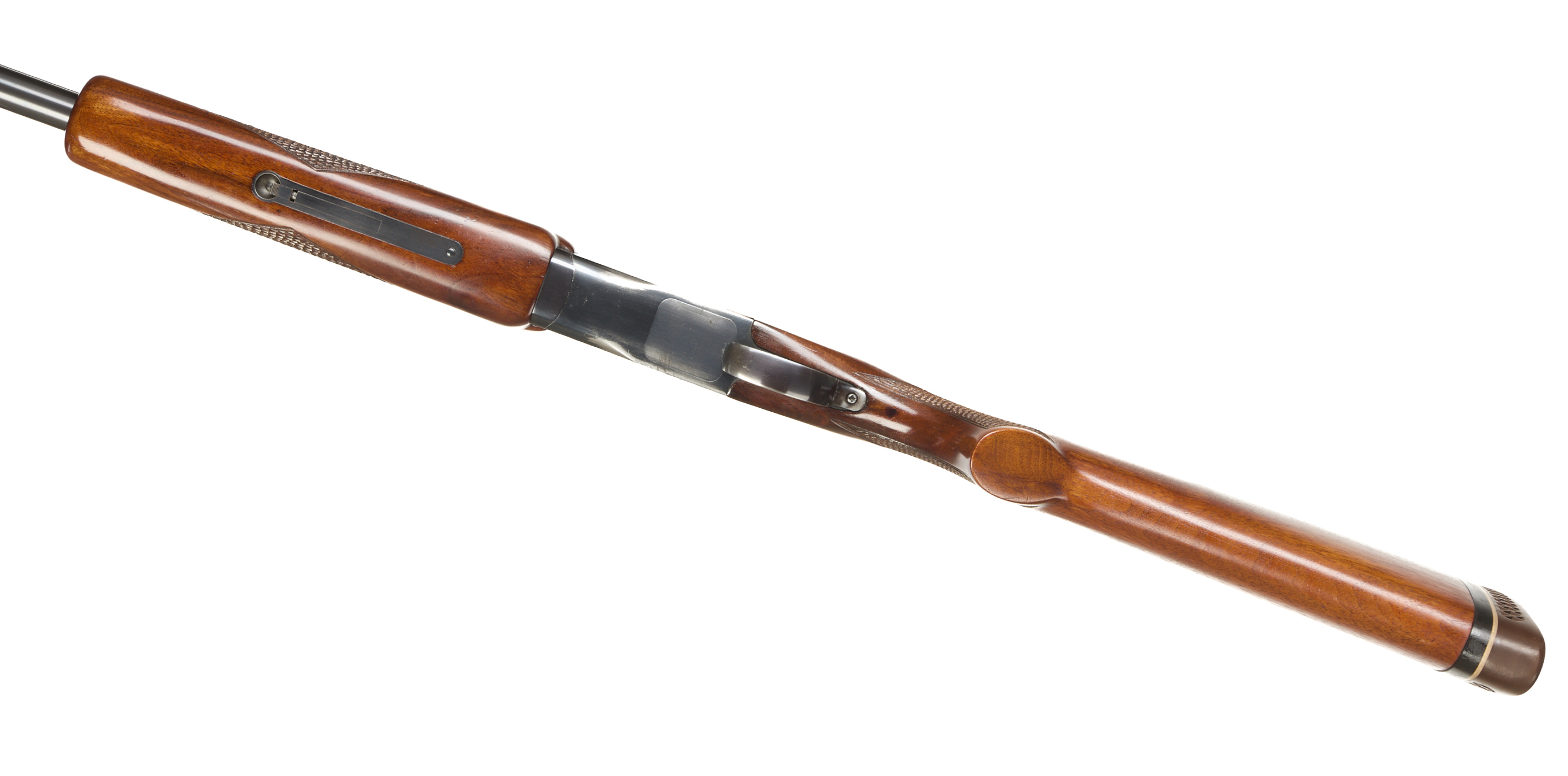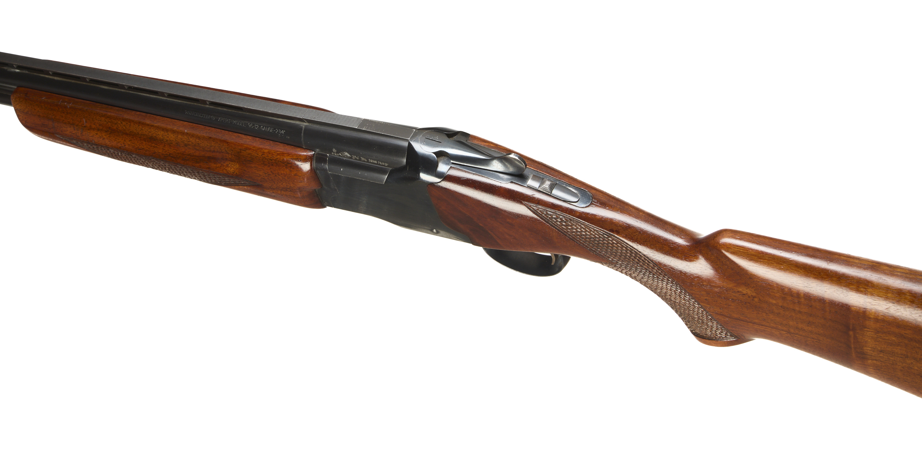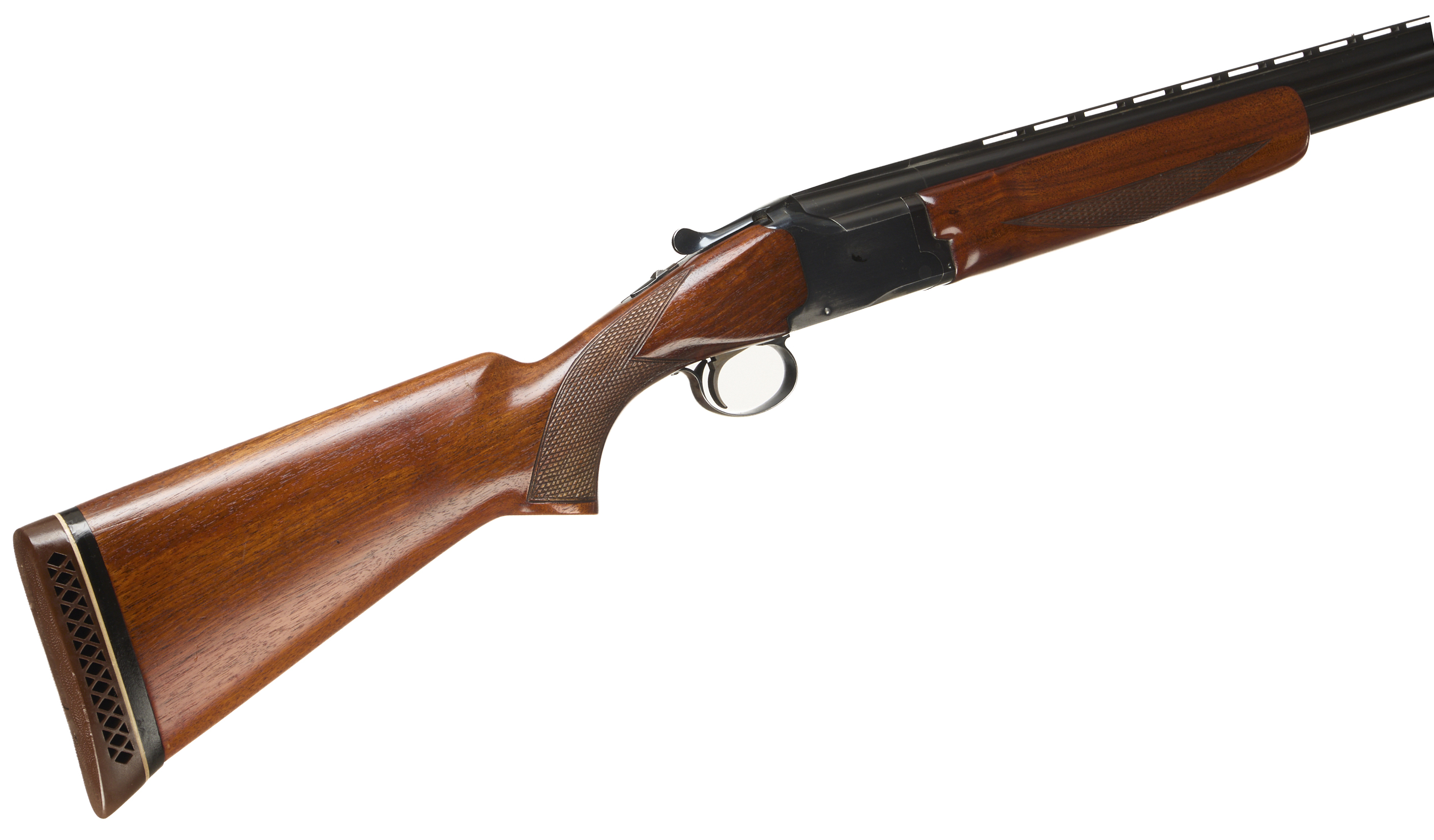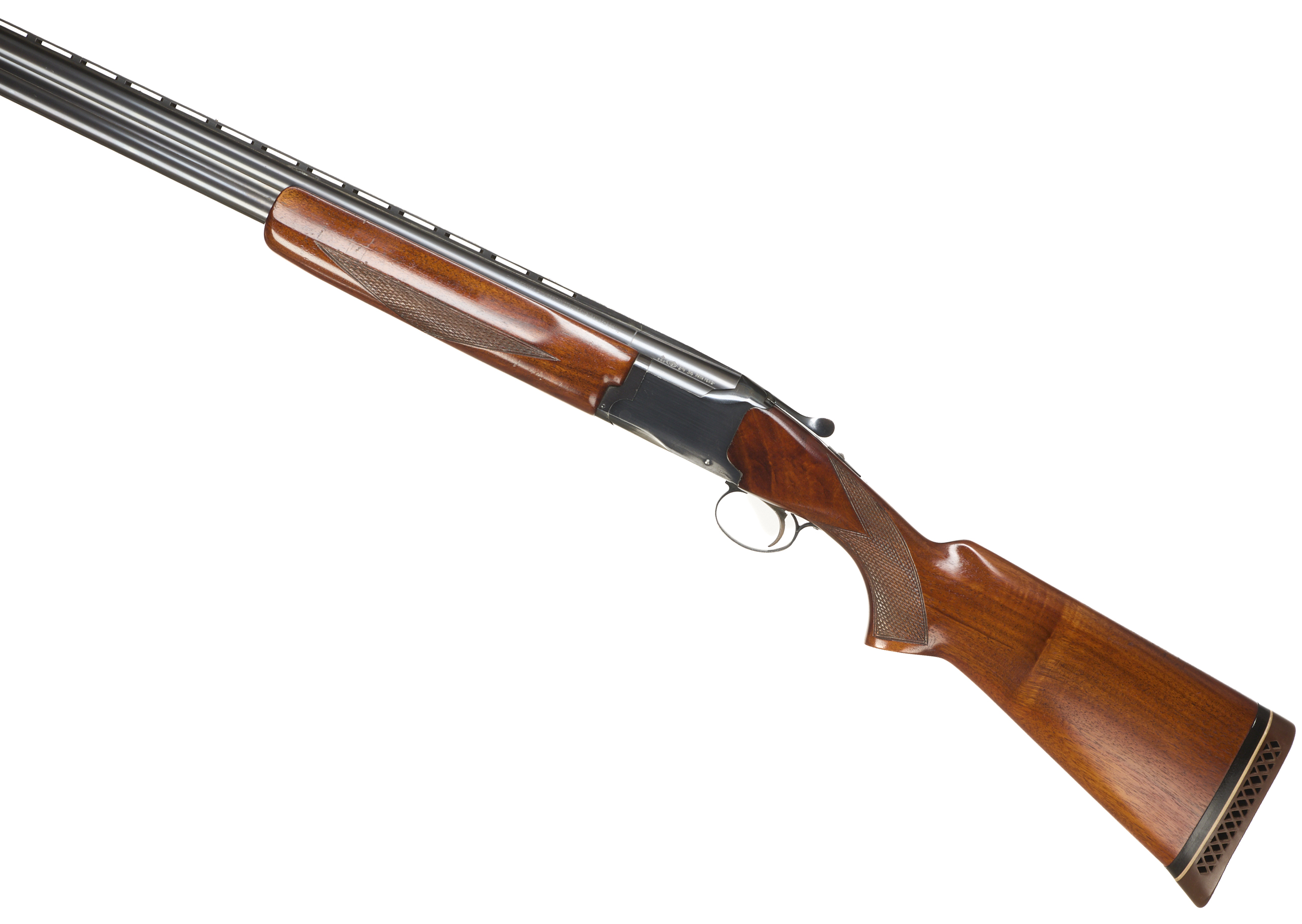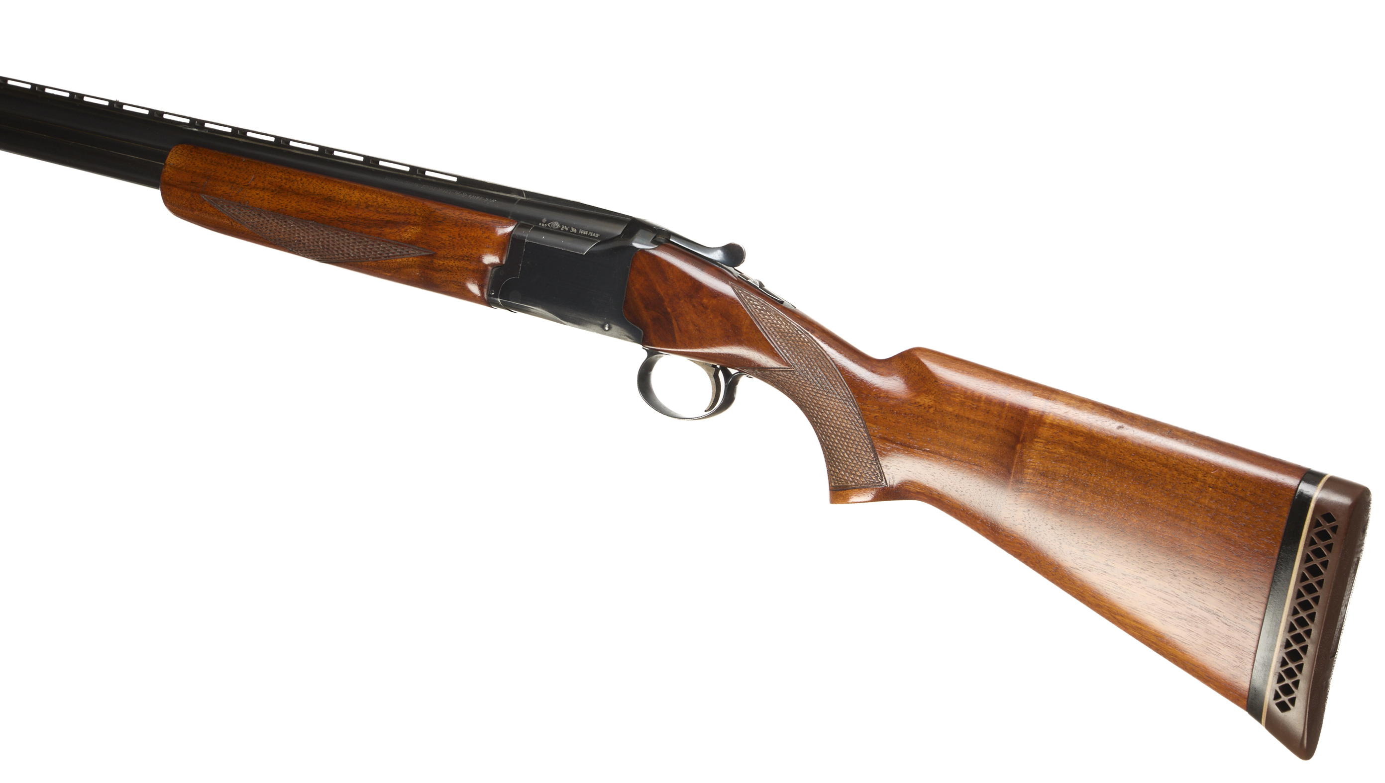 Ventilated butt pad, chequered semi-pistol grip and forend, ventilated top rib. Unadorned action. Faded gold wash trigger, integrated barrel selector (selective single trigger) and safety.