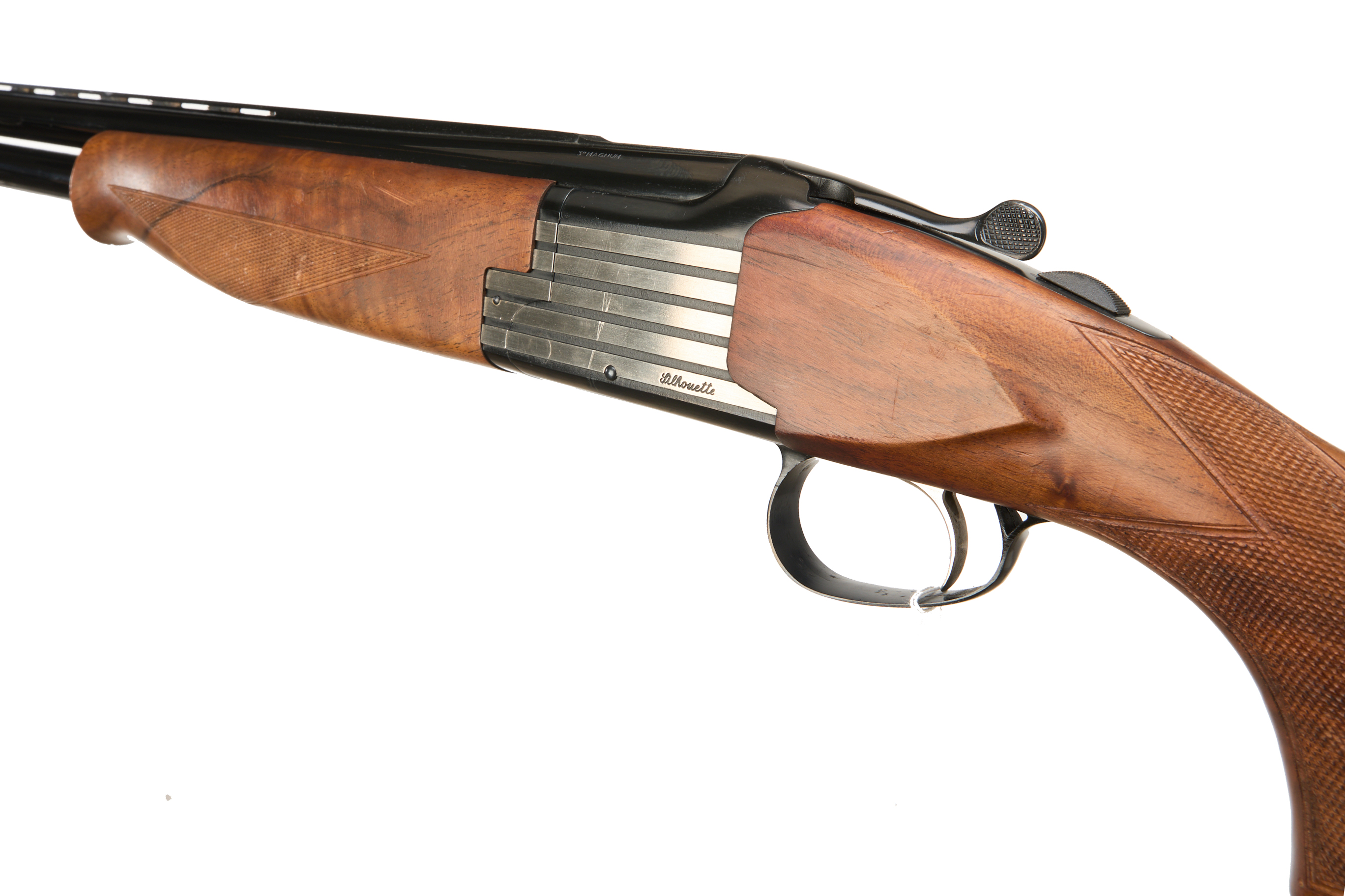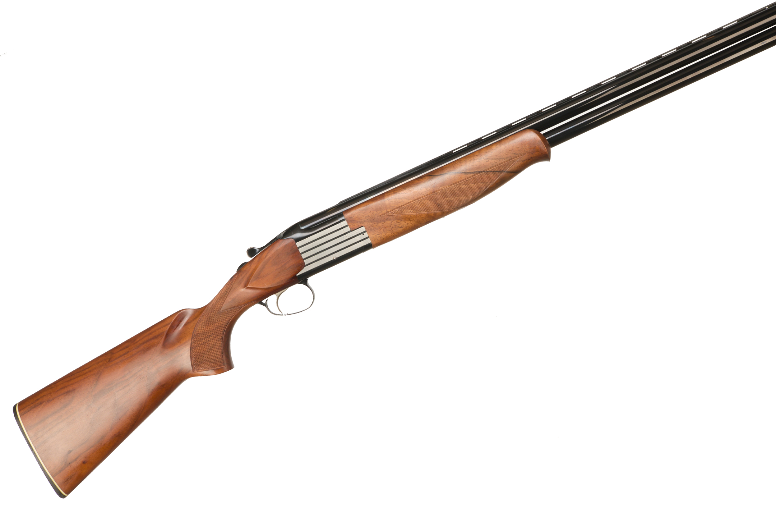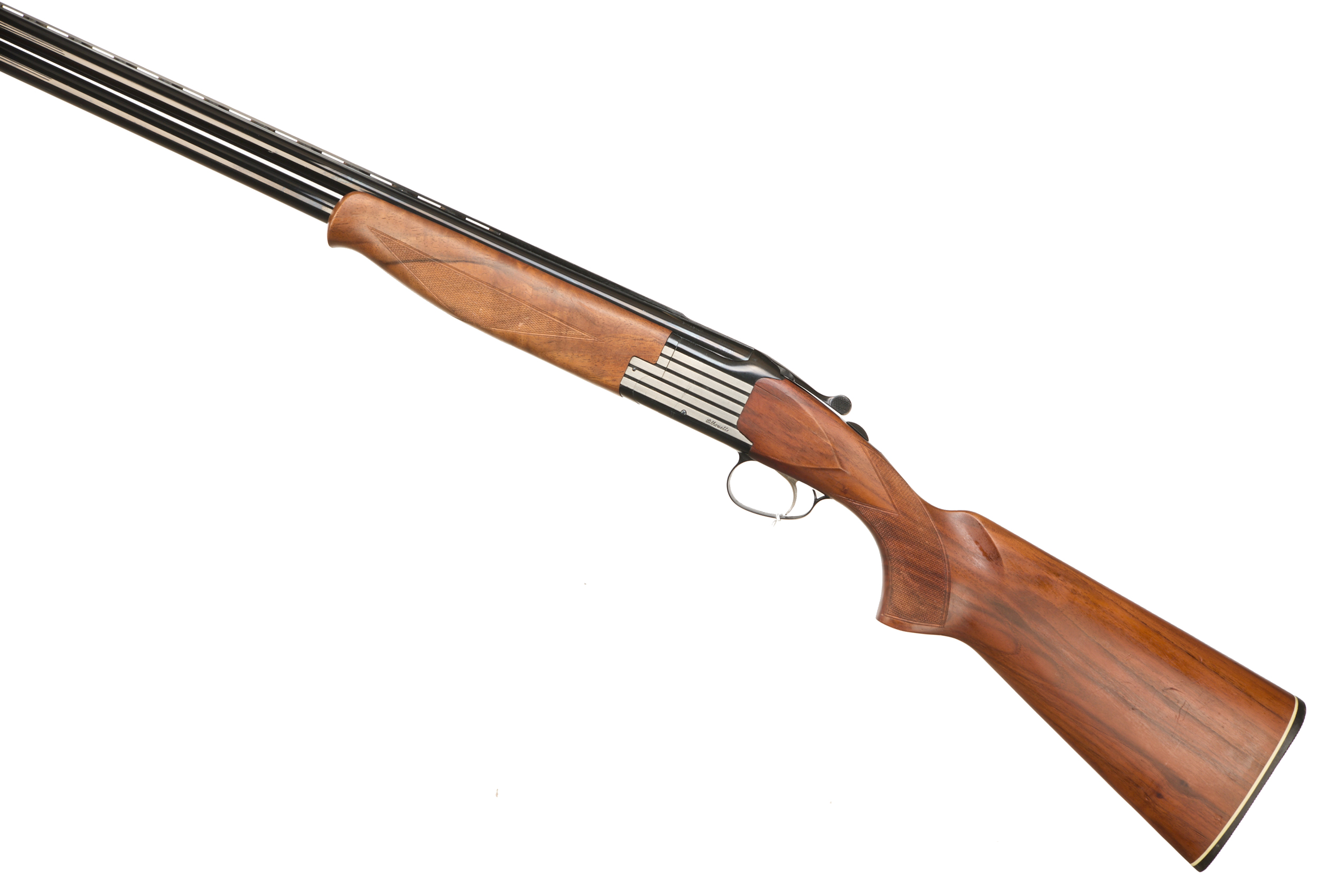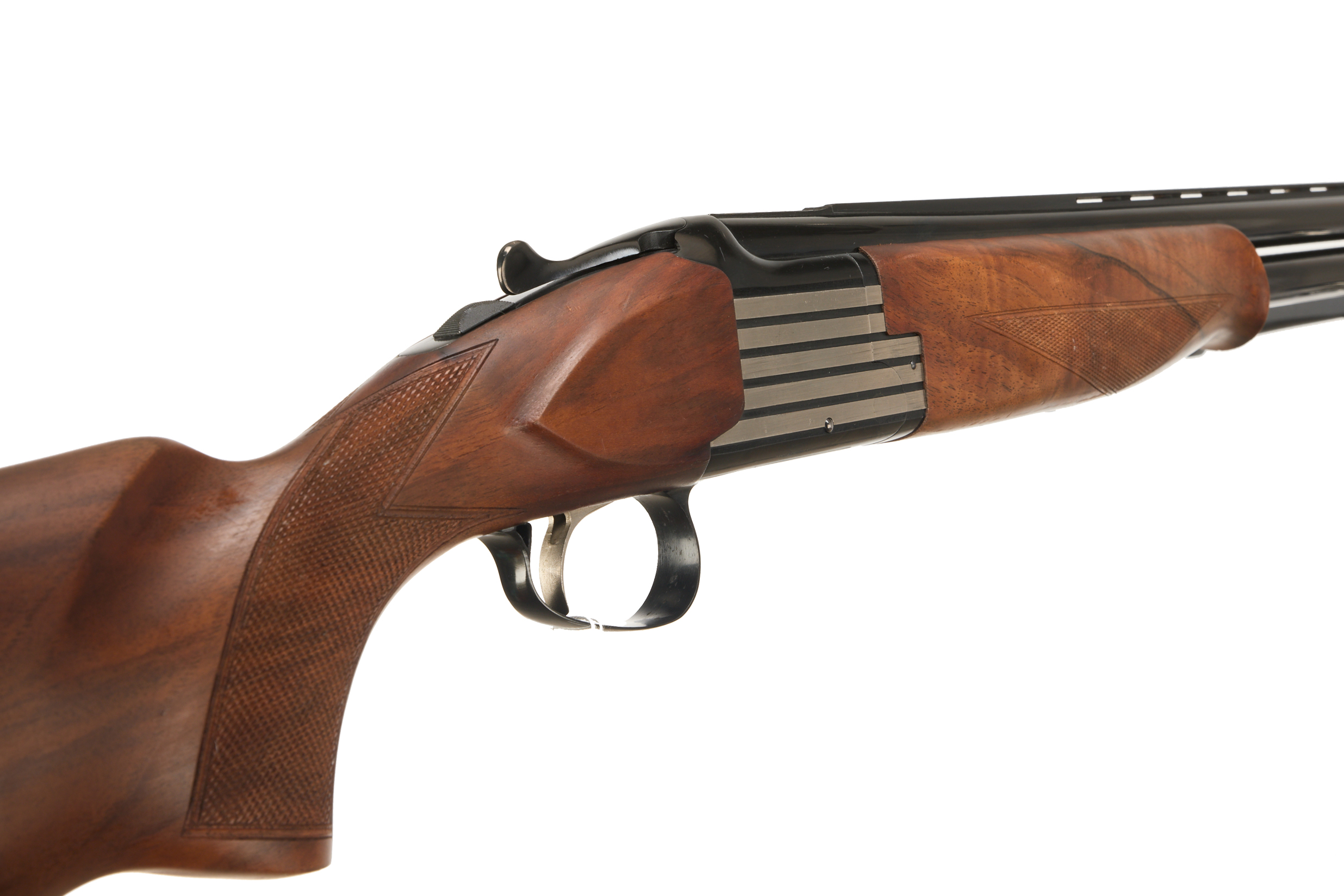 Hard plastic butt pad, chequered semi-pistol grip and forend, straight grip, ventilated top and mid rib. Raised metal striping to action. Silver coloured metal trigger with black metal trigger guard, integrated barrel selector (selective single trigger) and safety.