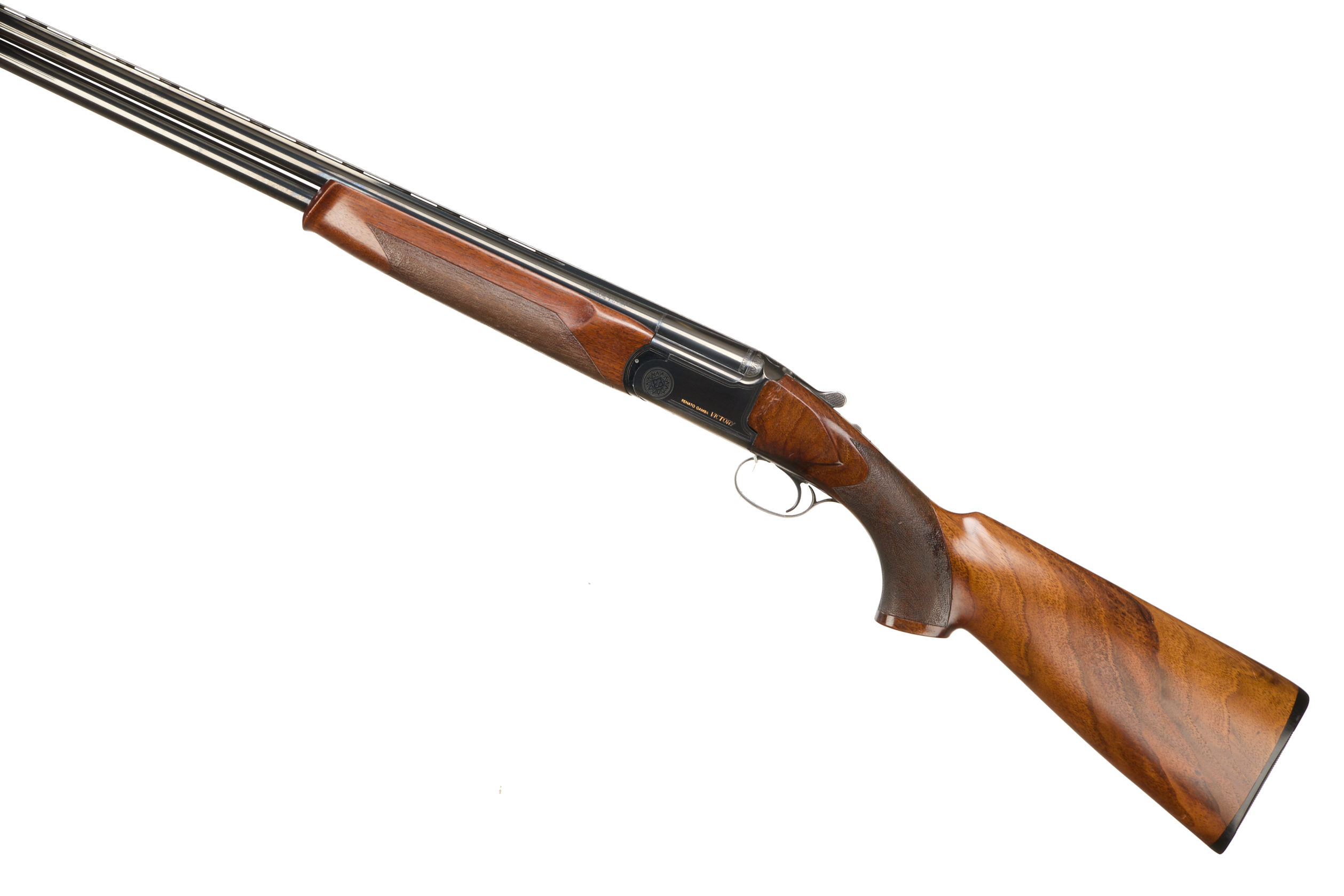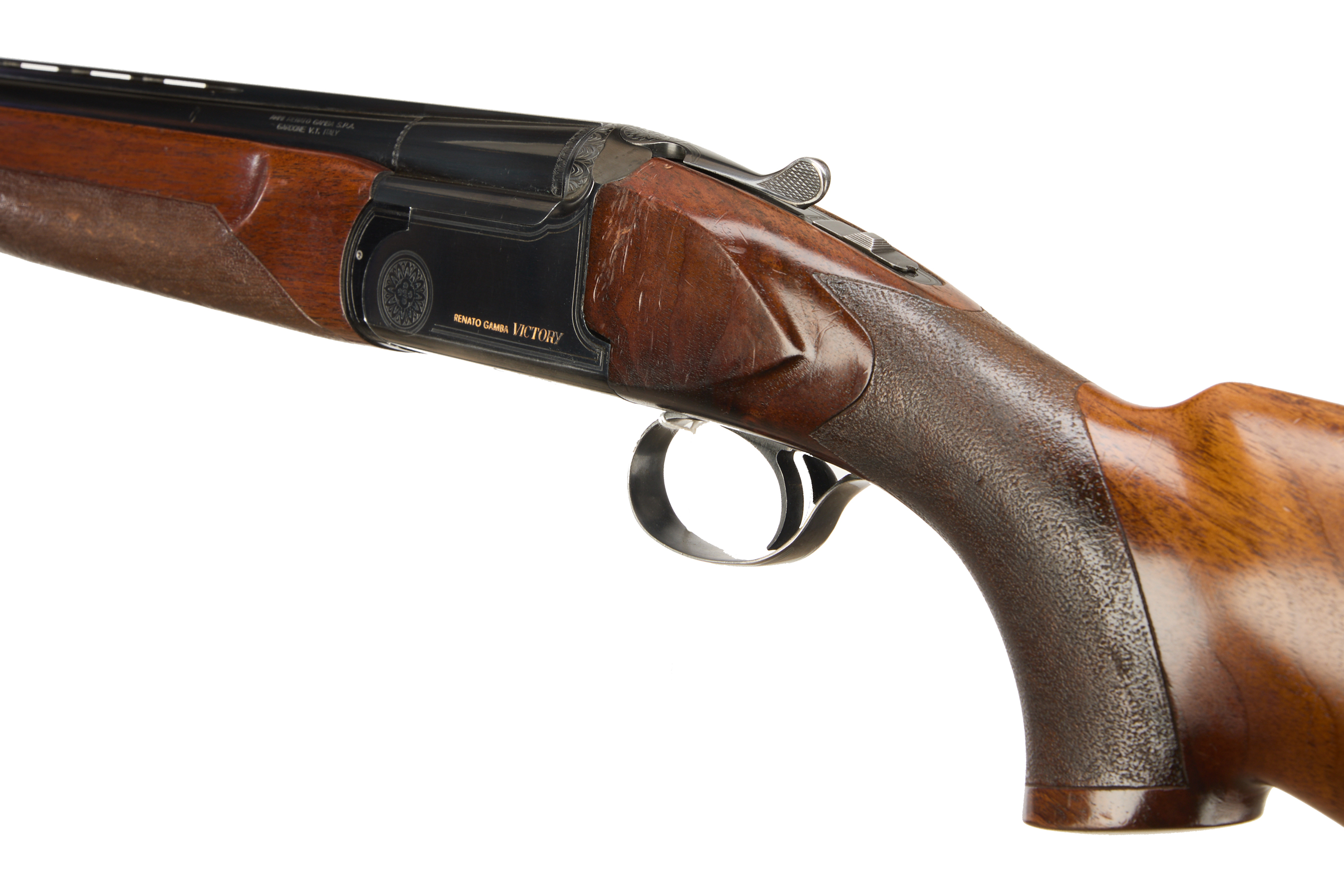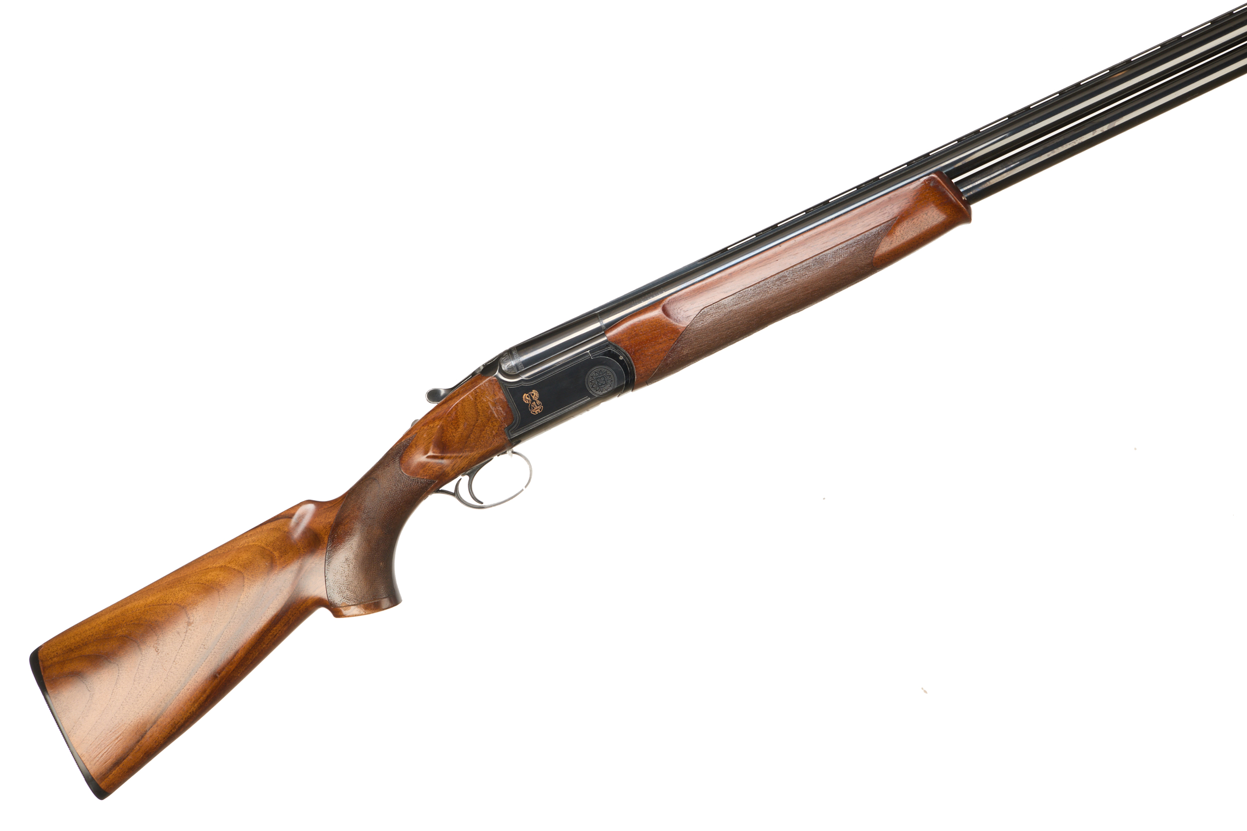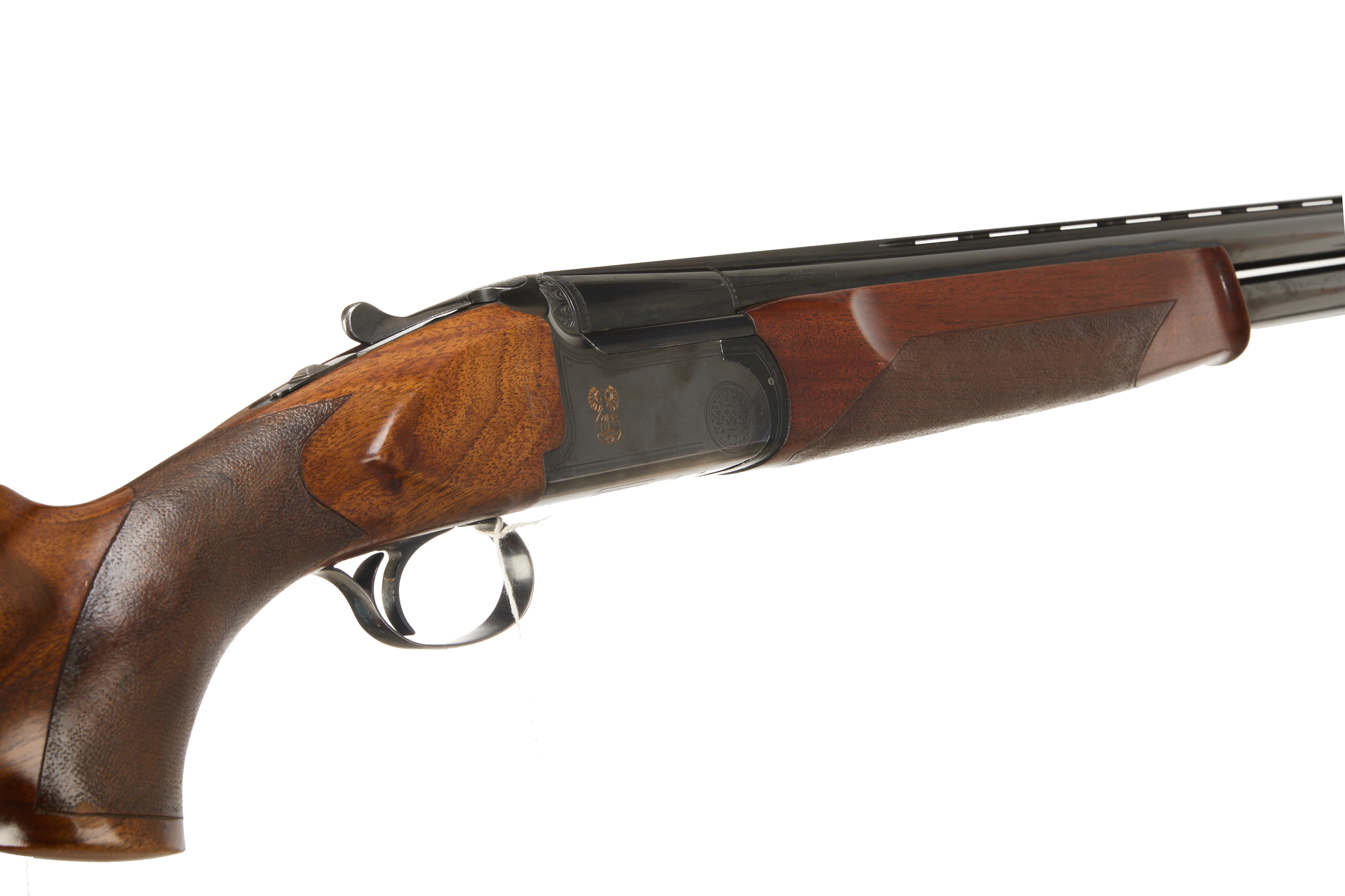 Hard plastic butt pad, textured full pistol grip and forend, RH palm swell, ventilated top and mid rib. Engraved logo and circular flower motif to action. Integrated barrel selector (selective single trigger) and safety.