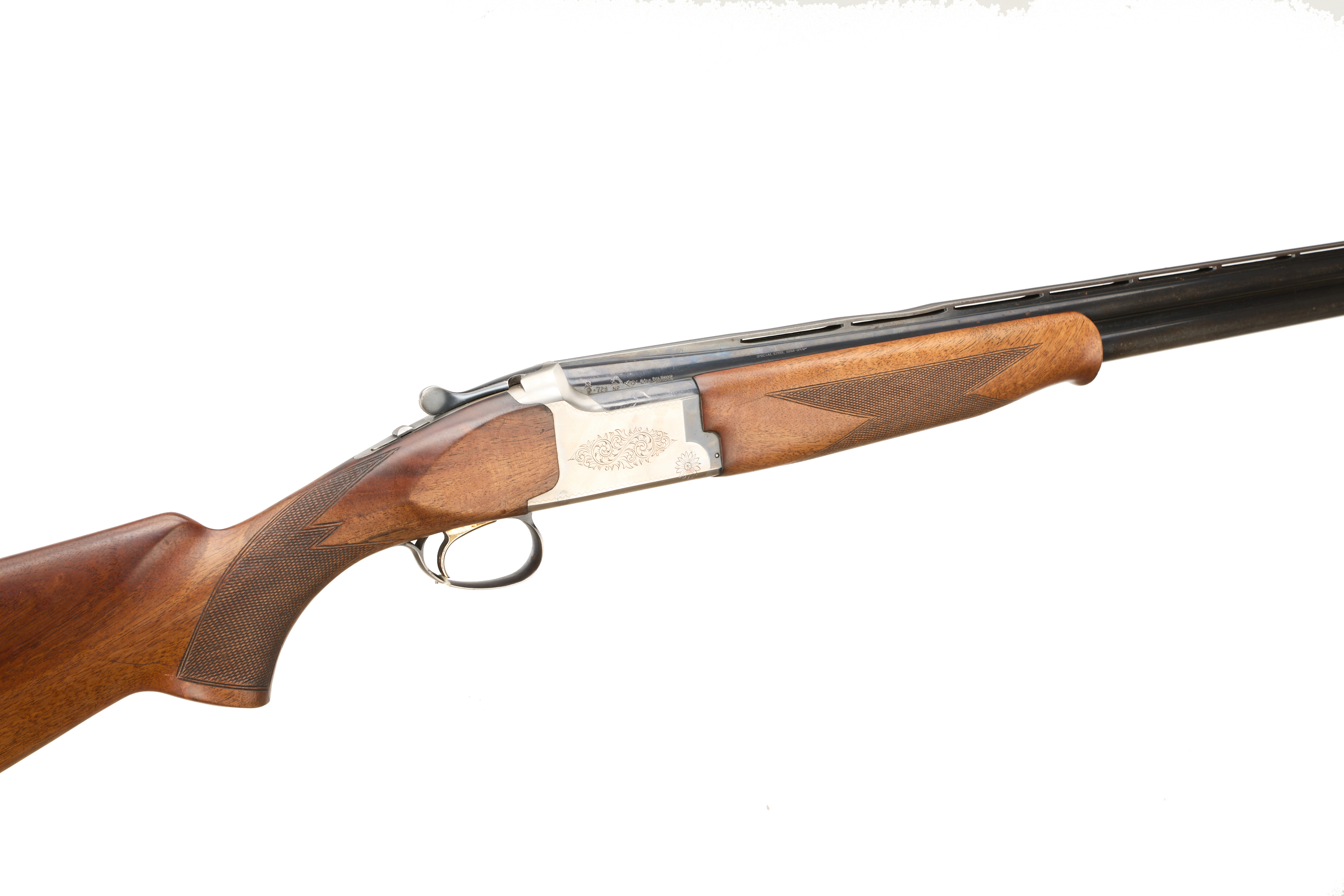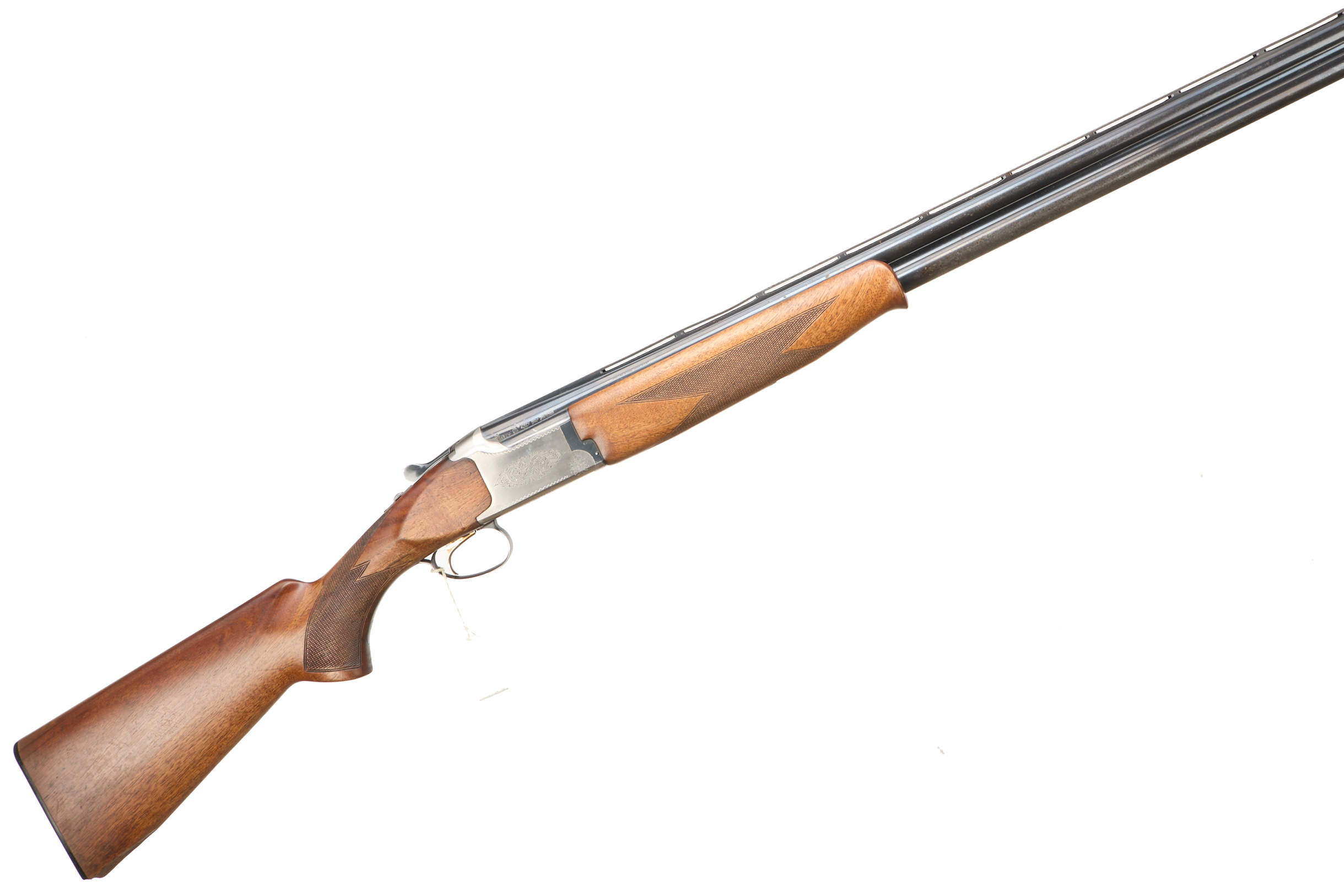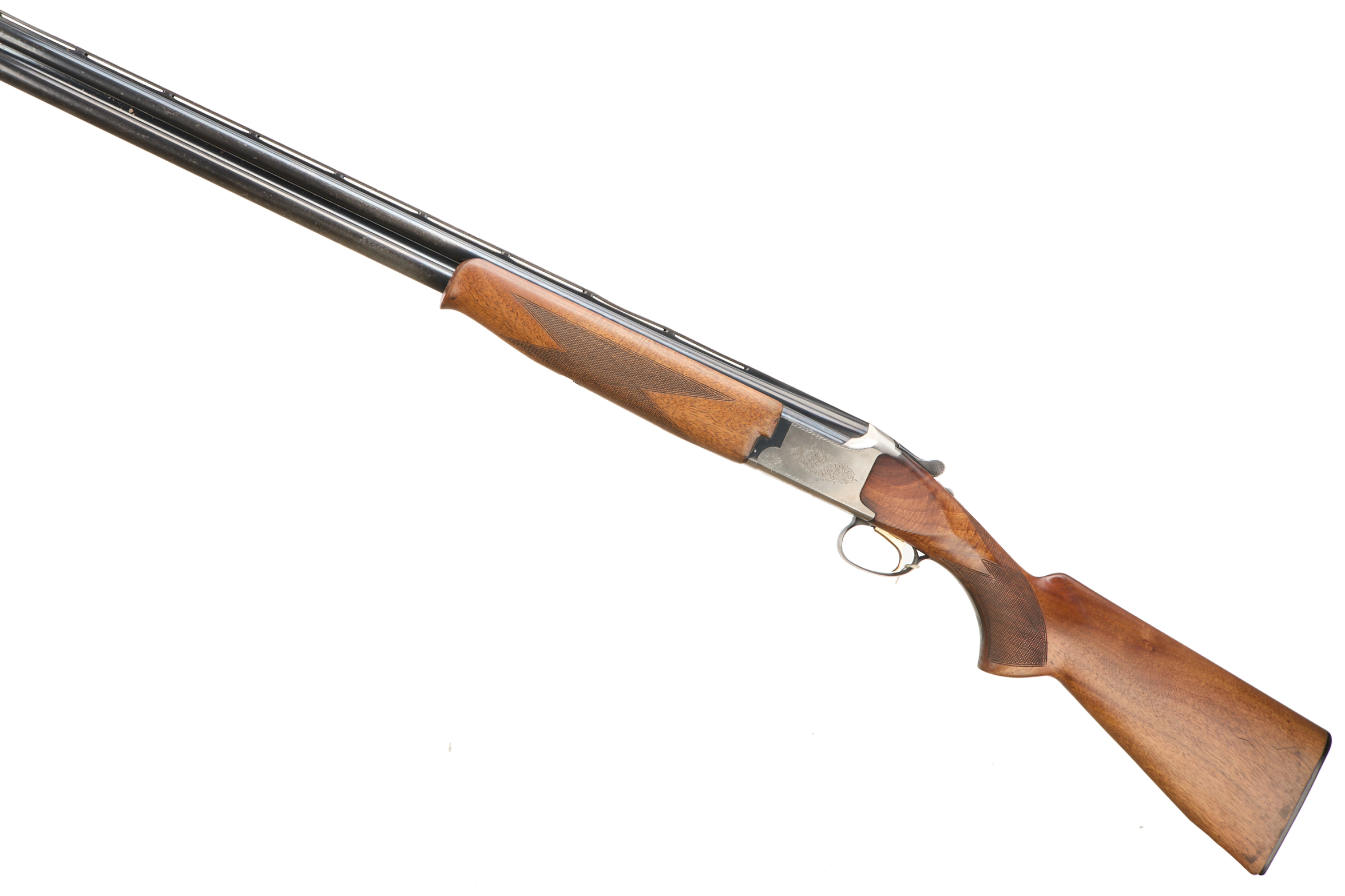 Ebonite butt pad, chequered semi-pistol grip and forend, ventilated top and mid rib. Acanthus scrolls to action. Gold wash trigger, integrated barrel selector (selective single trigger) and safety.
