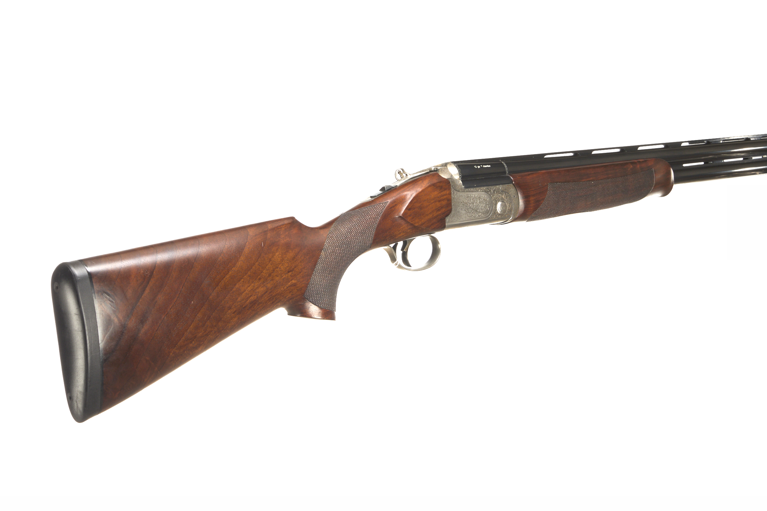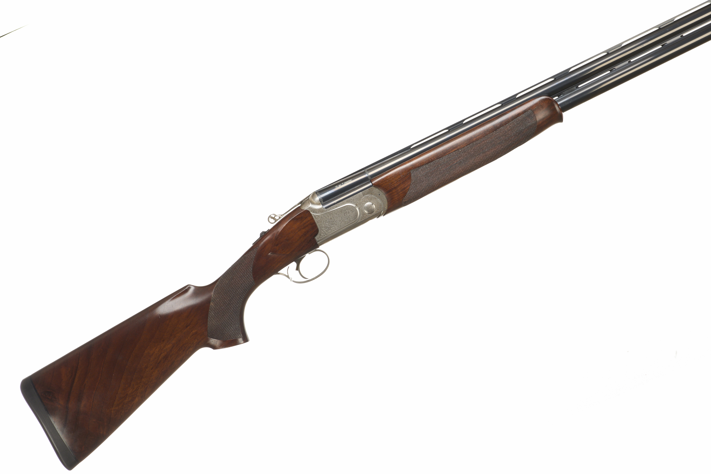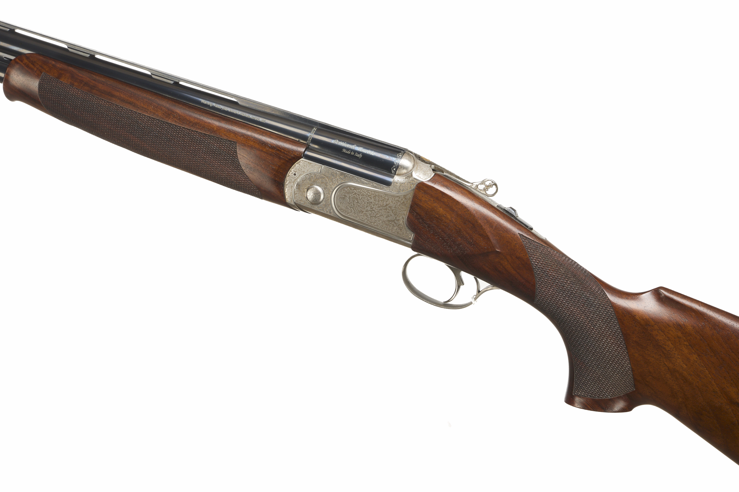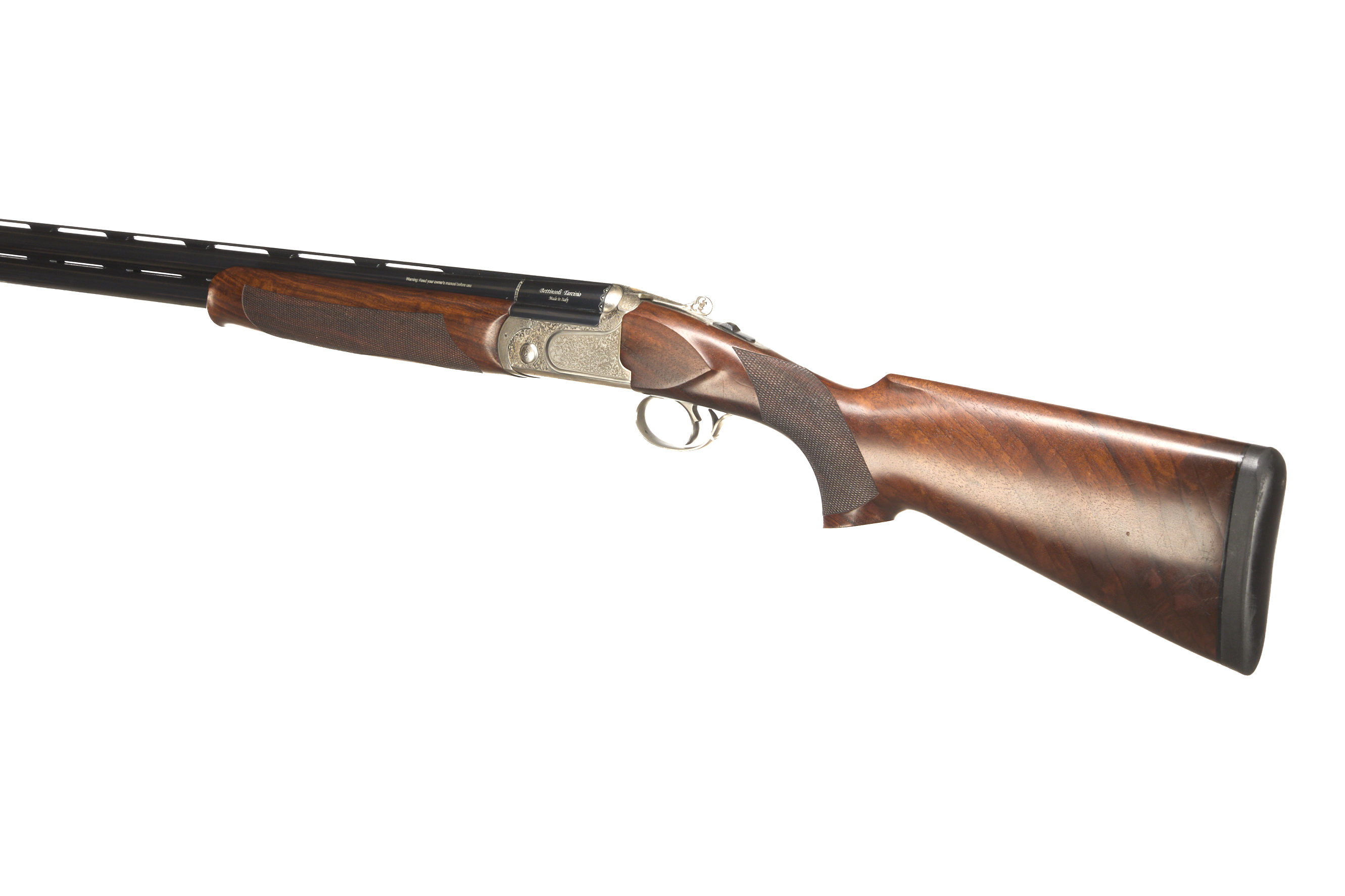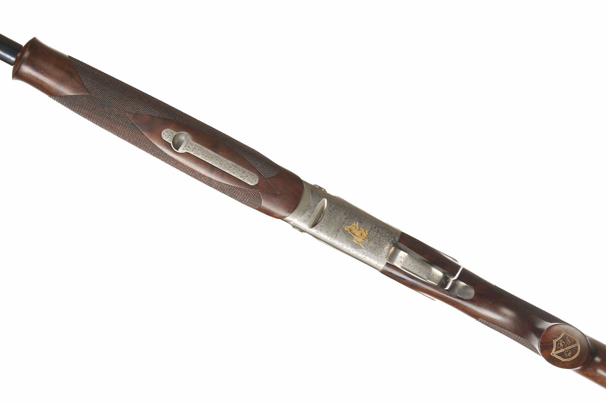 Cushioned butt pad, with a richly figured stock, chequered semi-pistol grip and forend, ventilated top and mid rib. Open top lever inlaid with gold. Extensive acanthus scrolls to action. Integrated barrel selector (selective single trigger) and safety. Extending multi choke (inc spares) Original case.