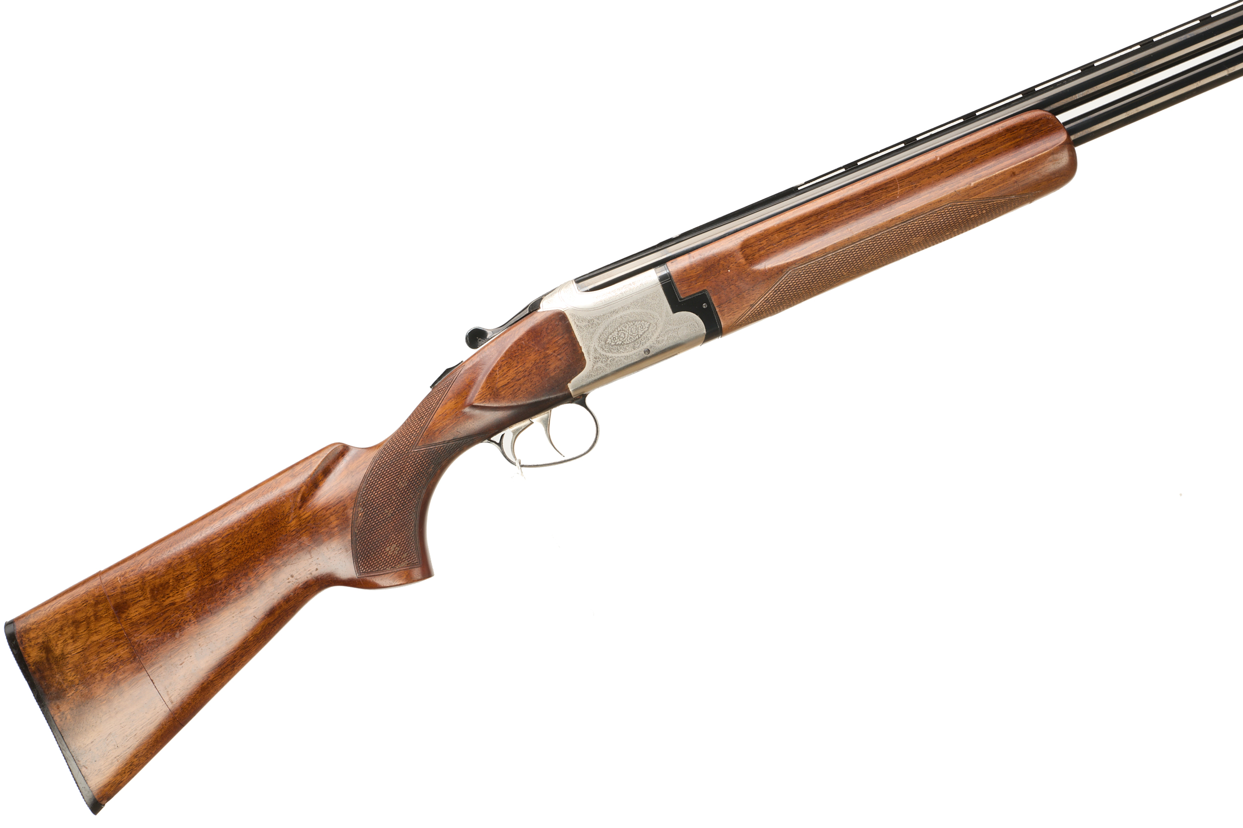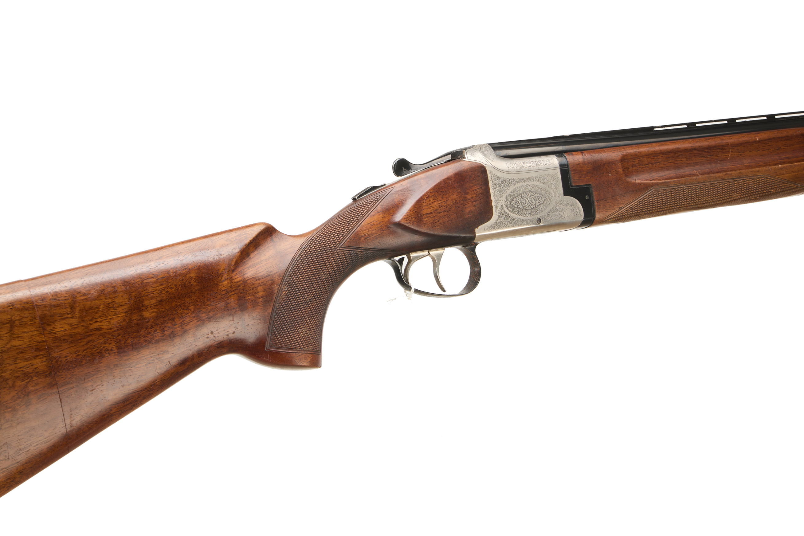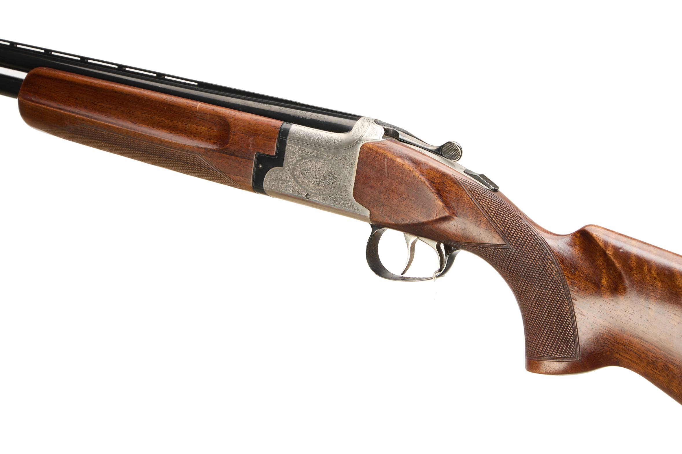 Chequered, hard, butt pad, well-matched extension, chequered semi-pistol grip and forend with rounded tip, ventilated top, mid rib absent. Extensive acanthus scrolls to bright action. Twin/single triggers, hold-open top lever and safety.