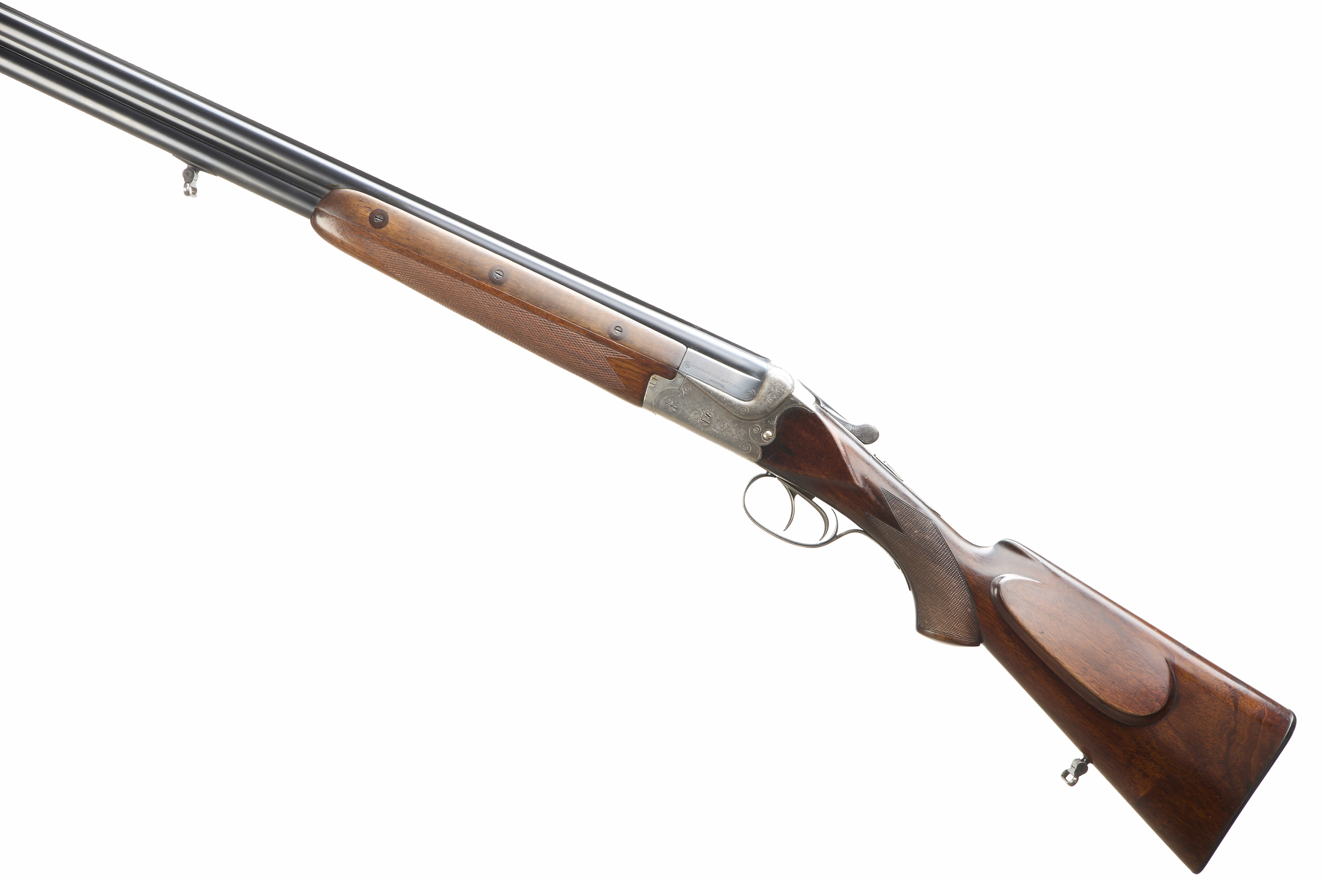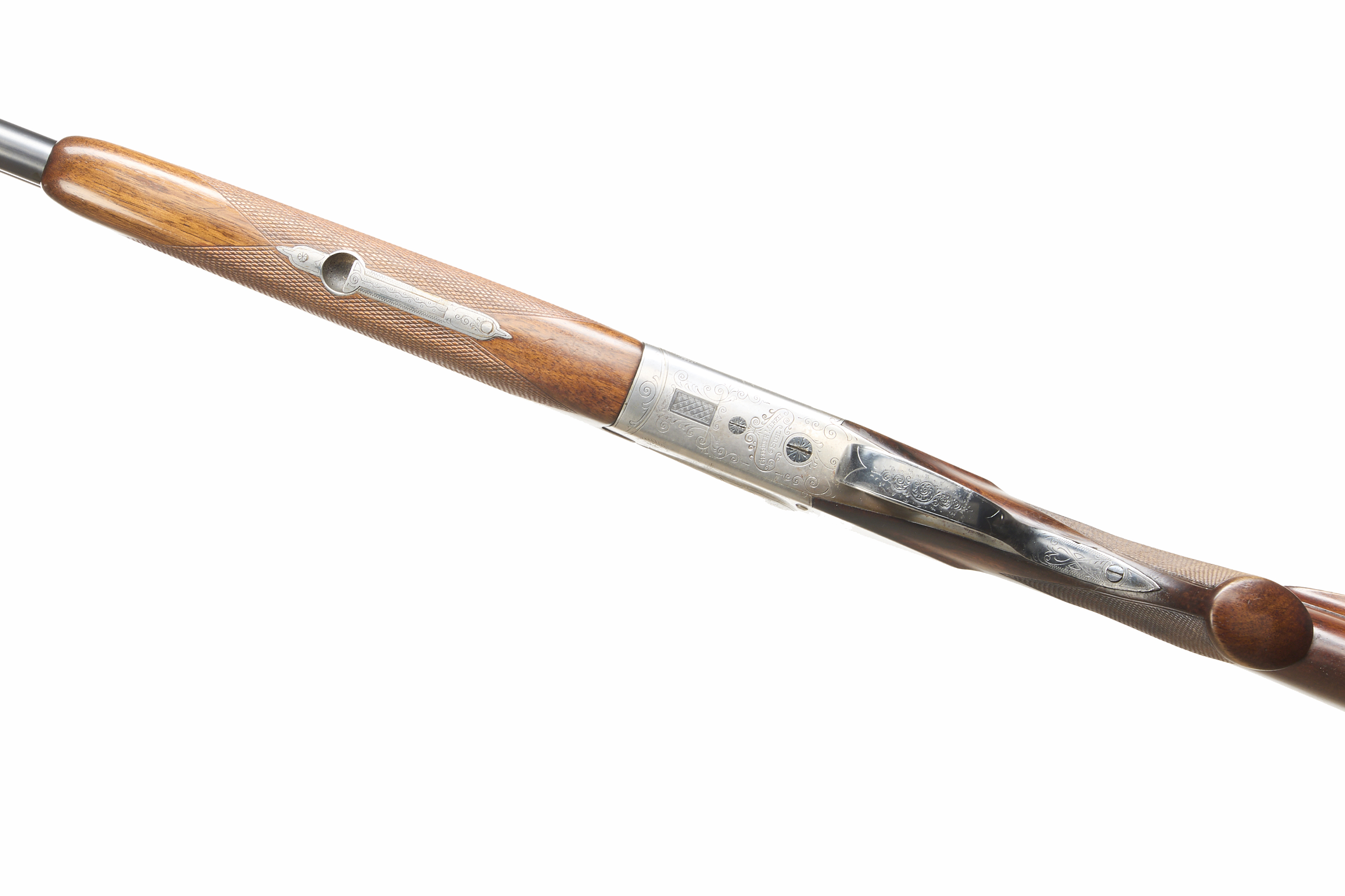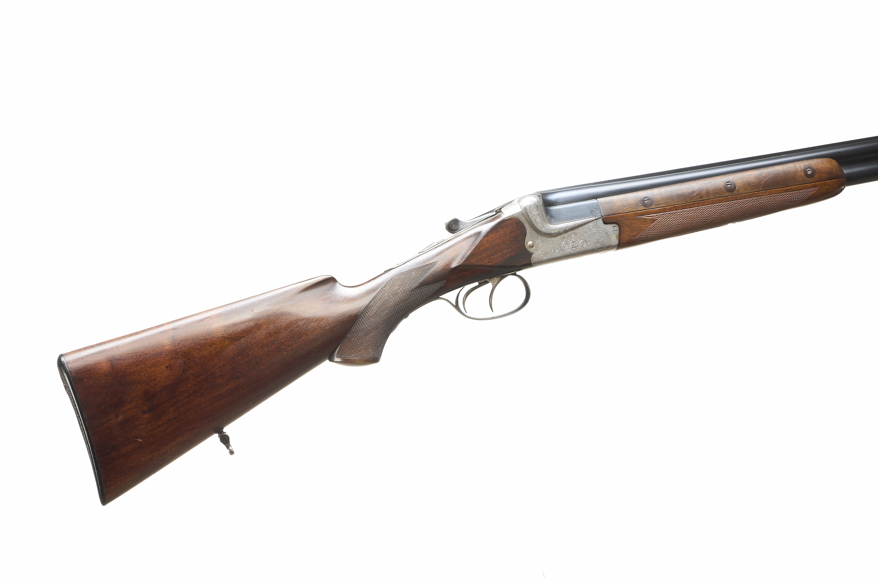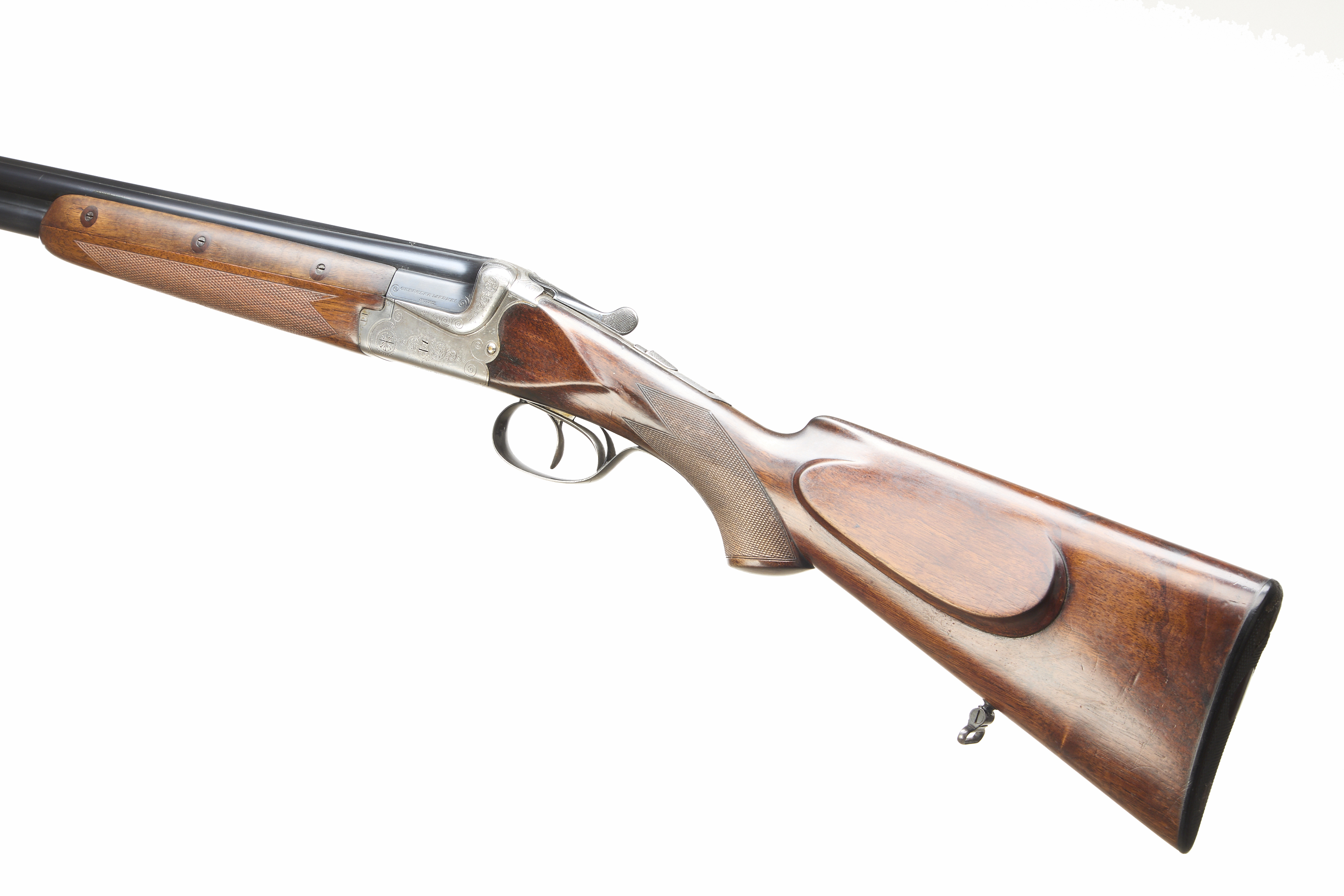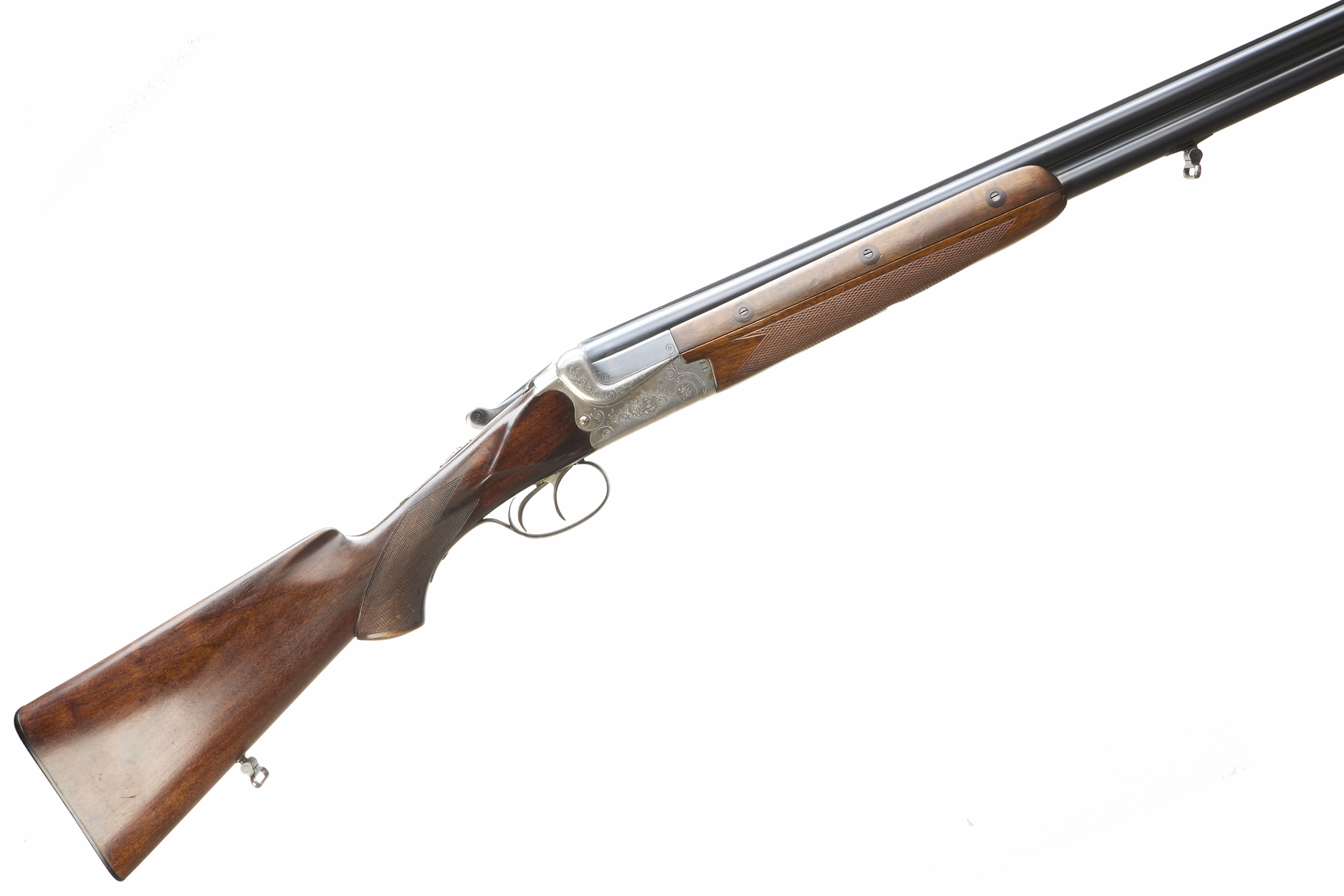 Chequered, hard rubber butt pad, semi-pistol grip and three-piece forend, sling swivel attachments to stock and barrel. Acanthus scrolls to action. Double triggers, cocking indicators, safety, the underside engraved ‘GEBRUDER MERKEL SUHL’. For 1953.