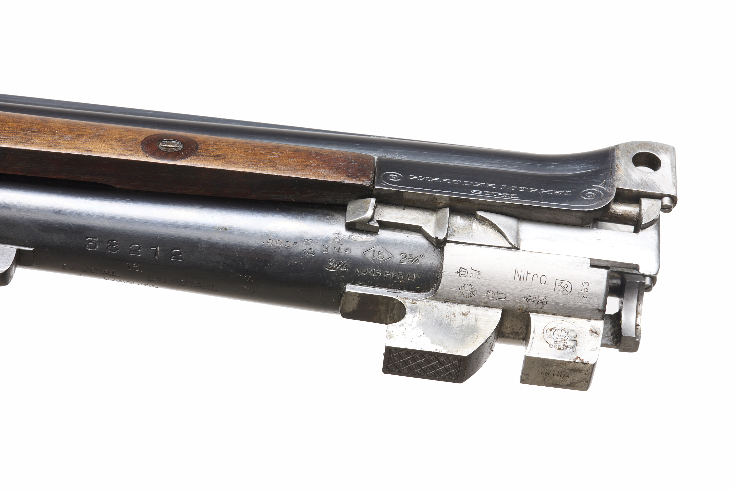 Additional Comments, Very light silvering to muzzle and breech with some fine, light marks to the barrels. The action bright with some localised light tarnishing. The trigger guard tang slightly proud. The stock with one significant mark. The butt plate damaged to top quarter.