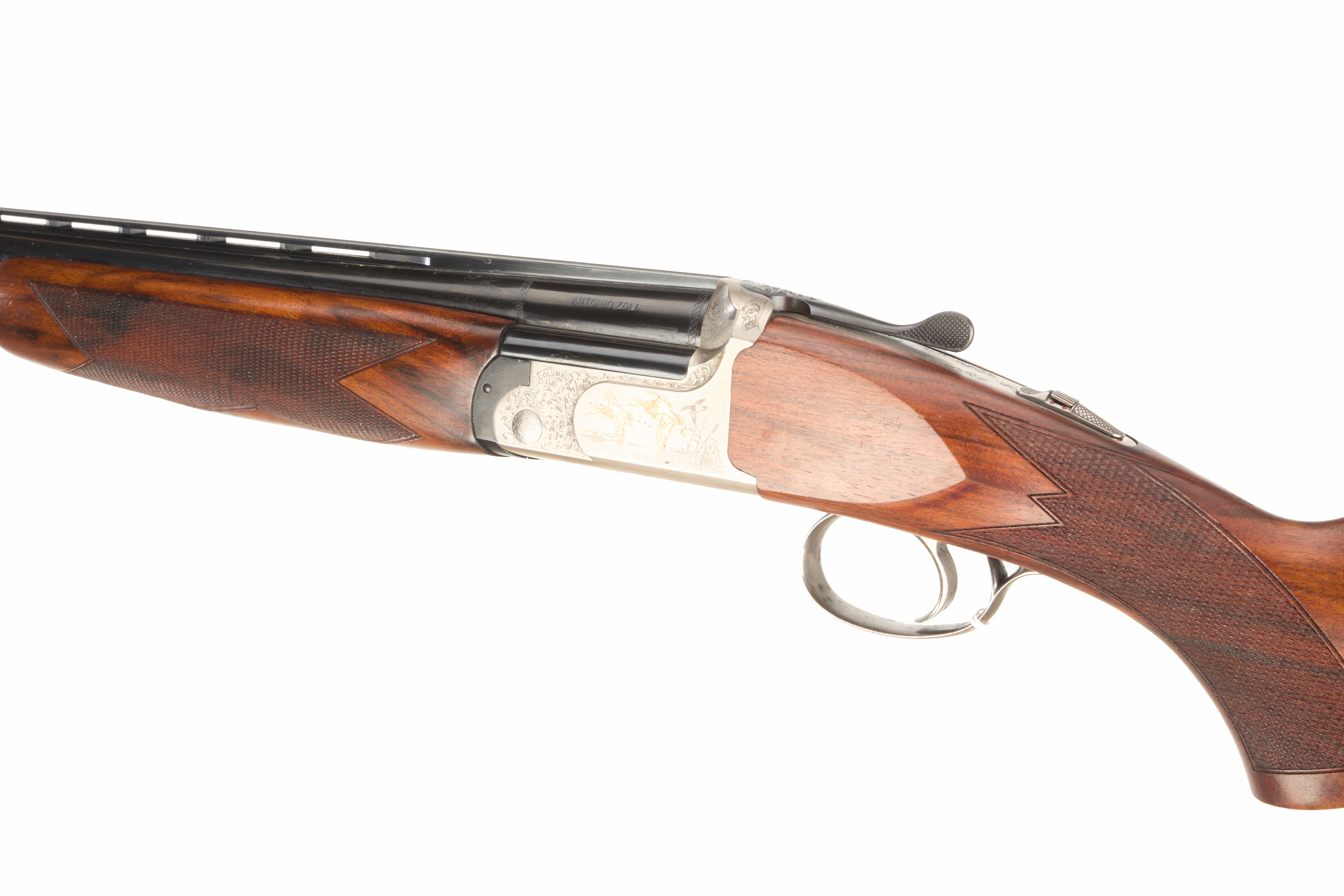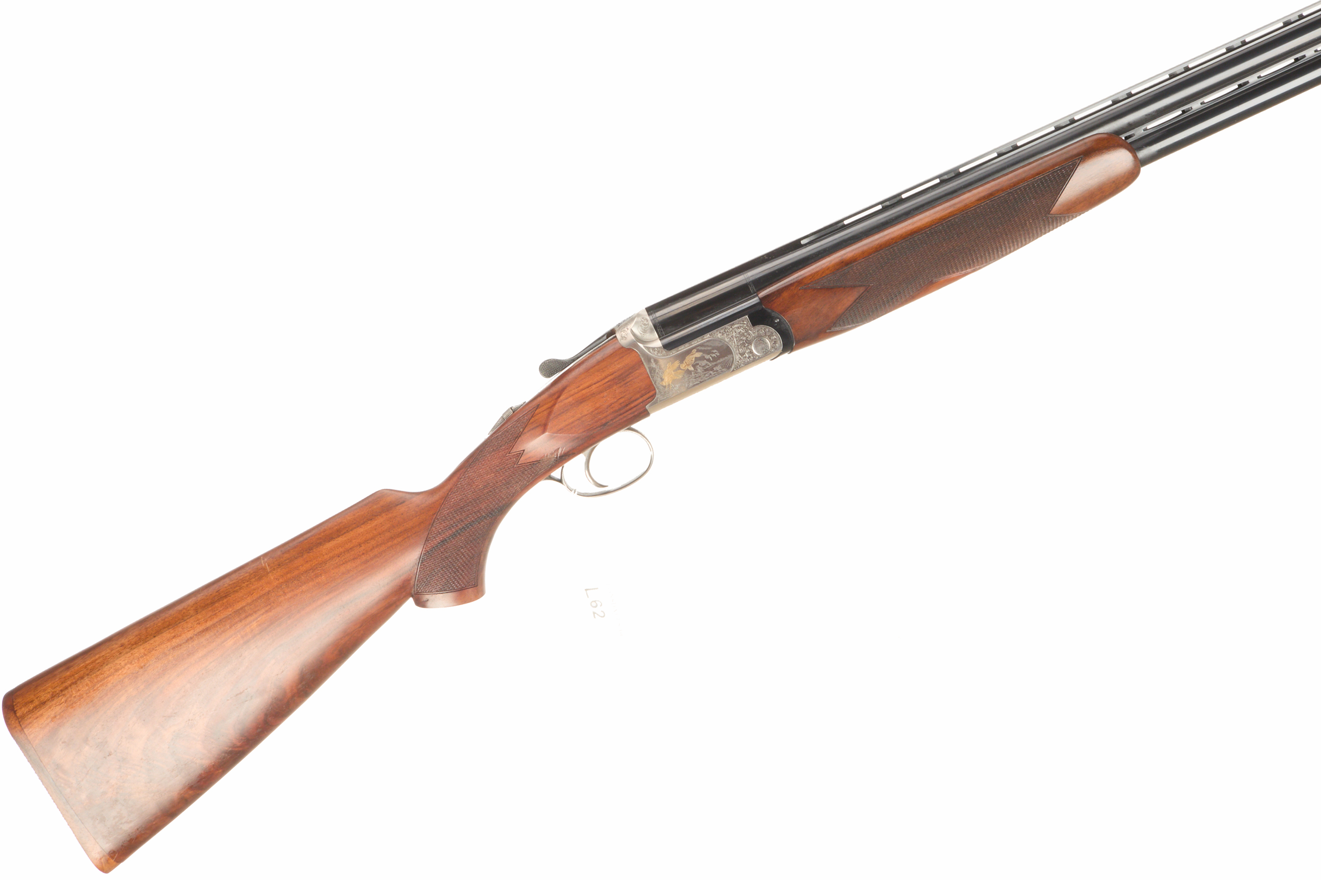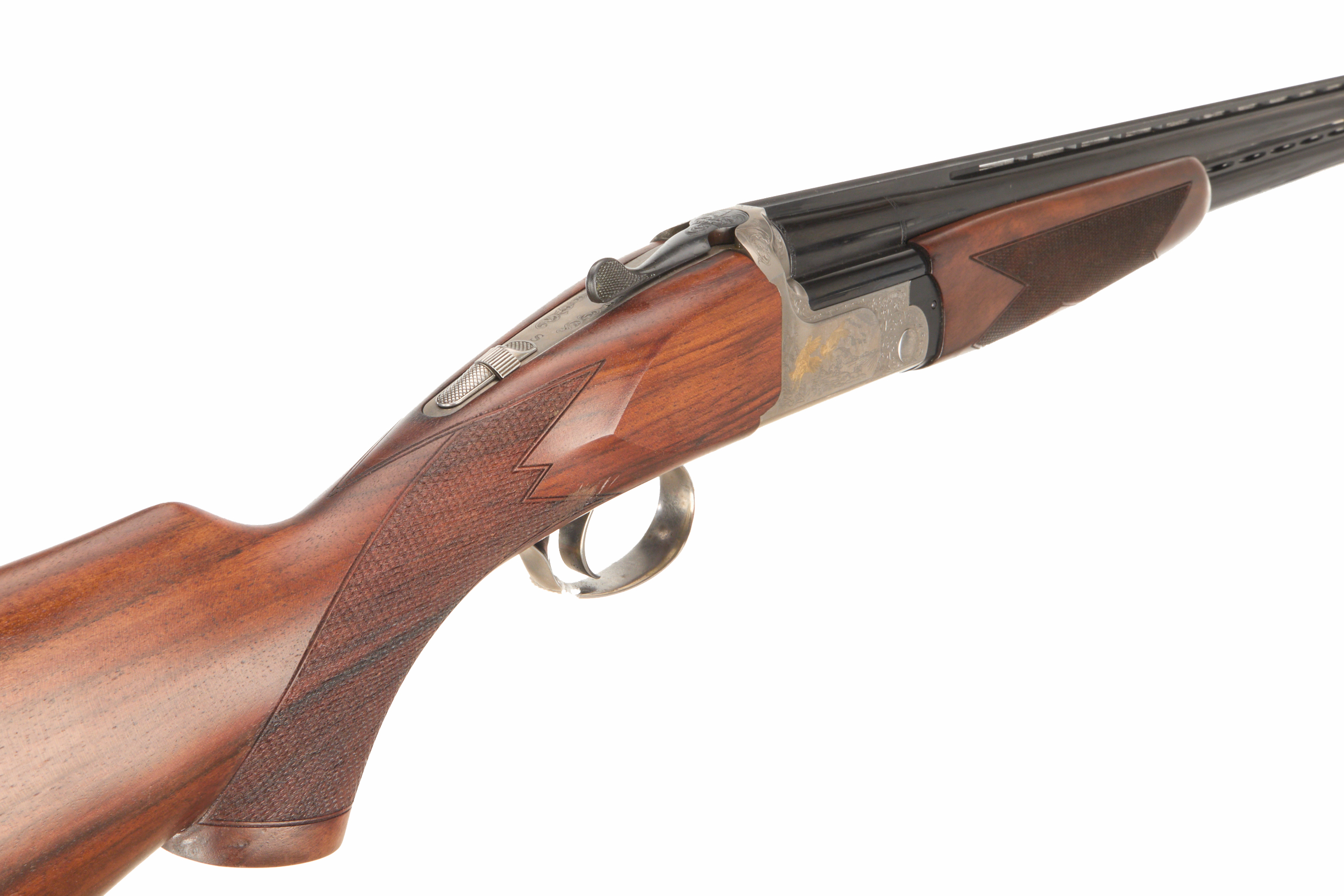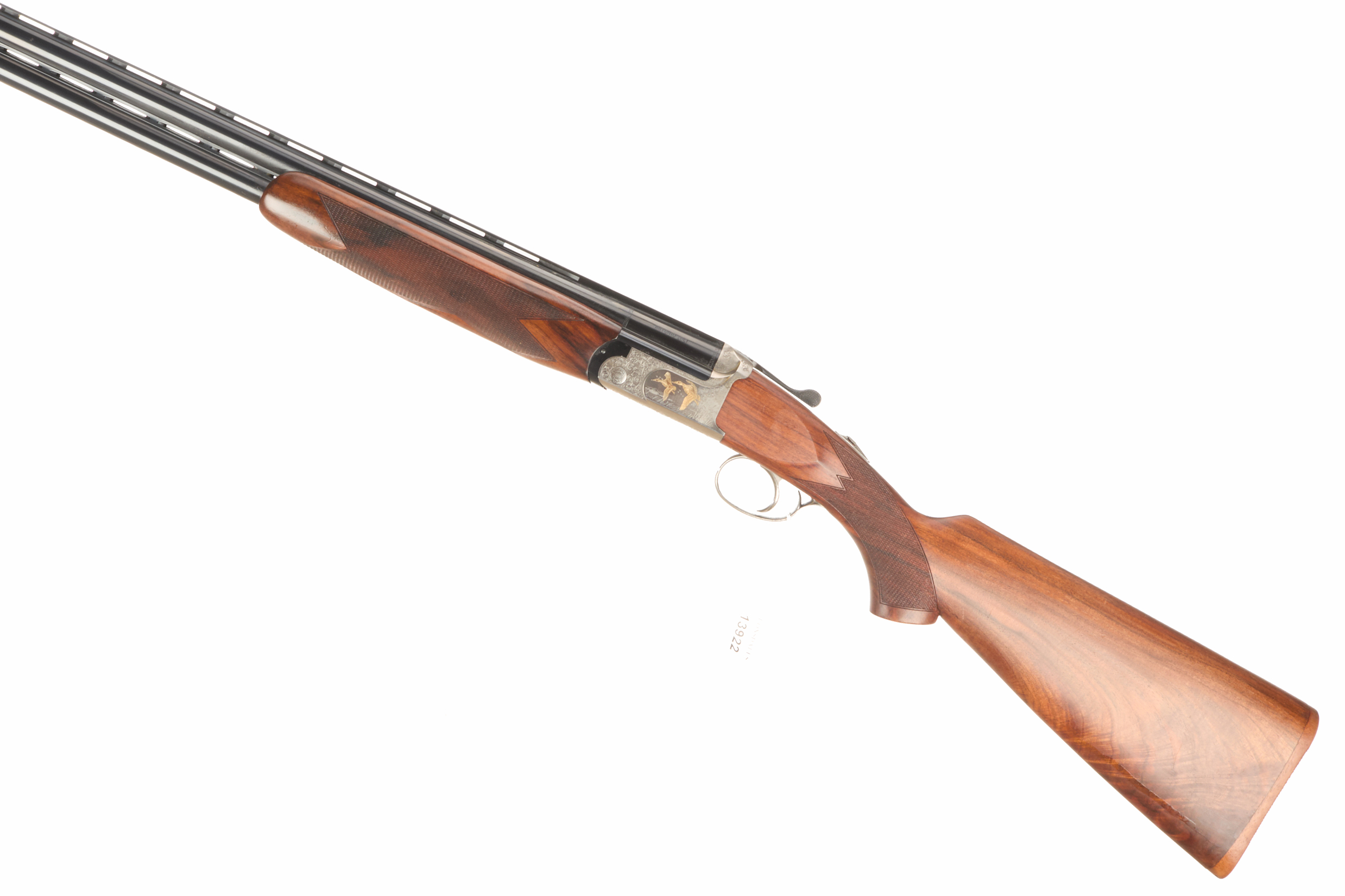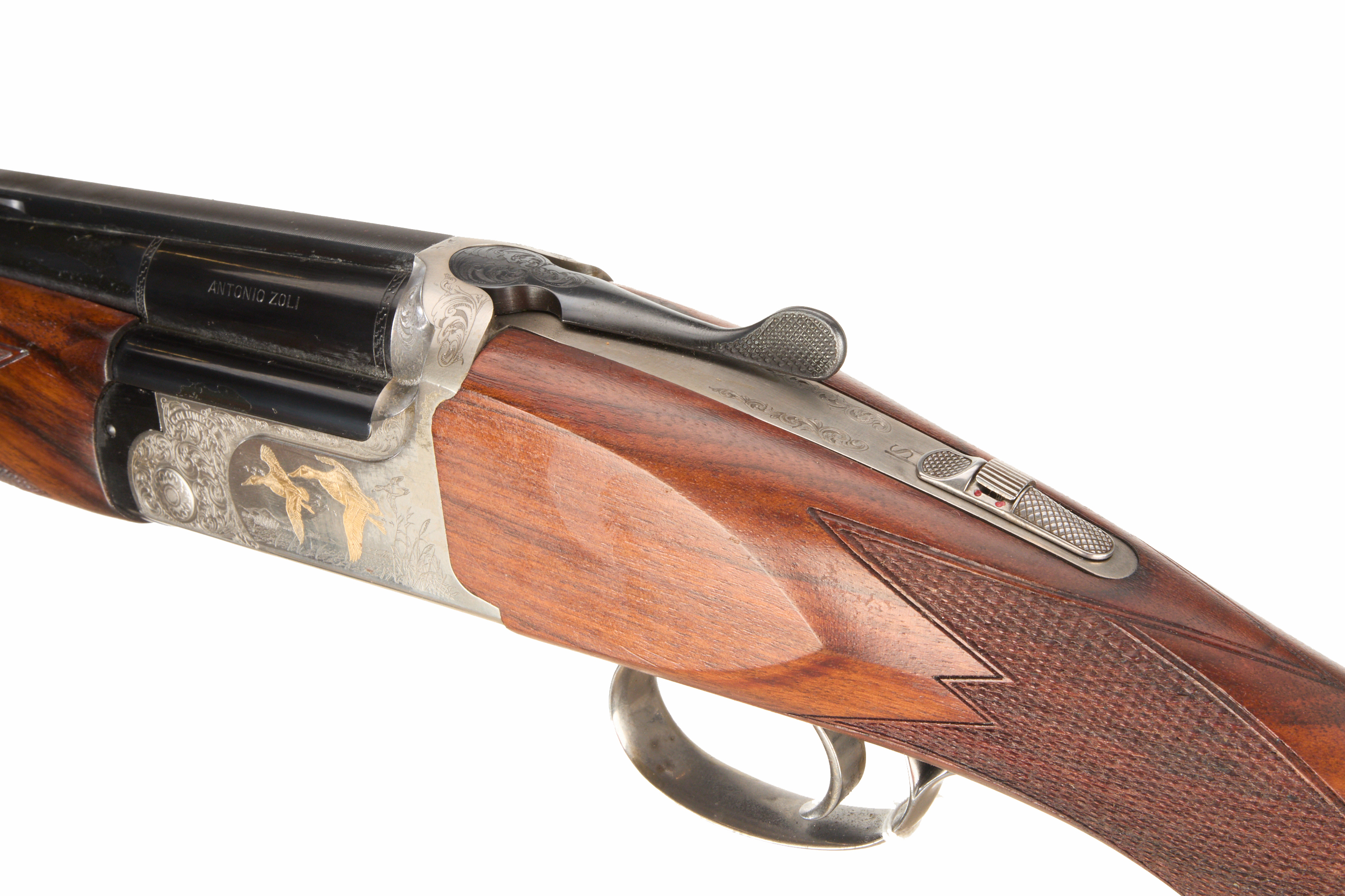 Chequered, wooden butt, full-pistol grip and rounded forend, ventilated top and mid rib. Acanthus scroll with duck scenes inlaid in gold, Satin finish to action. Integrated barrel selector (selective single trigger) and safety. For 2005. Superior steel Italian proof.
