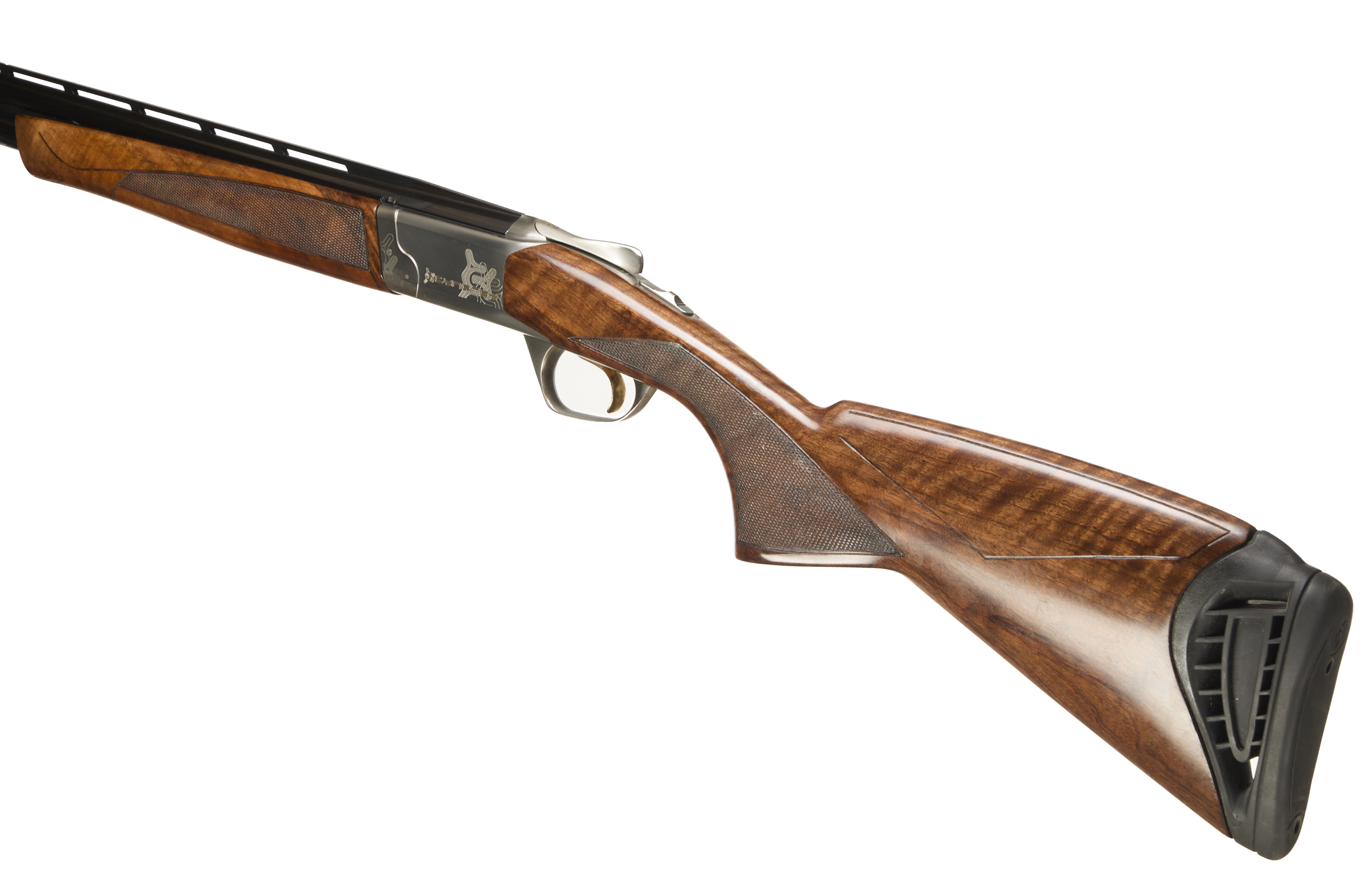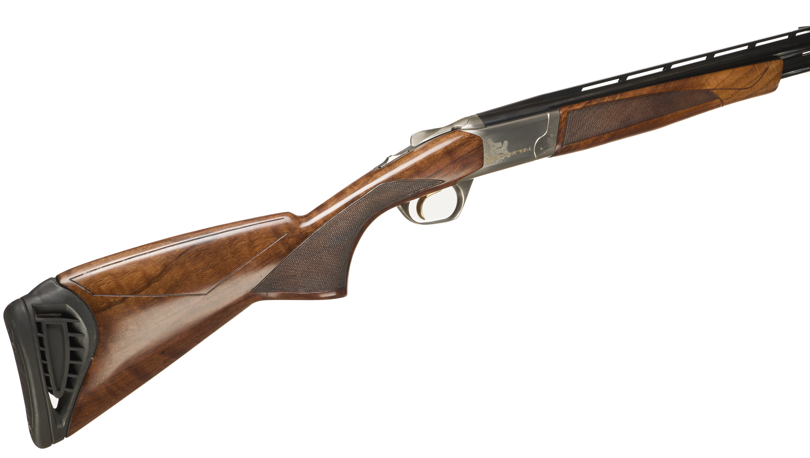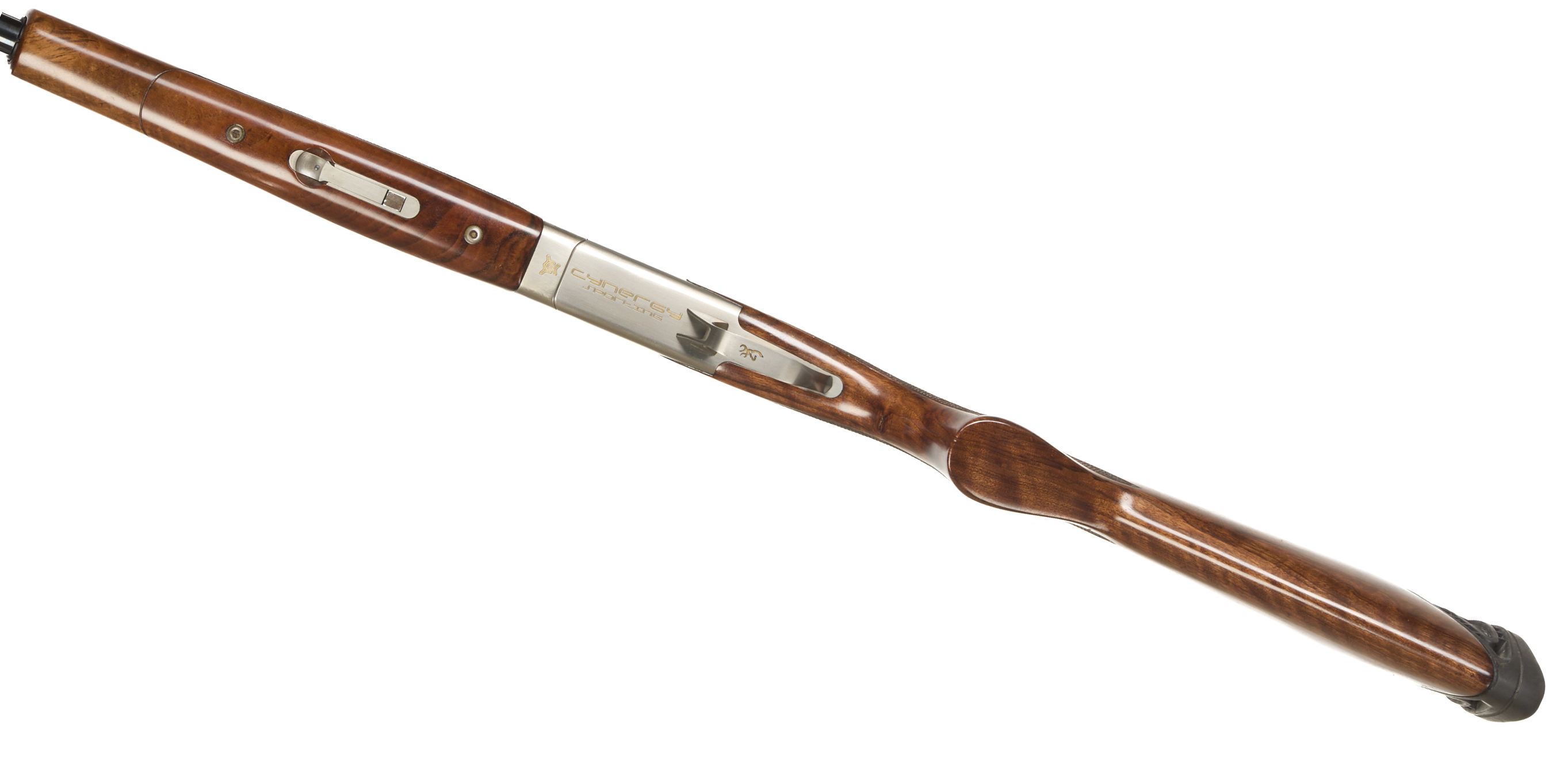 Cushioned butt pad, chequered semi-pistol grip and forend, ventilated top and mid rib. Cynergy engraved to action. Gold wash trigger, integrated barrel selector (selective single trigger) and safety.
