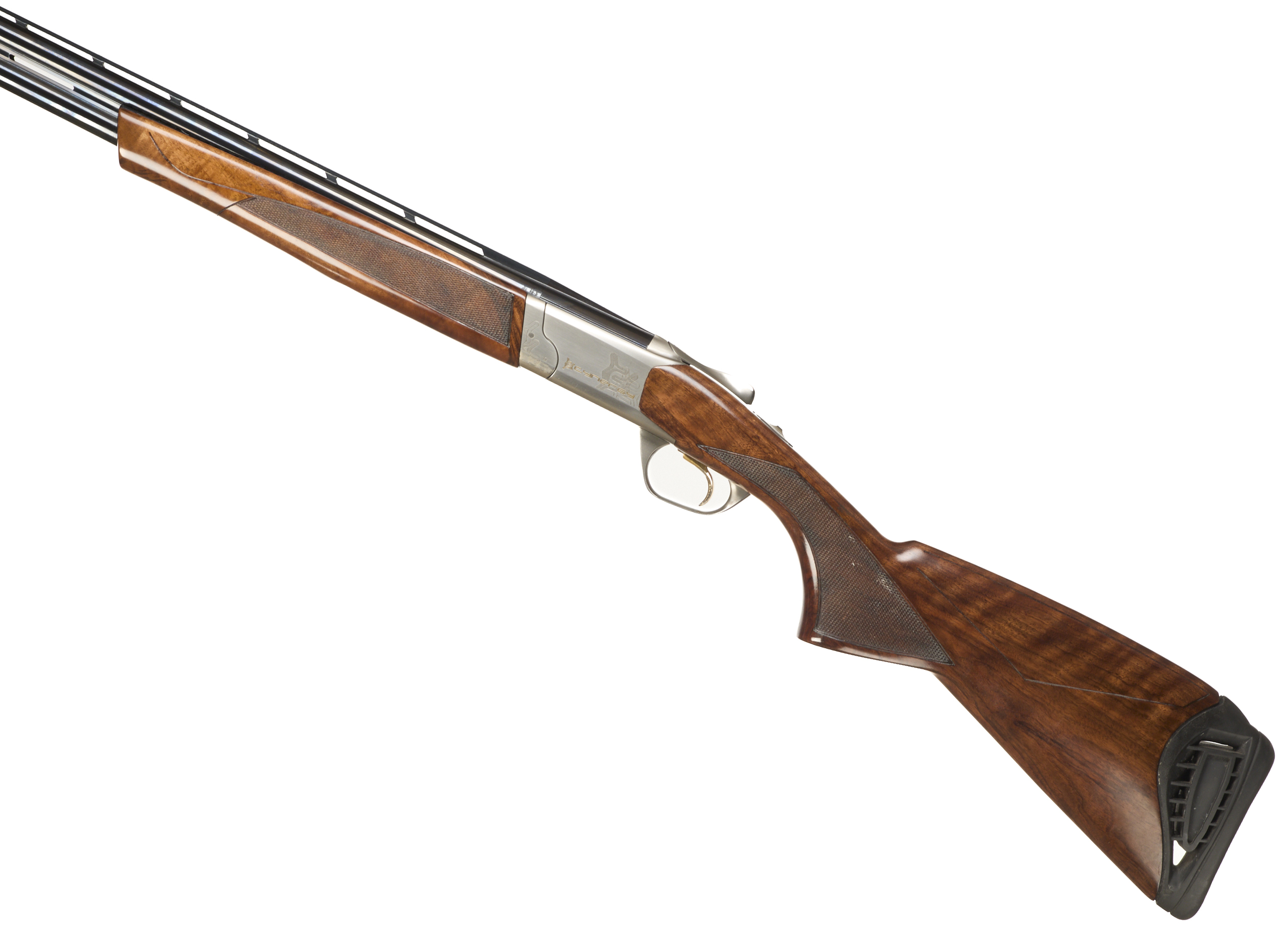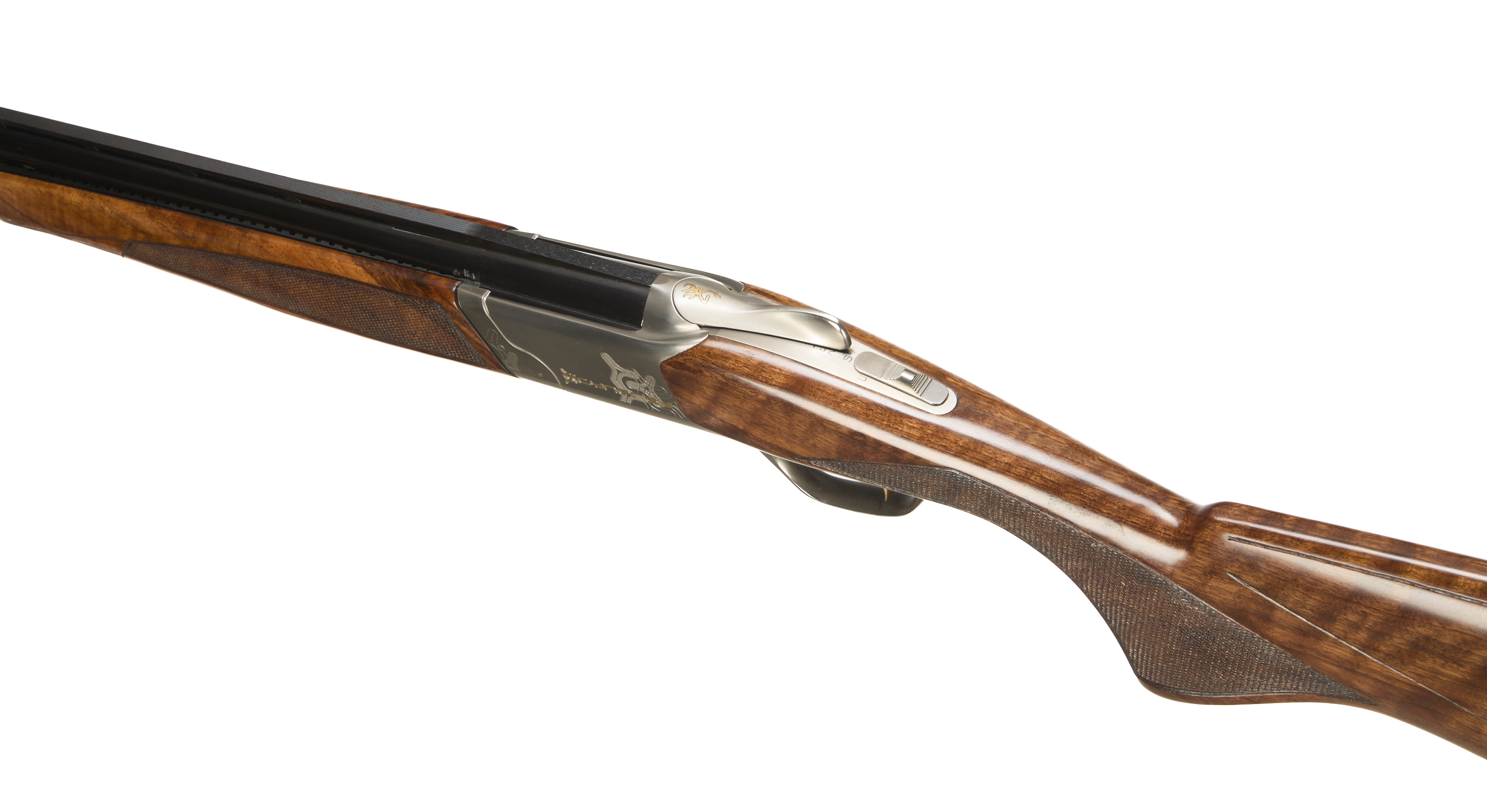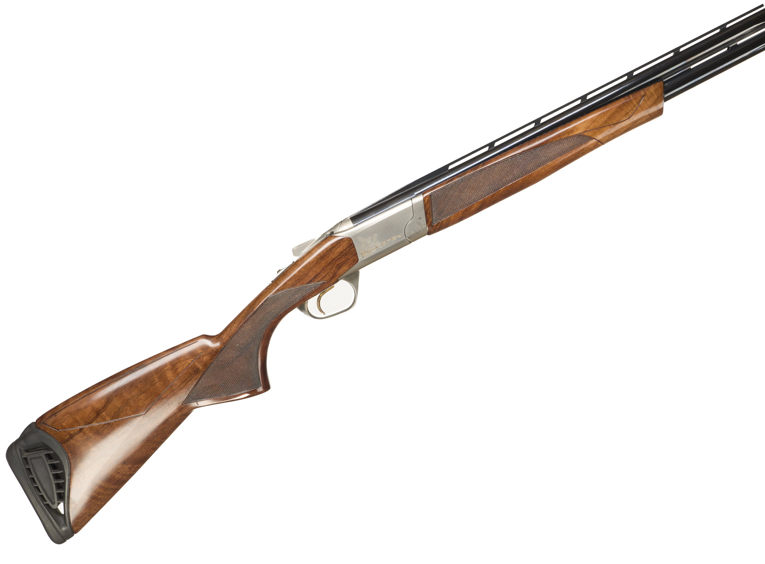 Cushioned butt pad, chequered semi-pistol grip and forend, ventilated top and mid rib. Cynergy engraved to action. Gold wash trigger, integrated barrel selector (selective single trigger) and safety.