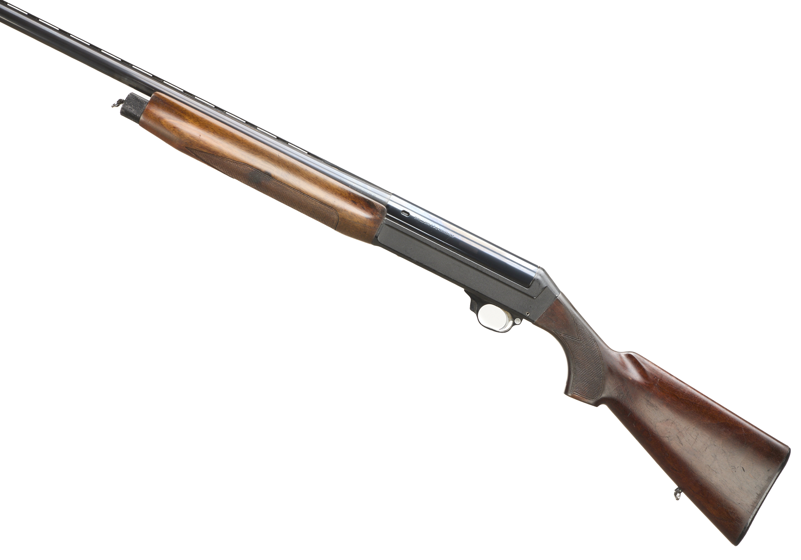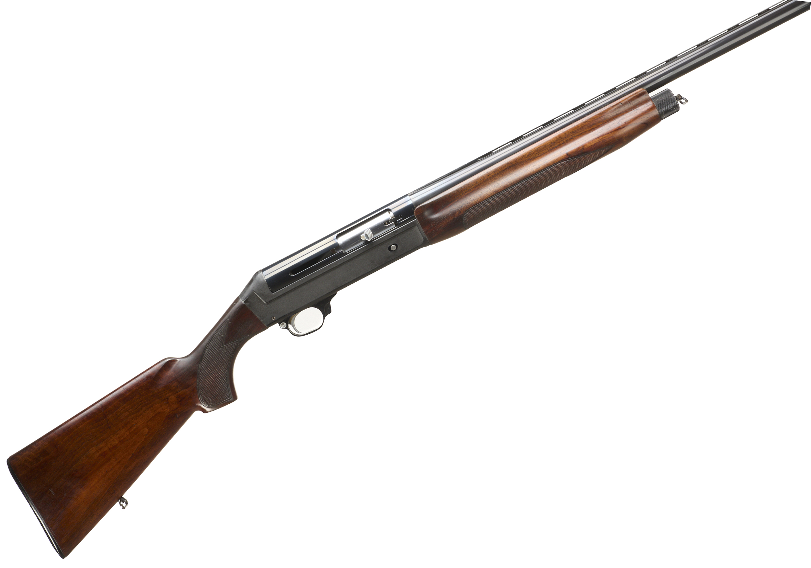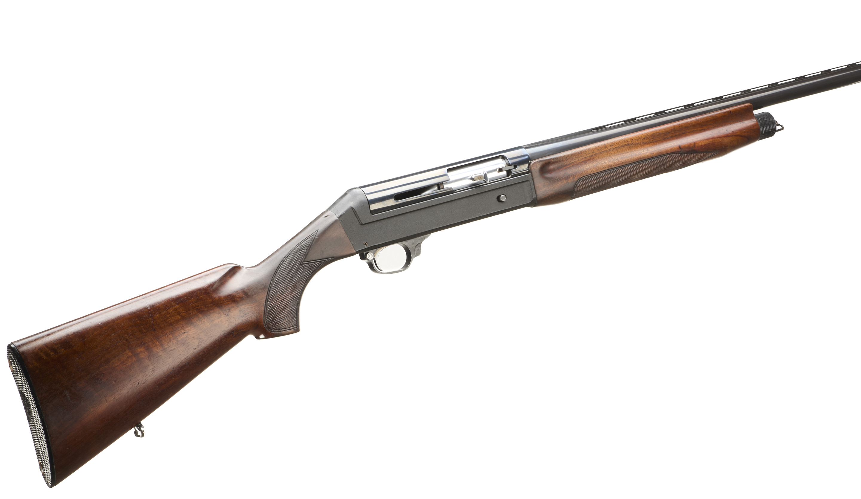 Ebonite butt pad, chequered pistol grip stock and forend. Ventilated top rib, plain, action.