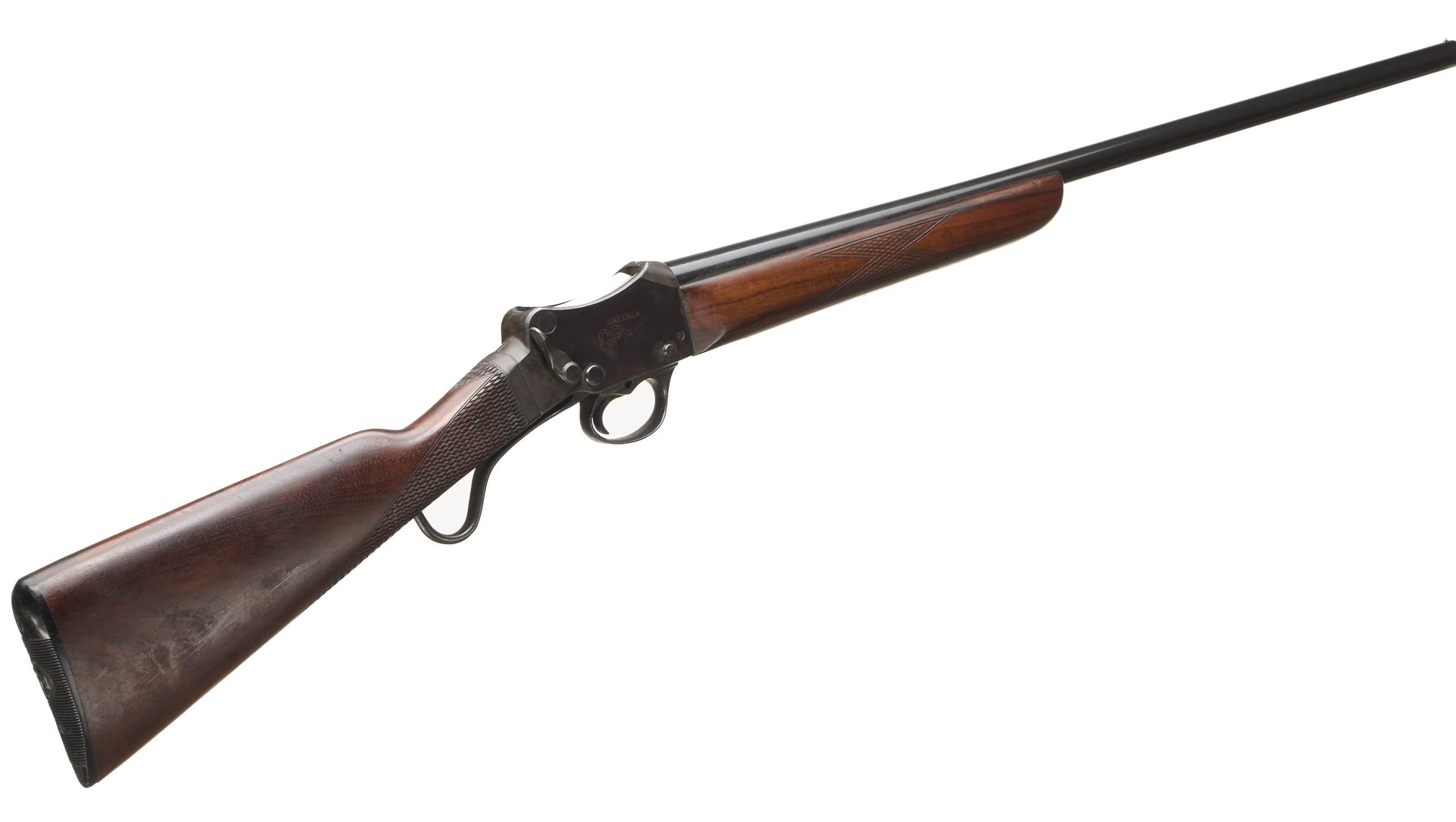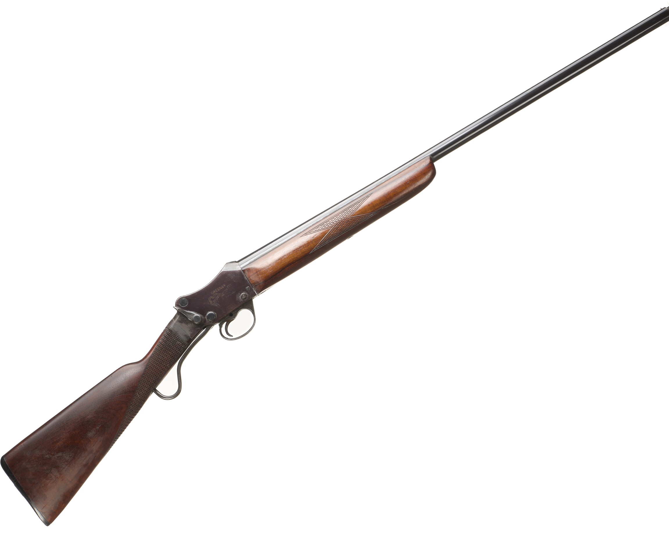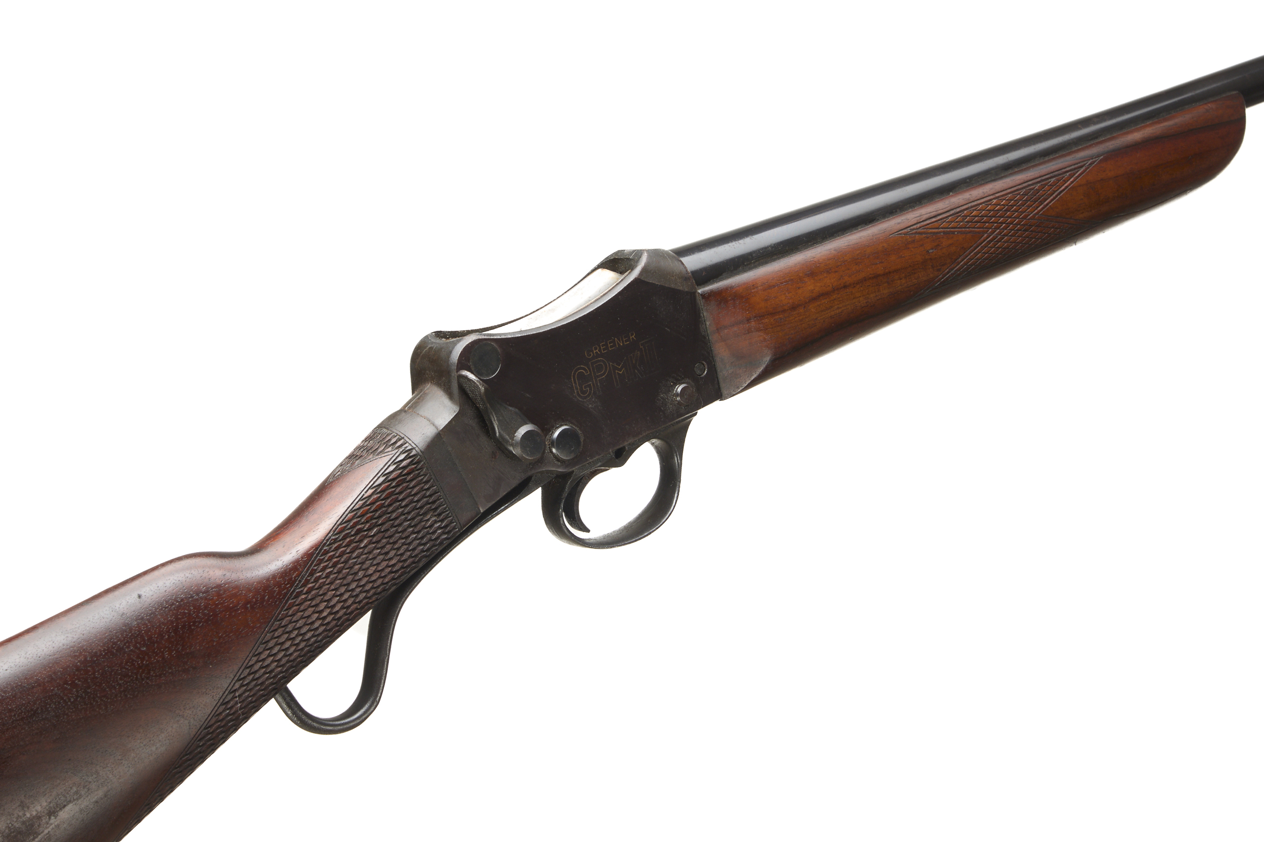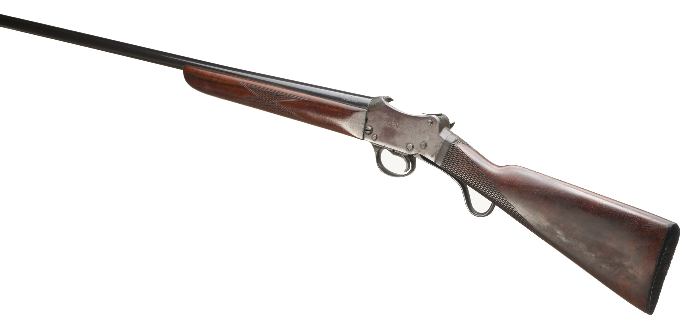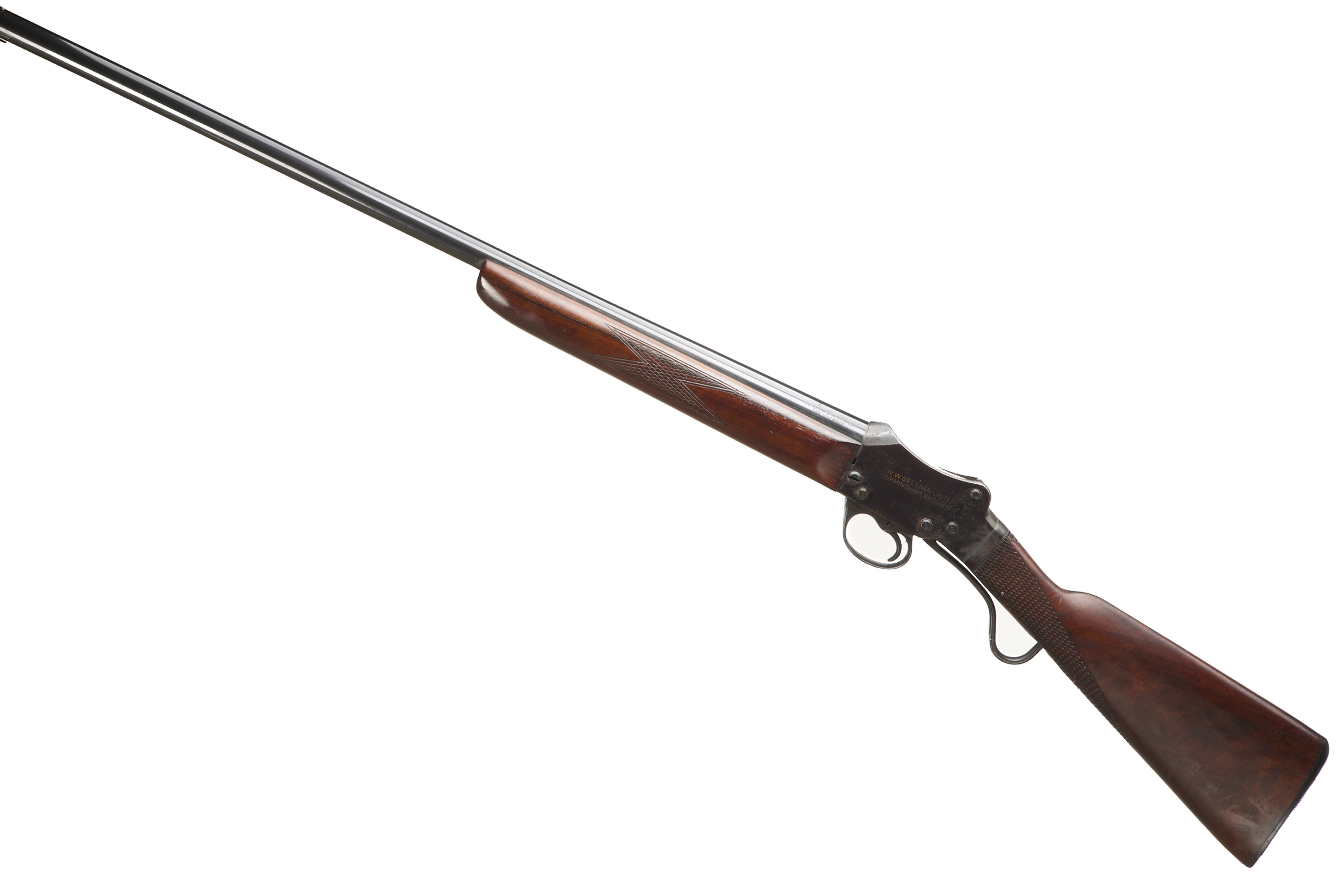 Ebonite butt pad, chequered straight grip stock and forend. Plain action with ‘W. W GREENER LIMITED’ engraving. Bead foresight.