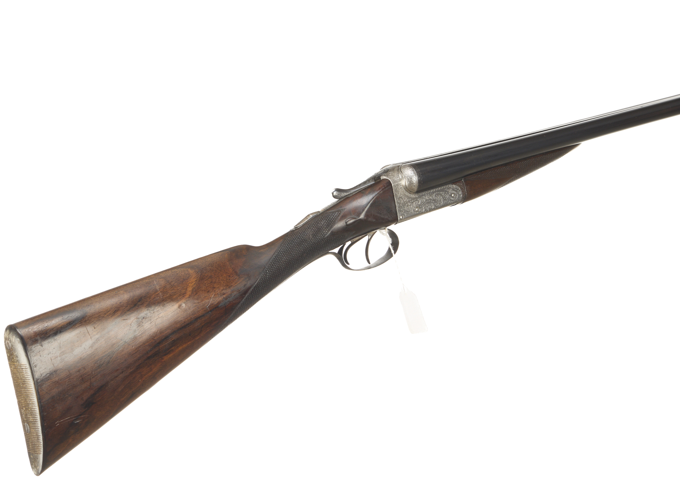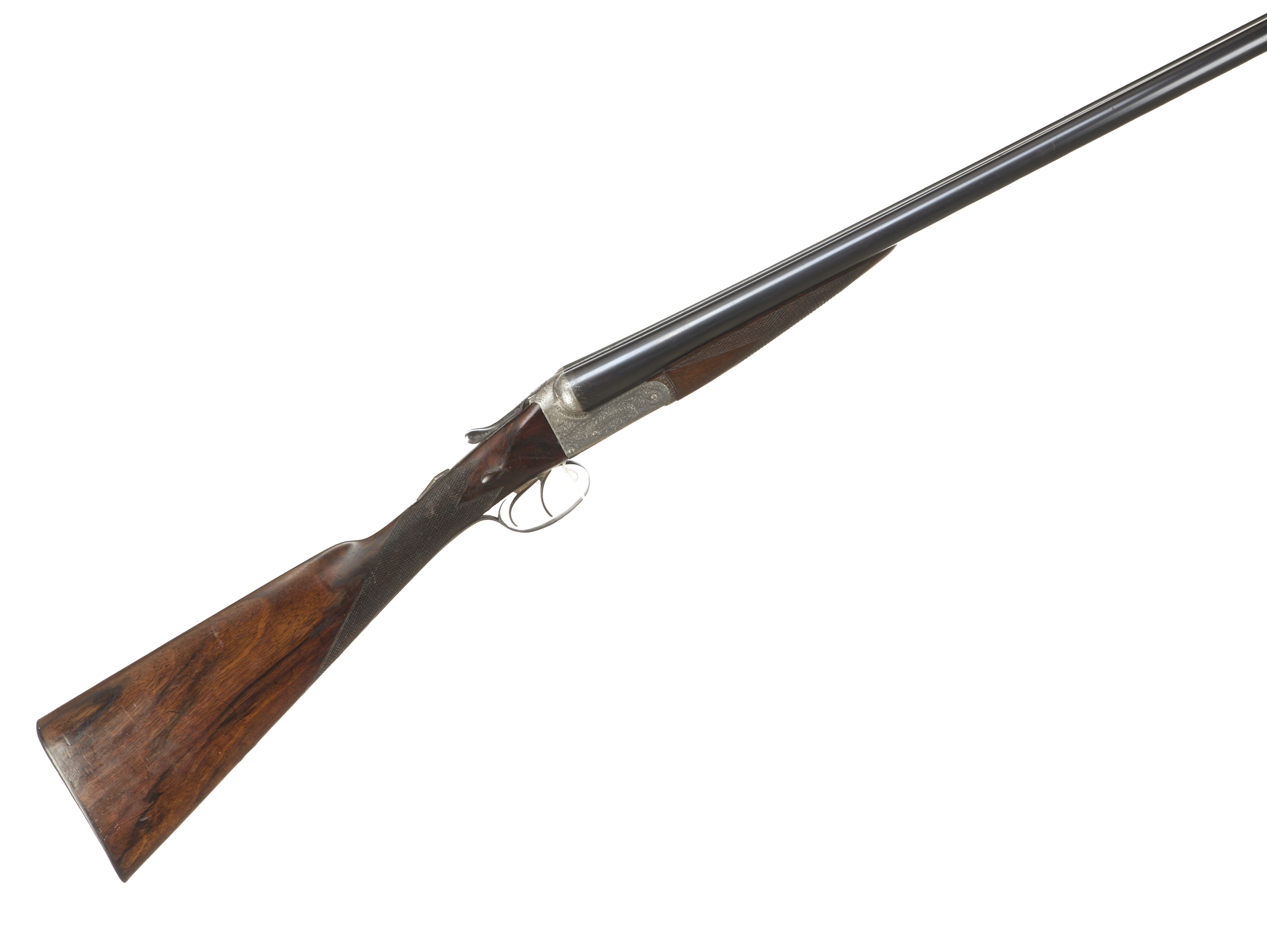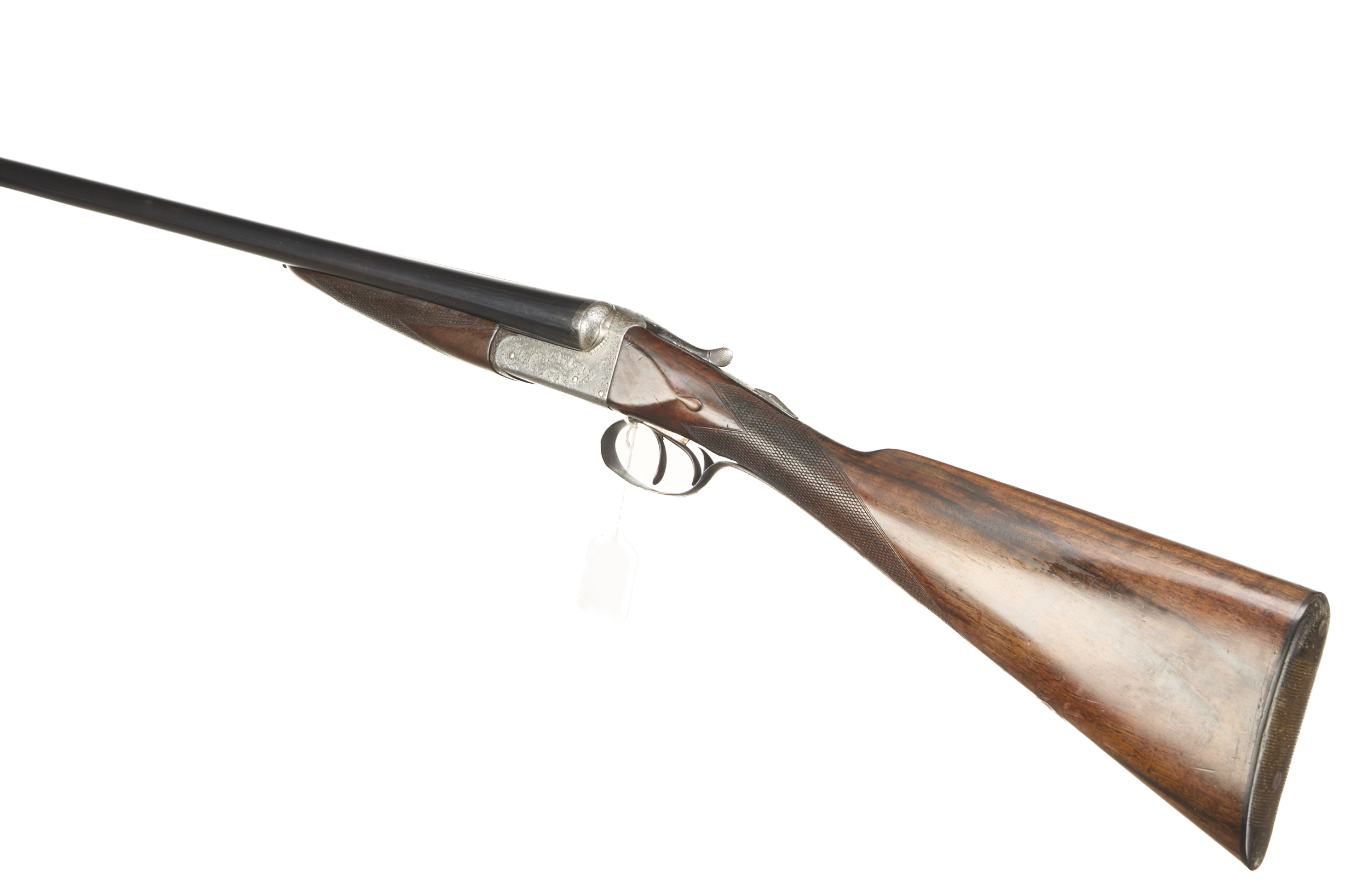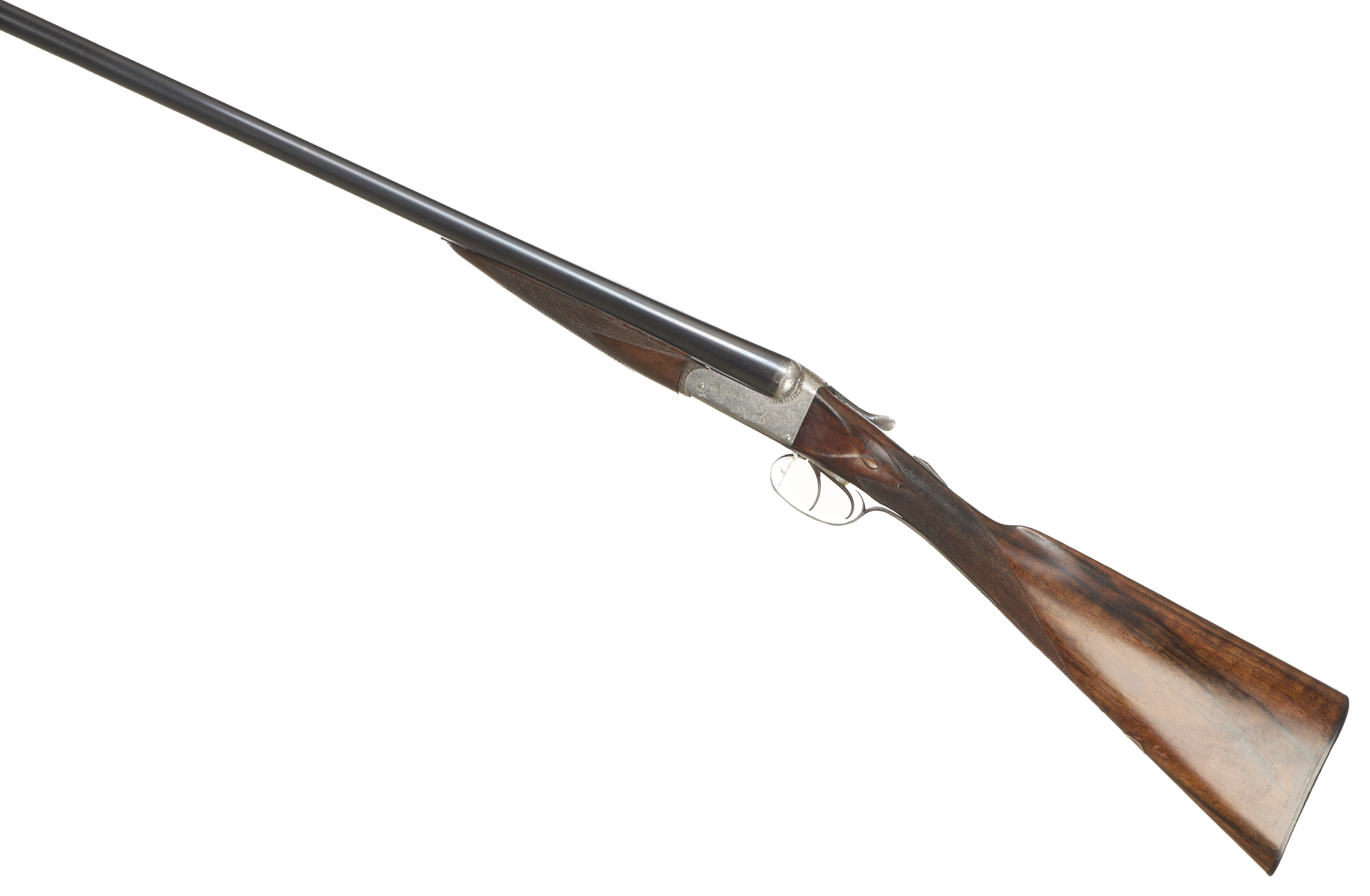 Ribbed, horn butt, chequered straight grip and forend. Tapered rib engraved ‘CHARLES INGRAM. 18B RENFIELD ST. GLASGOW.’. Top lever, automatic safety with ‘SAFE’ inlaid in gold. The action finely engraved with bouquets, extensive acanthus scrolling and ‘CHAS INGRAM’ on scrolled cartouches to the sides. For 1904 – 1925, sleeved 1980.
