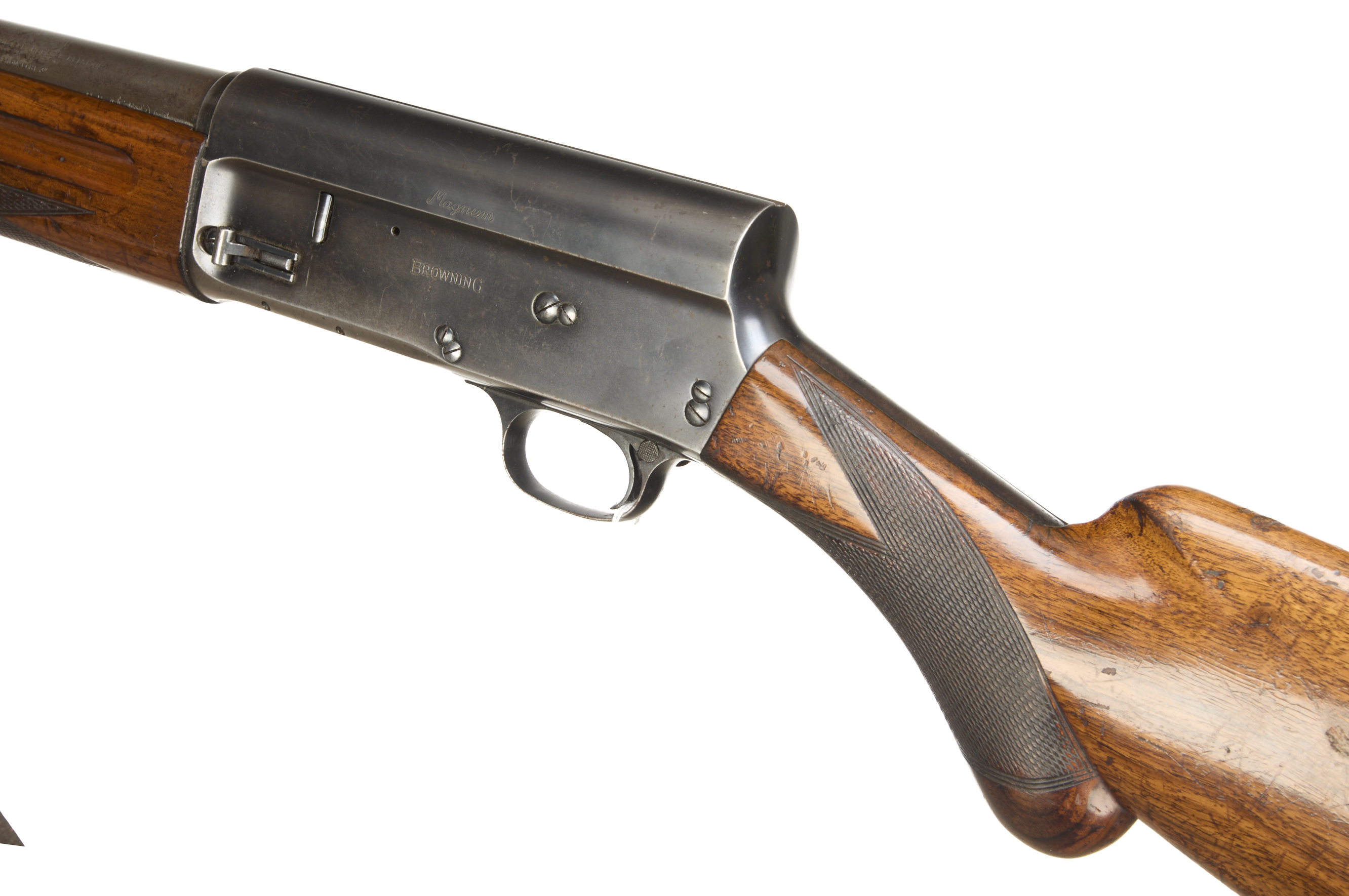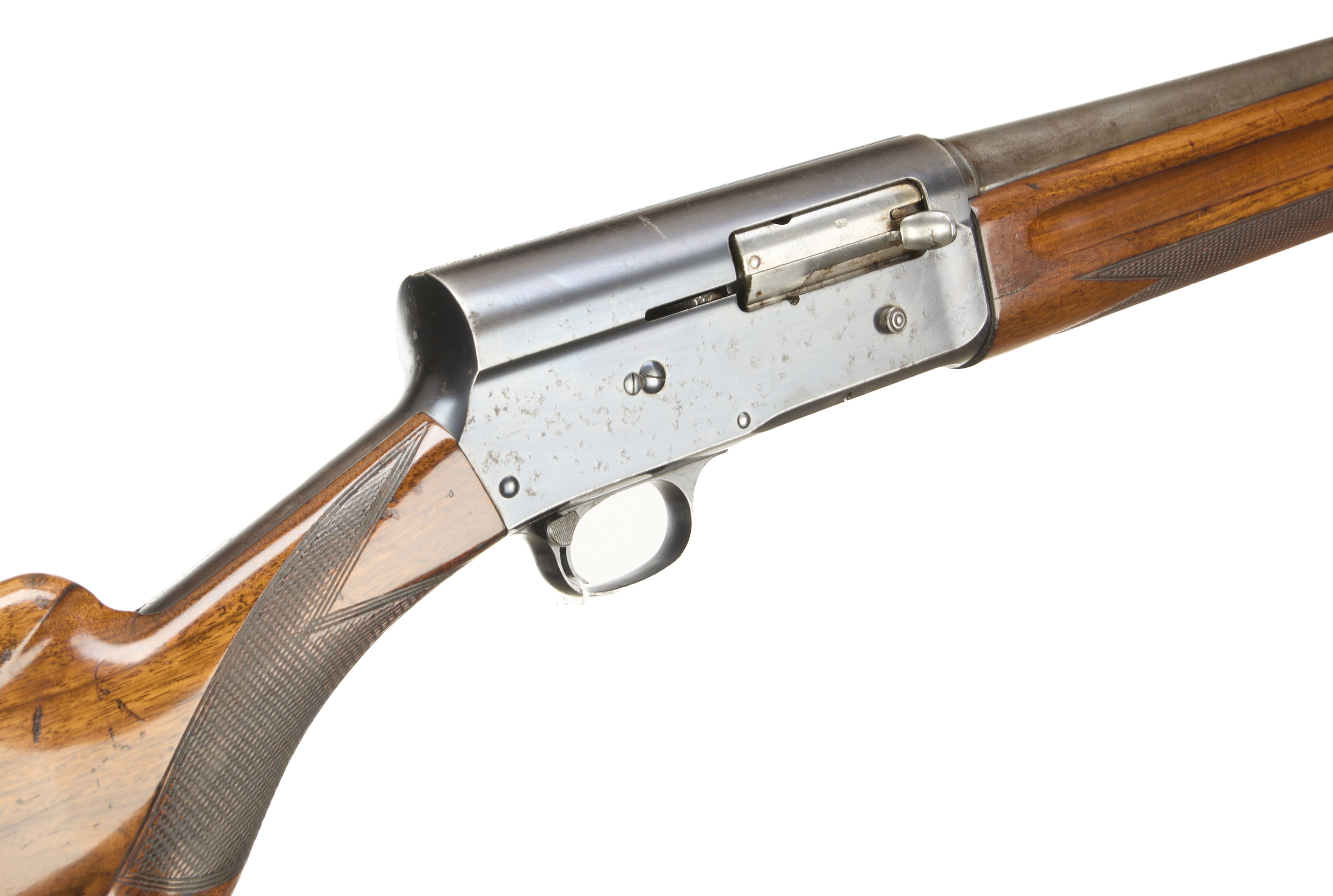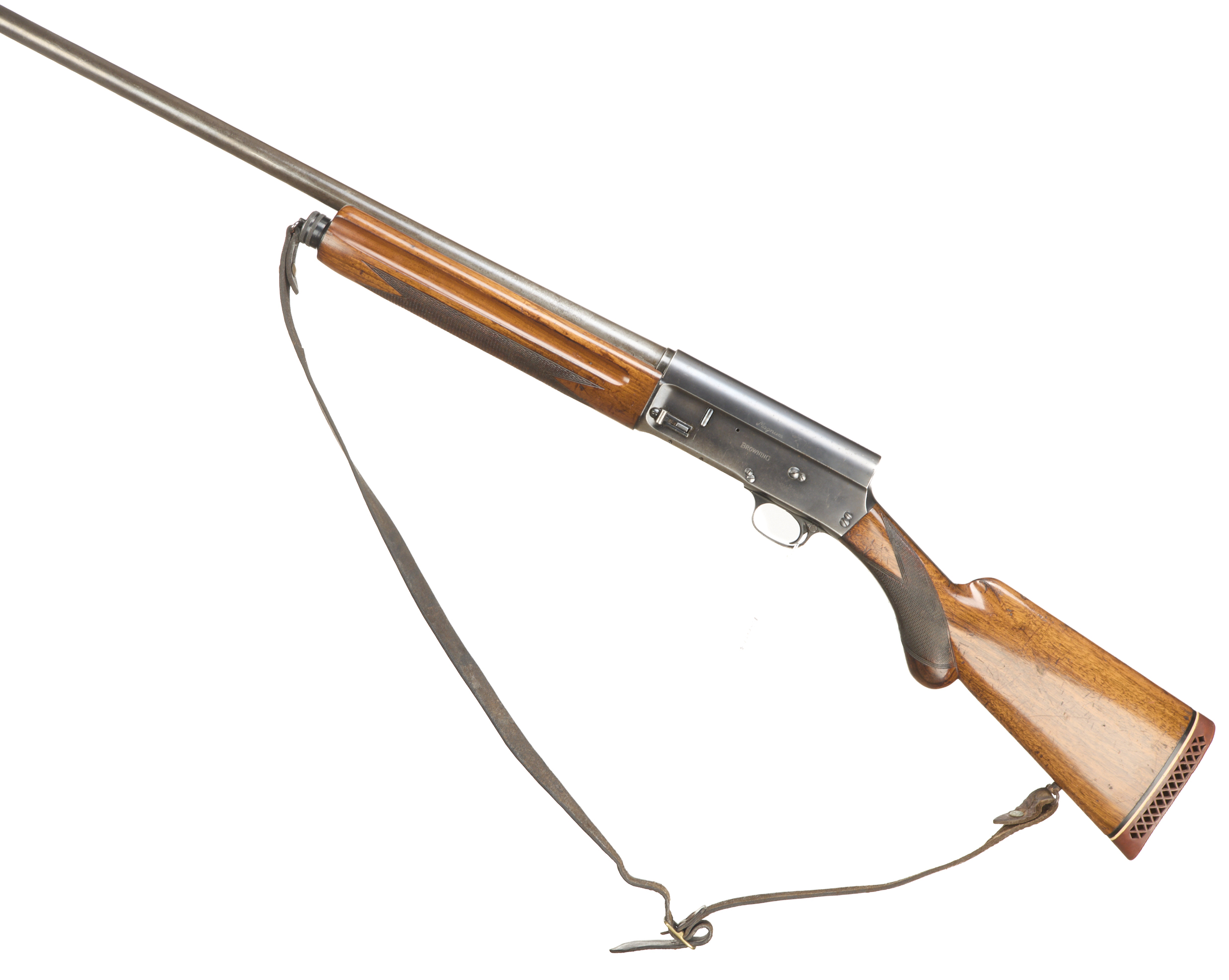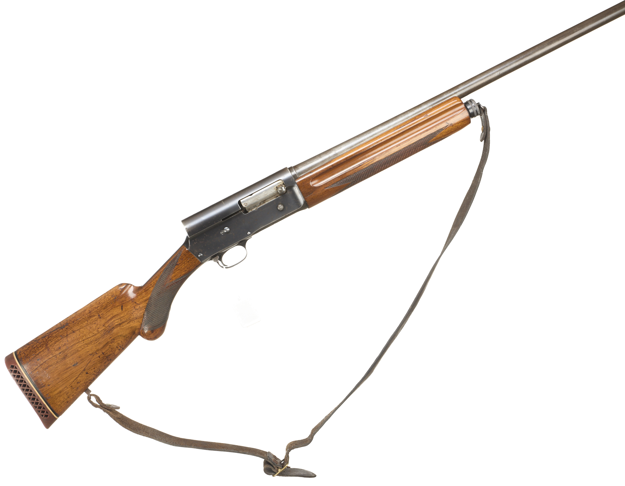 Ventilated butt pad, chequered rounded pistol grip stock and forend. Unadorned action. Leather strap.