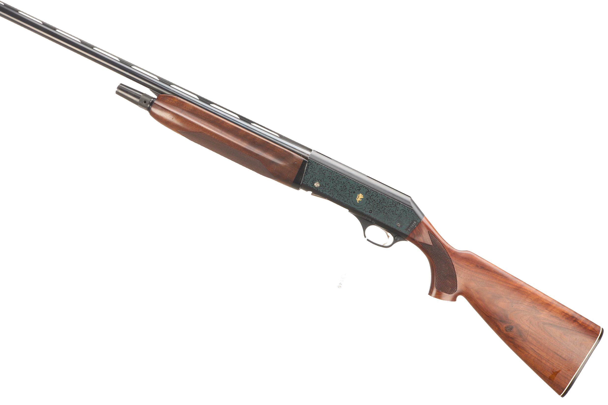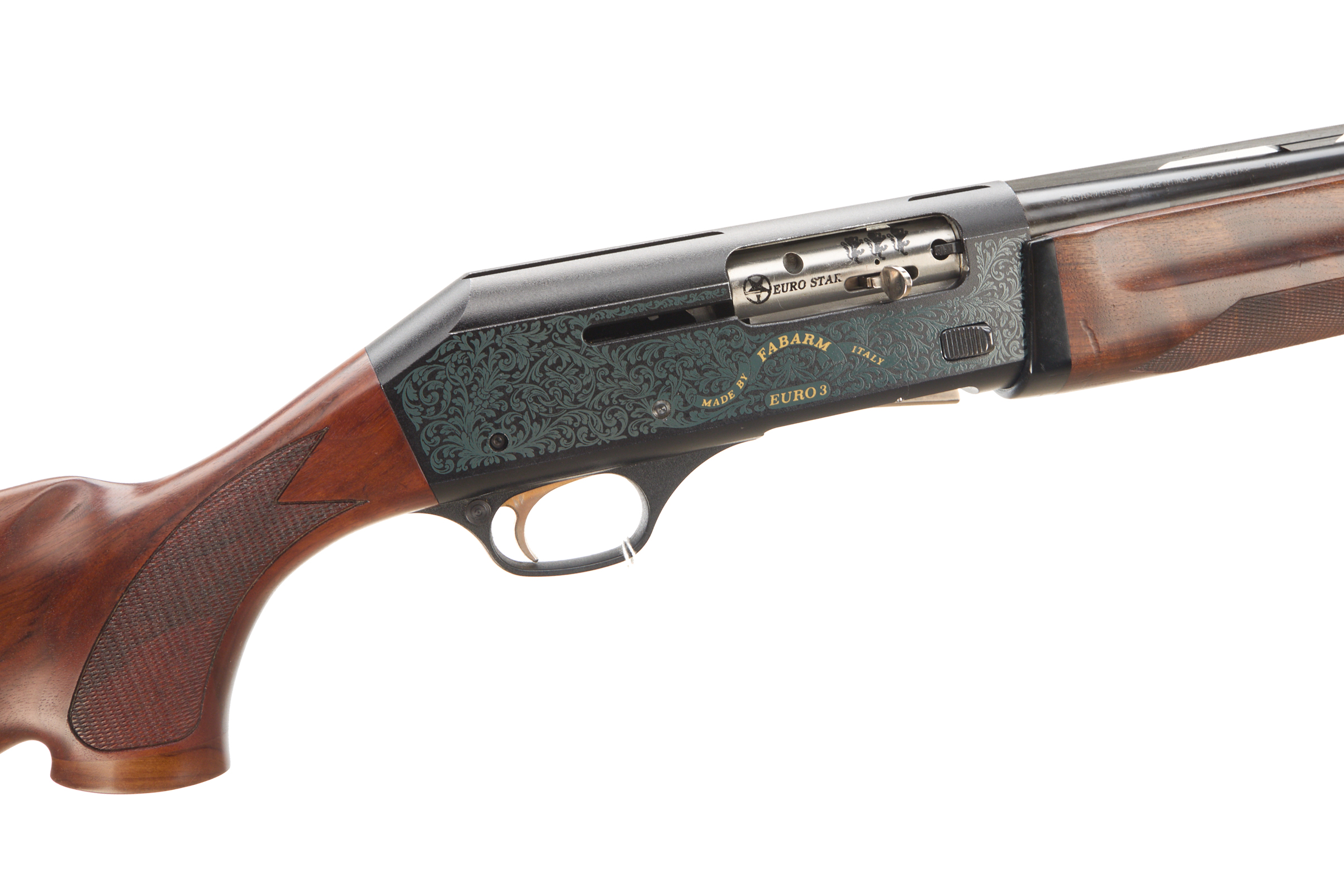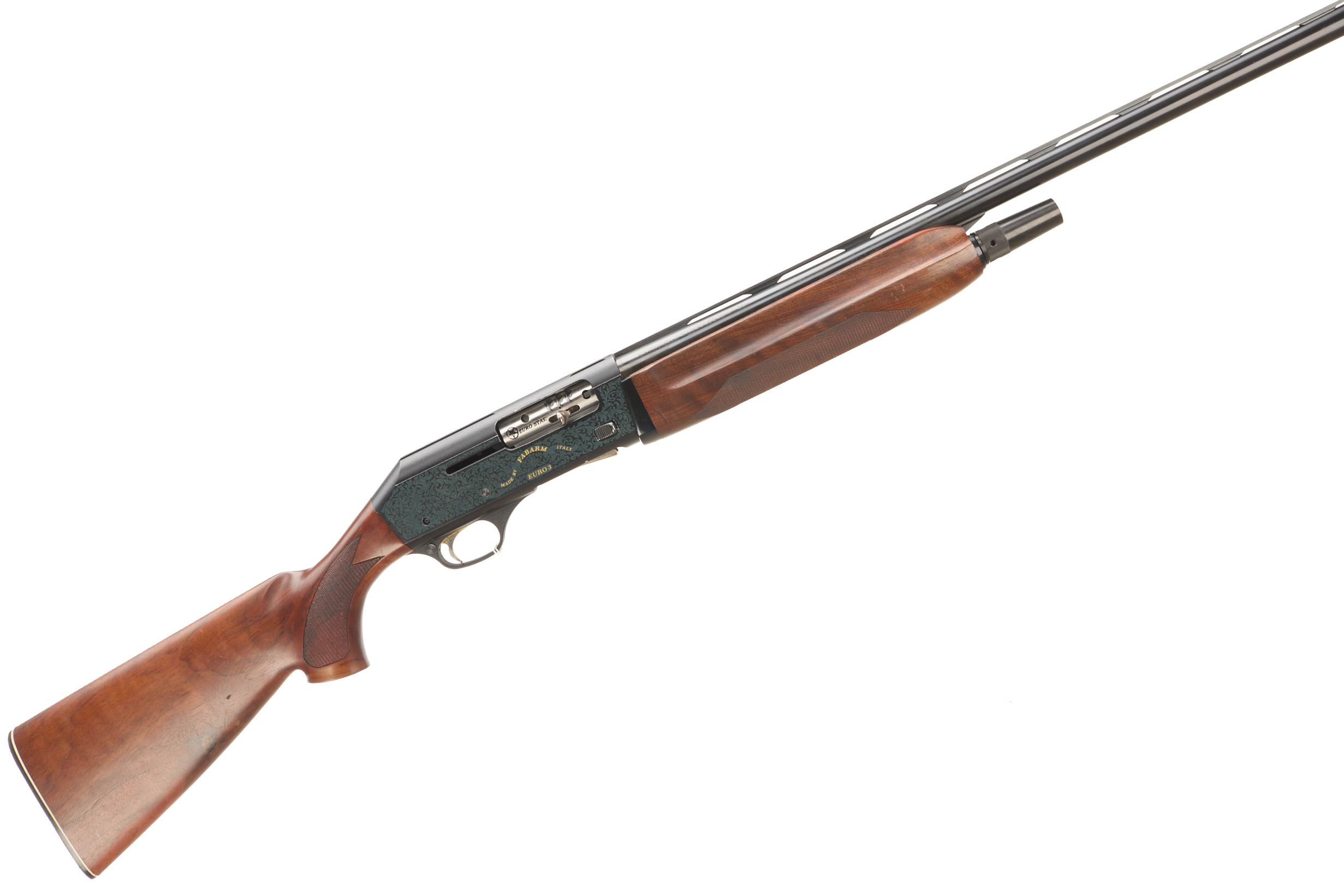 Ebonite butt pad, chequered pistol grip stock and forend. Ventilated machine-finished top rib, acanthus scrolls ‘ MADE BY FABARM ITALY EURO 3’ to action.