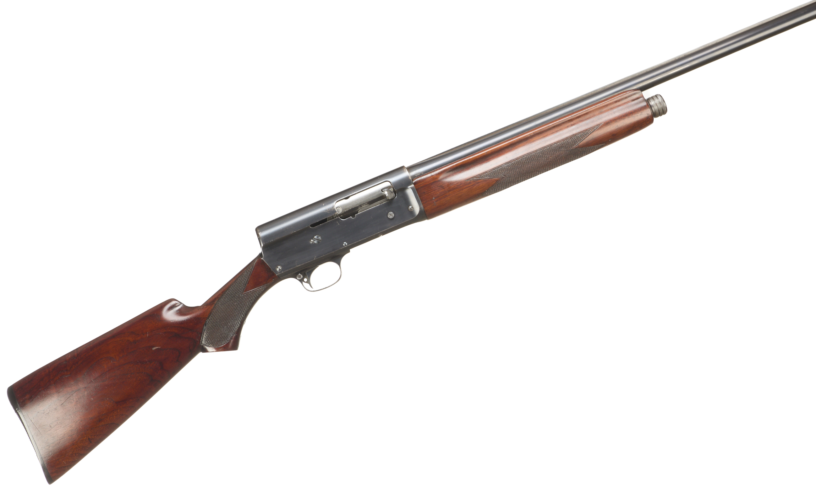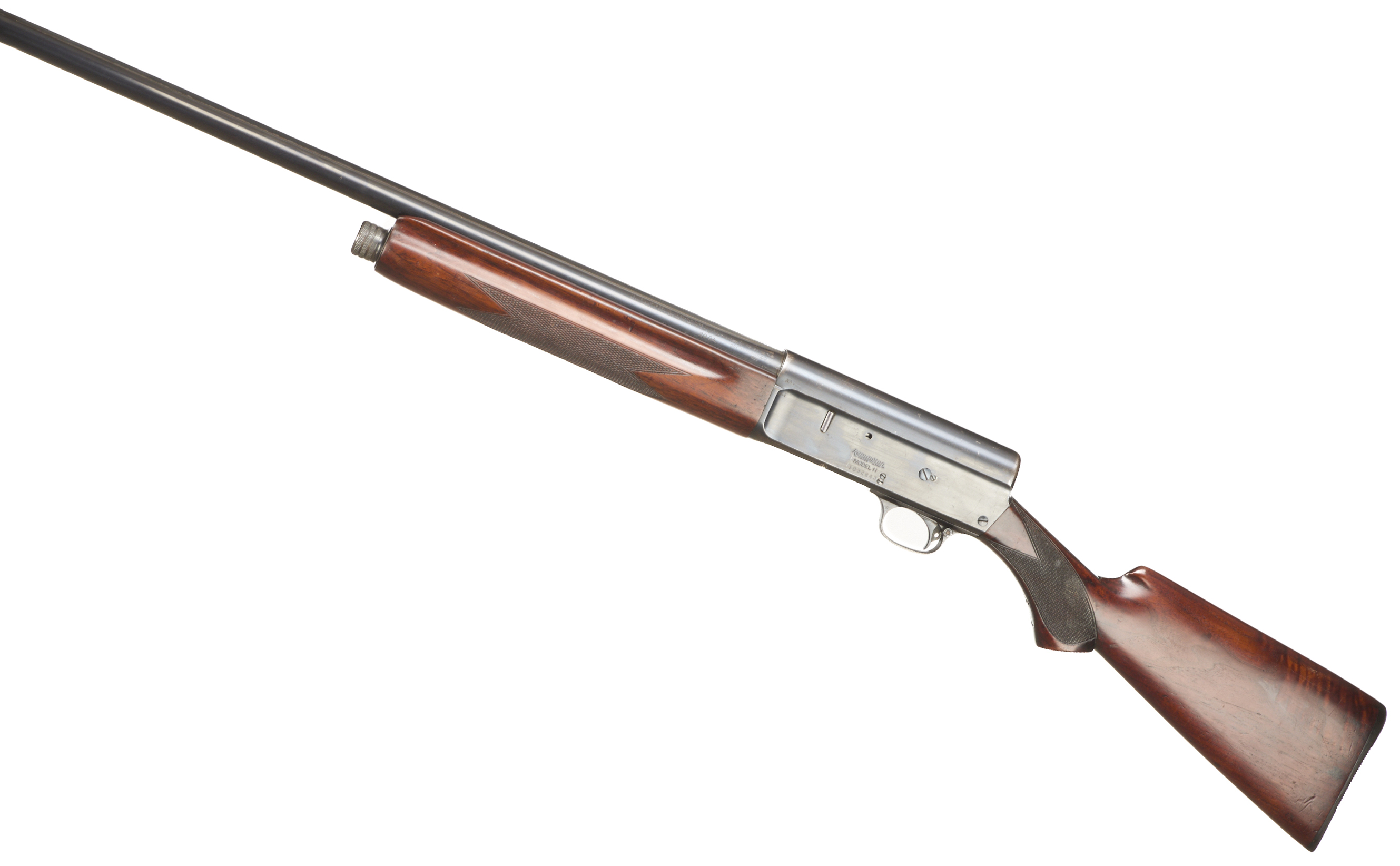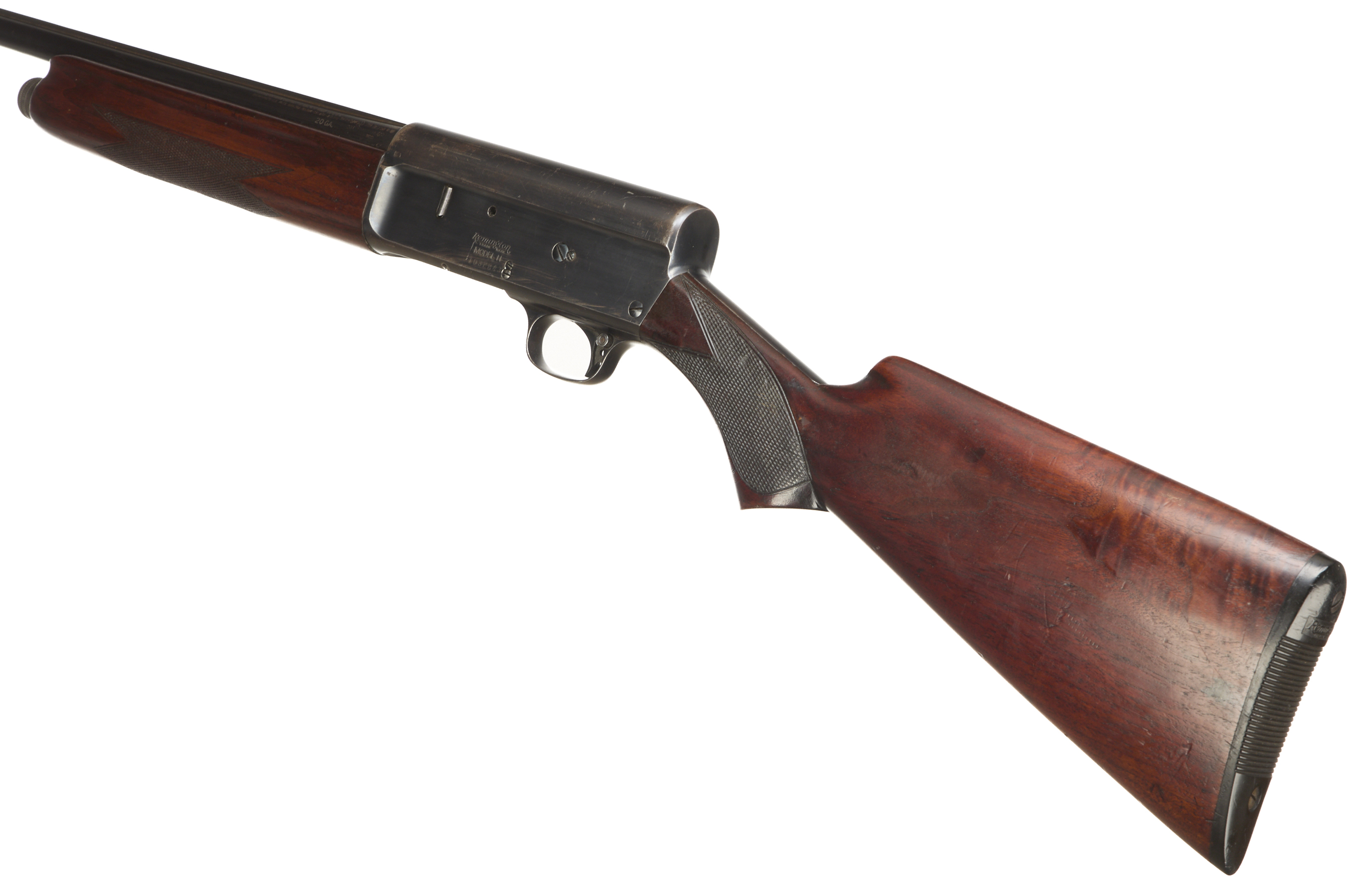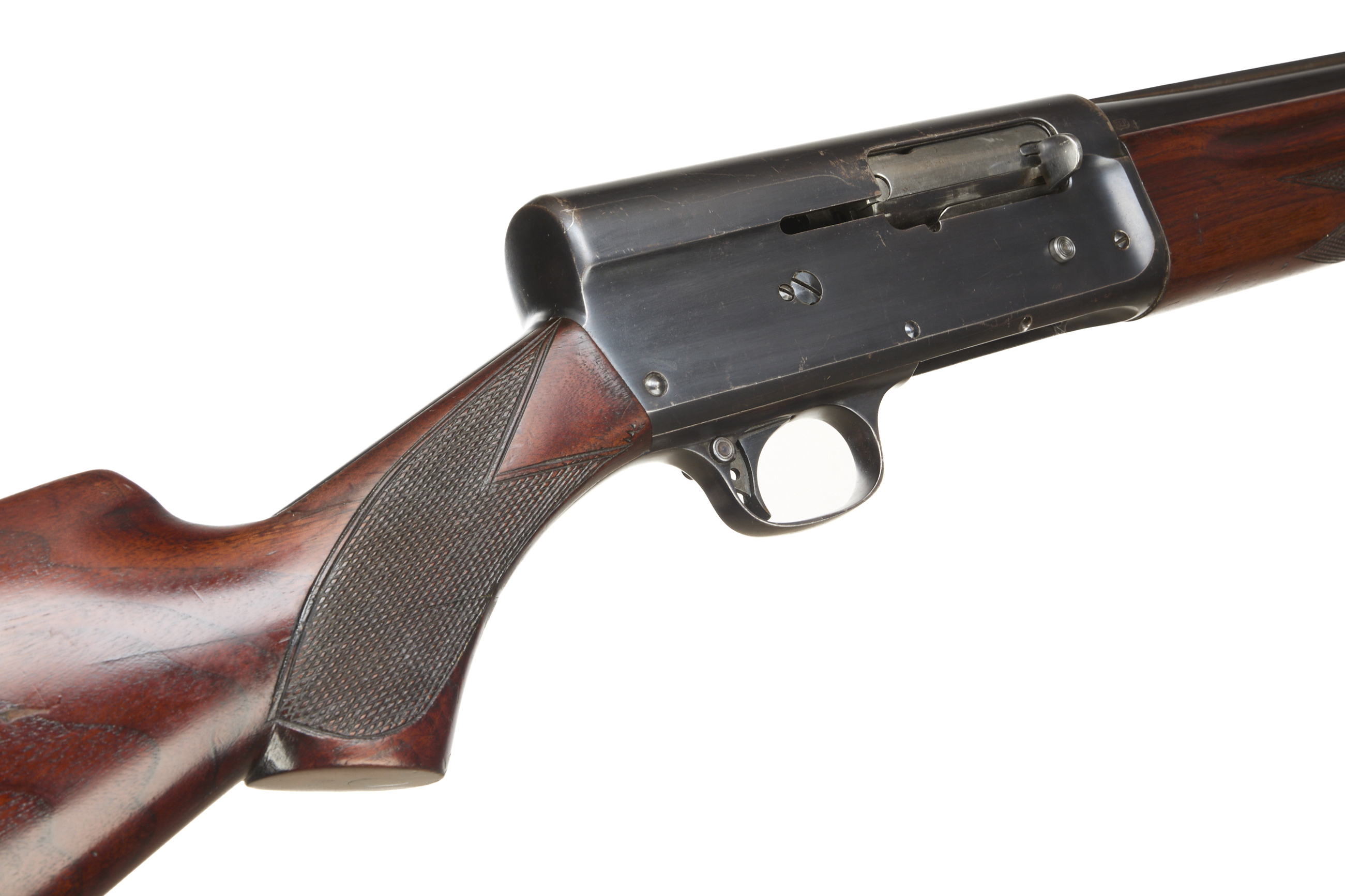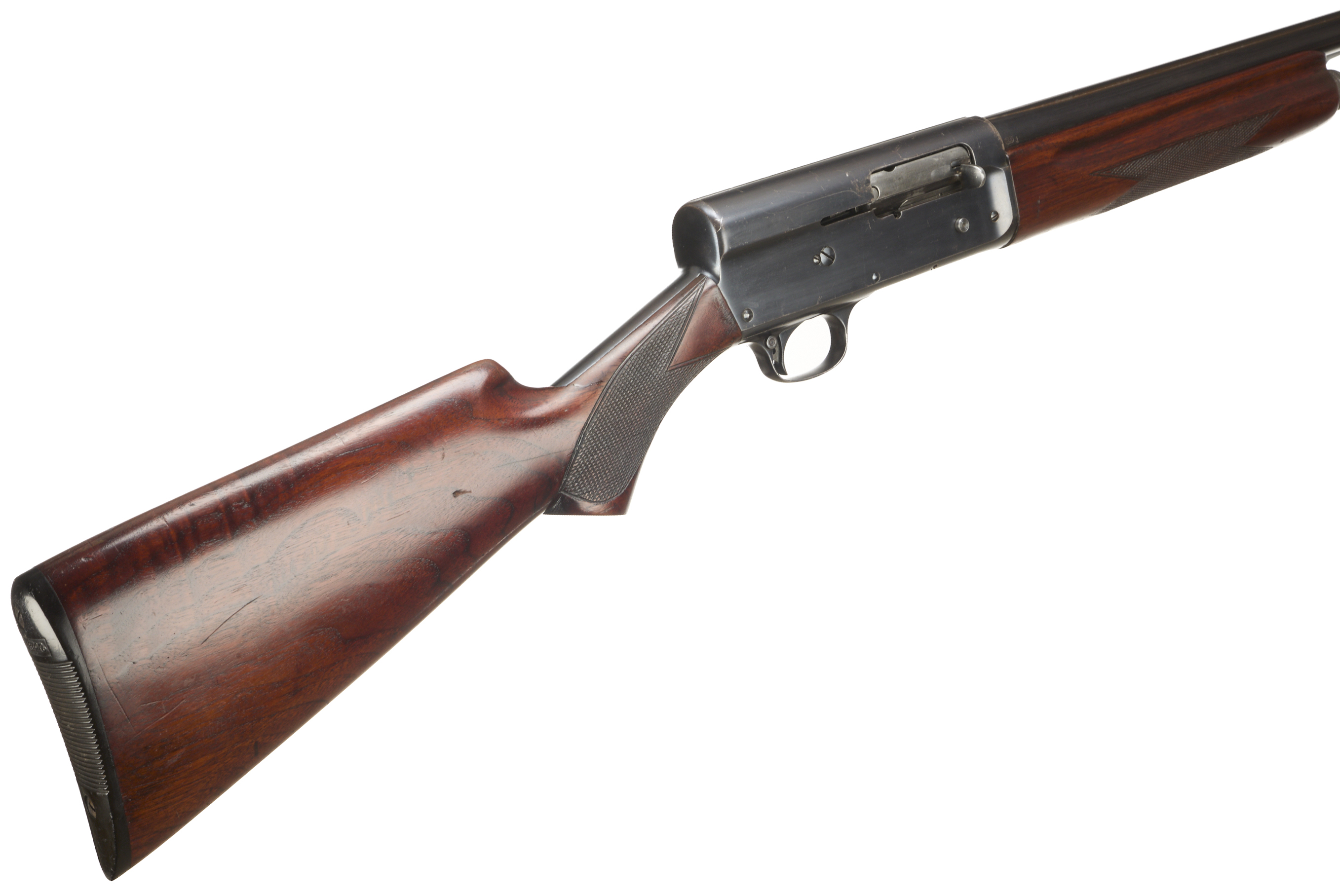 Ebonite butt pad, chequered pistol grip stock and forend. Machined top rib, unadorned action.