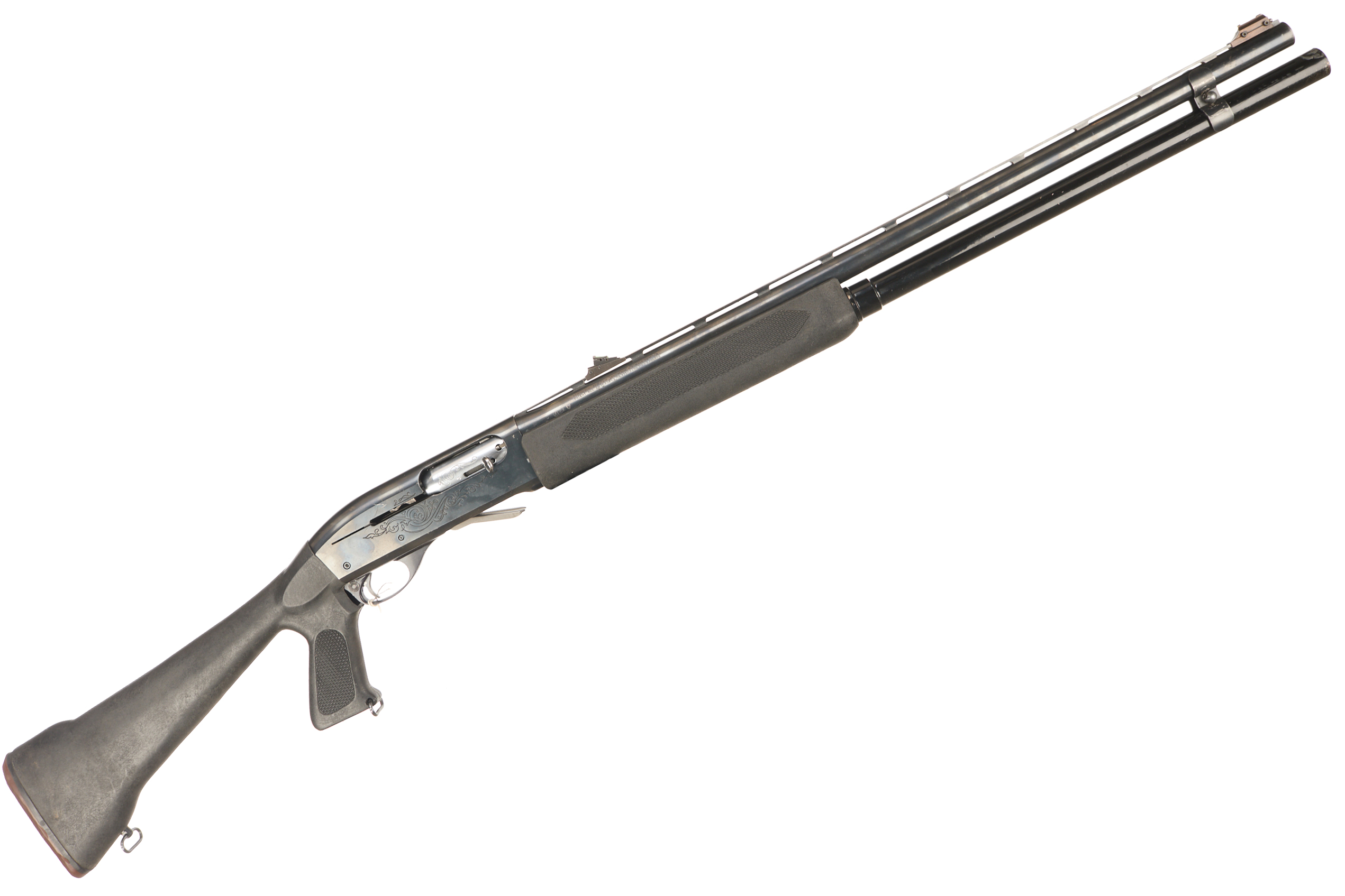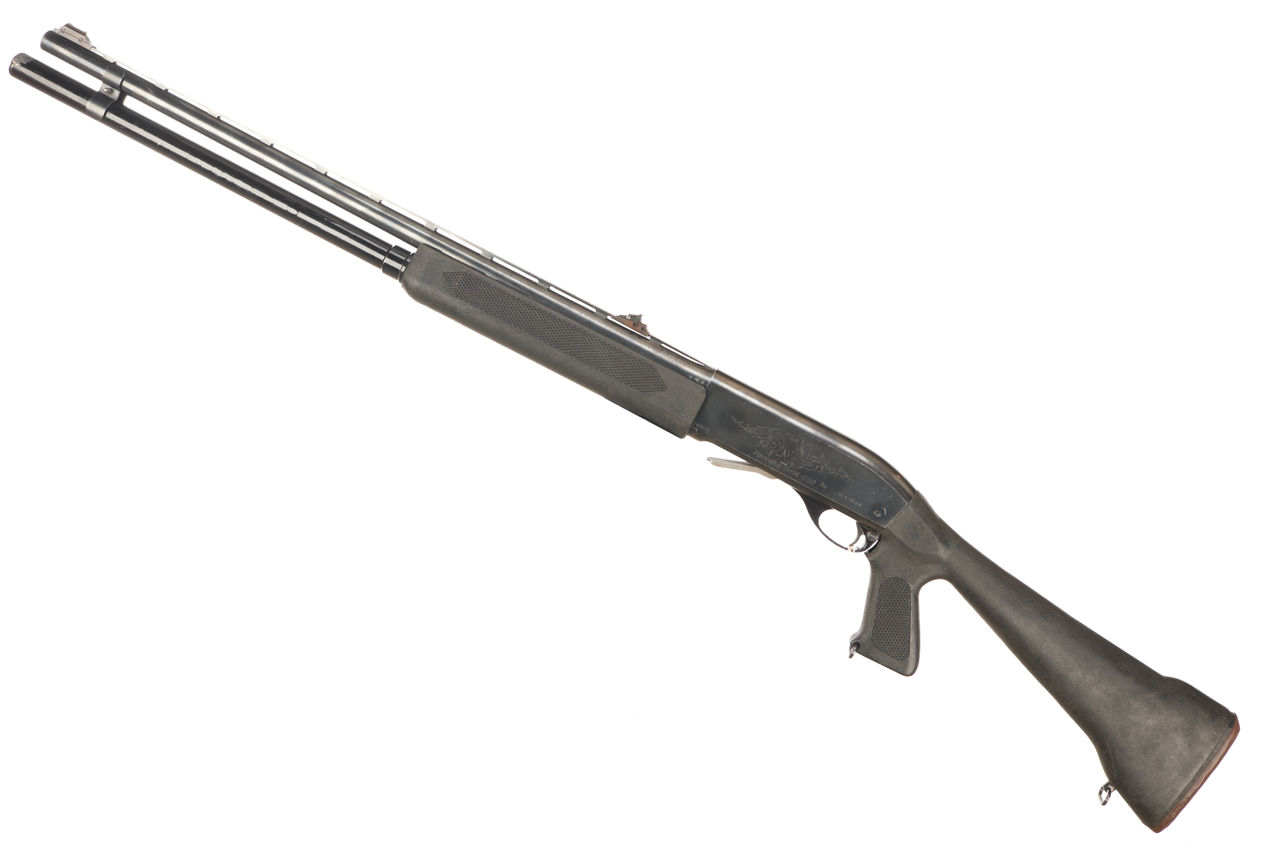 Rubber butt pad, chequered synthetic full grip stock and forend. Ventilated top rib, Engraved with acanthus scrolls and ‘REMININGTON MODEL 1100’ to action.