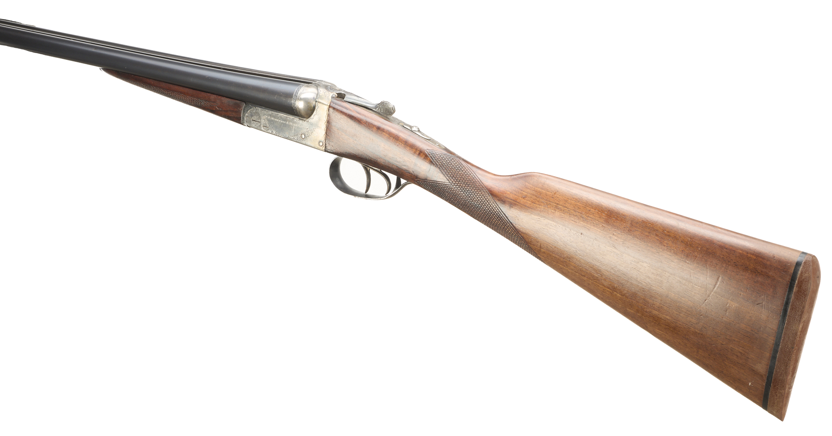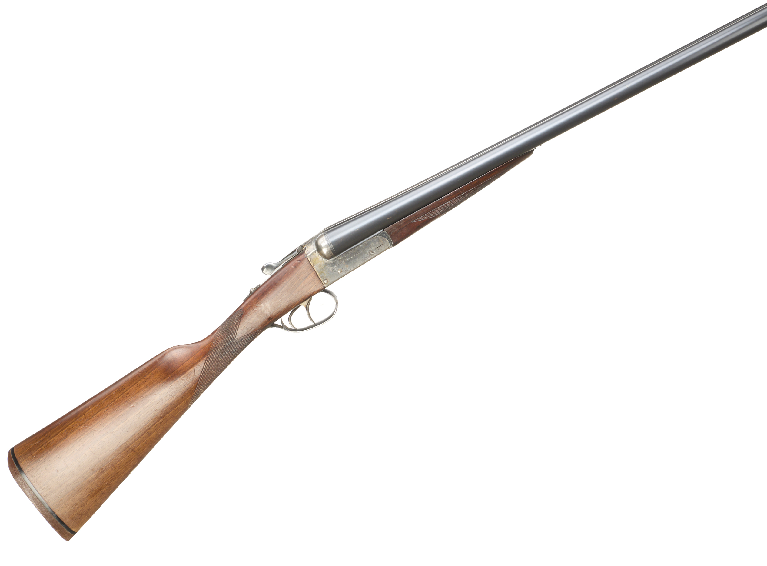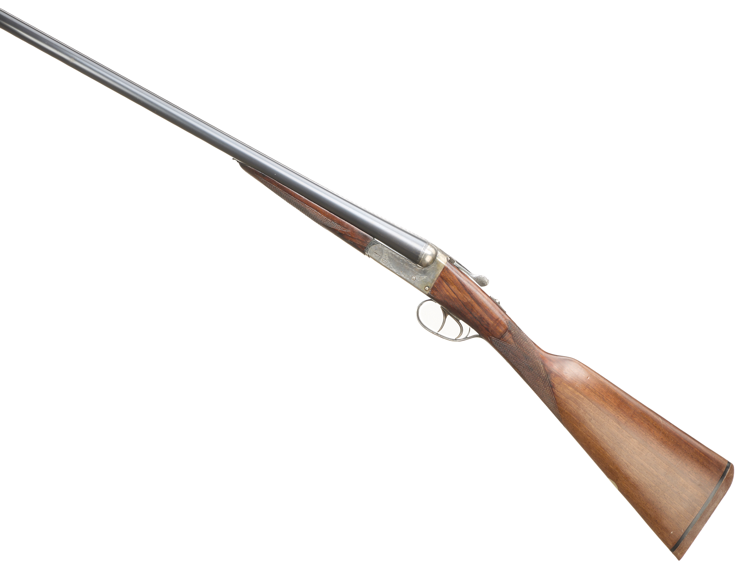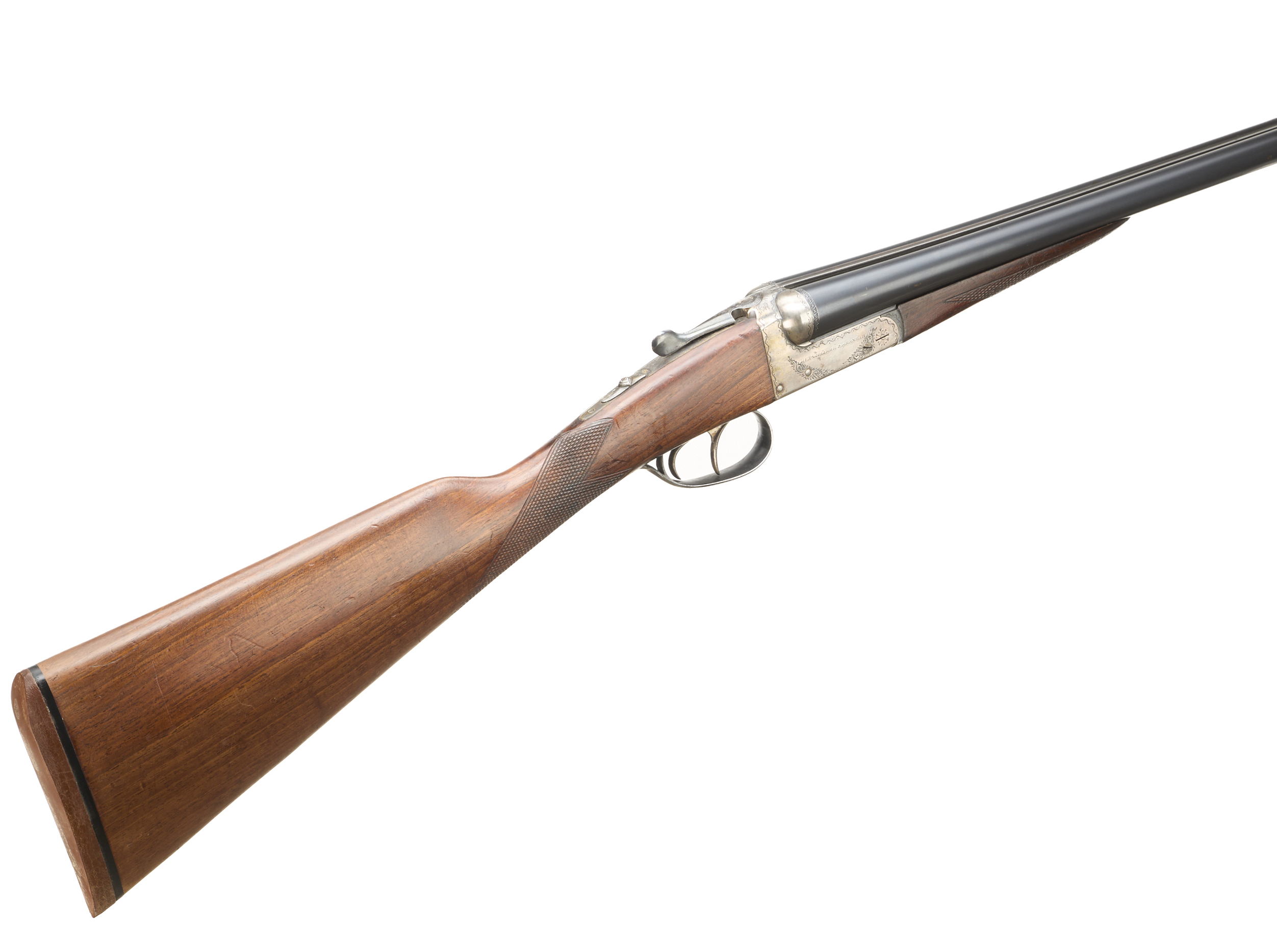 Cushioned rubber butt, chequered straight grip and forend. Tapered rib engraved ‘AYA – AGUIRRE & ARANZABAL – MADE IN SPAIN ‘. Treble grip action, top lever, automatic safety with ‘S’ inlaid in gold. The action engraved with ‘AYA – AGUIRRE & ARANZABAL’ and acanthus scrolling.