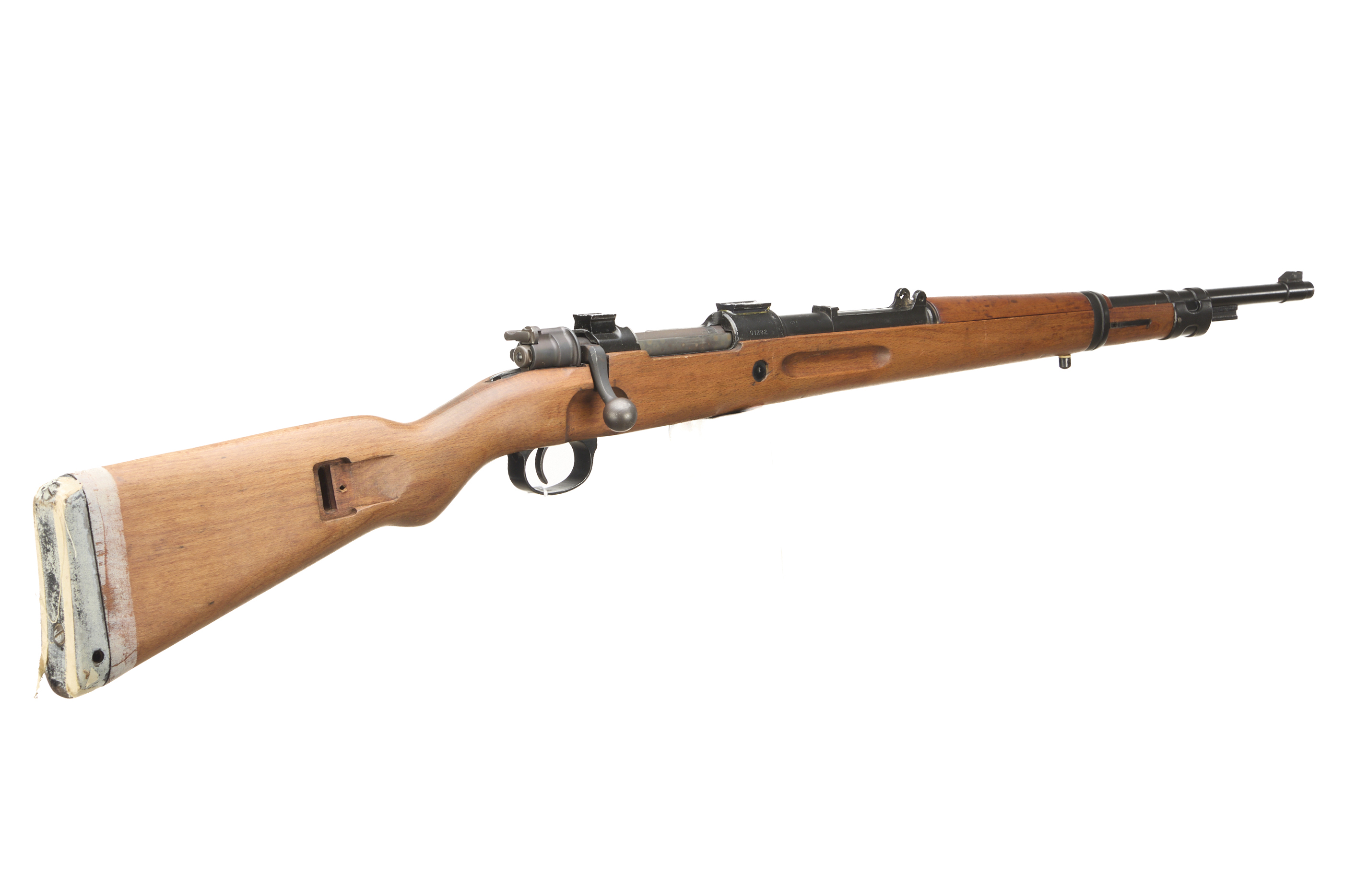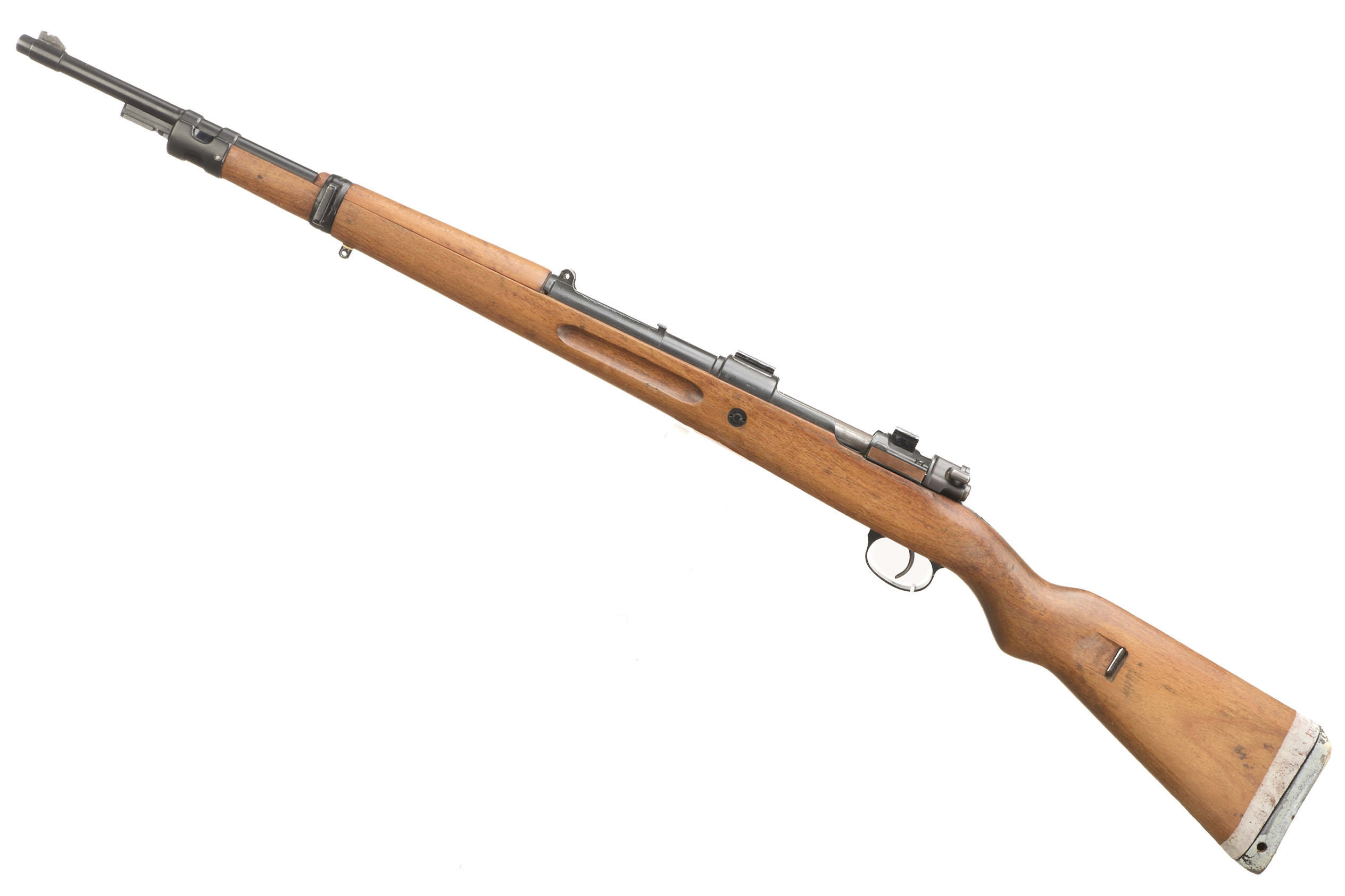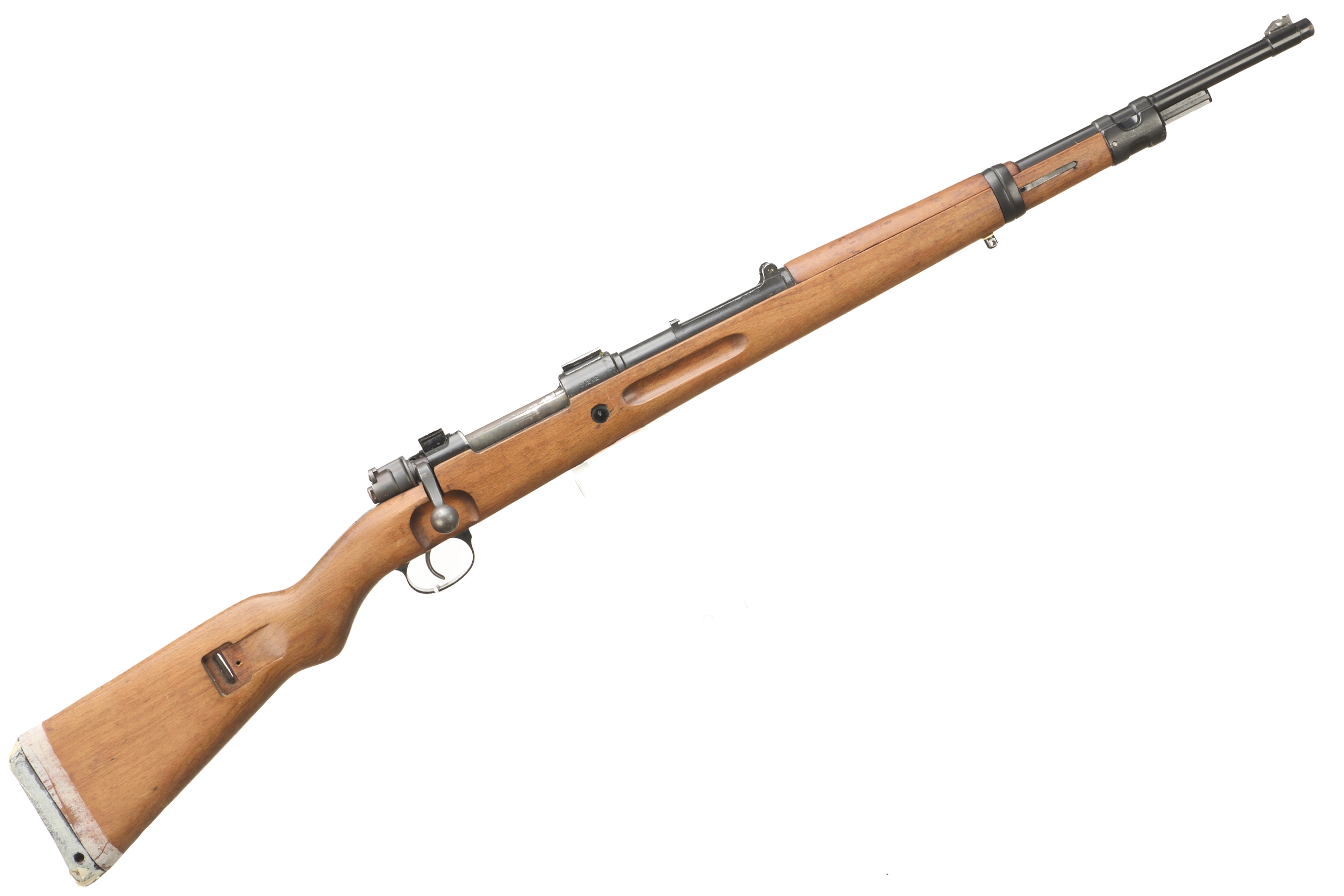 Full length, beech stock, semi-pistol grip, metal butt plate. Fore sight post absent, rear sight absent, dovetail scope mounts to action. Matching serial numbers. The action engraved ‘FN etc’.