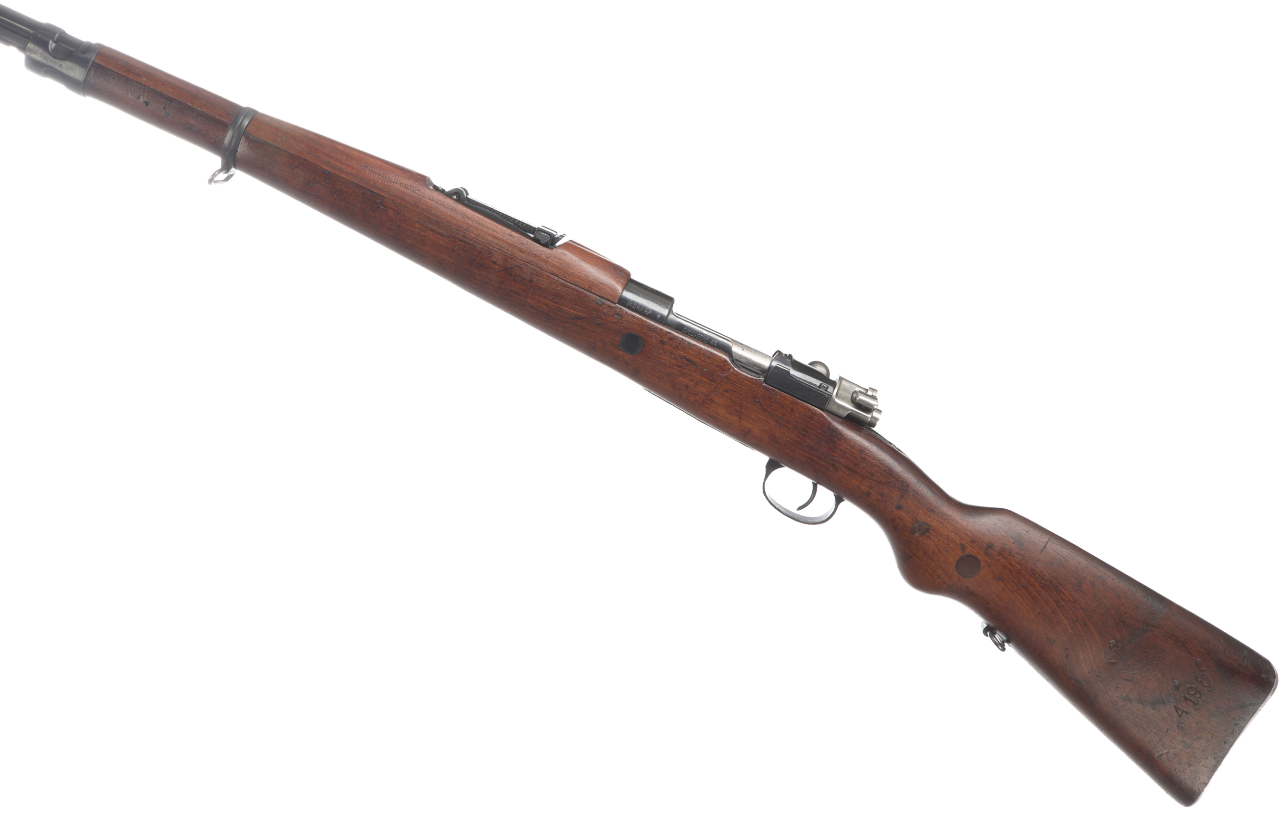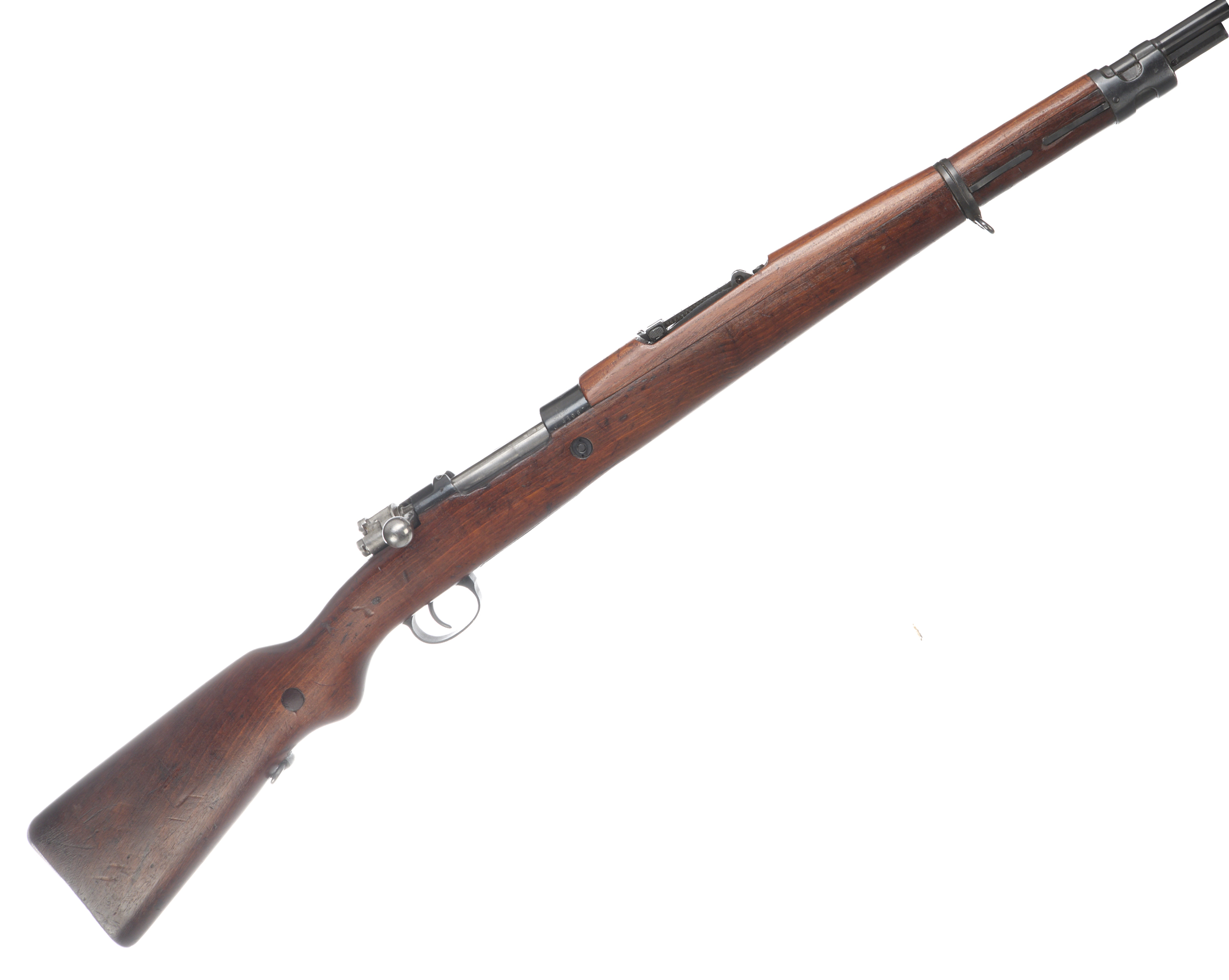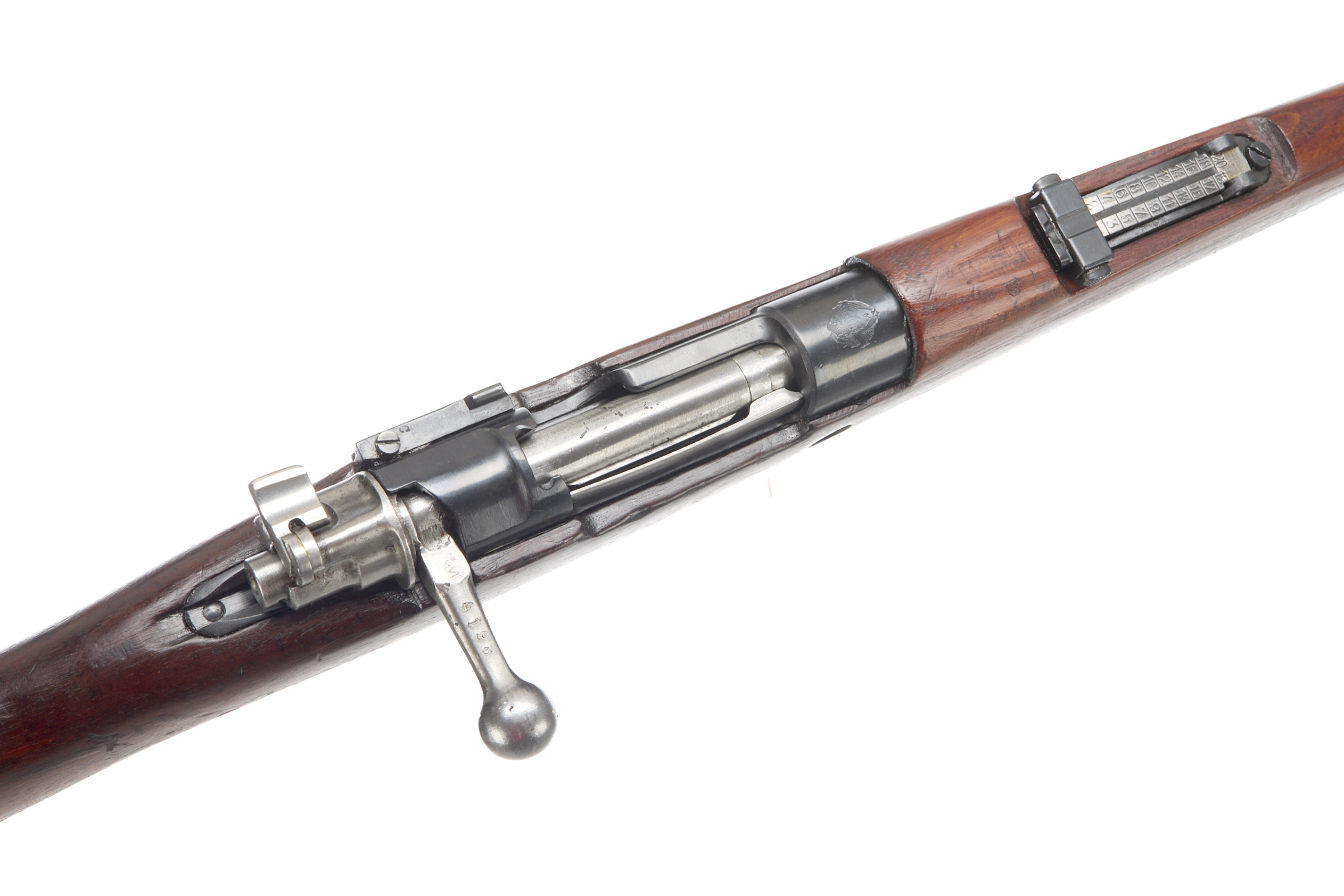 Steel butt, semi-pistol grip. Sling attachments. Plain muzzle with bayonet lug, barrel band, post foresight, adjustable ramp rearsight, internal magazine with fixed floor plate. The breech stamped ‘M24/47’. Matching serial numbers throughout. For 1944.
