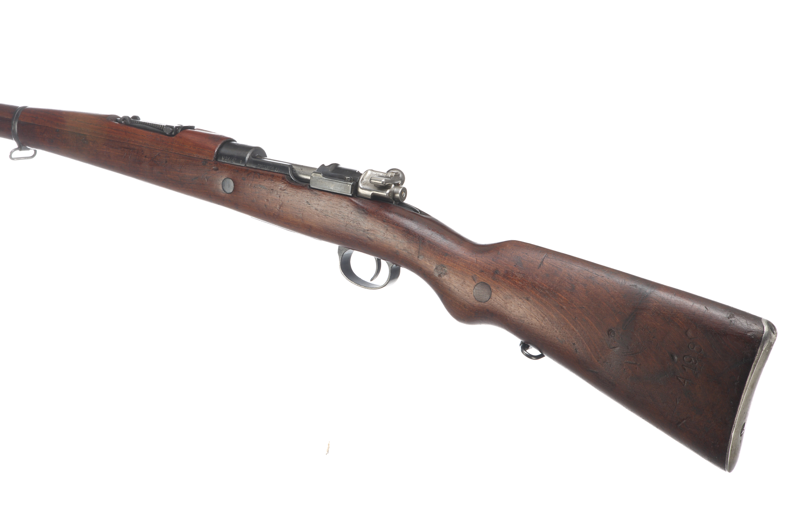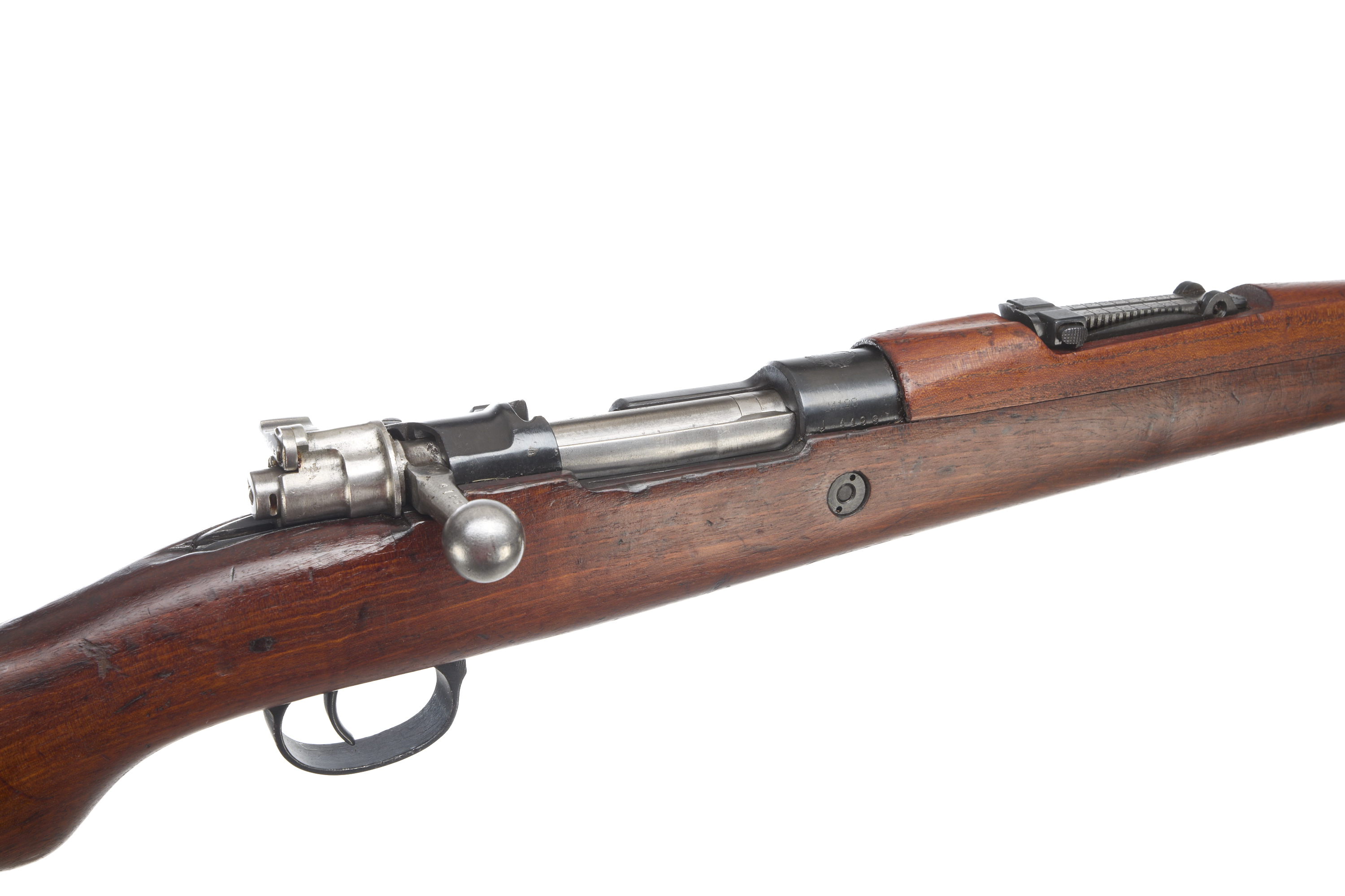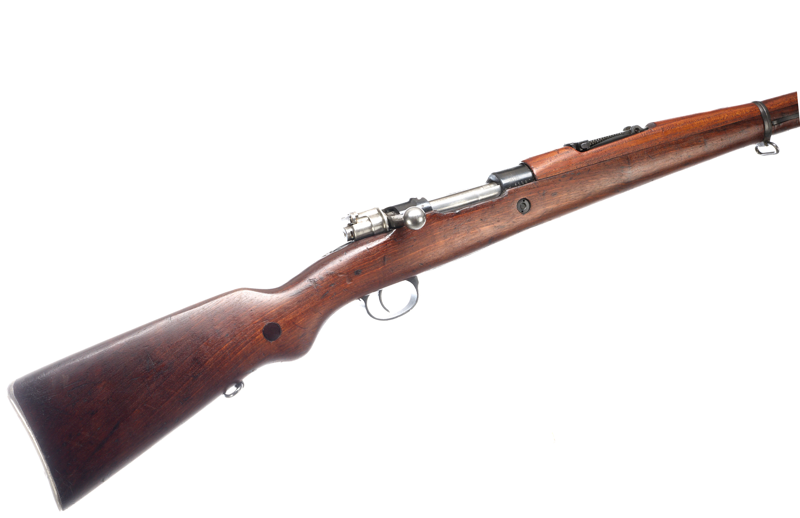Steel butt, semi-pistol grip. Sling attachments. Plain muzzle with bayonet lug, barrel band, post foresight, adjustable ramp rearsight, internal magazine with fixed floor plate. The breech stamped ‘M24/47’. Matching serial numbers throughout. For 1944.