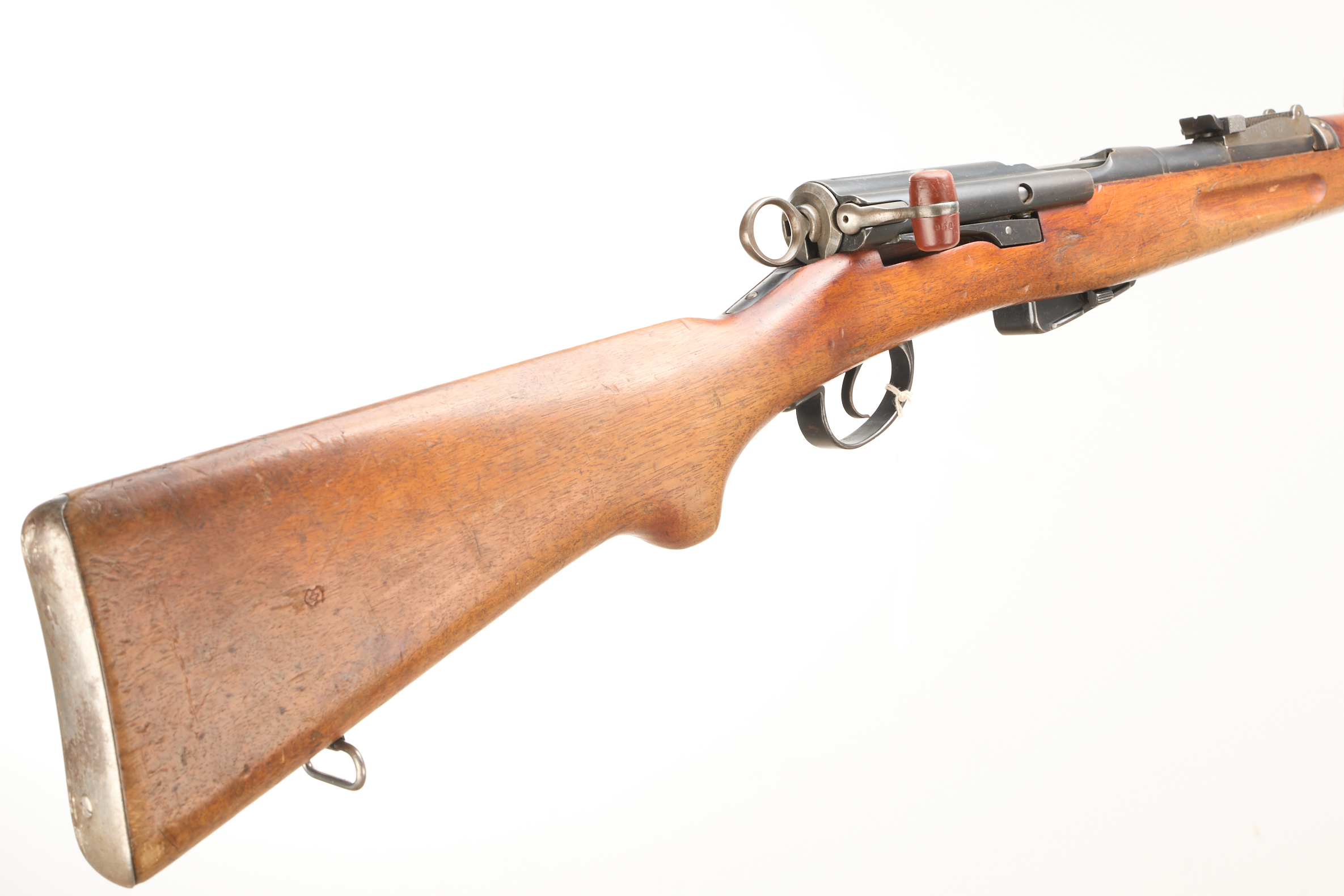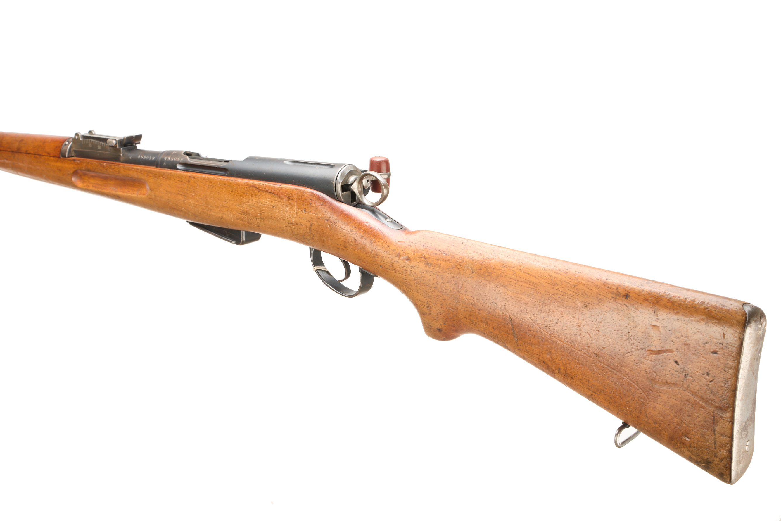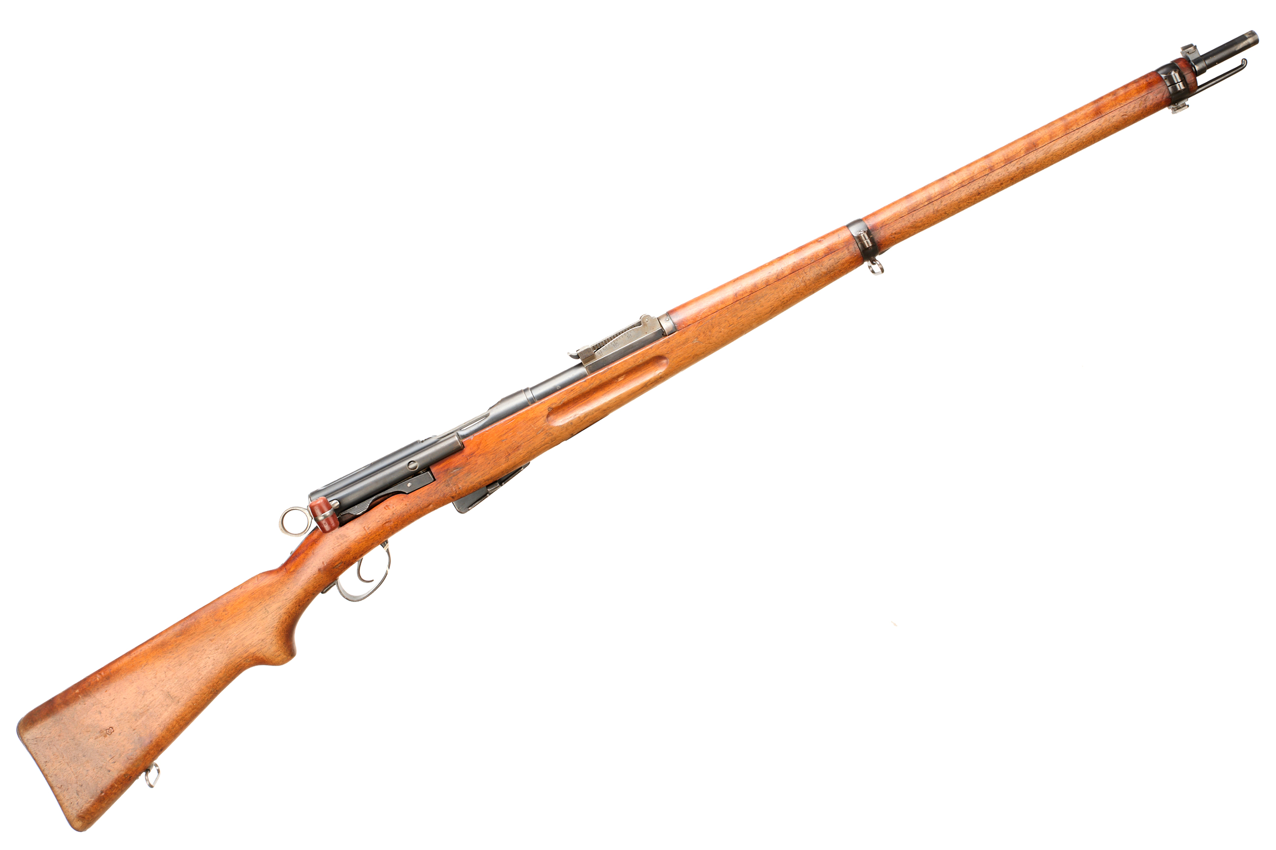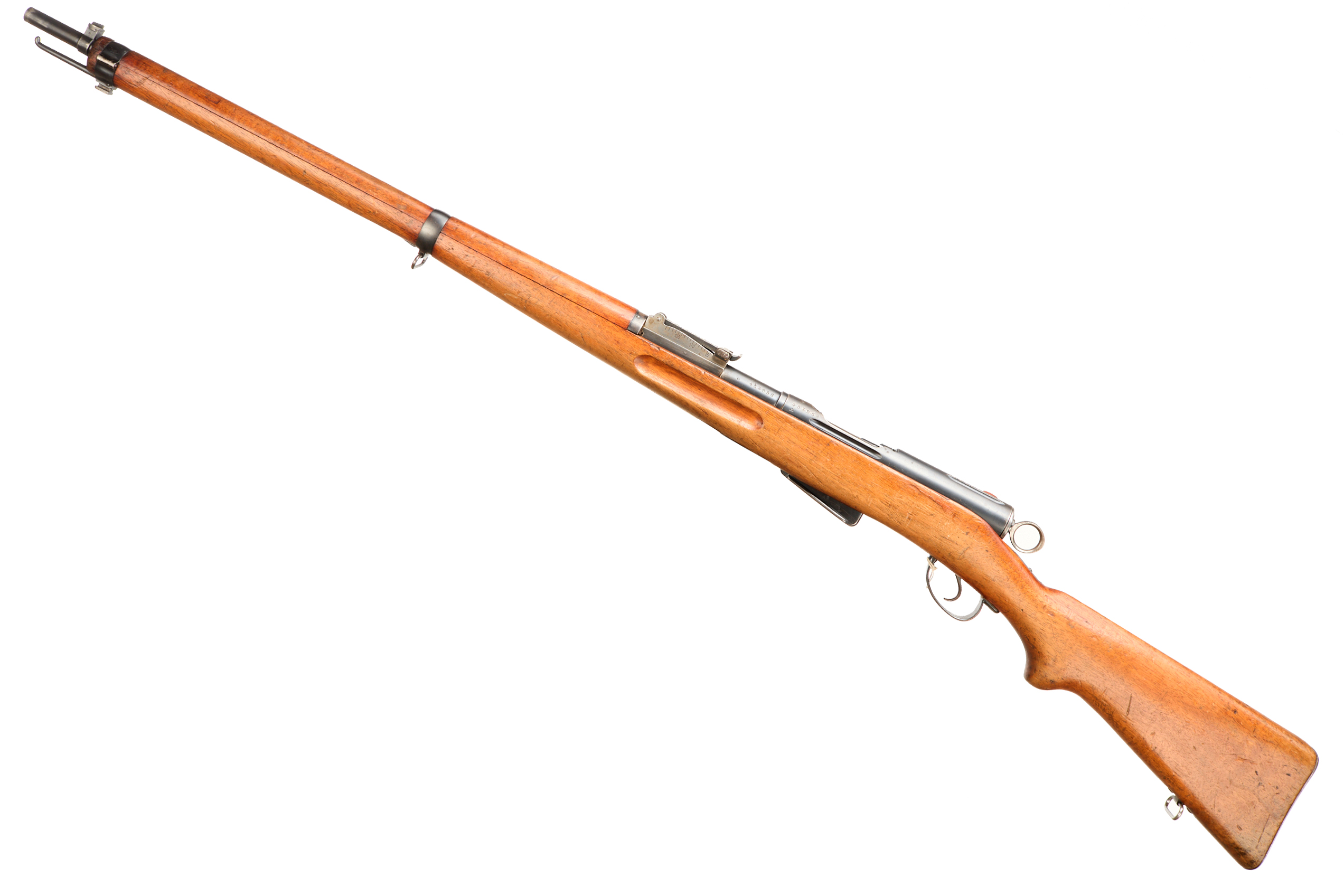 Metal buttplate, sling swivel in full length stock, barrel band with additional sling swivel. Bayonet lug, adjustable post foresight, ramp rearsight to 1500m. Matching serial numbers. CW detachable magazine.