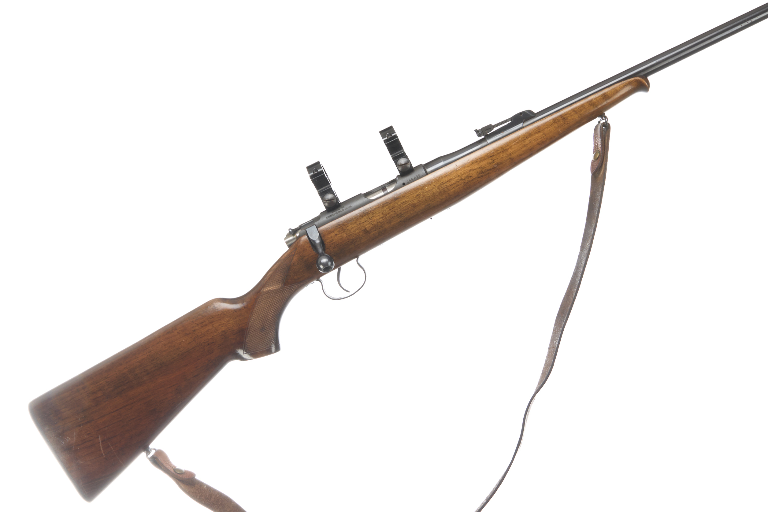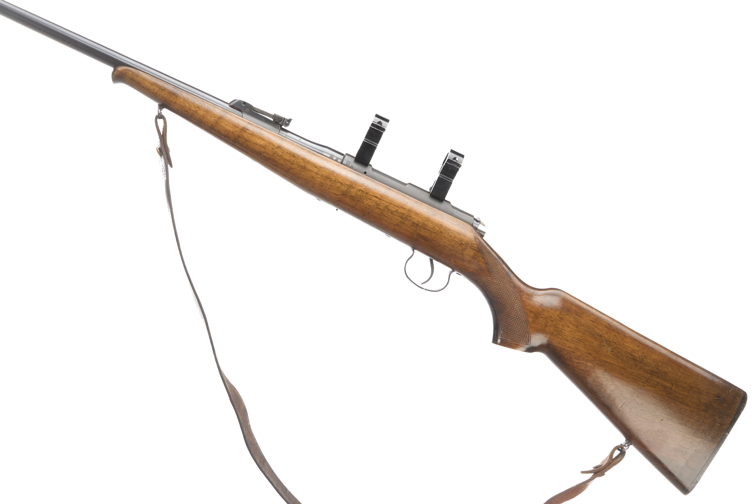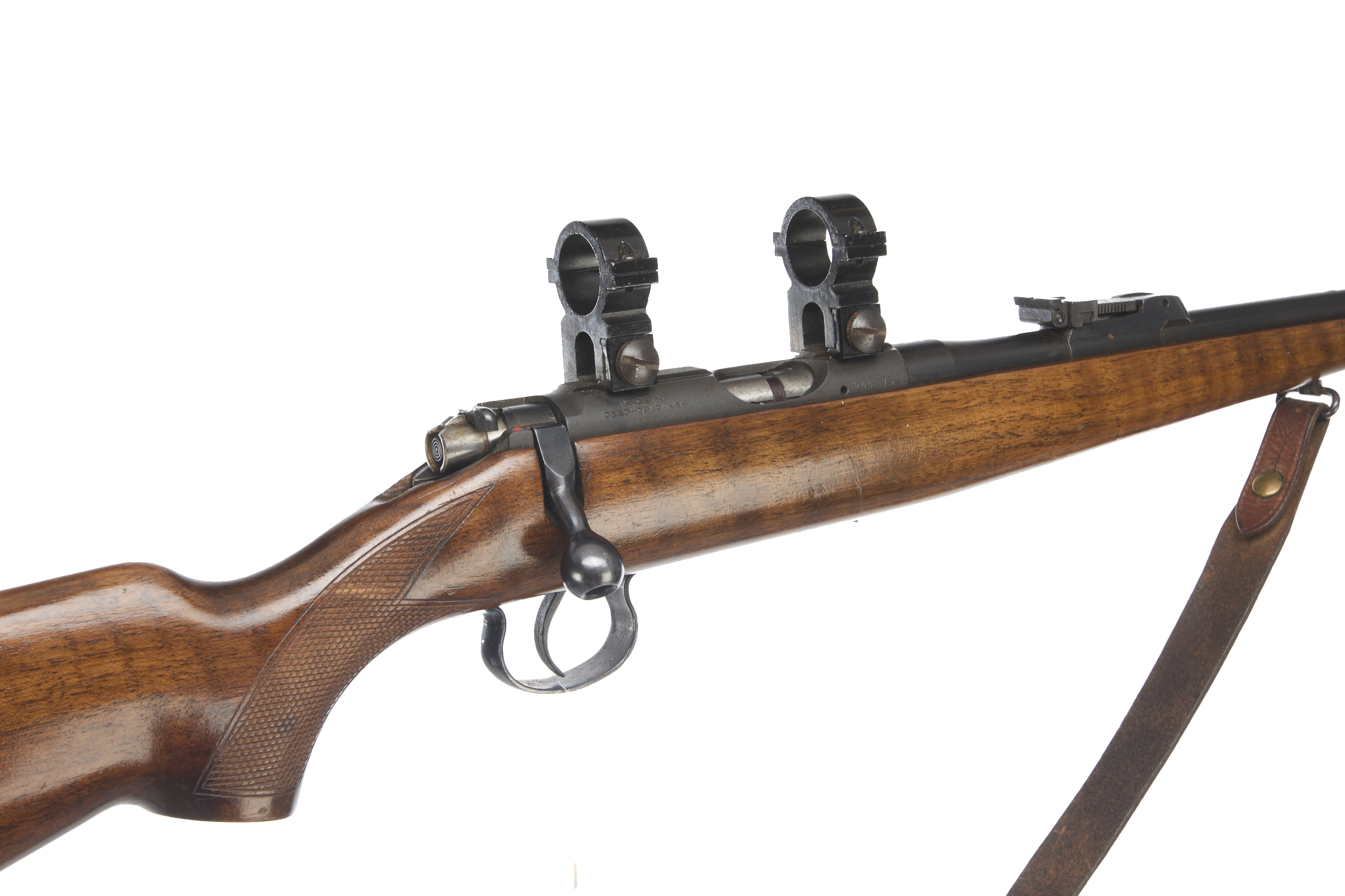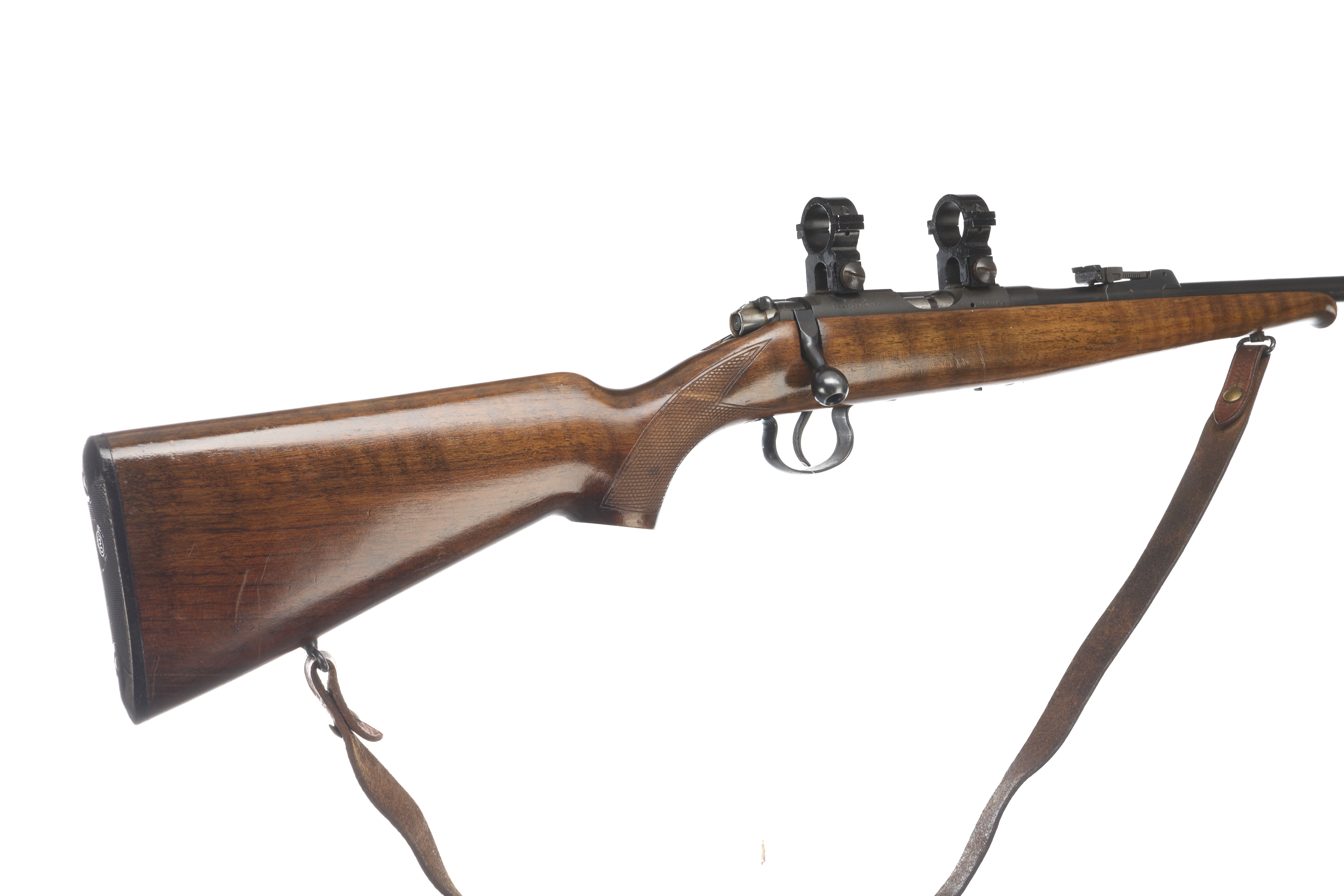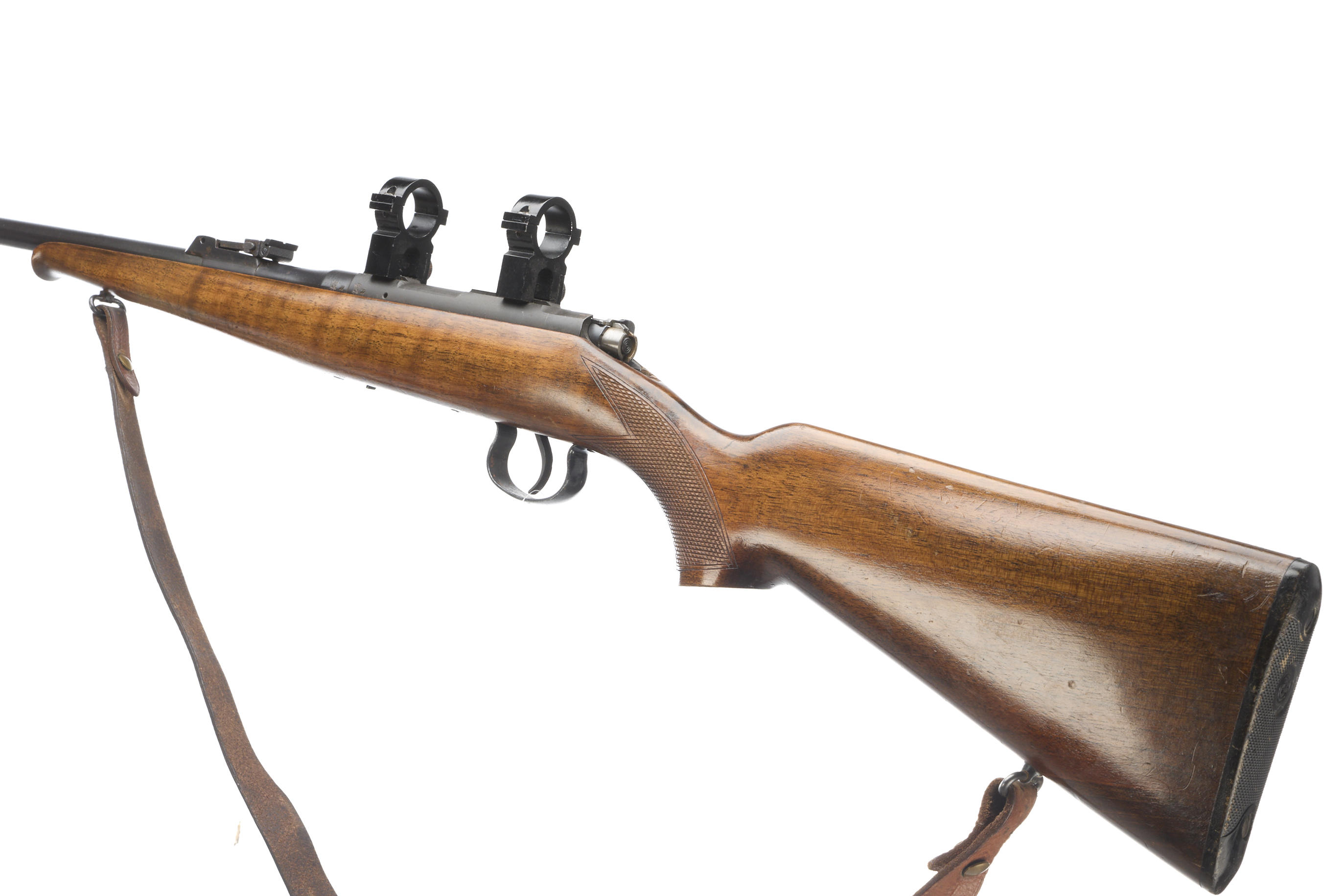 Chequered butt plate and semi-pistol grip, Schnabel forend. Post foresight, ramp rearsight. Magazine absent. 25mm scope rings.