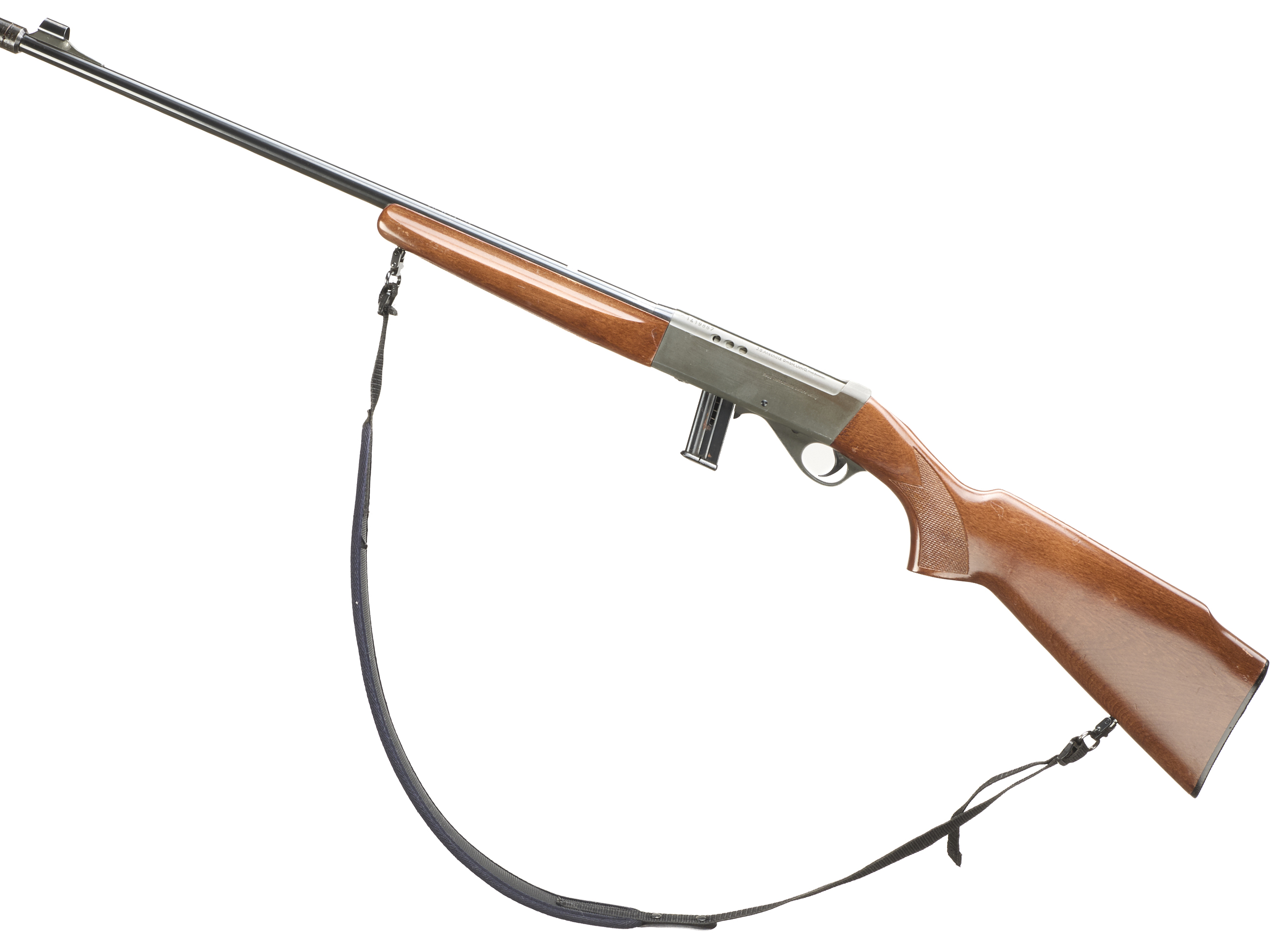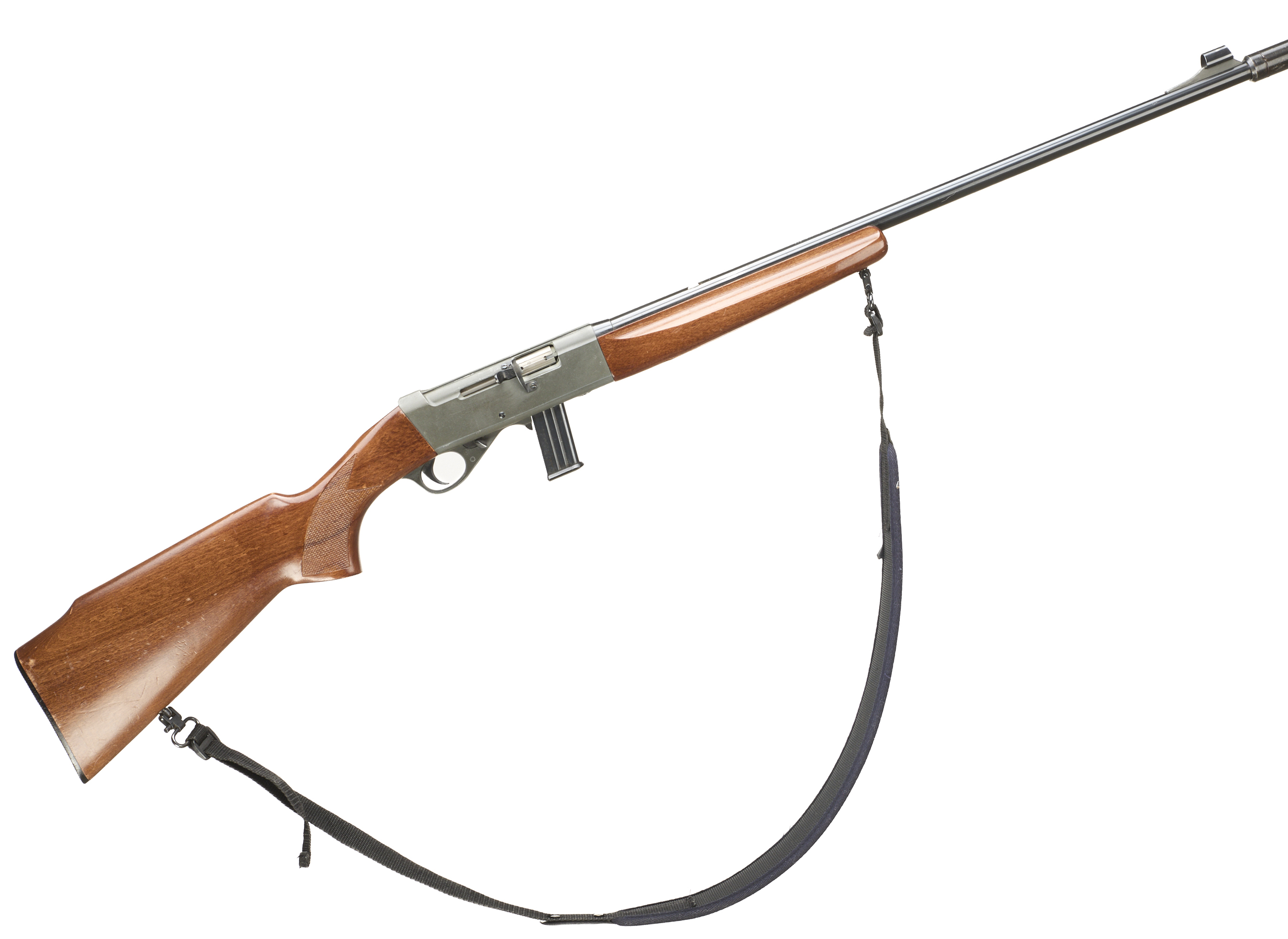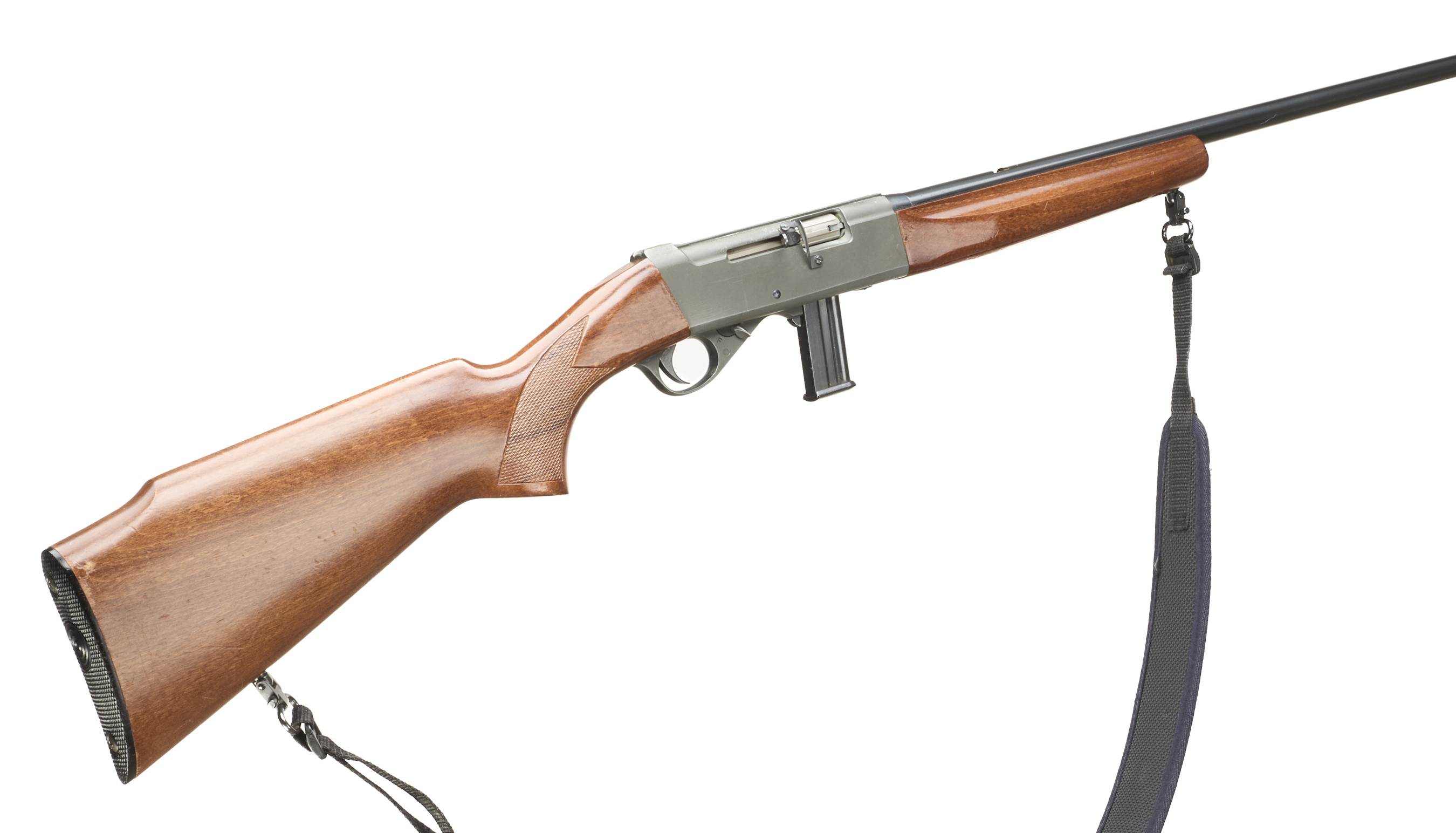 Chequered butt plate and semi-pistol grip, rounded forend. Screwcut with sound moderator. Sling attachments. Detachable magazine.