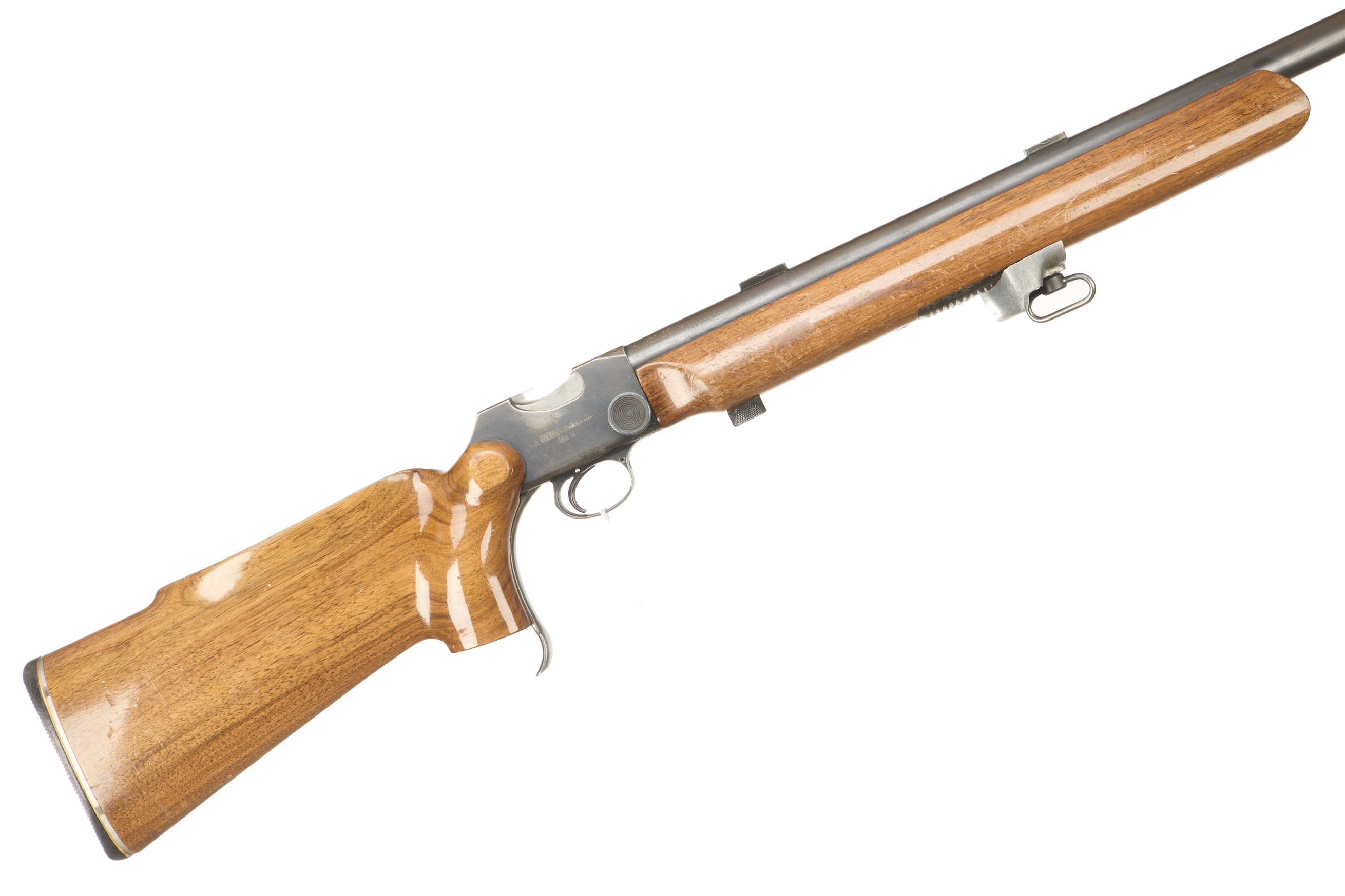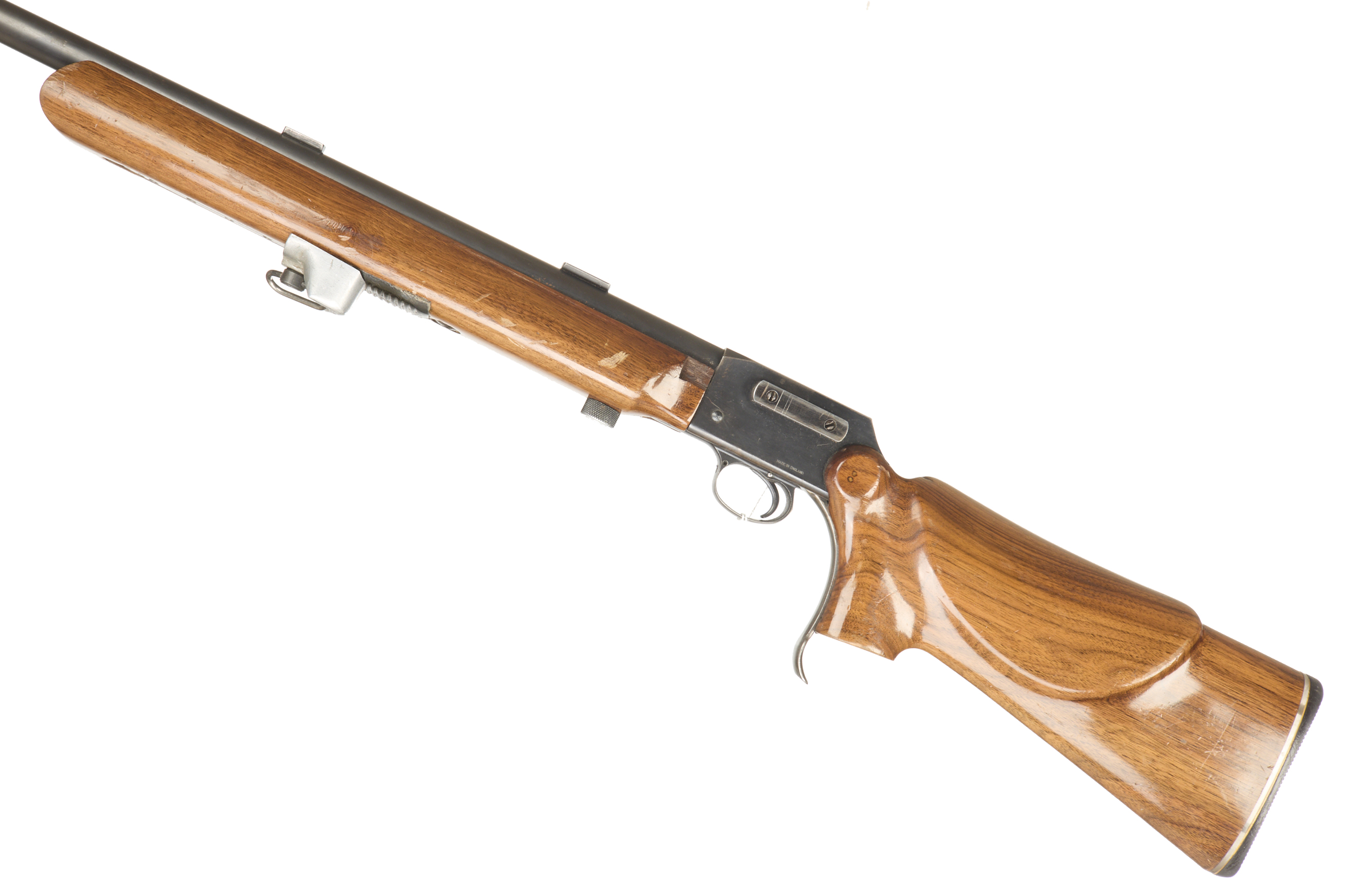 Plastic butt, semi-pistol grip, rounded forend. Front sling attachment and leather sling. Plain muzzle, iron sighted barrel (sights absent).