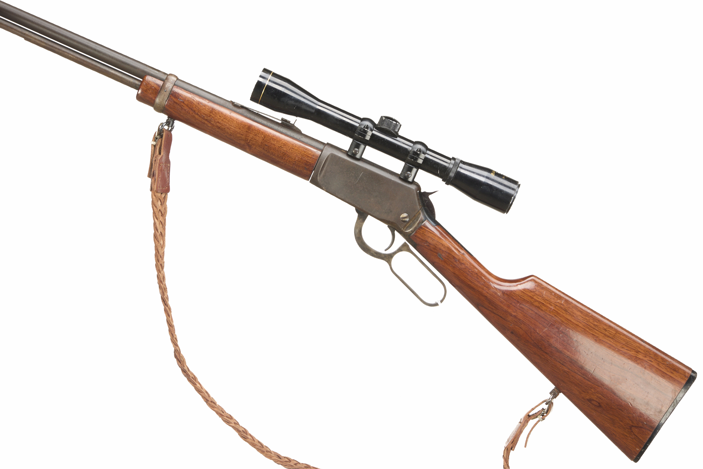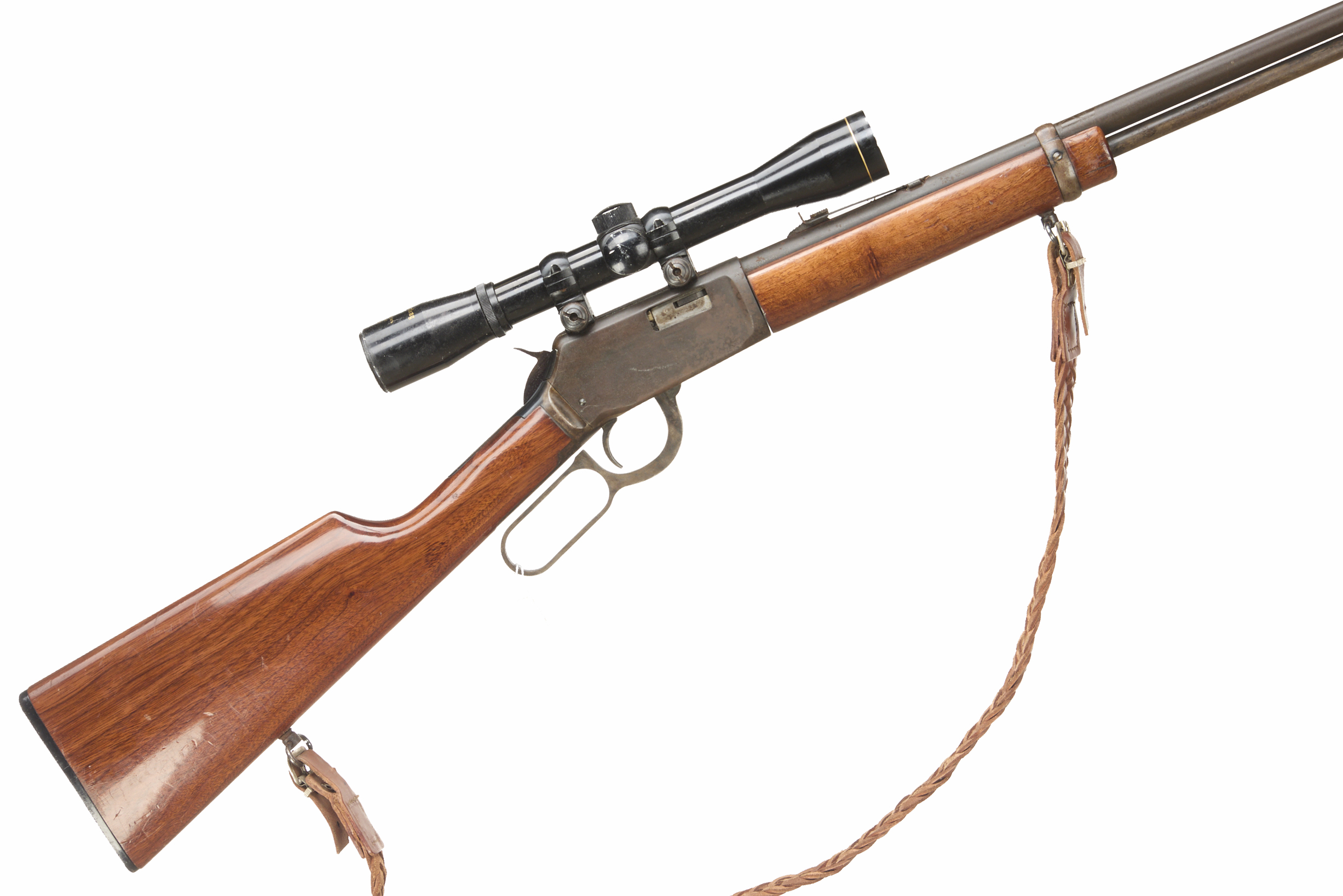 Ebonite butt plate, unadorned straight grip. Hooded foresight, ramp rear sight. Nikko Sterling Silver Crown 4×32 scope. Plaited leather sling on sling swivels. Tubular magazine.