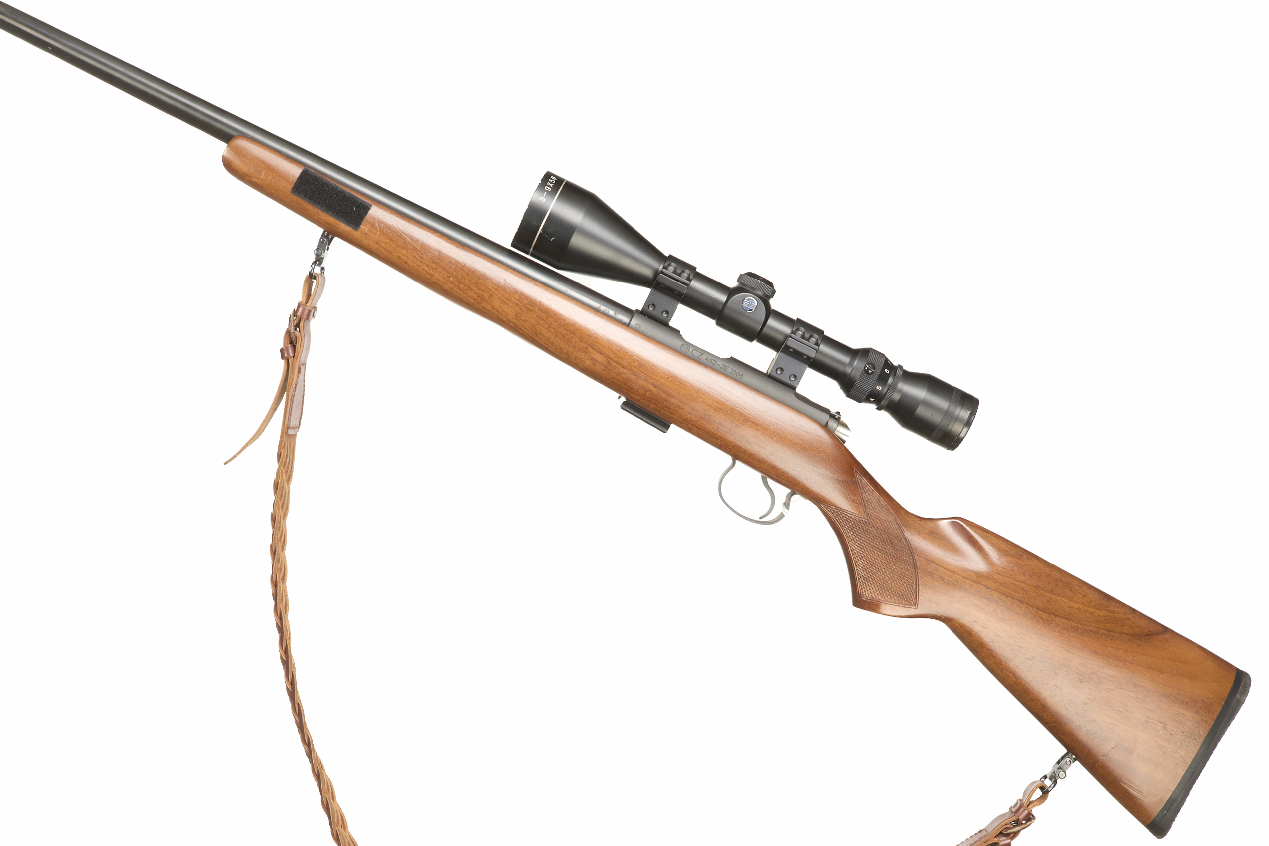 Cushioned butt, semi-pistol grip, rounded forend. Sling attachments and leather sling. Threaded muzzle, unsighted barrel. Detachable box magazine. Edgar Brothers 3 – 9 x 50 scope