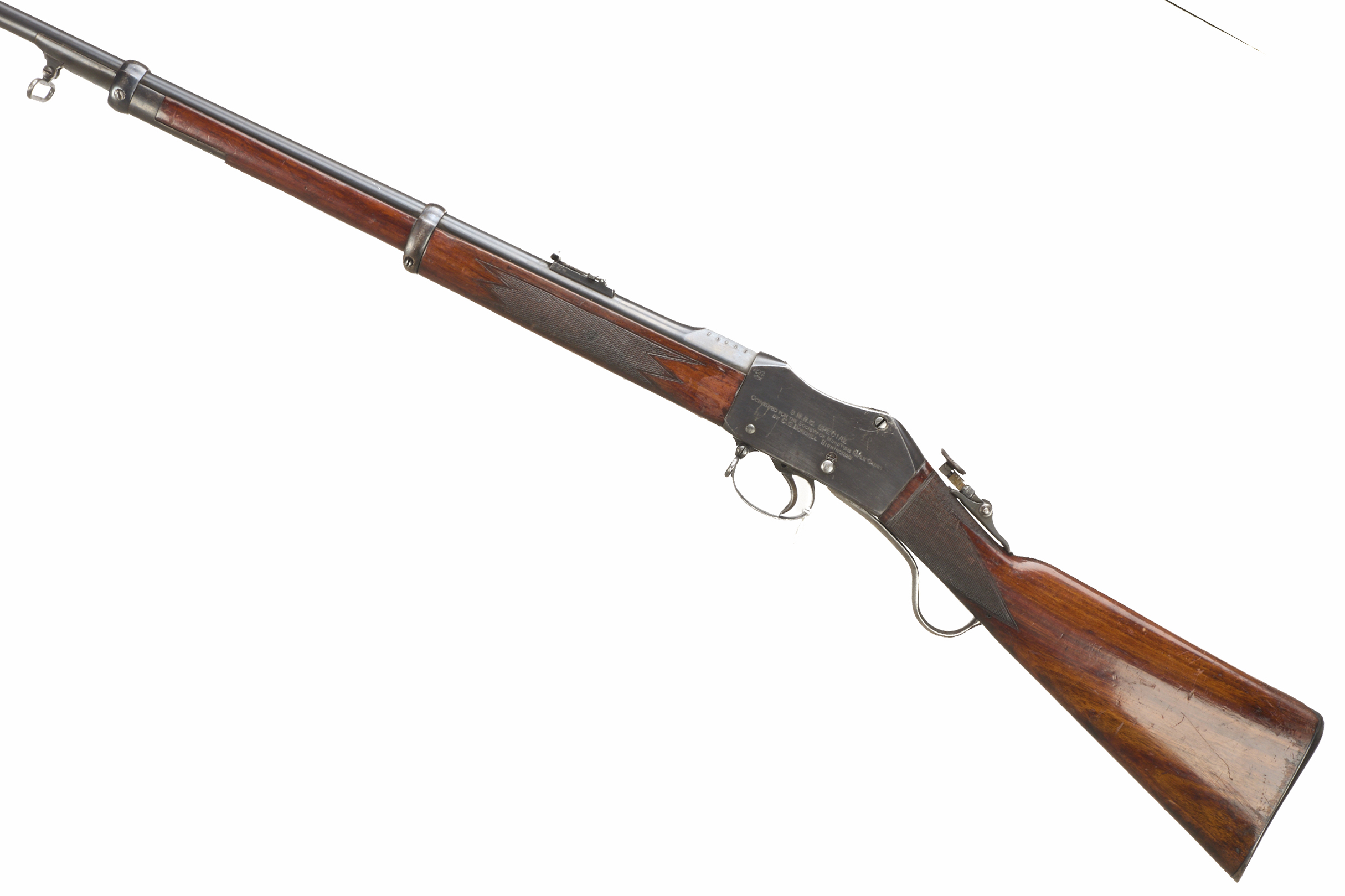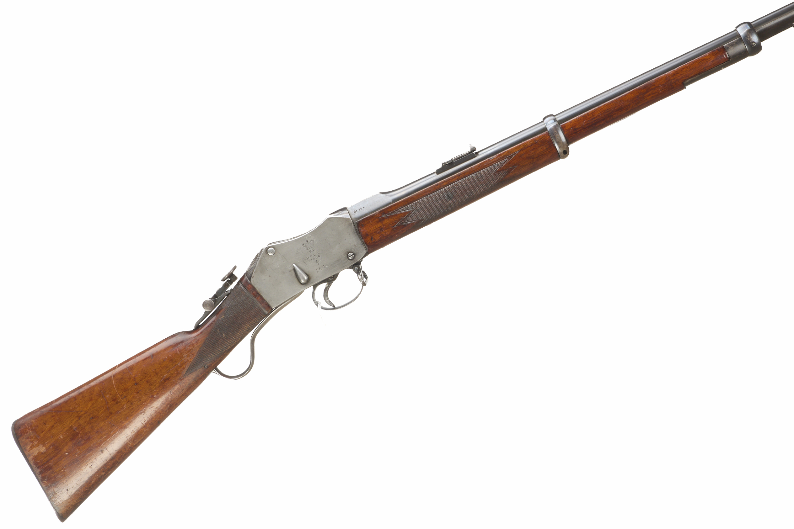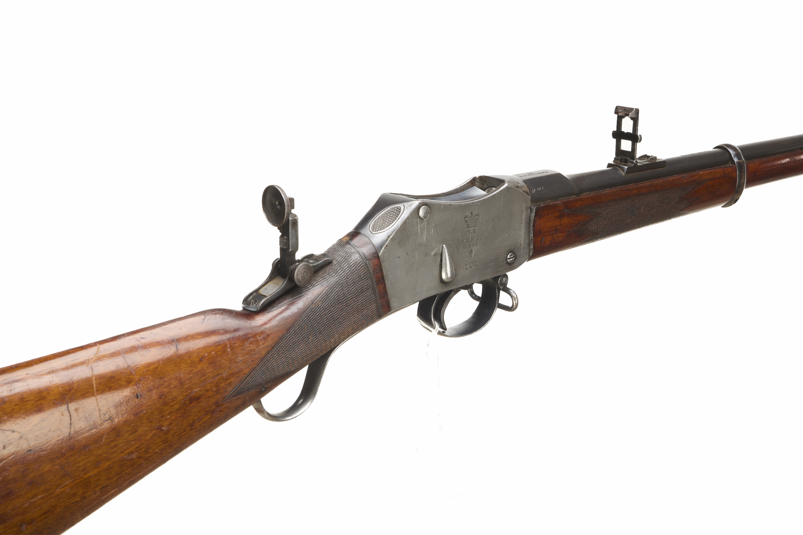 Metal butt, straight grip, forend with two barrel bands. Plain muzzle, iron sighted barrel and rear tang sight. Single shot falling block action.
