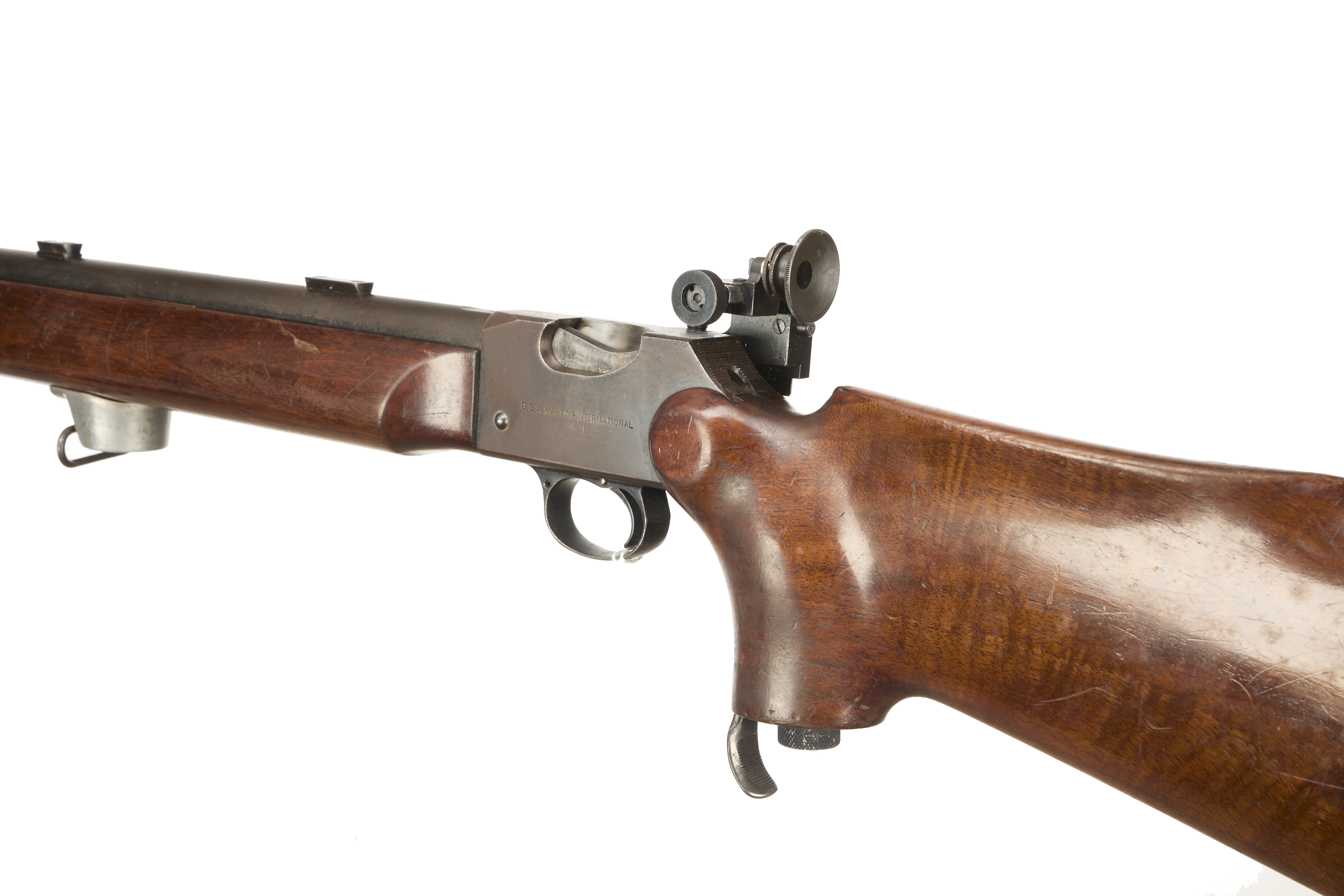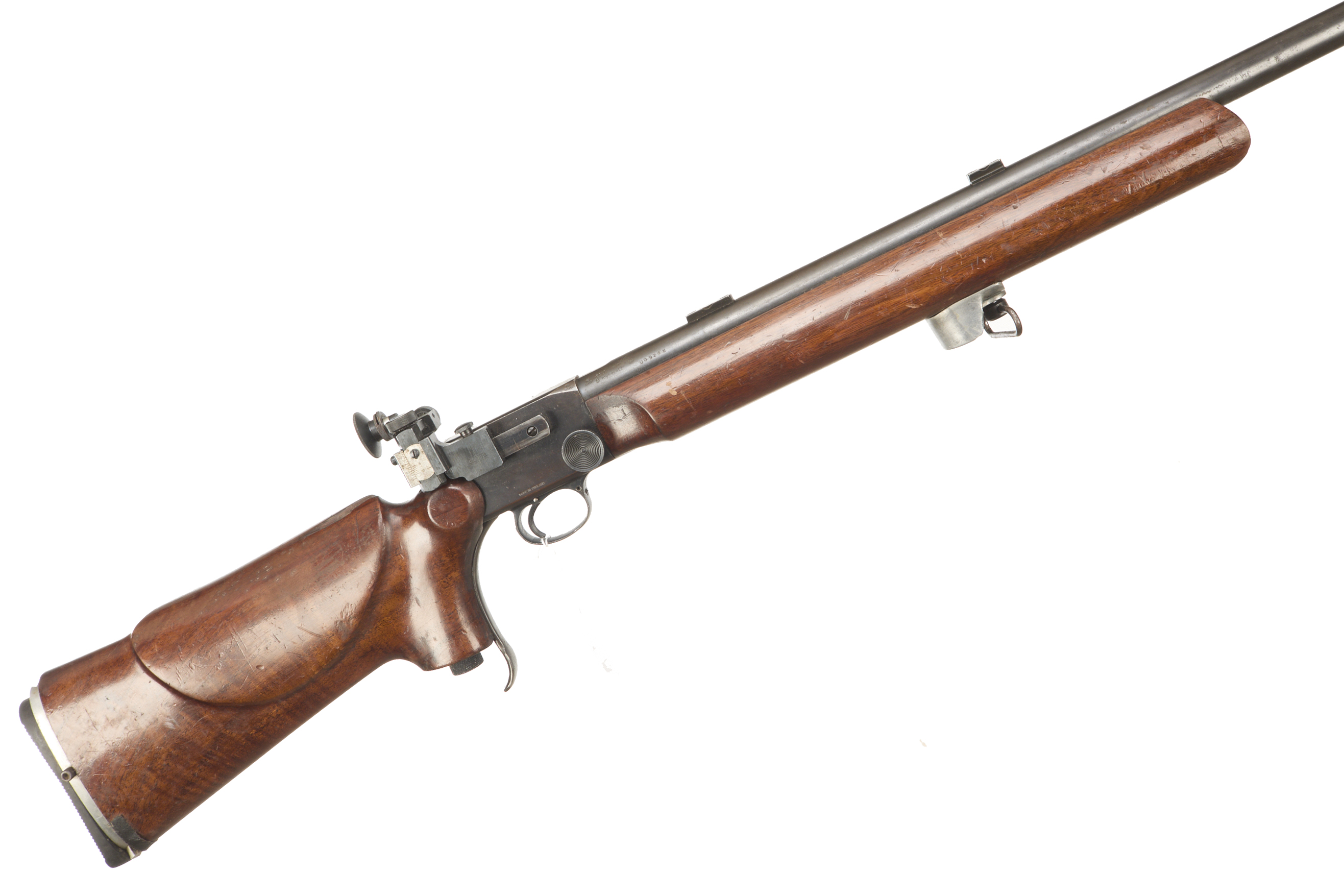 Adjustable butt, semi-pistol grip, rounded forend. Front sling attachment and hand stop. Plain muzzle, iron sighted barrel.