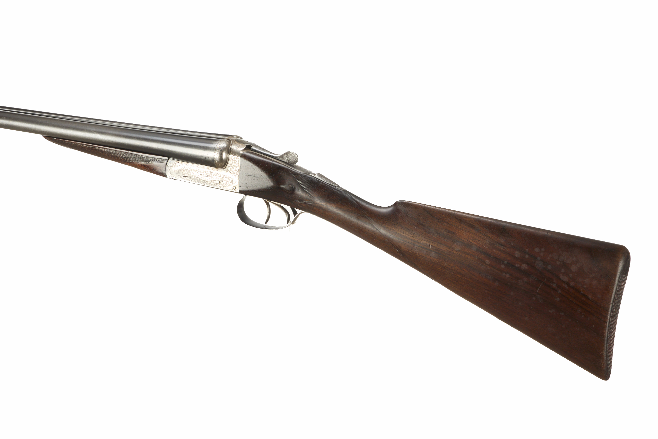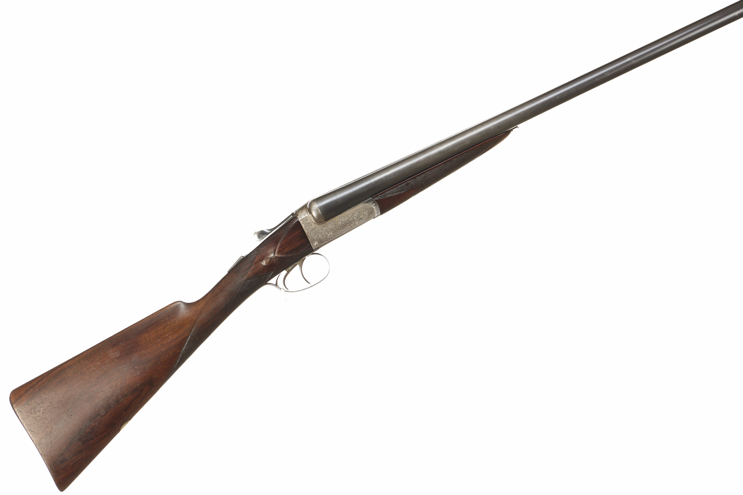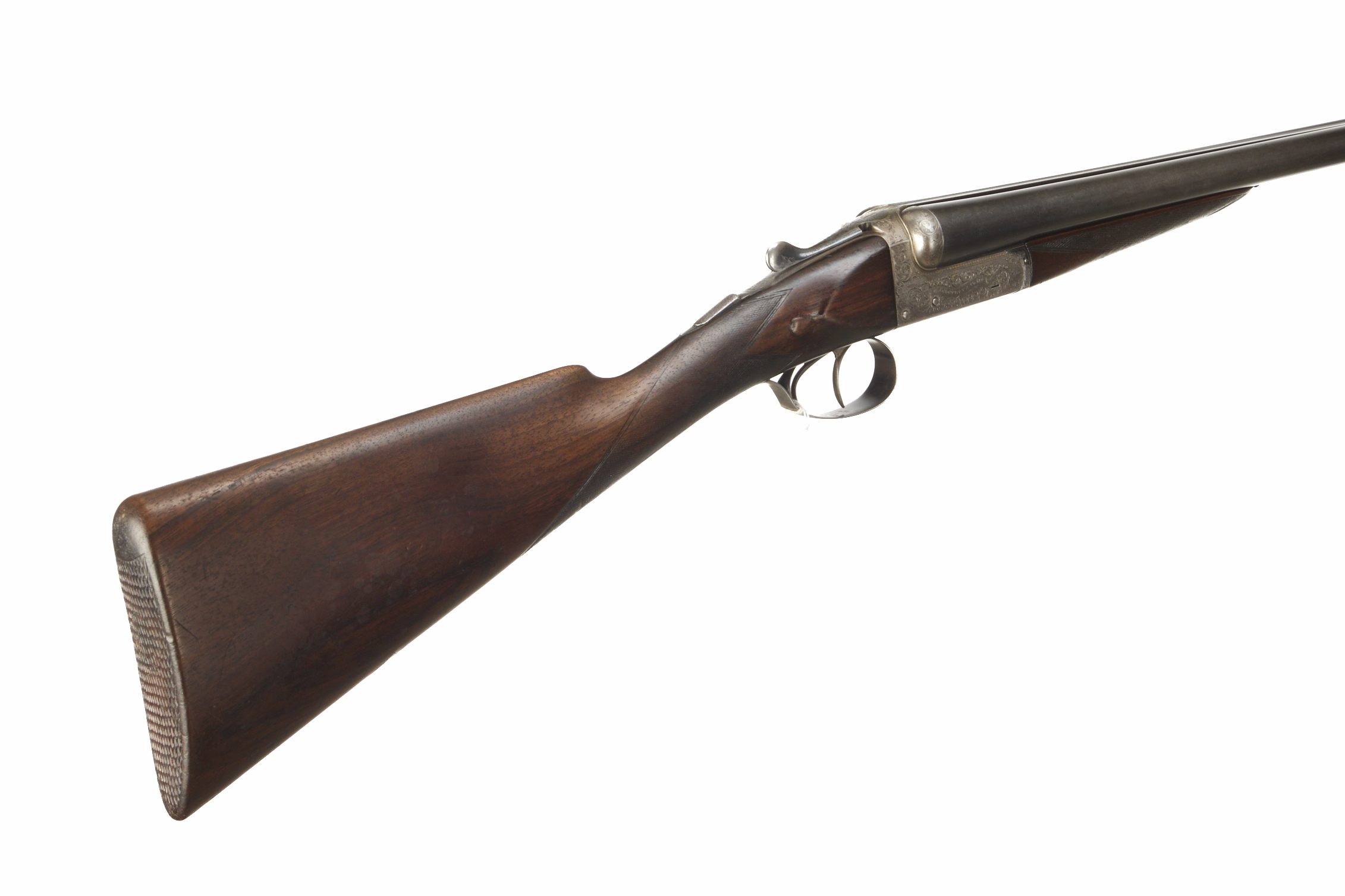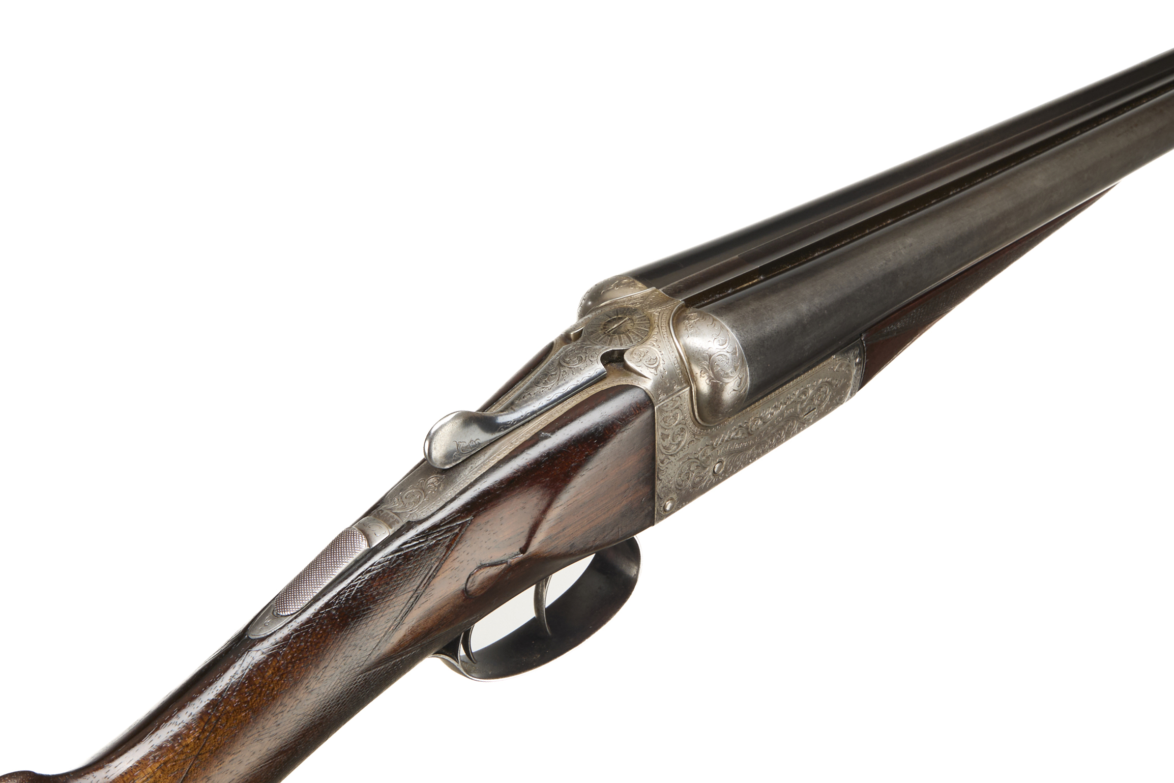 Chequered butt, straight grip and forend. Concave rib engraved ‘W. J. JEFFERY etc (worn)’. Top lever, automatic safety with ‘SAFE’ inlaid in gold. The action engraved with acanthus scrolling and ‘W.J. JEFFERY & CO LTD’ mounted on scrolls. Ca 1930s to 50s.