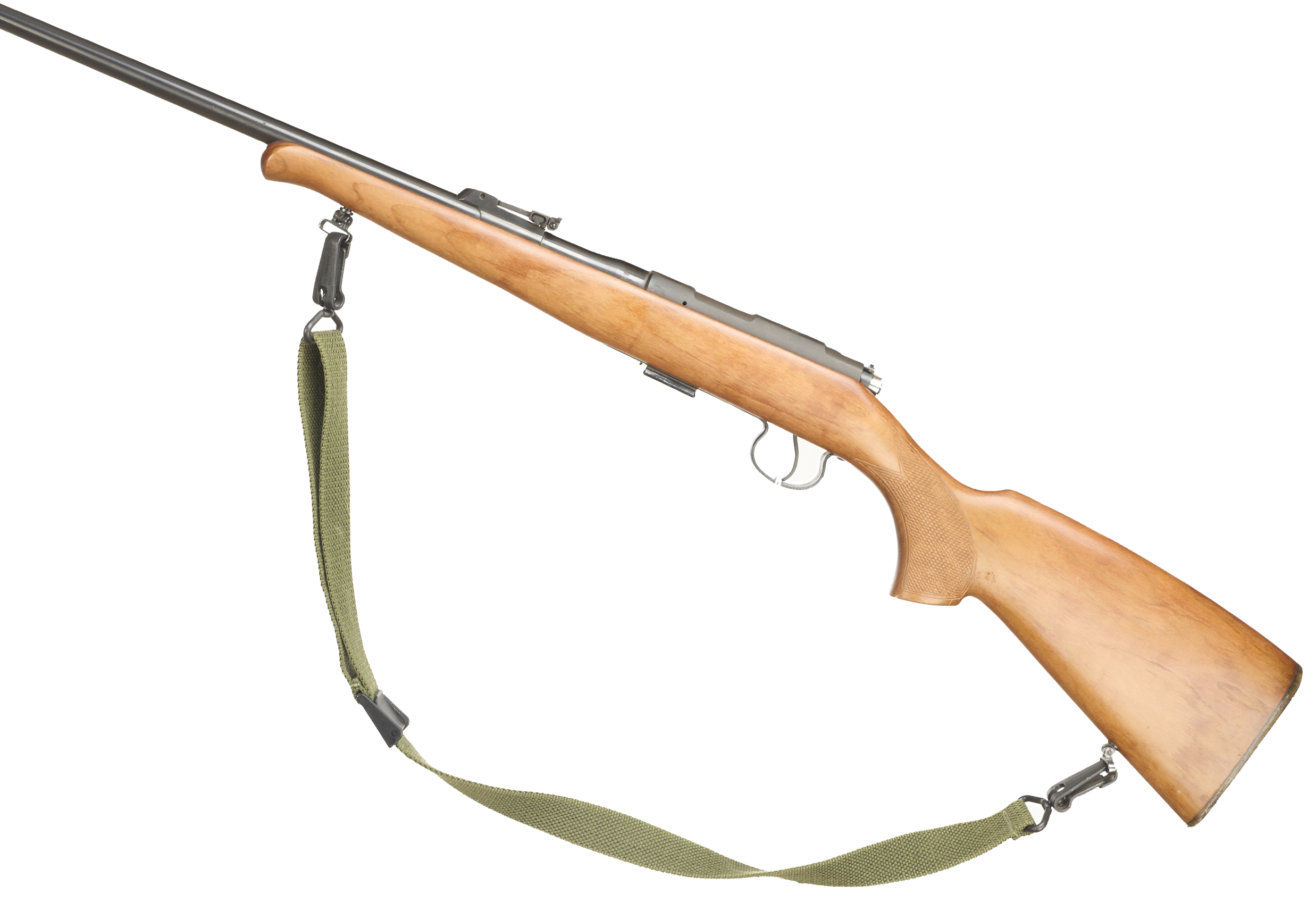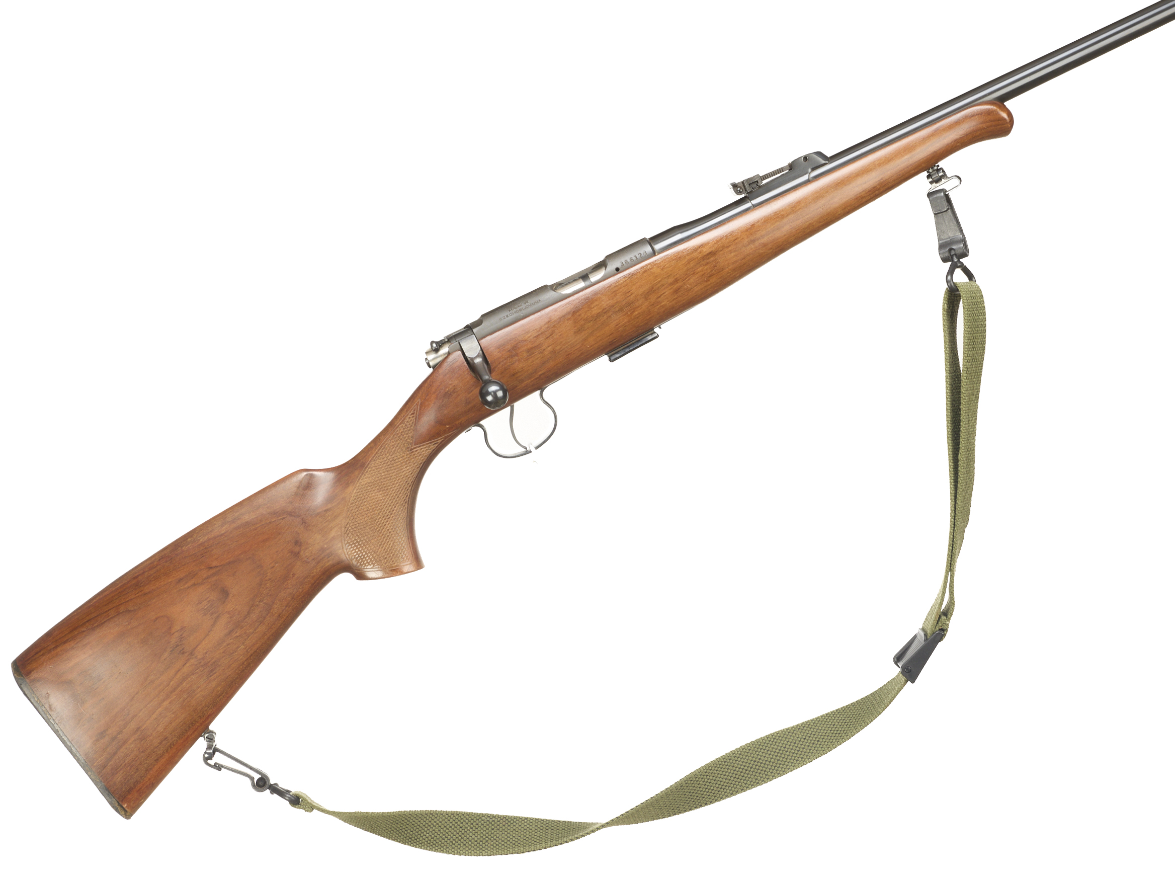 Chequered butt plate and semi-pistol grip, Schnabel forend. Sling mounts and canvas sling. Post foresight, ramp rearsight. Detachable magazine, safety.