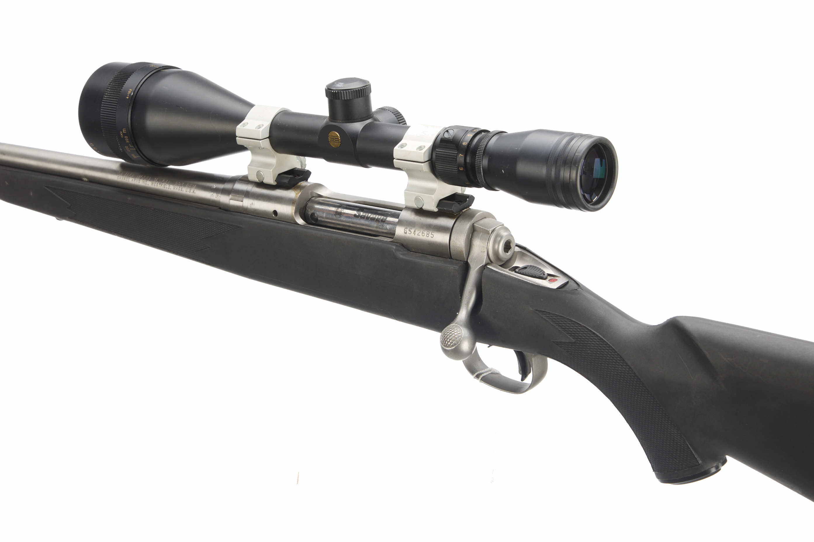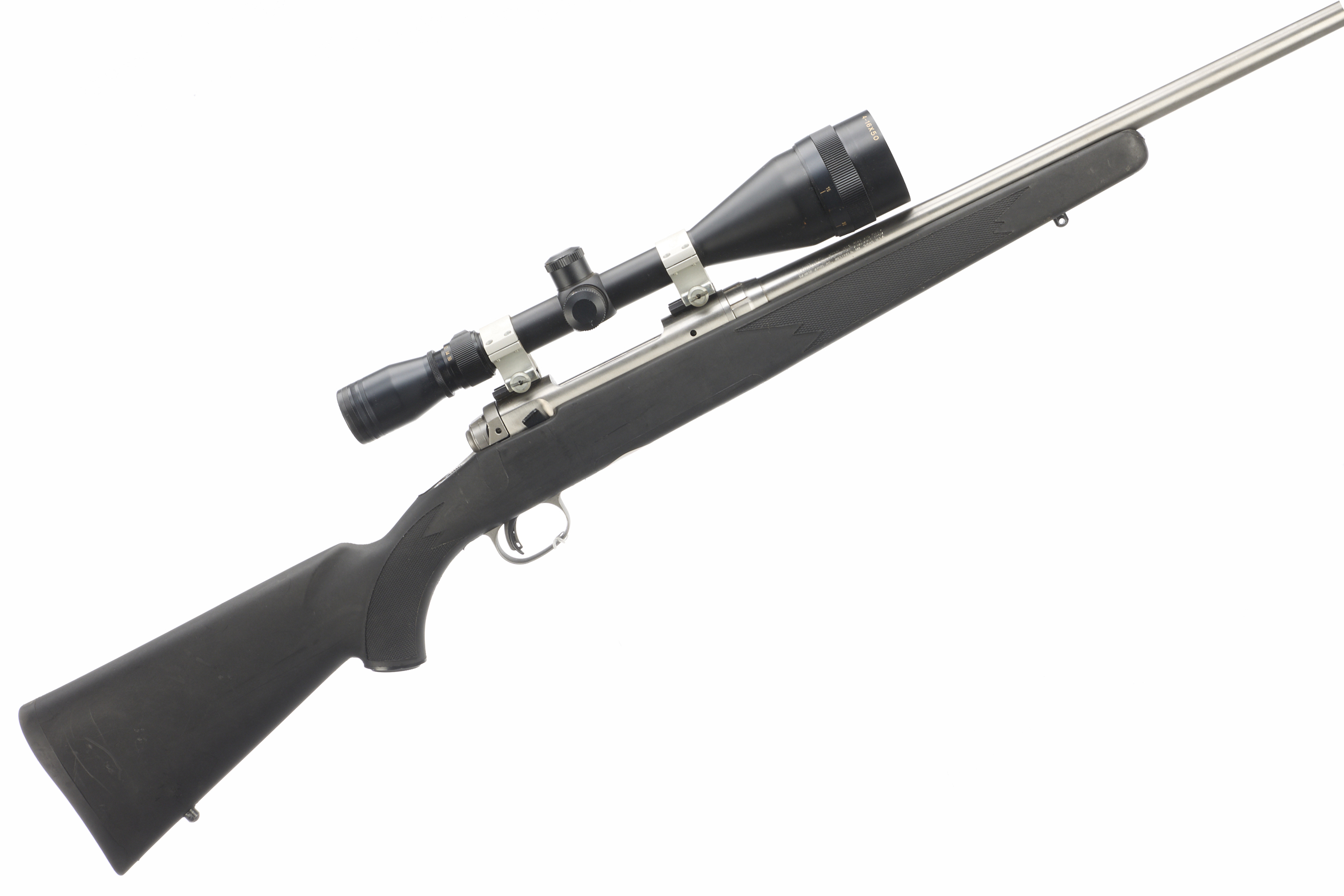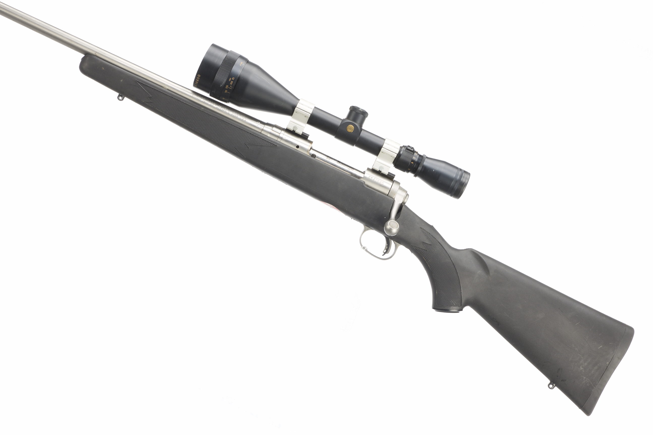 Cushioned butt, semi-pistol grip, rounded forend. Sling attachments. Threaded muzzle, unsighted barrel. Internal magazine. Edgar Bros 4 – 16 x 50 scope.