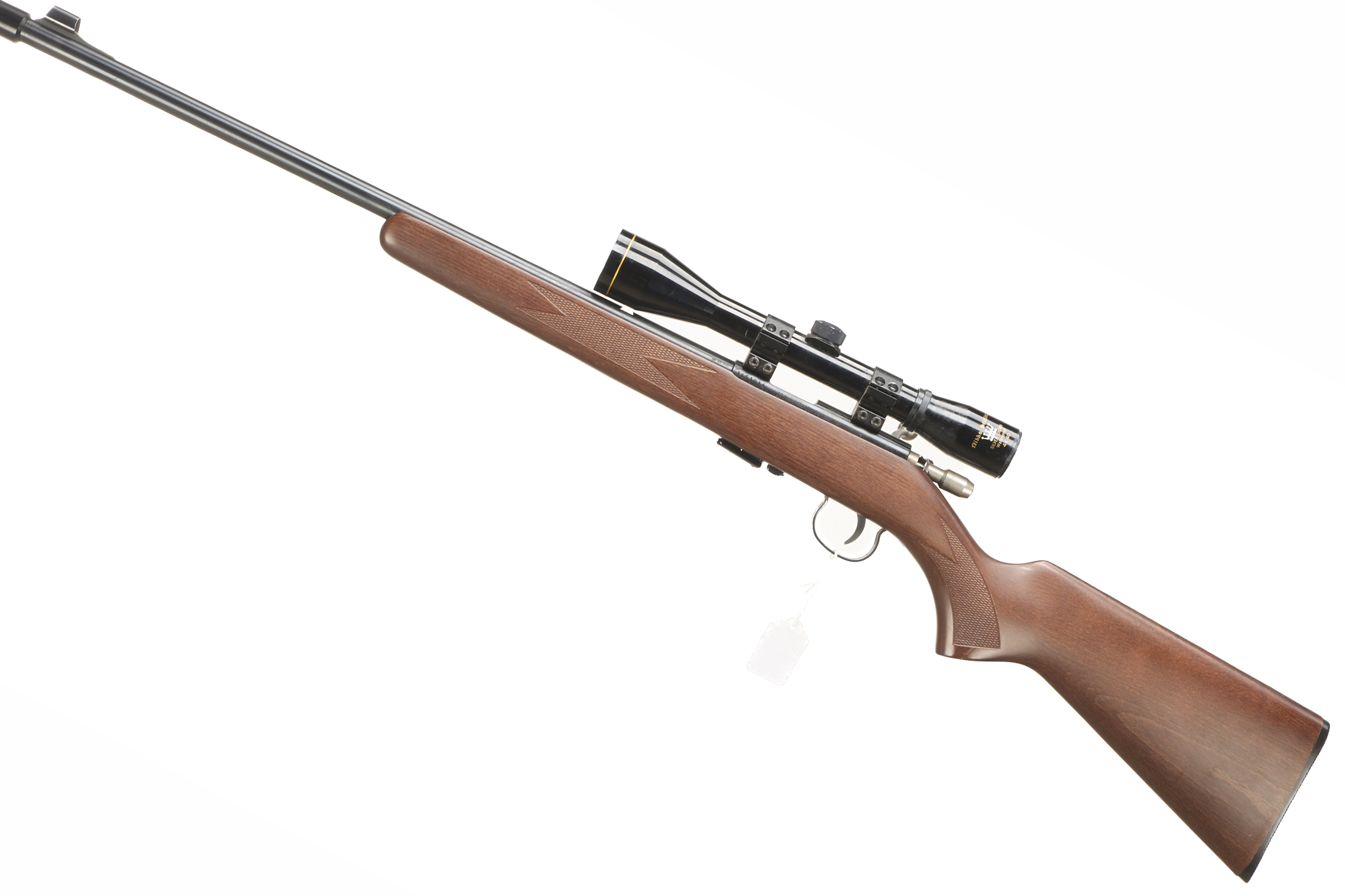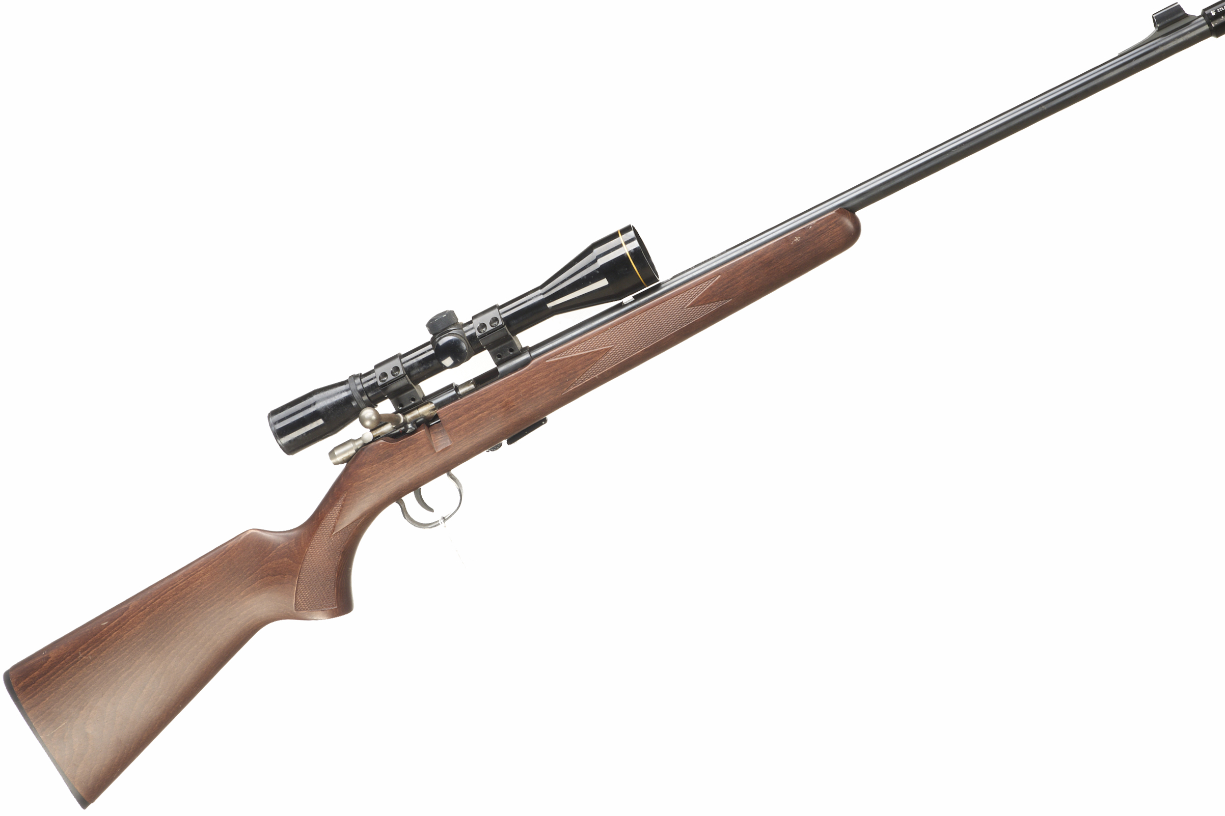 Chequered butt plate and semi-pistol grip, rounded forend. Screwcut with sound moderator, Detachable magazine.