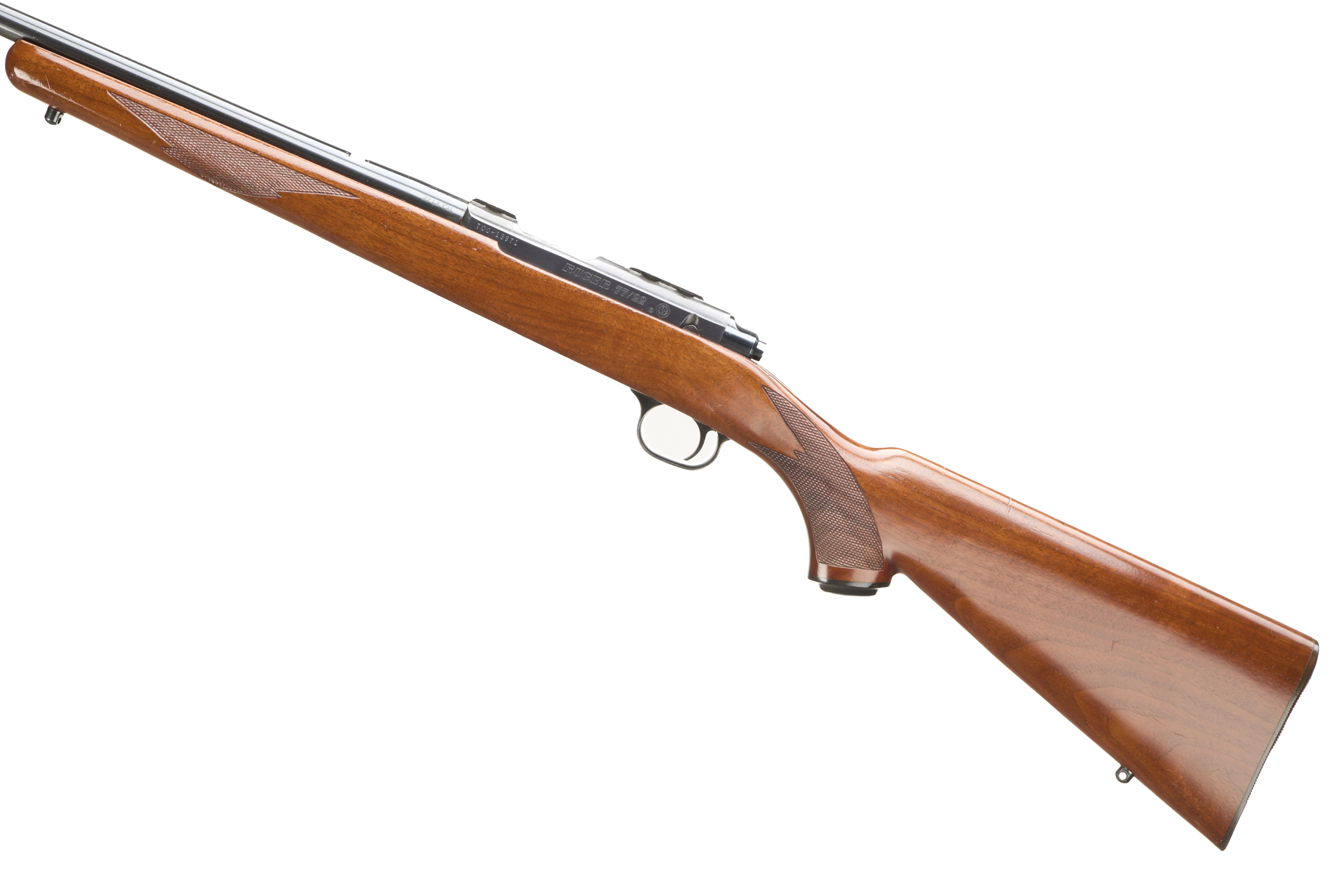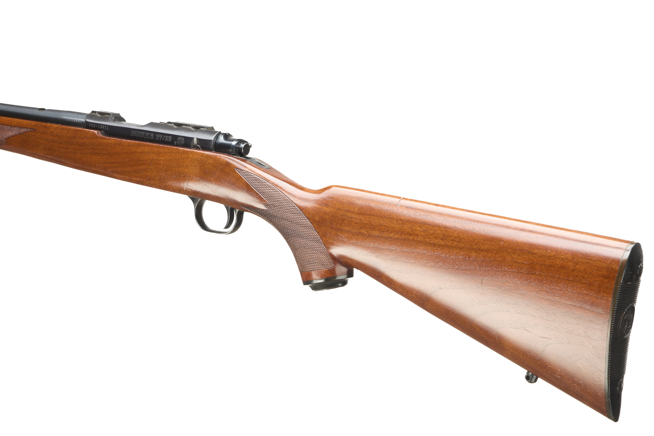 Ribbed, hard, rubber butt, chequered pistol grip and forend. Screwcut, Detachable magazine.