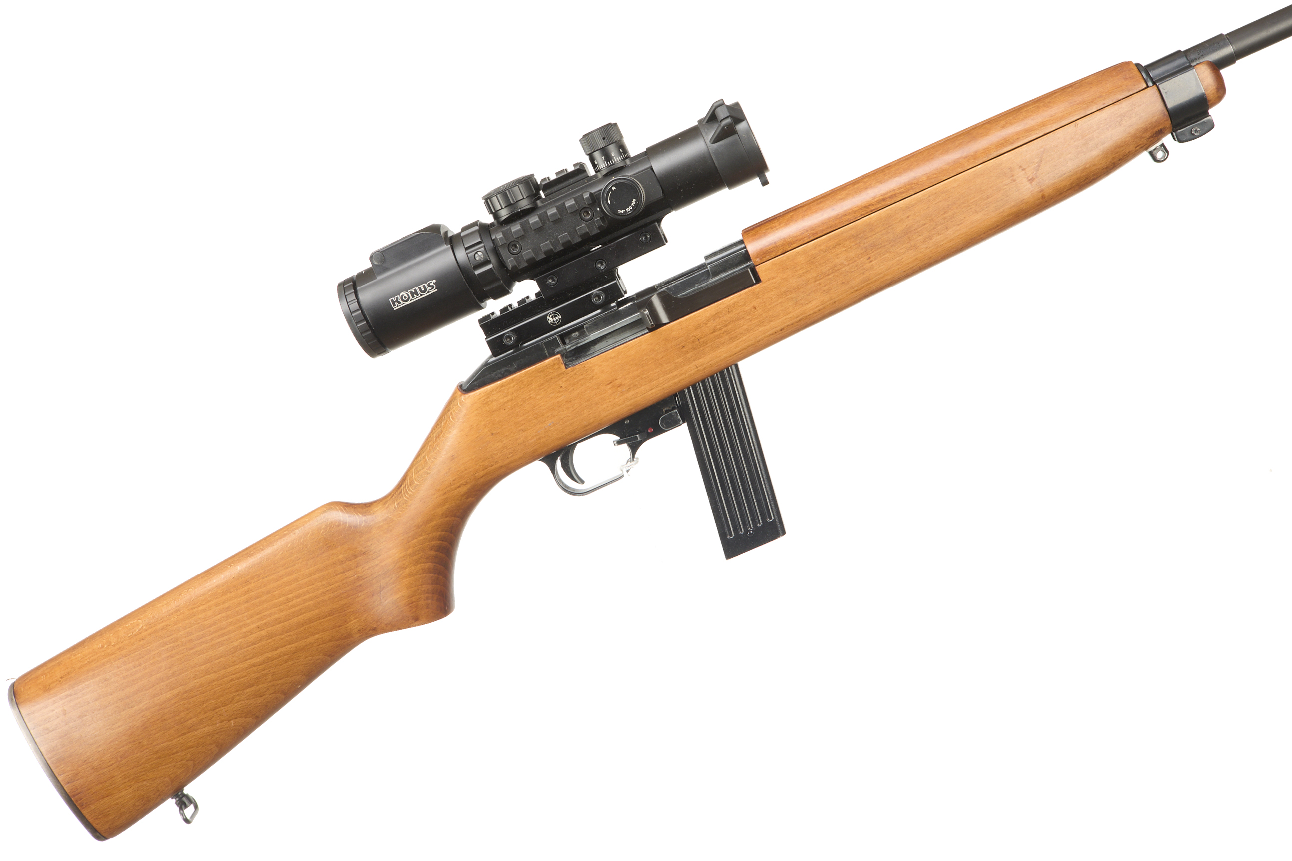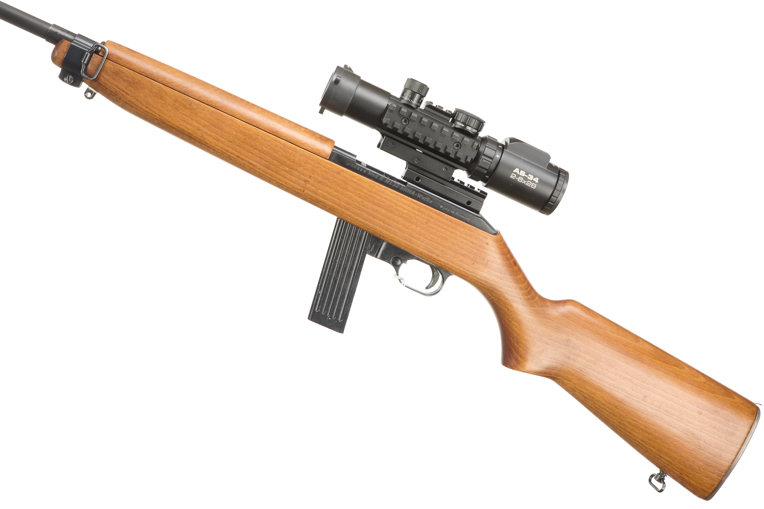 Metal butt plate and semi-pistol grip, fully formed. Plain muzzle, foresight, rearsight. Detachable magazine.