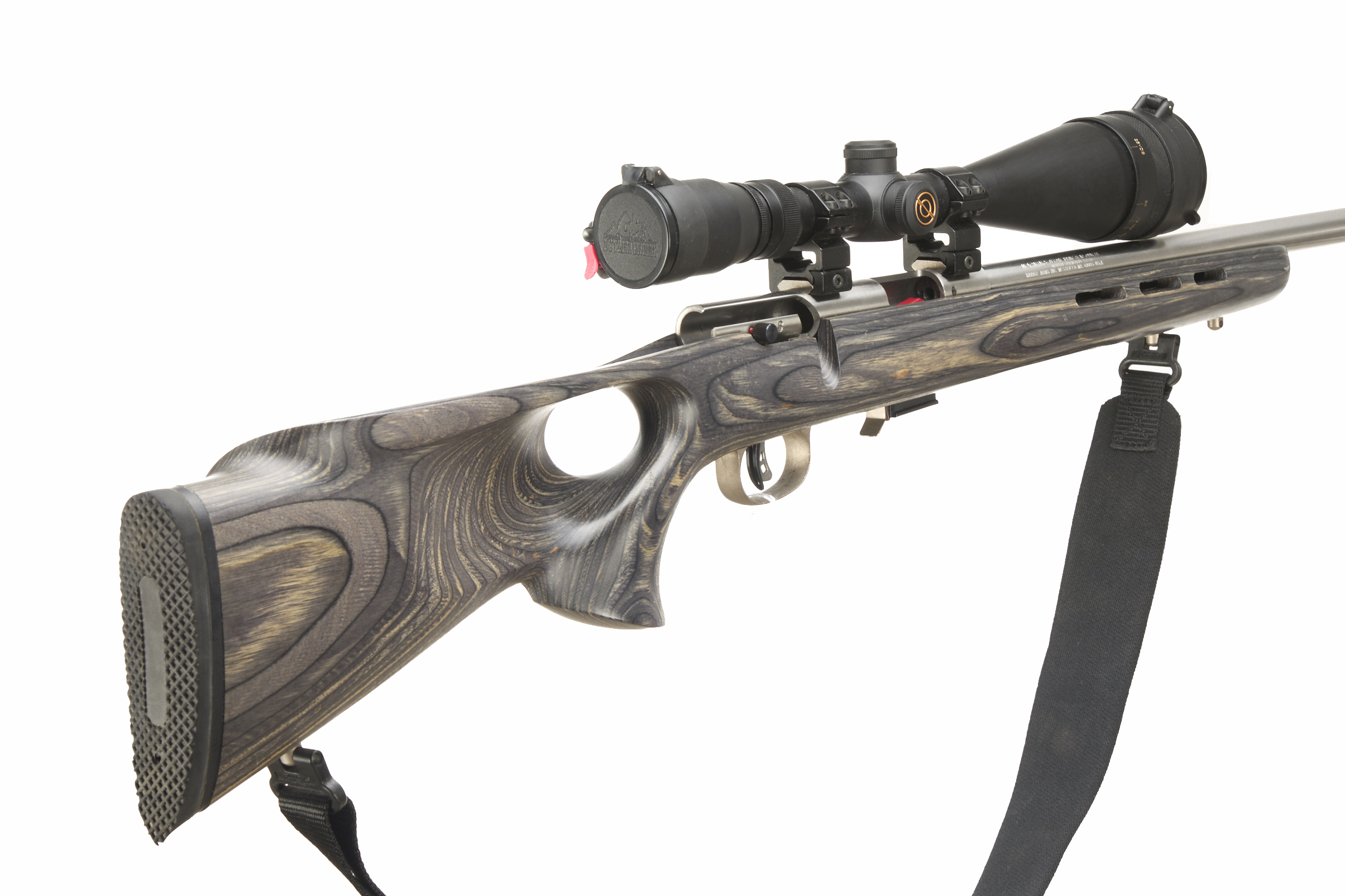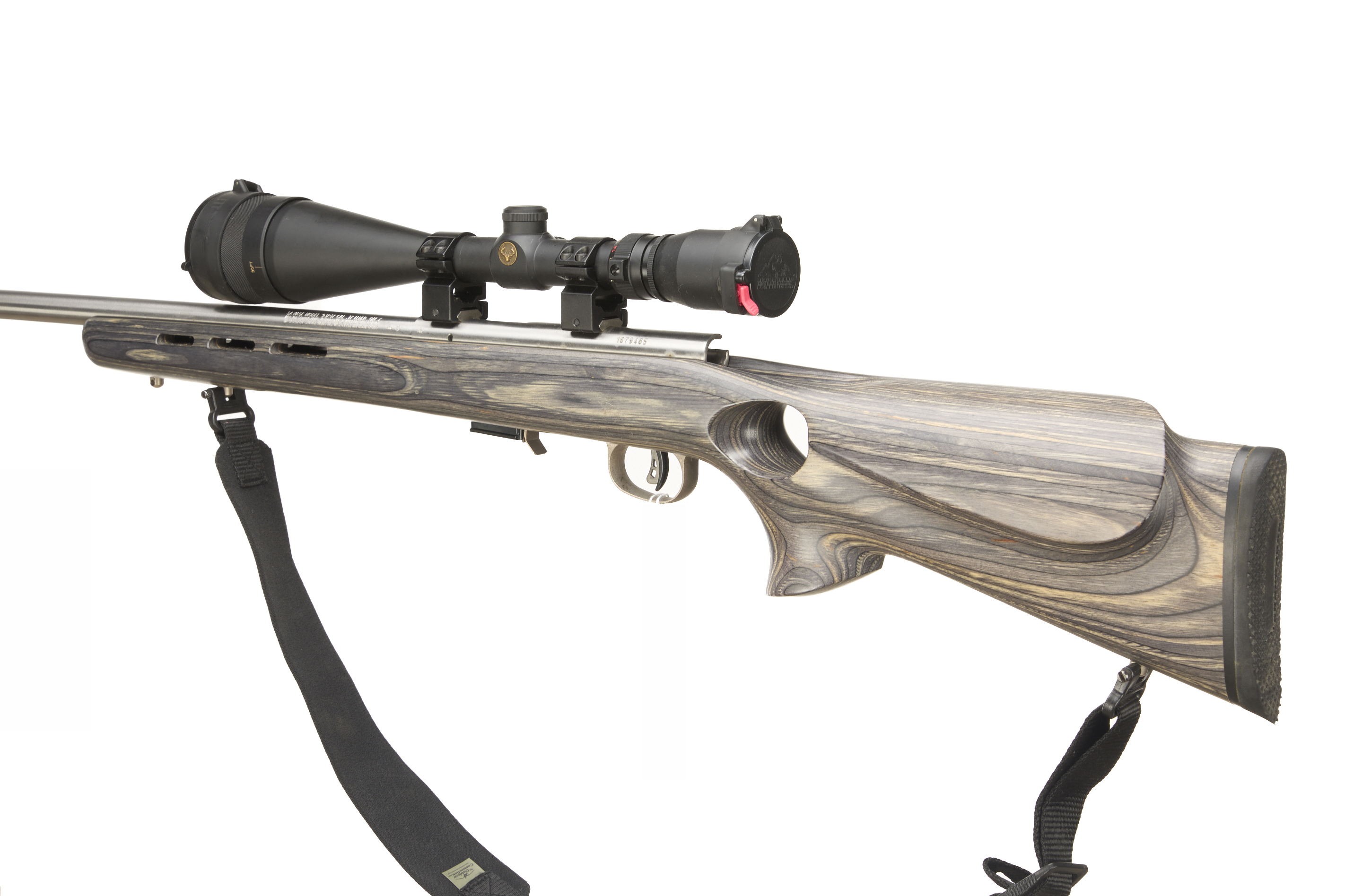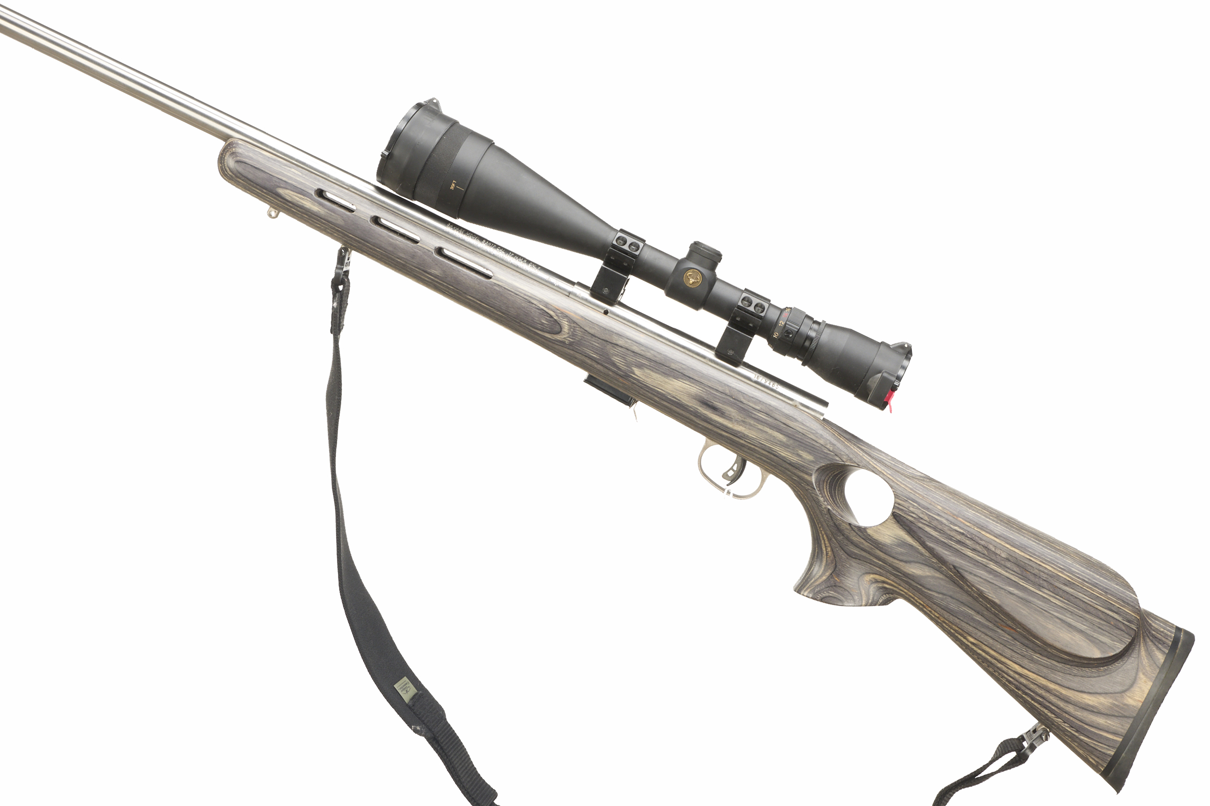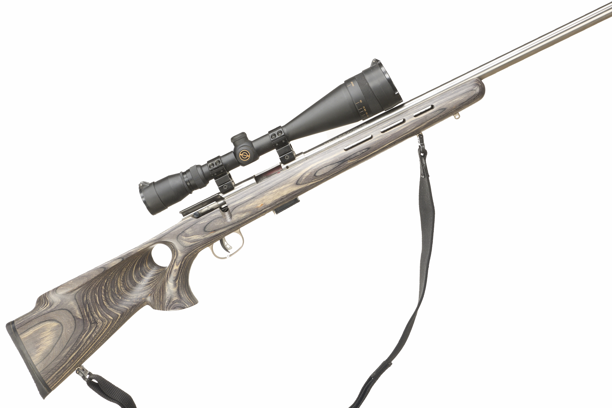Chequered butt plate and semi-pistol grip, laminated thumbhole stock, rounded forend. Screwcut with sound moderator, Detachable magazine. Sling studs and nylon sling, 25mm scope mounts with scope.