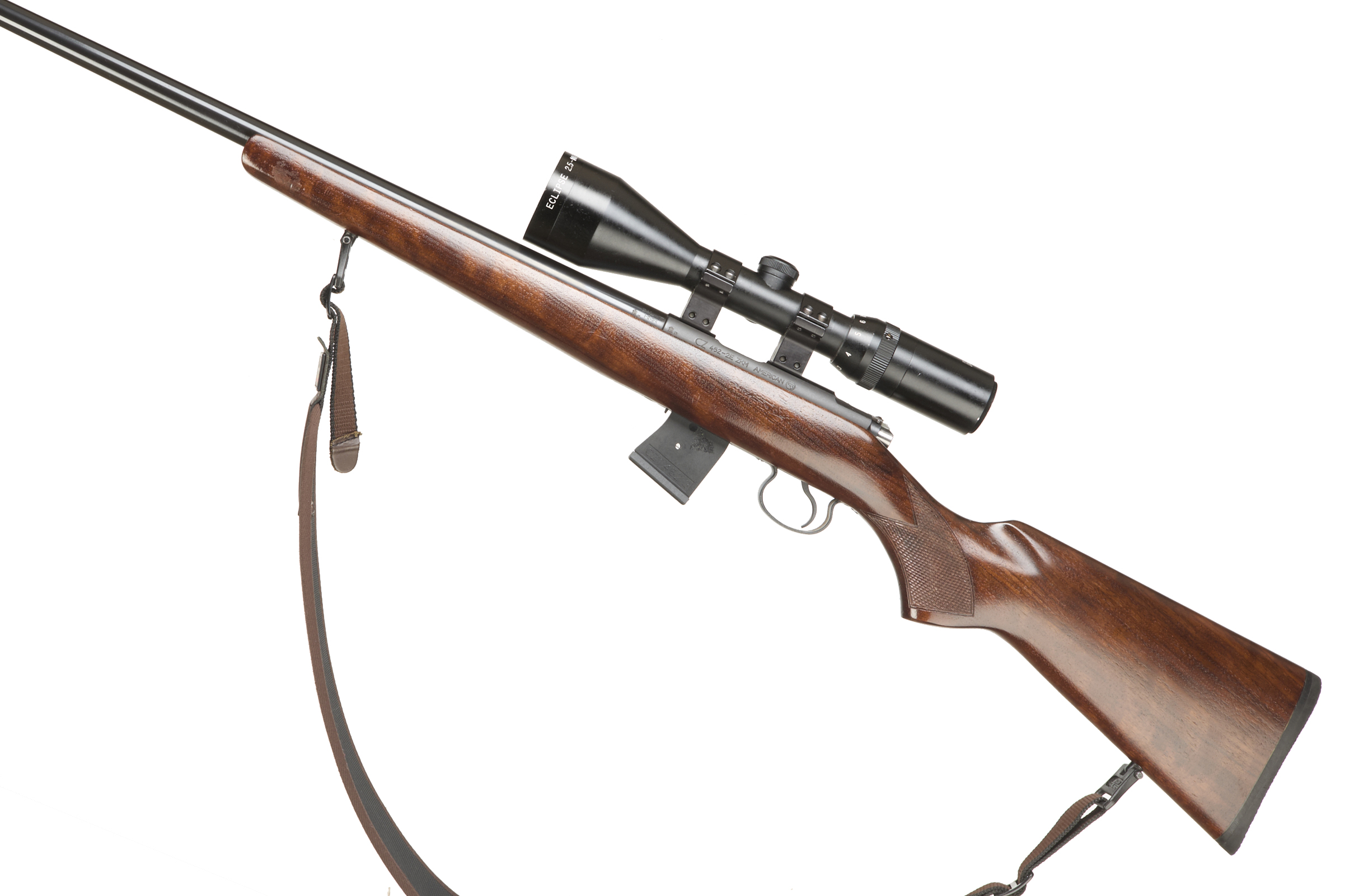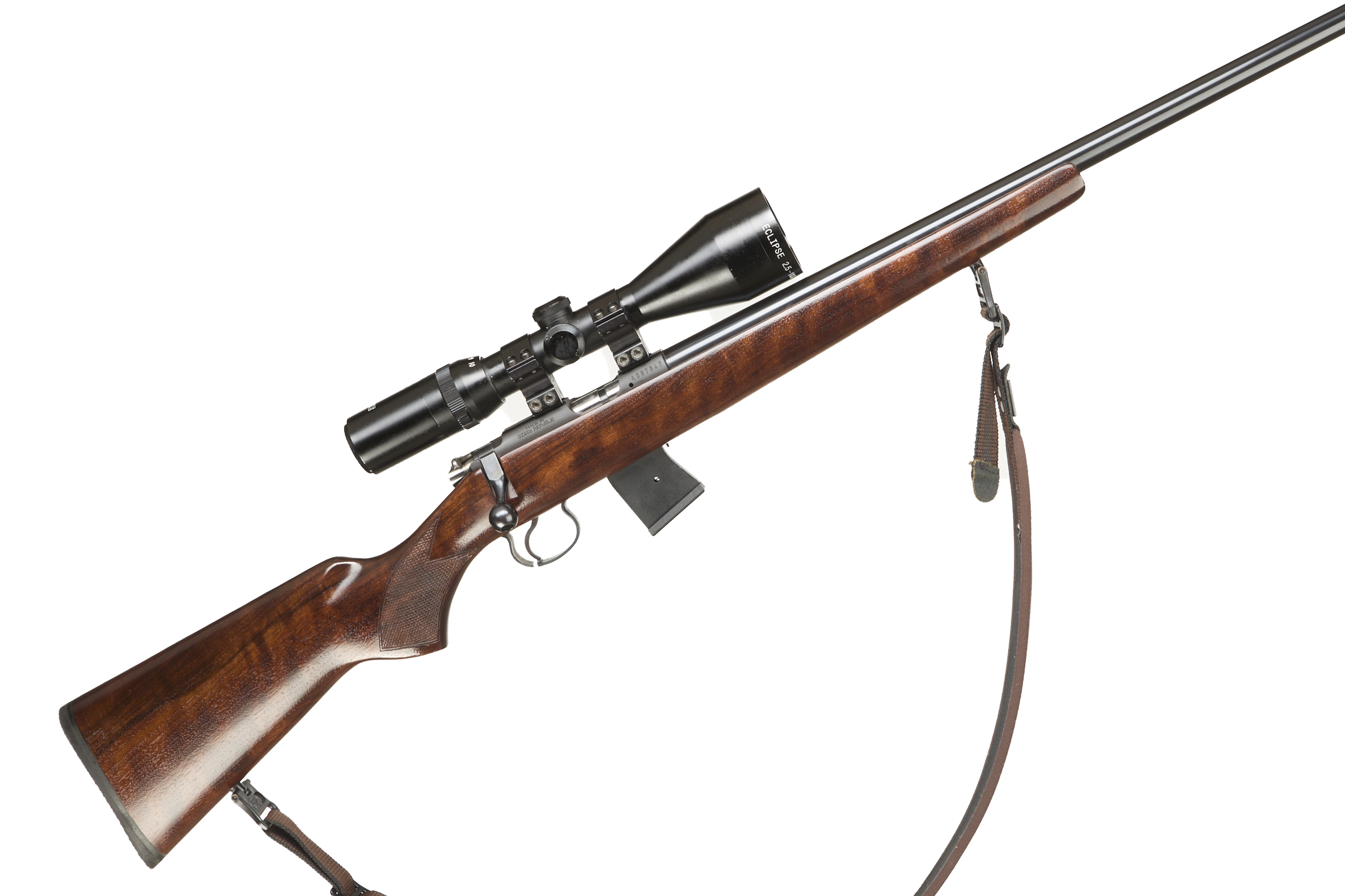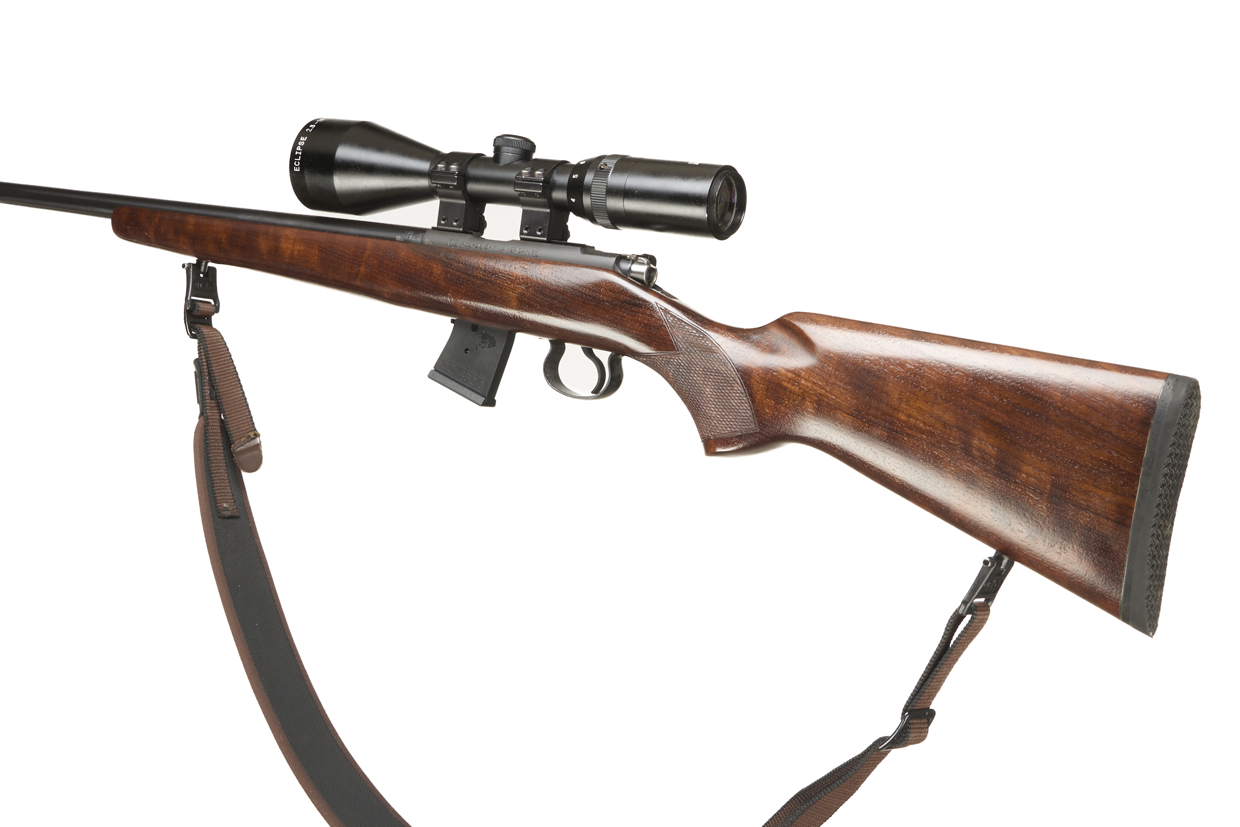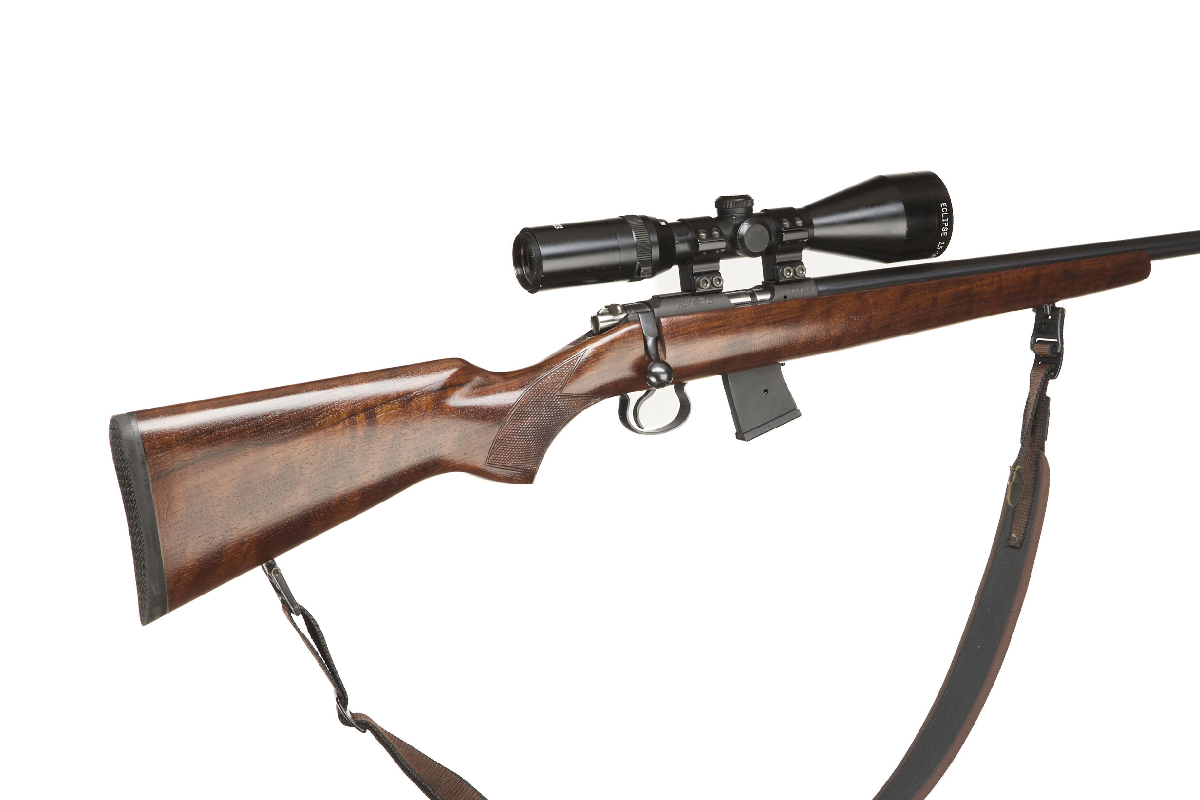 Soft rubber butt pad, walnut stock, chequered semi-pistol grip with palm swell, front and rear sling mounts. Main body with dovetail scope rail. CW Moderator and Hawk 2.5-10 x 56 scope and 10 round detachable magazine.