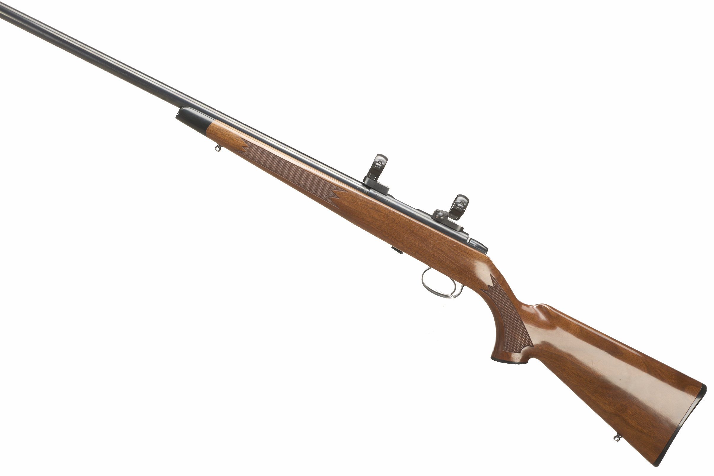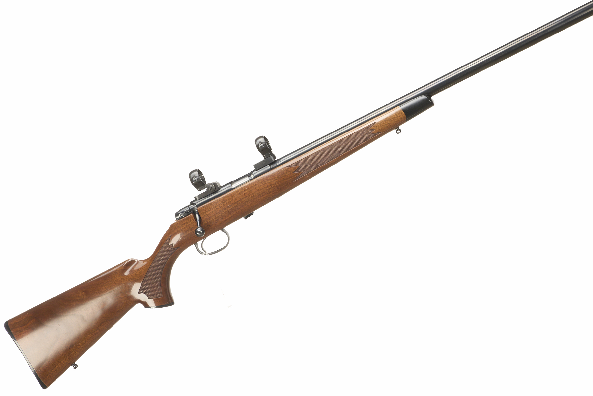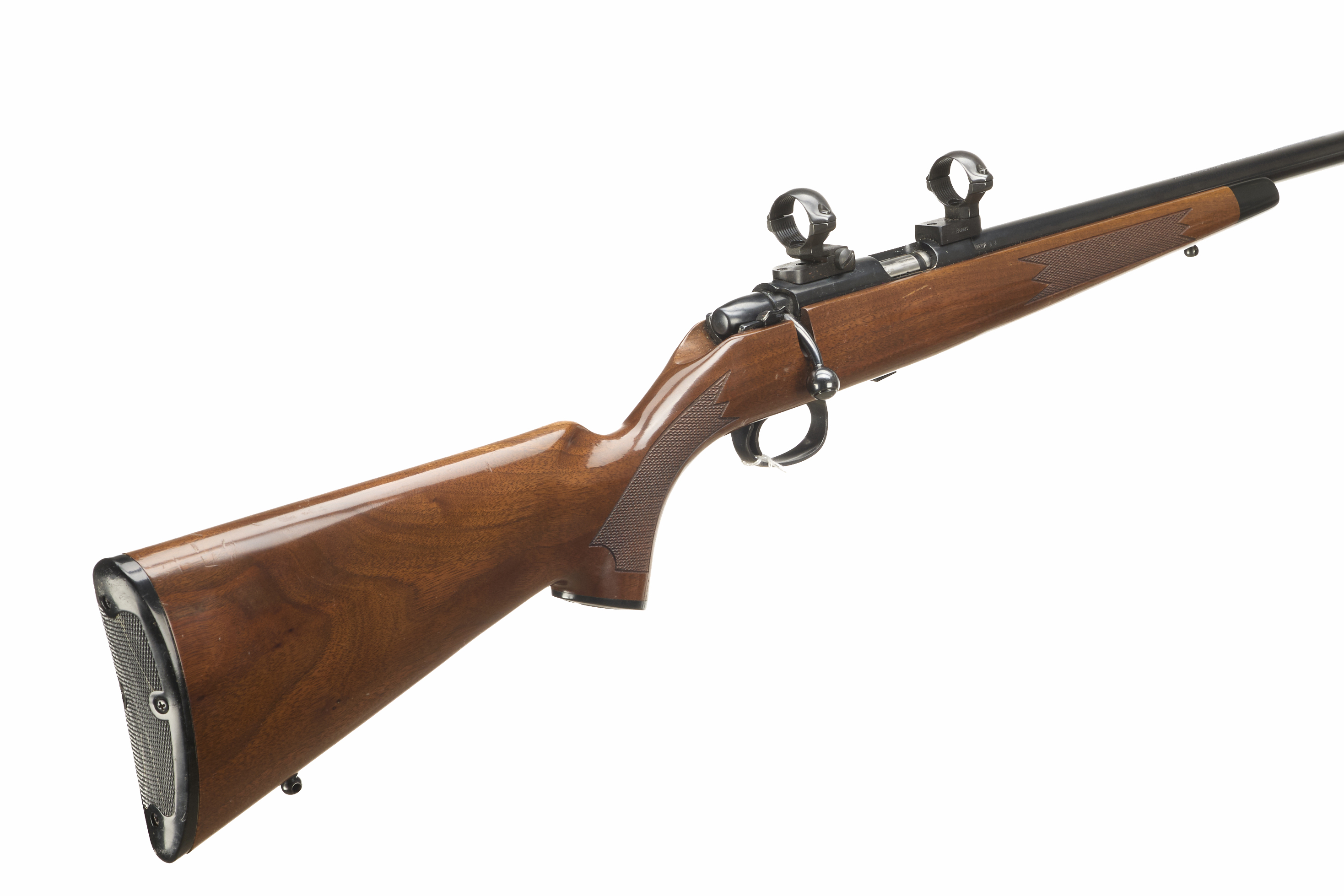 Chequered butt plate and semi-pistol grip, rounded rosewood forend. Screwcut with sound moderator. 25mm scope rings.