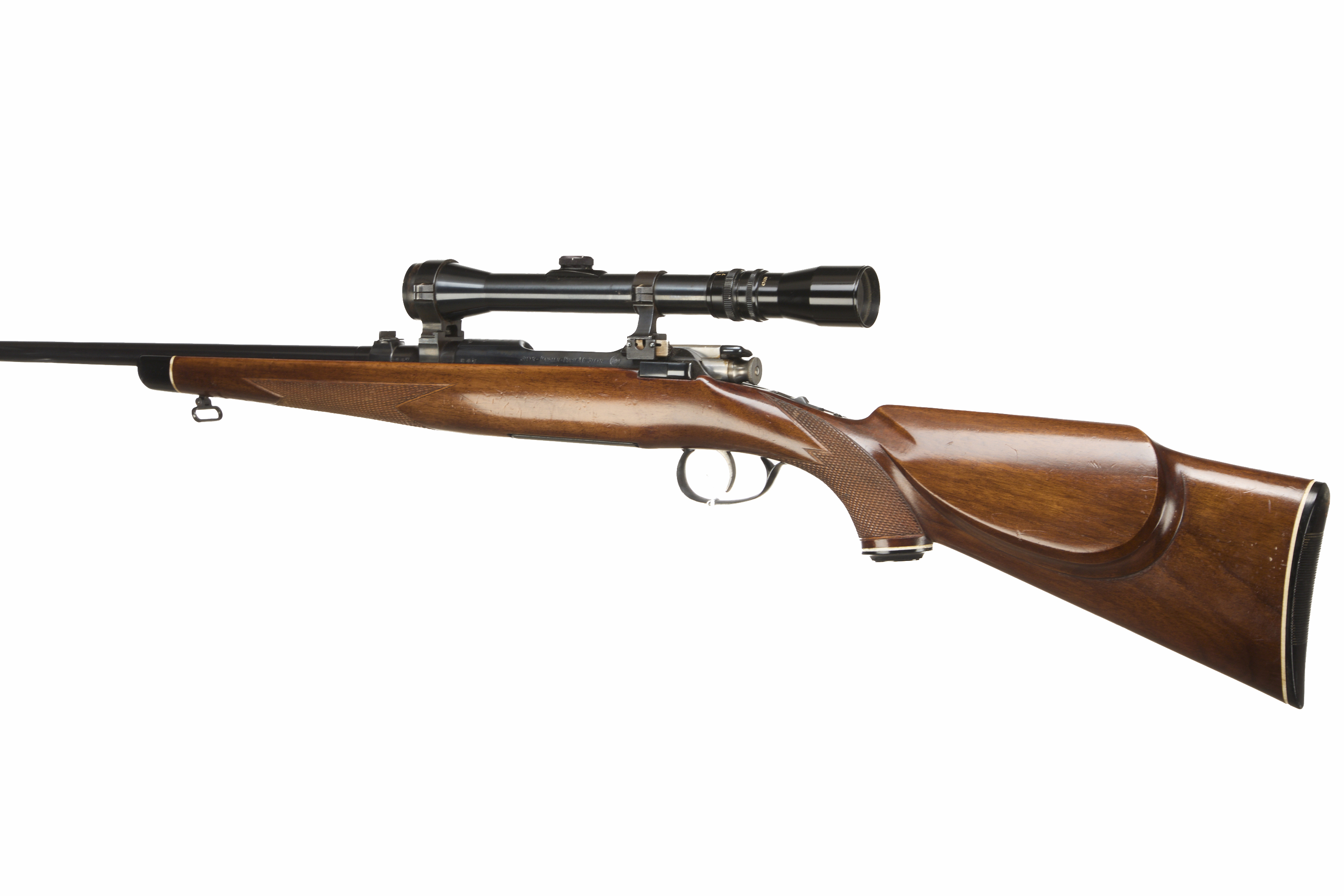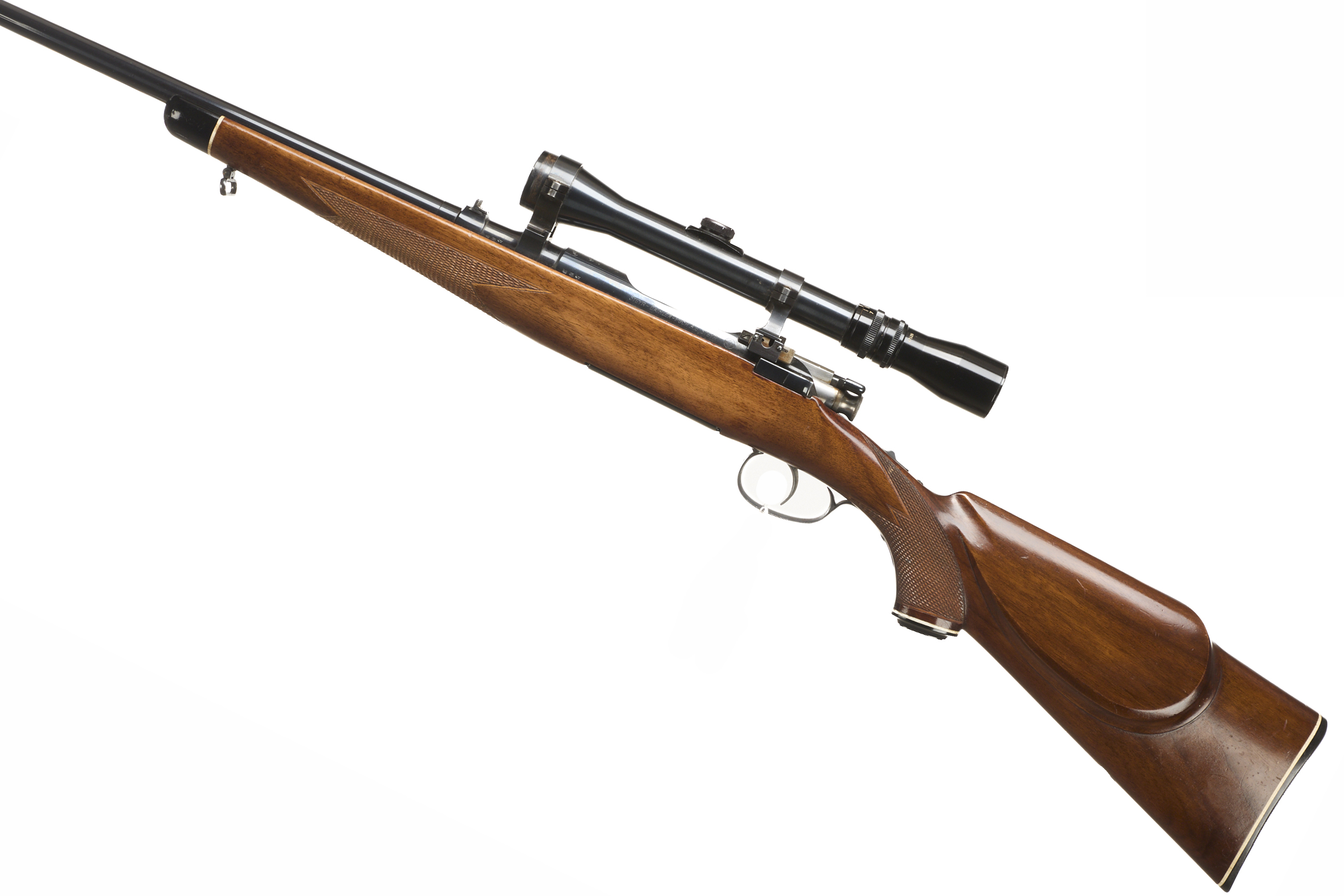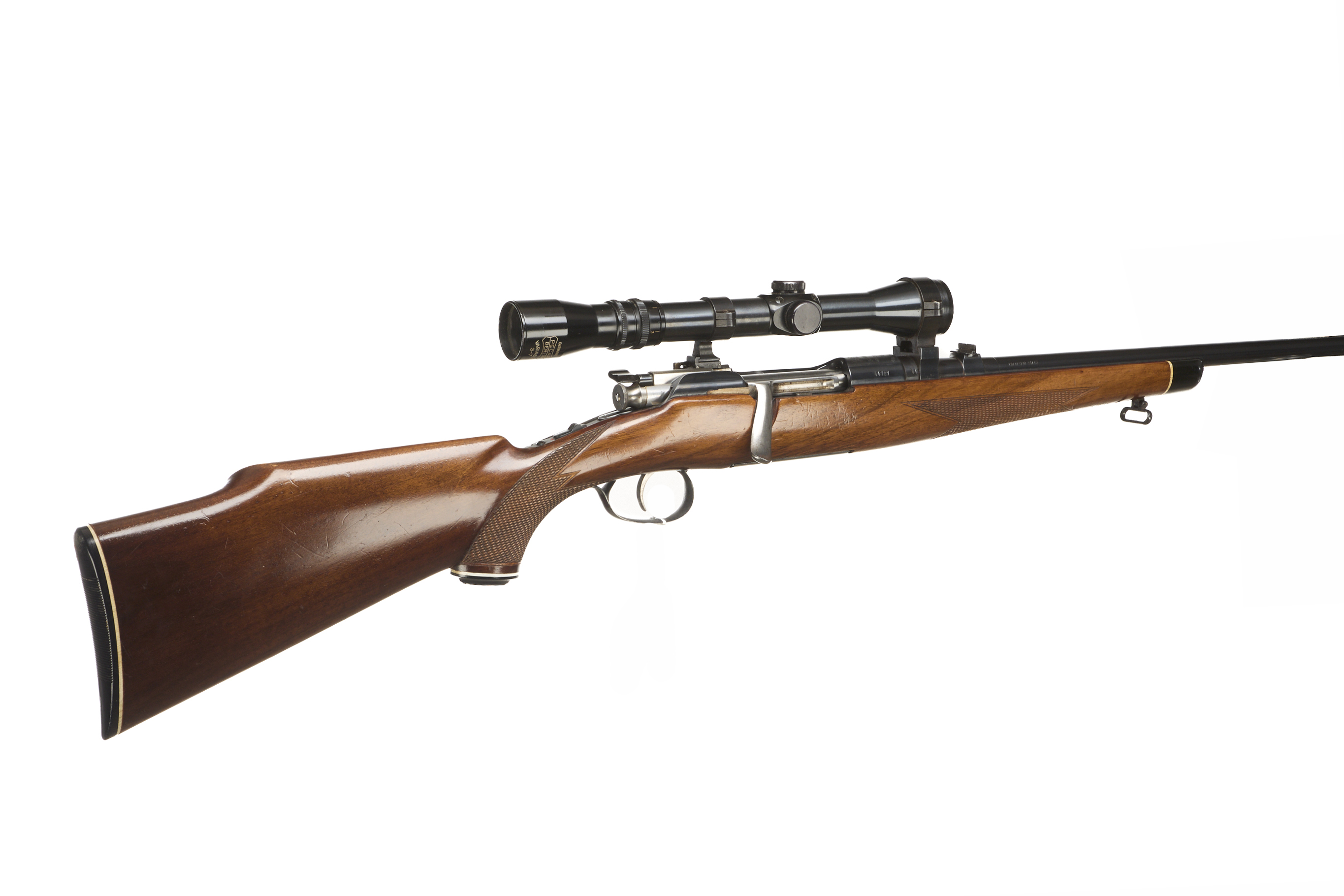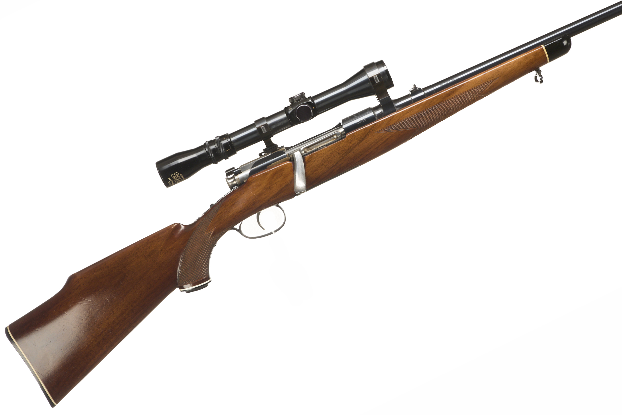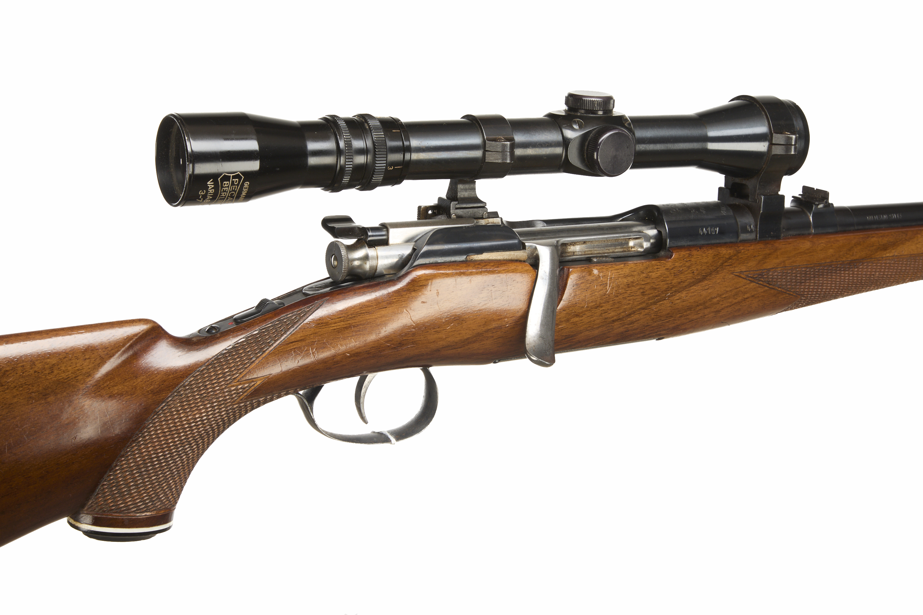 Chequered butt stock, semi-pistol grip, rounded forend. Plain muzzle, sighted barrel. Rotary internal magazine.