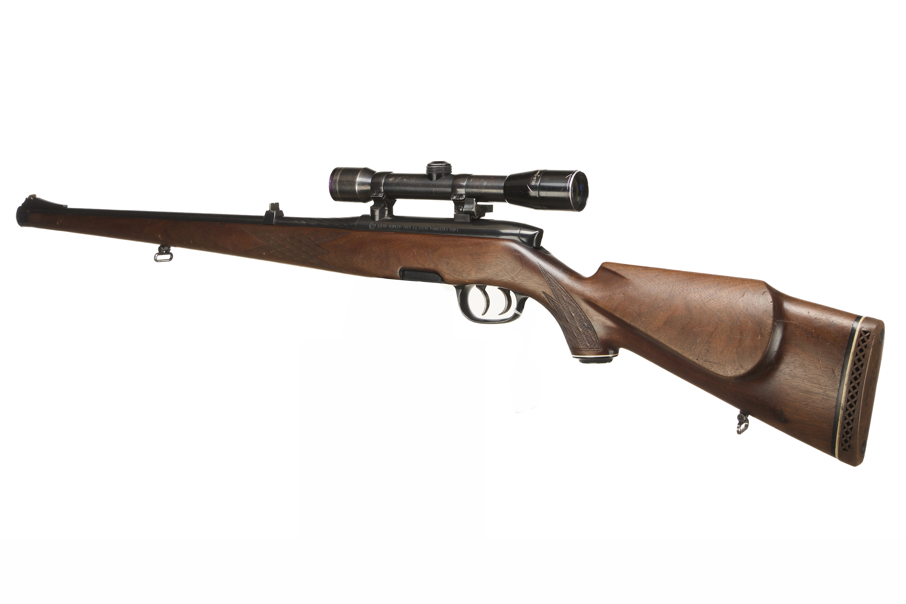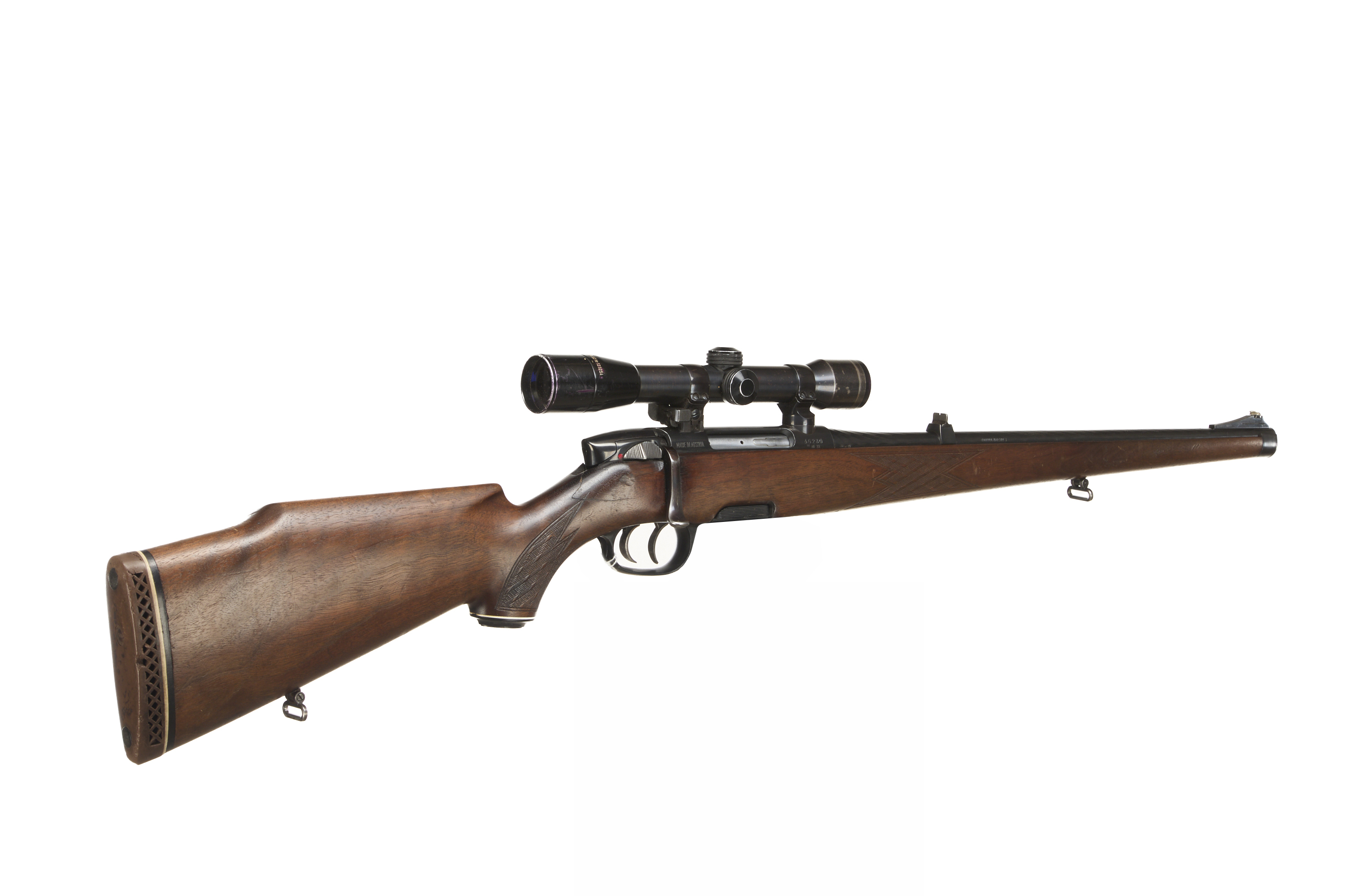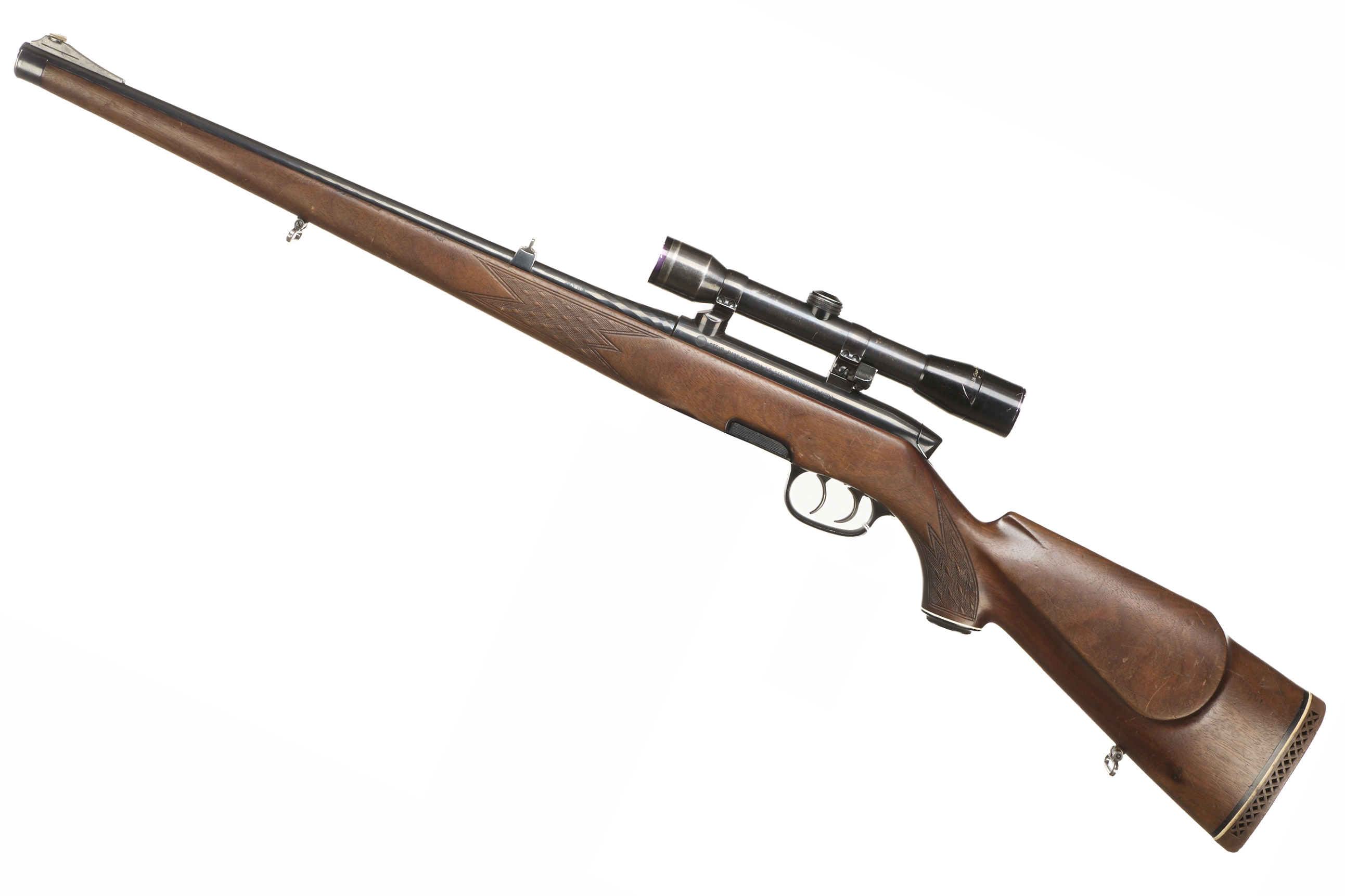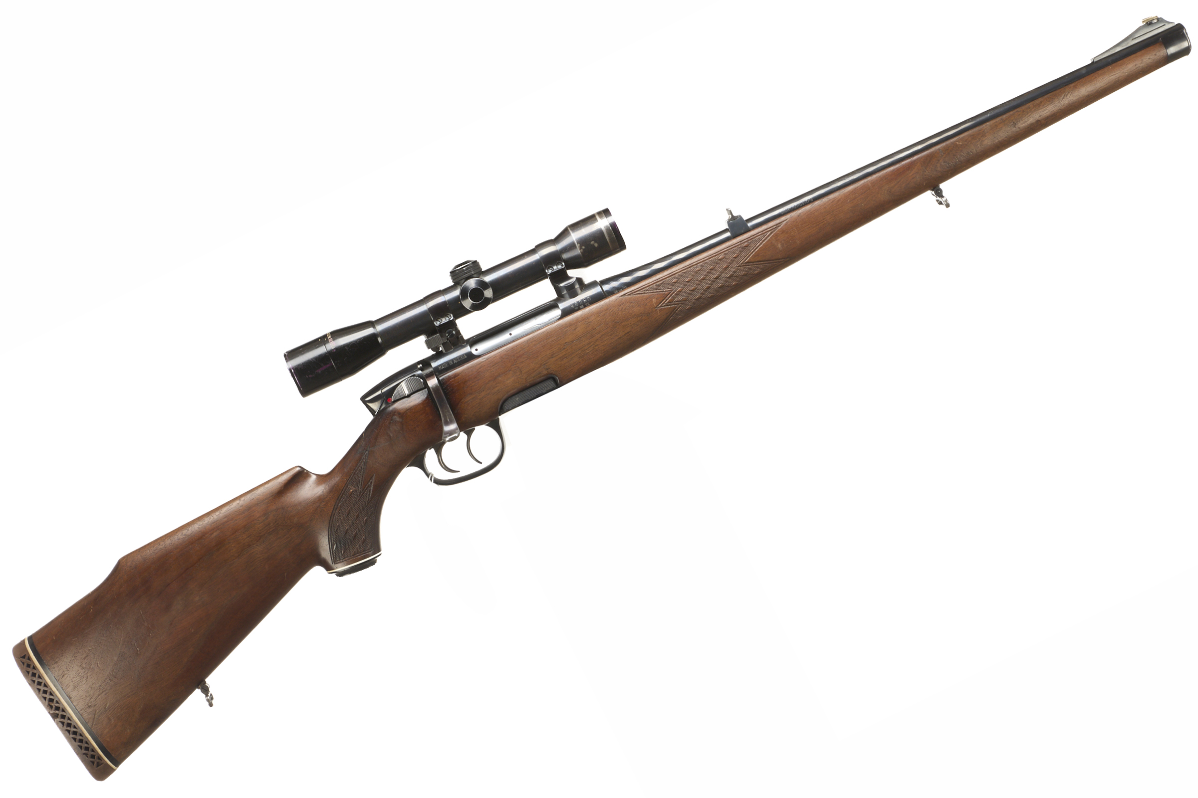 Ventilated butt, raised cheek piece, chequered semi-pistol grip with ebonite end cap, and Stutzen forend. Sling attachments. Set triggers. Plain muzzle, original rear and foresights on fluted barrel. Detachable magazine.