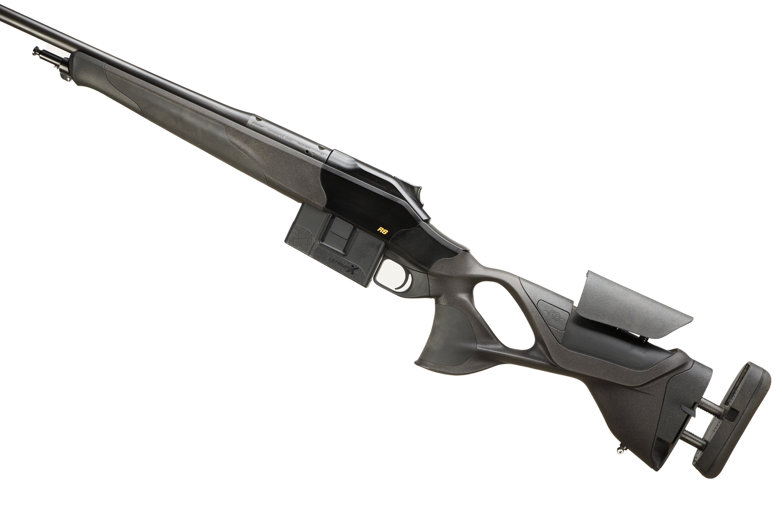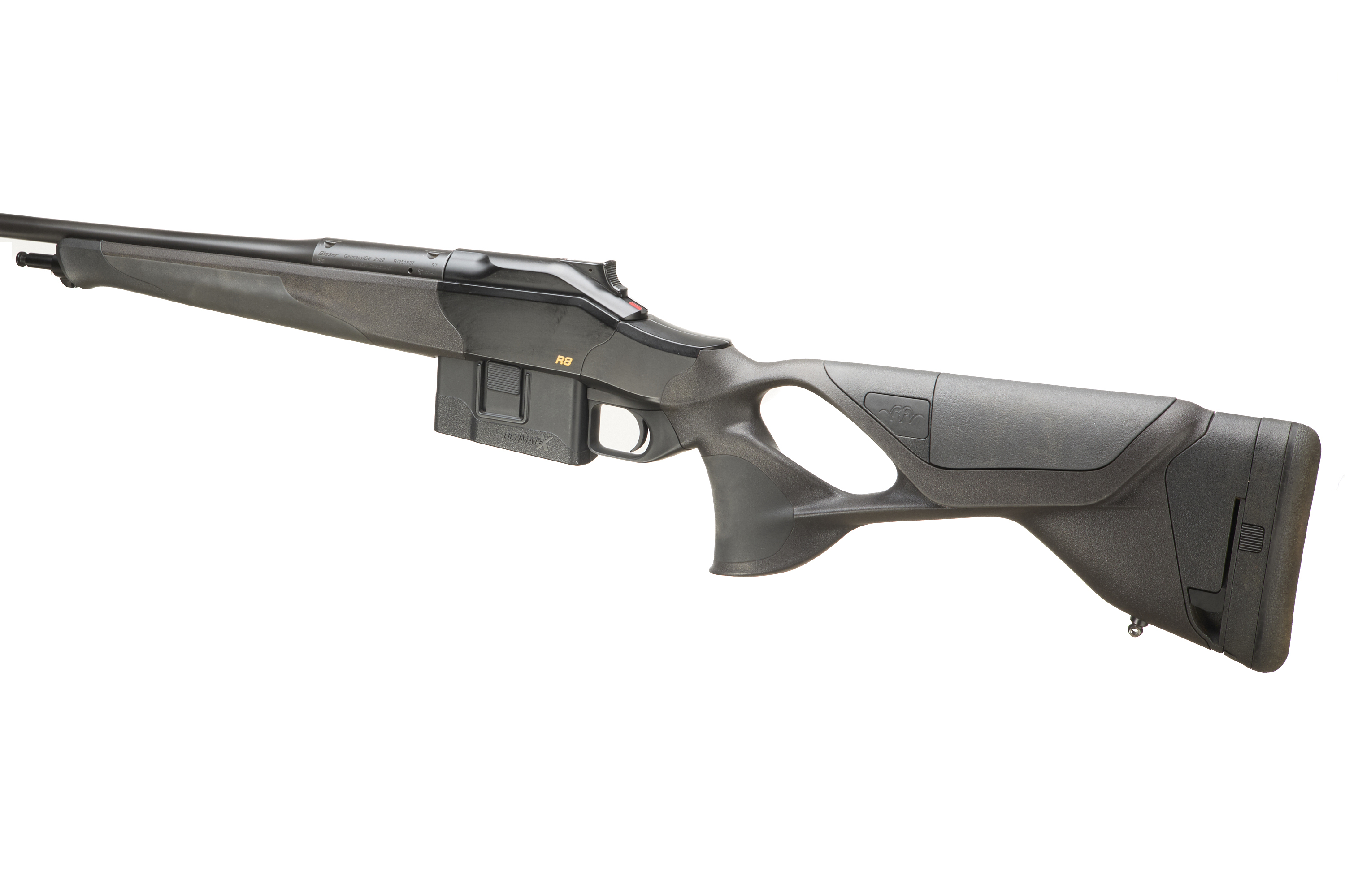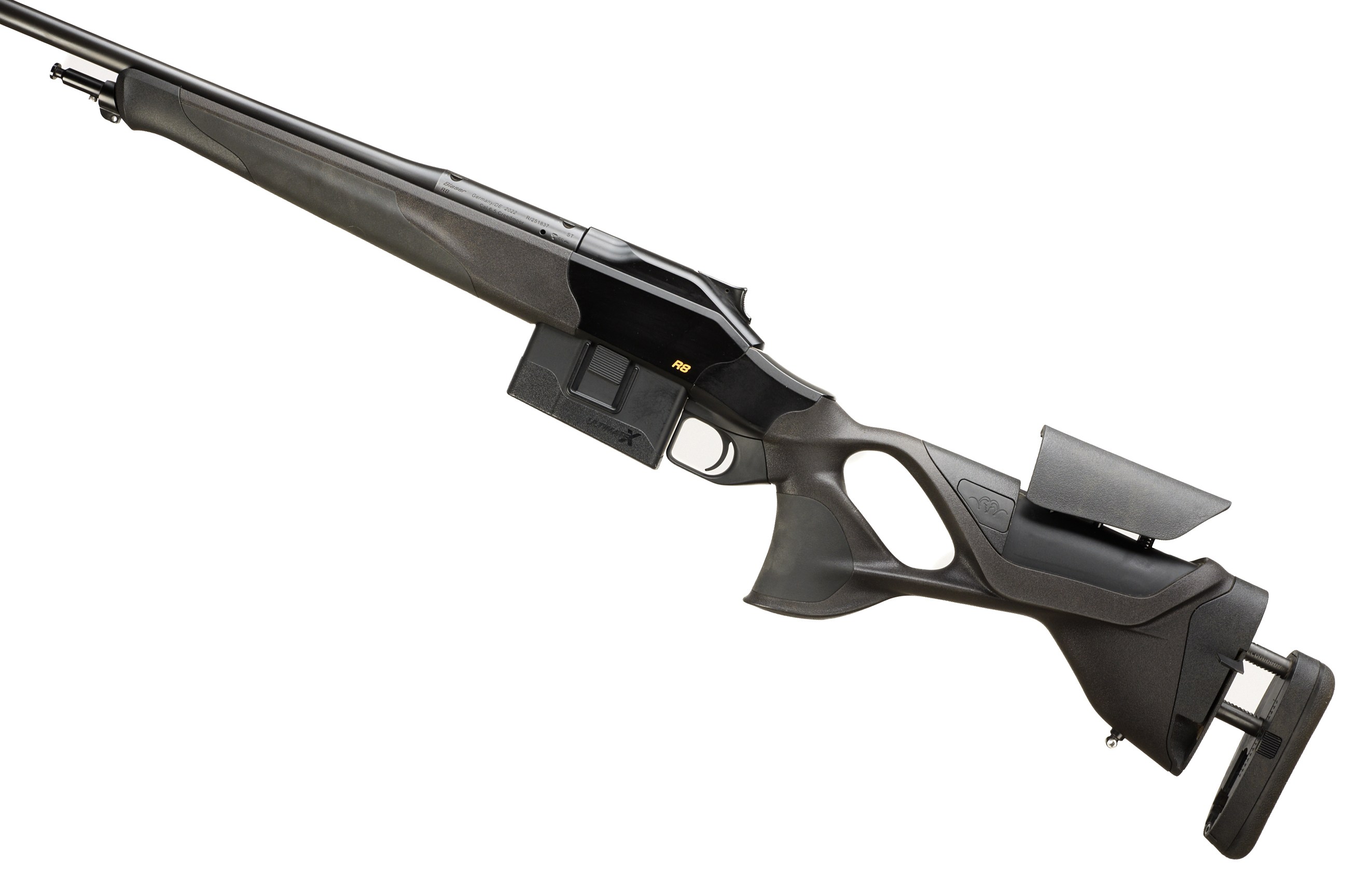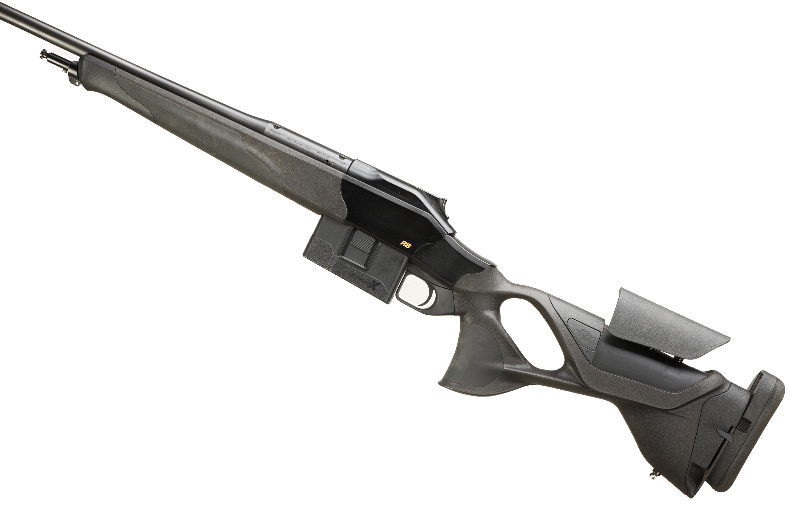 Cushioned extendable butt, Synthetic stock, adjustable cheek comb. semi-pistol grip, Schnabel forend. Sling attachments. Screw cut muzzle, unsighted barrel. Bipod attachment. detachable magazine.