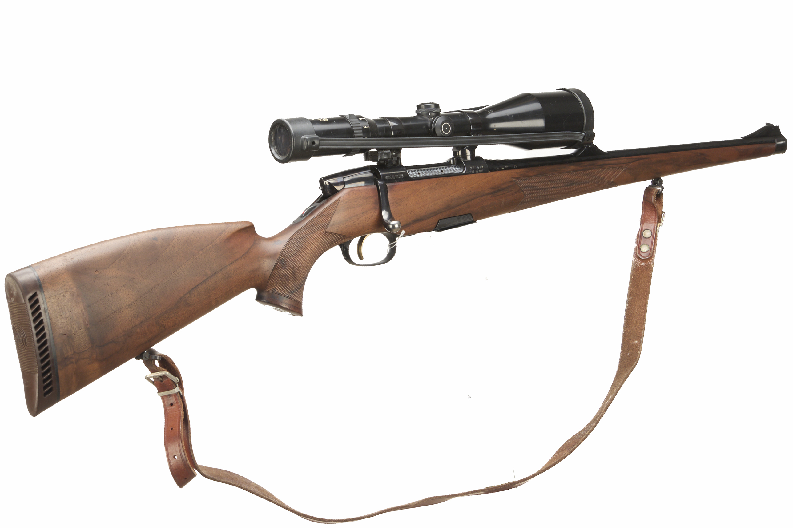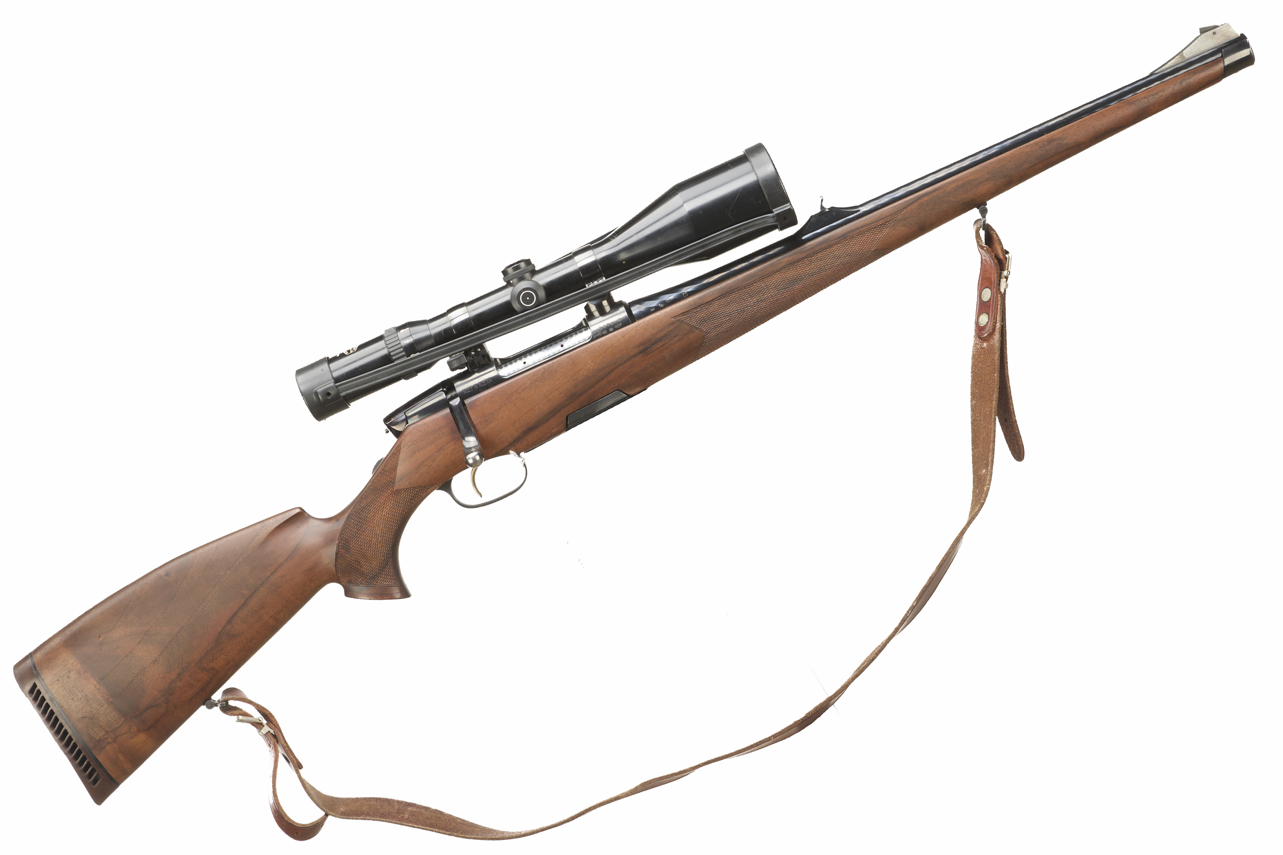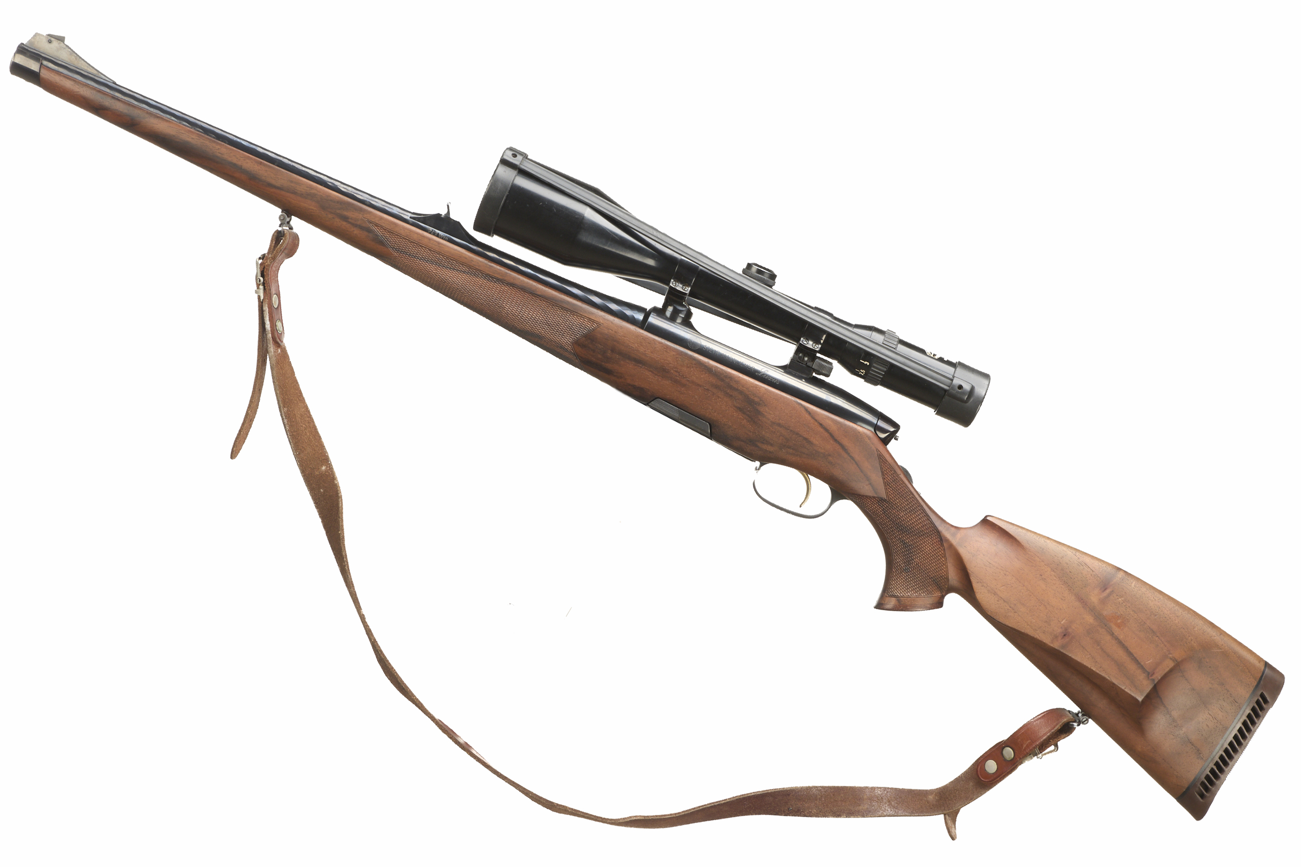 Cushioned butt, semi-pistol grip with rosewood cap. Stutzen stock. Sling attachments and leather sling. Sighted barrel. Detachable magazine. 30mm scope rings with Schmidt and Bender scope.