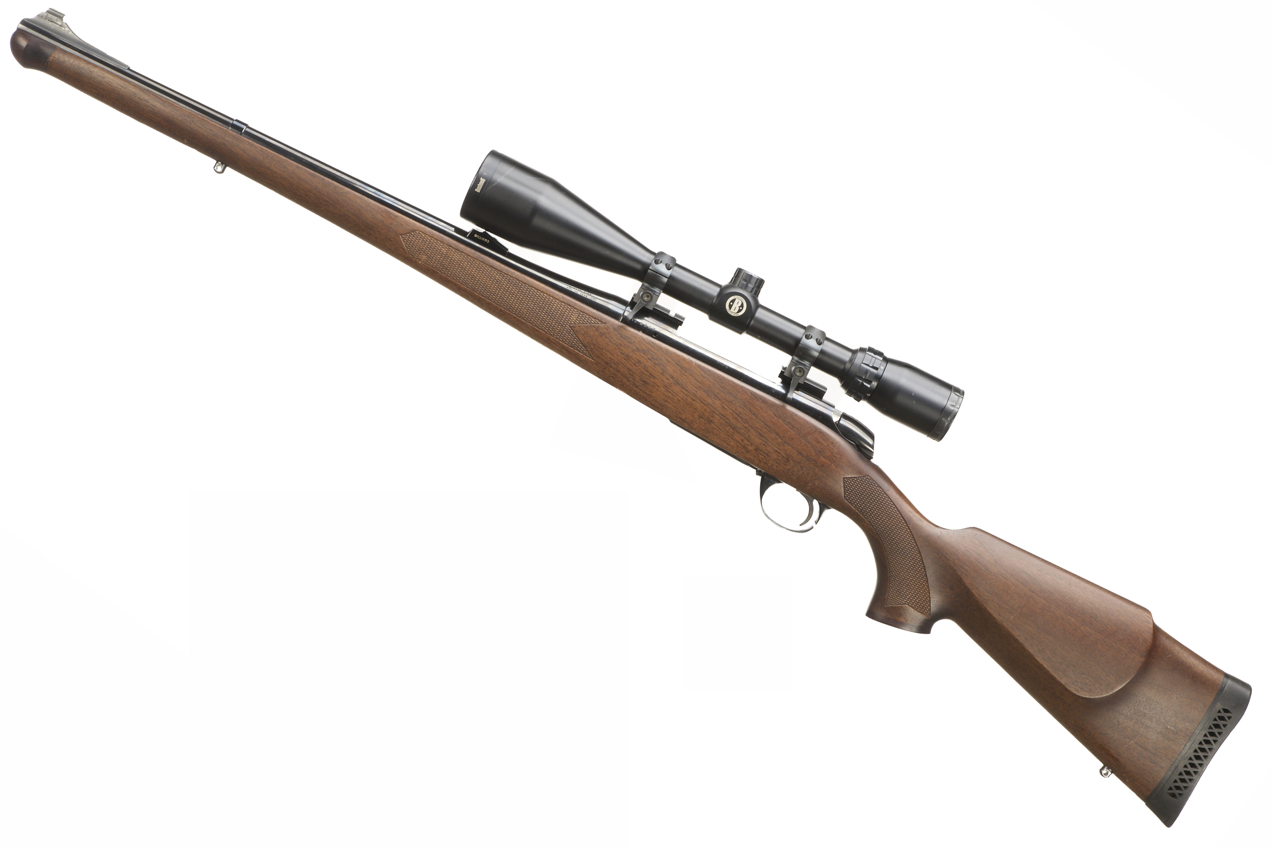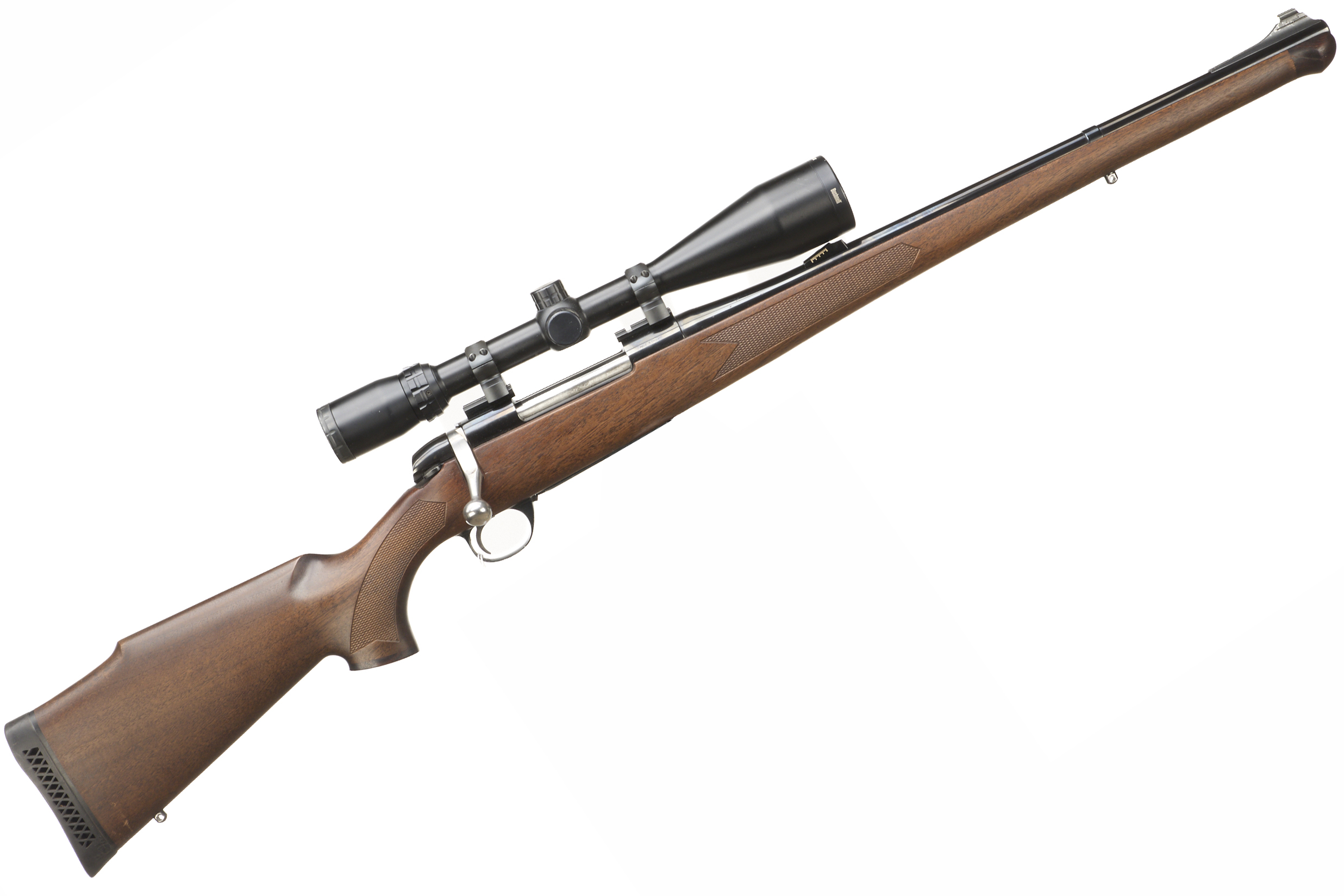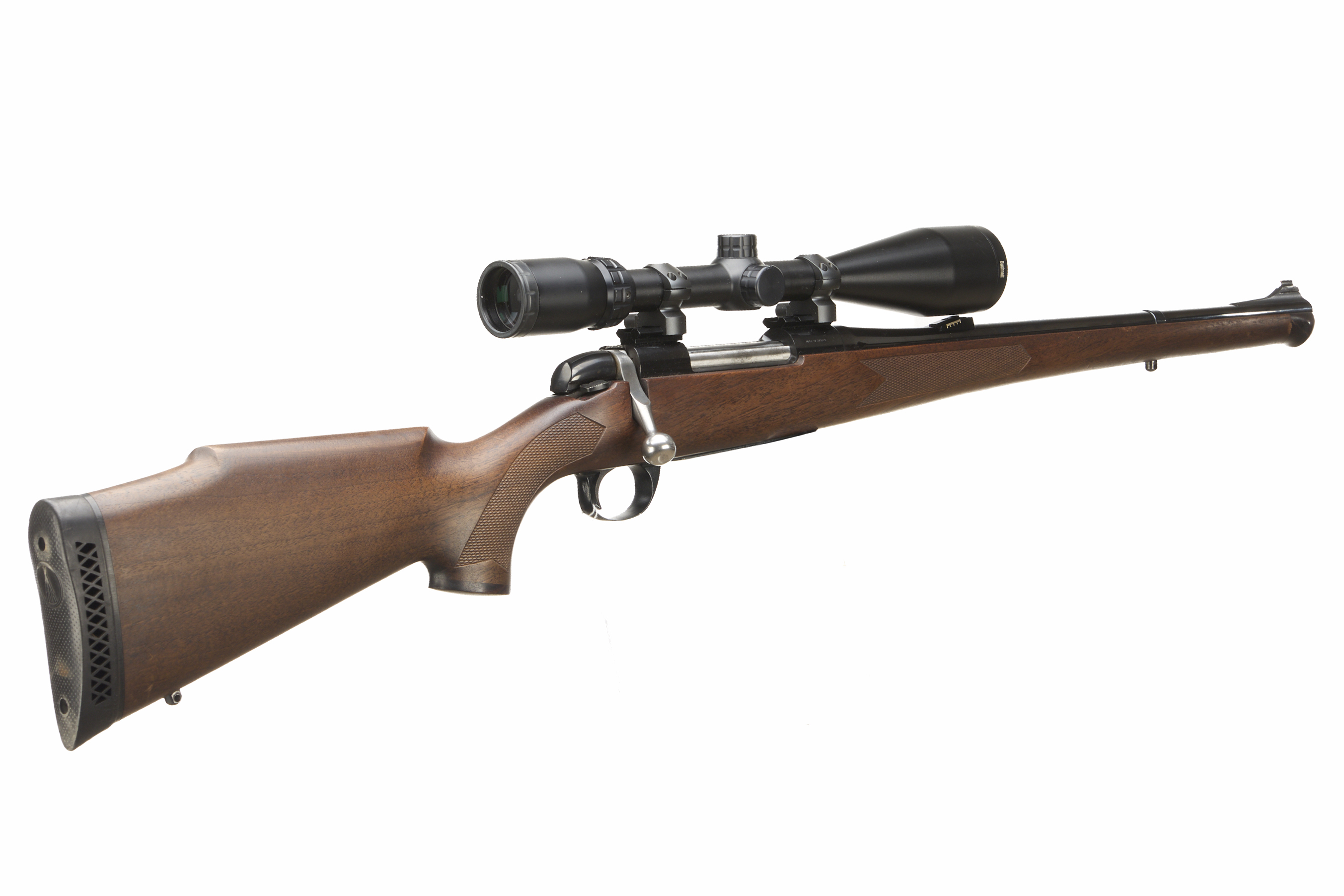 Cushioned butt, semi-pistol grip with rosewood cap, Full length stock with rosewood end. Plain muzzle, sighted barrel. Internal magazine with hinged floor plate.