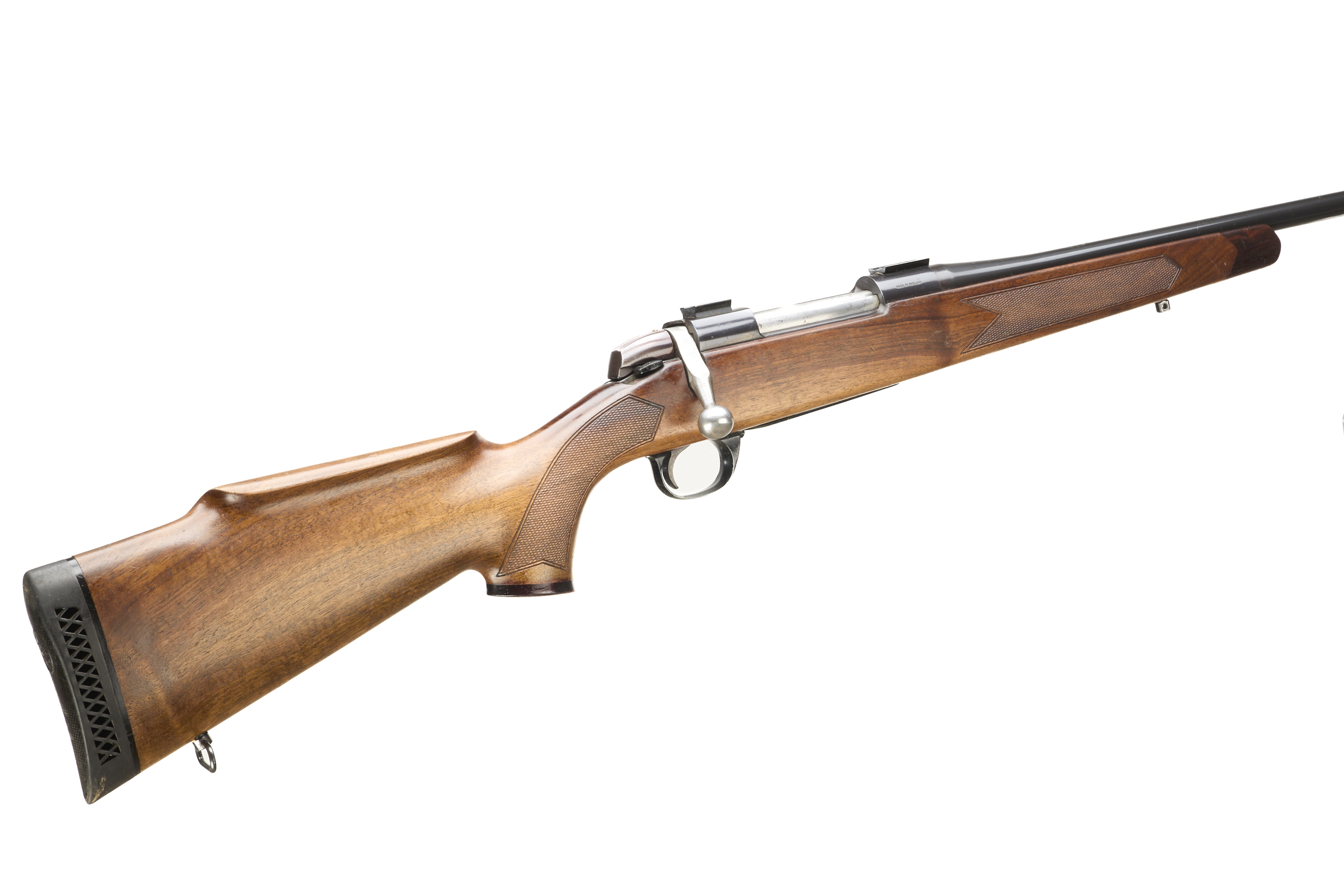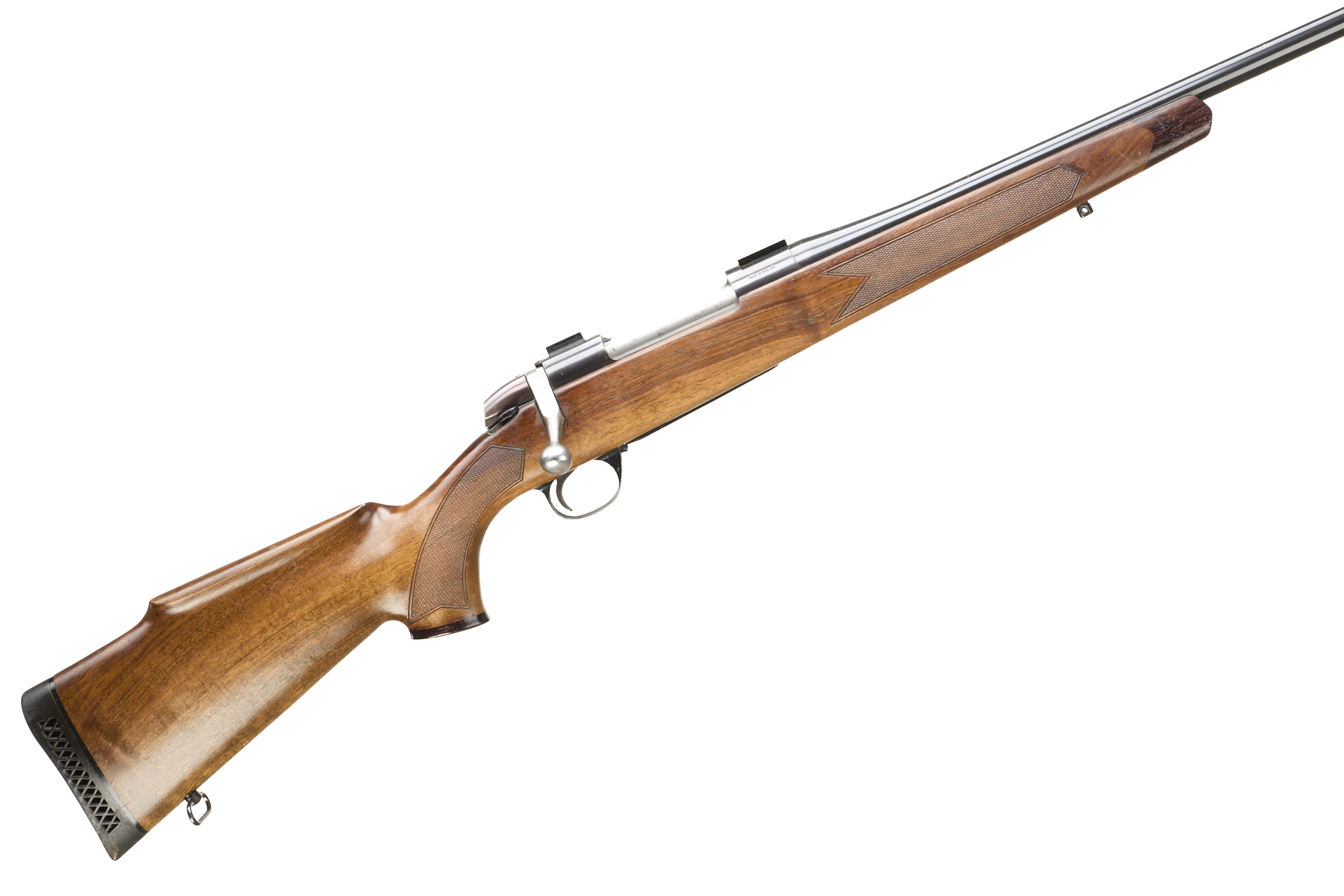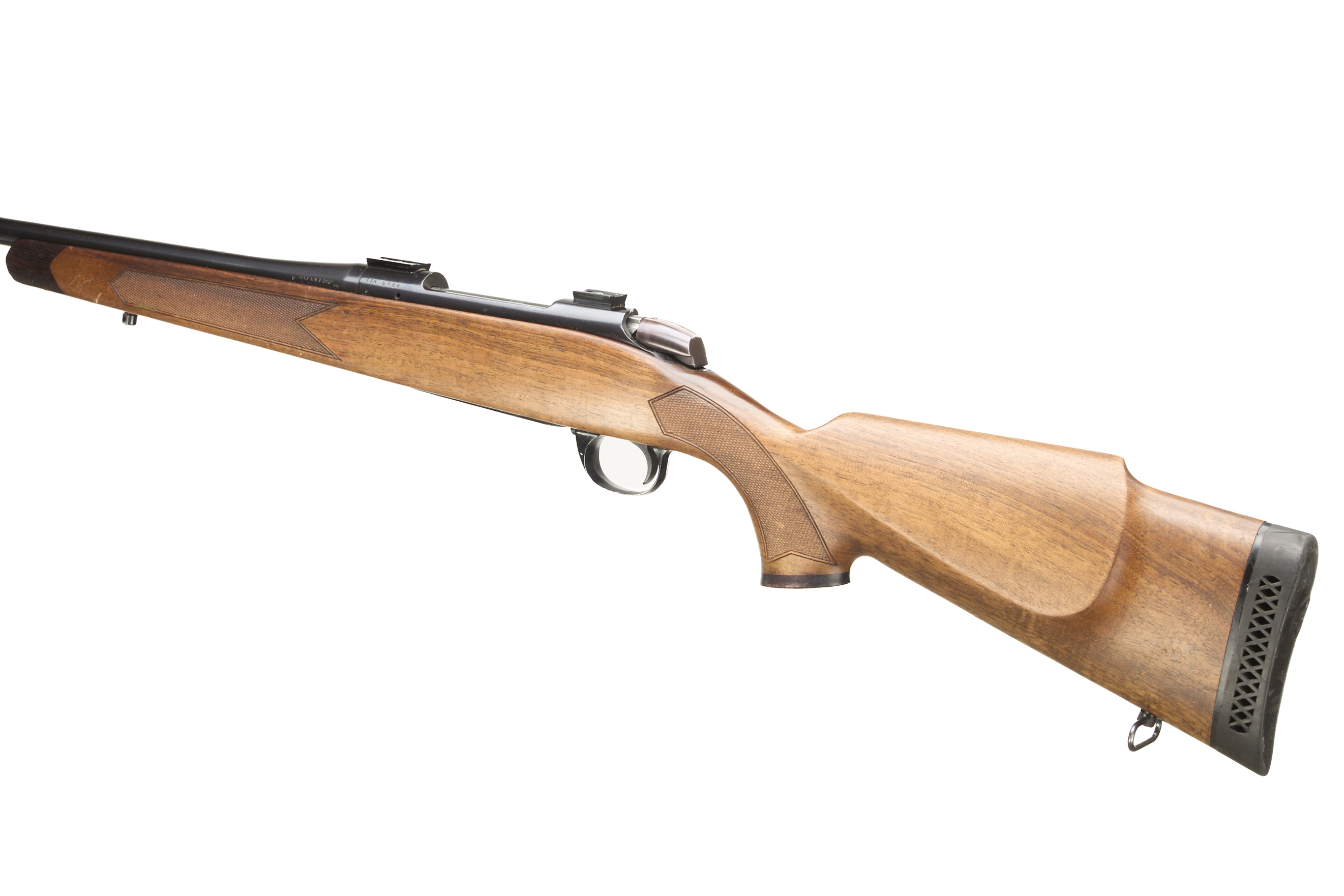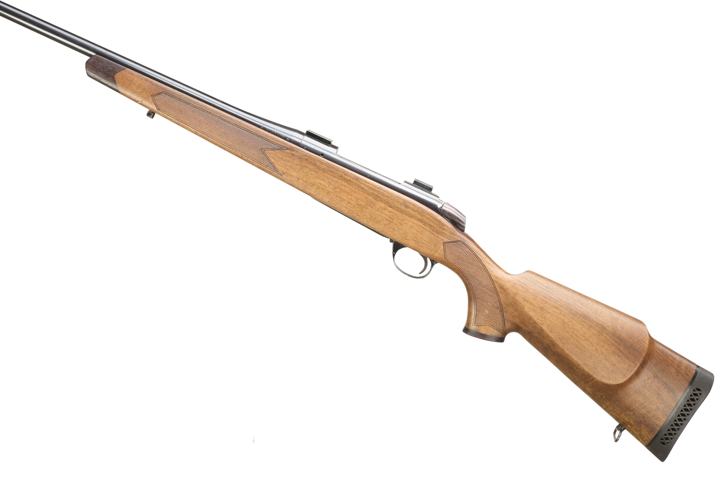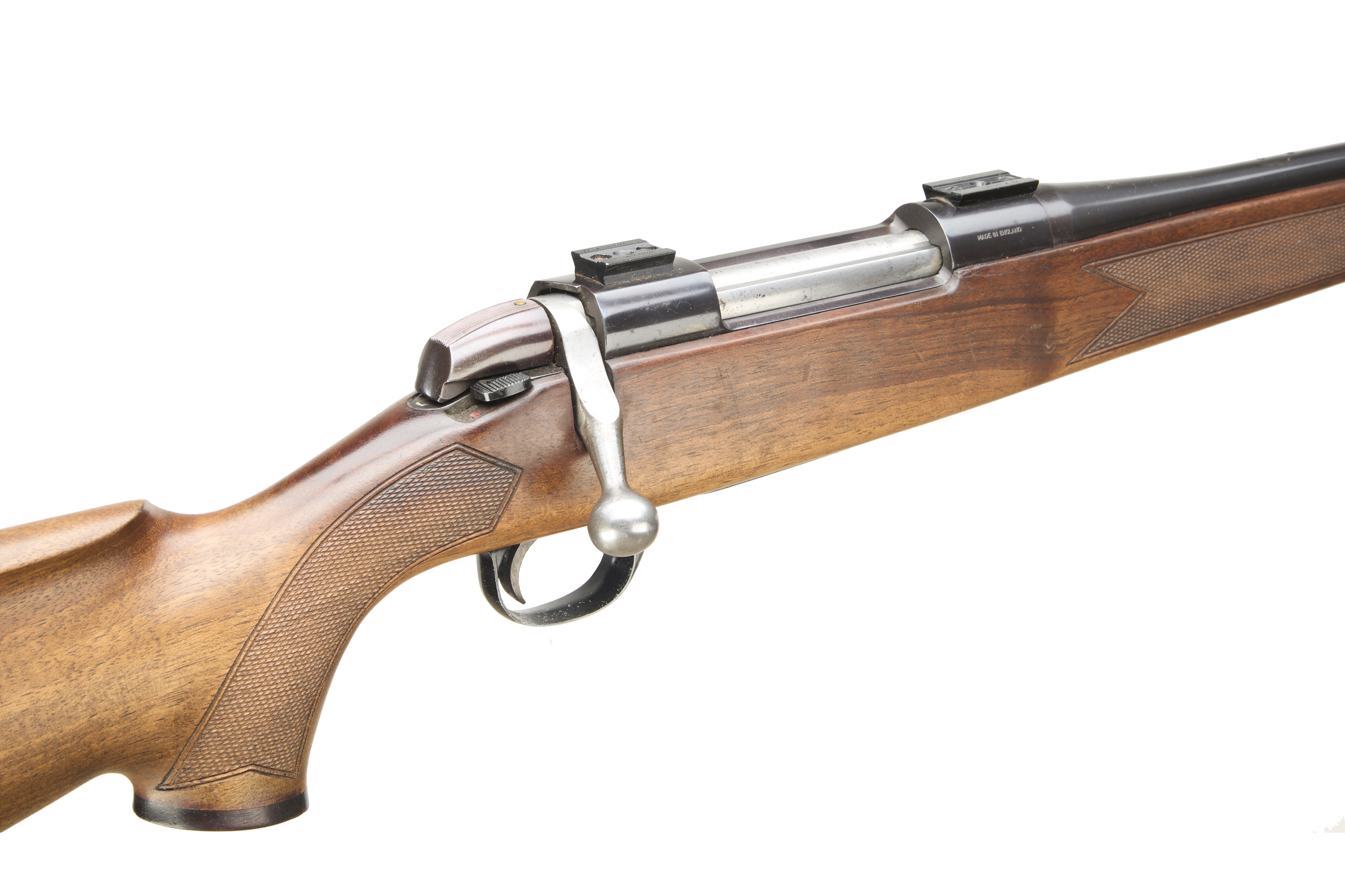 Ventilated butt pad, chequered semi-pistol grip and forend with rosewood end caps to same. Raised cheek piece. Rear sight removed, ramp blade foresight, Parker Hale scope mounts. Internal magazine with hinged floor plate. Thumb safety.